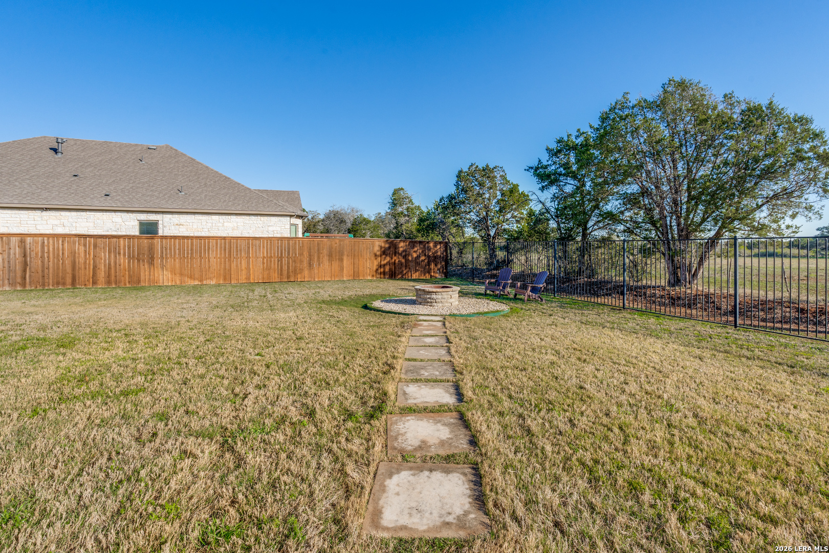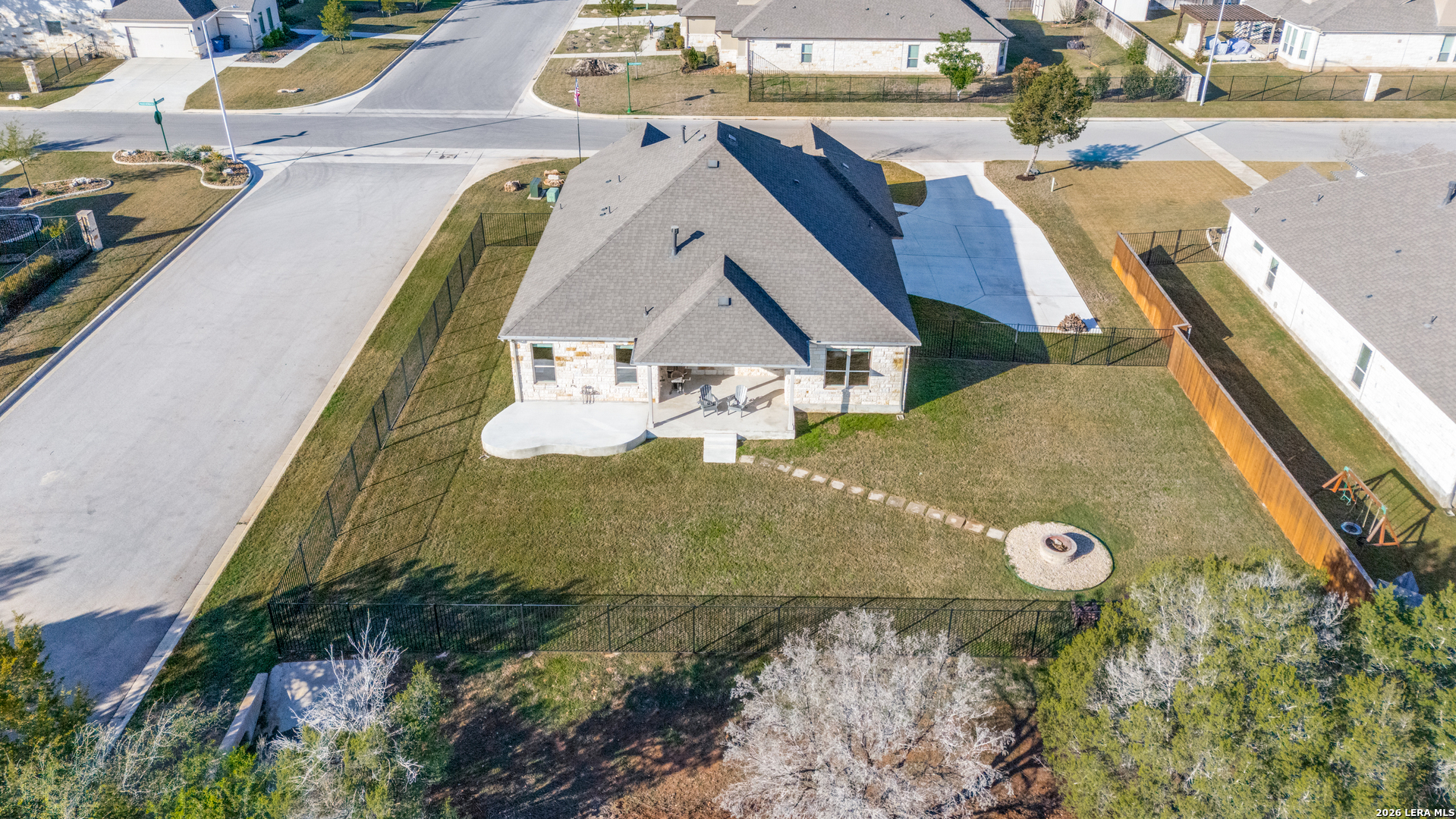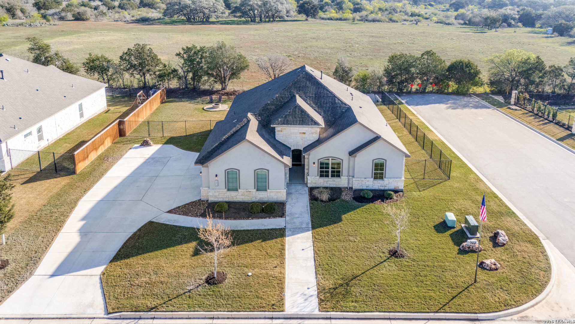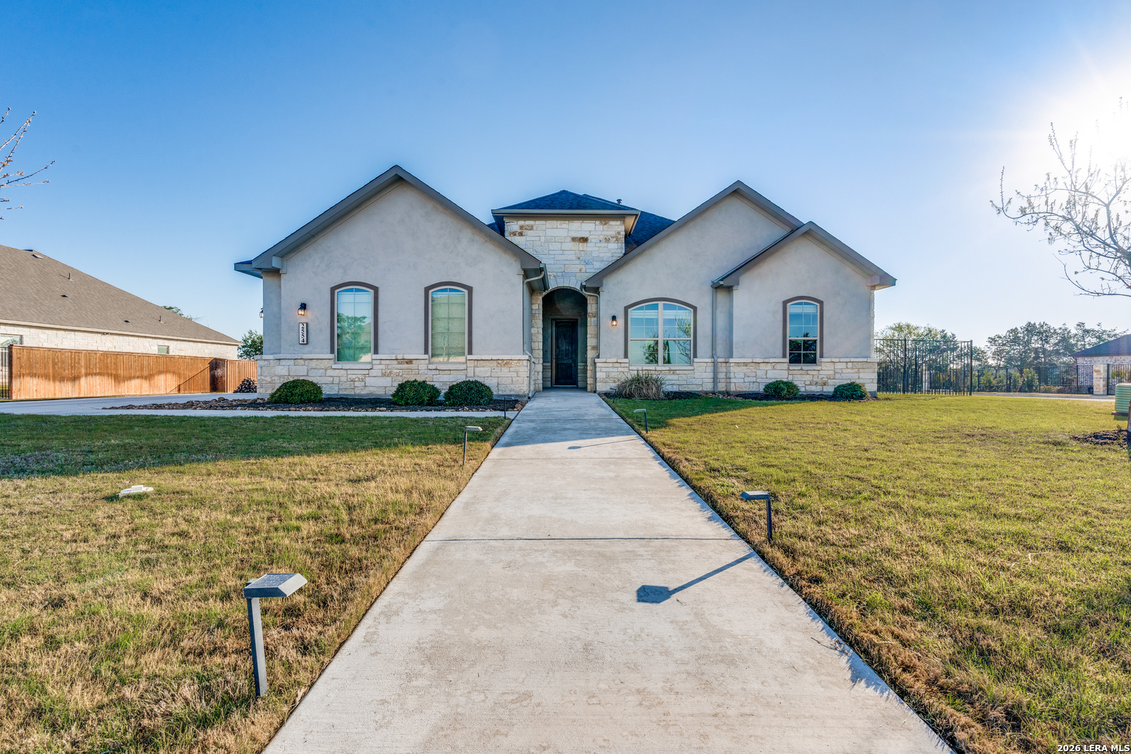 A turnkey gem in the highly sought-after gated community of Manor Creek! This stunning 1 story 3-bedroom, 2-bathroom home boasts 2,286 square feet of New Braunfels style living on a big 0.37-acre corner lot that backs to private, uncultivated land, providing tranquility and privacy, with a rare view within city limits! As you enter, you'll be greeted by an inviting open floorplan, perfect for entertaining guests or simply relaxing with your family. The home features a dedicated office area, ideal for those who work from home or just need a space for activities. The heart of the home is the expansive kitchen, complete with double ovens, gas cooking, and plenty of granite counter space for meal preparation. Updated lights illuminate the space, while high ceilings and doors throughout, with additional wall treatments add a touch of elegance throughout the home. The living room is centered around a beautiful stone gas fireplace, creating a cozy ambiance for gatherings during cooler evenings. A convenient utility room with easy access to all bedrooms. Super flexible 3-car side entry garage that has a professionally installed ducted mini-split cooling/heating unit, providing ample space for year-round climate controlled storage or workshop along with your vehicles. Step outside to the extended patio and backyard sitting area, perfect for enjoying the sunrise with your morning coffee watching the deer roam or hosting outdoor gatherings. The patio is plumbed for water and natural gas, making it easy to install your dream outdoor kitchen. This home is equipped with sprinklers and gutters, water softener, gas heat and tankless water heater for easy maintenance, and benefits from lower costs along with low property tax rate, saving you money year after year. Residents of Manor Creek enjoy access to community amenities including a pool and playground, along with dedicated nature trails providing endless opportunities for recreation and relaxation. Zoned in the Veramendi, Oak Run, and New Braunfels High School districts- an exceptional opportunity for buyers seeking top-rated schools. Located just minutes away from shopping, restaurants, and major highways, this home offers the perfect blend of luxury, convenience, and comfort. Schedule a showing and don't miss your chance to make this your forever home!