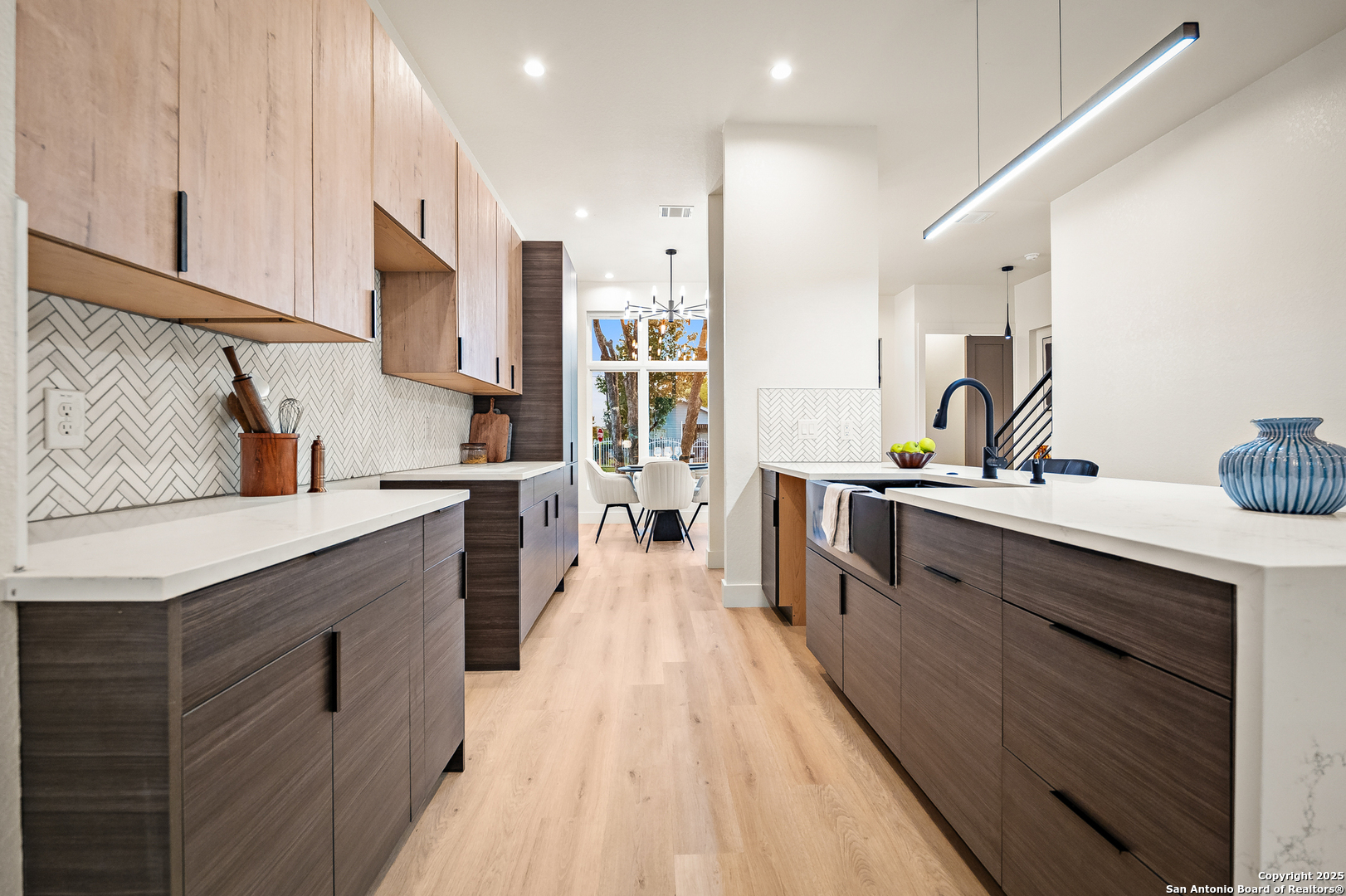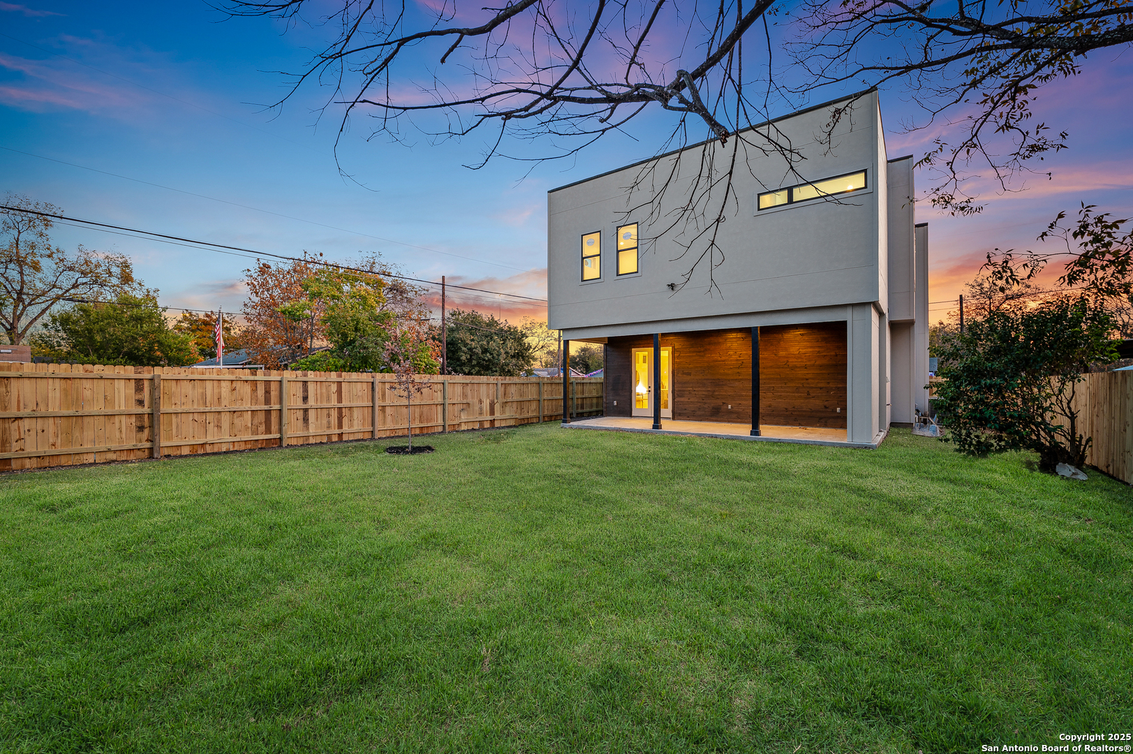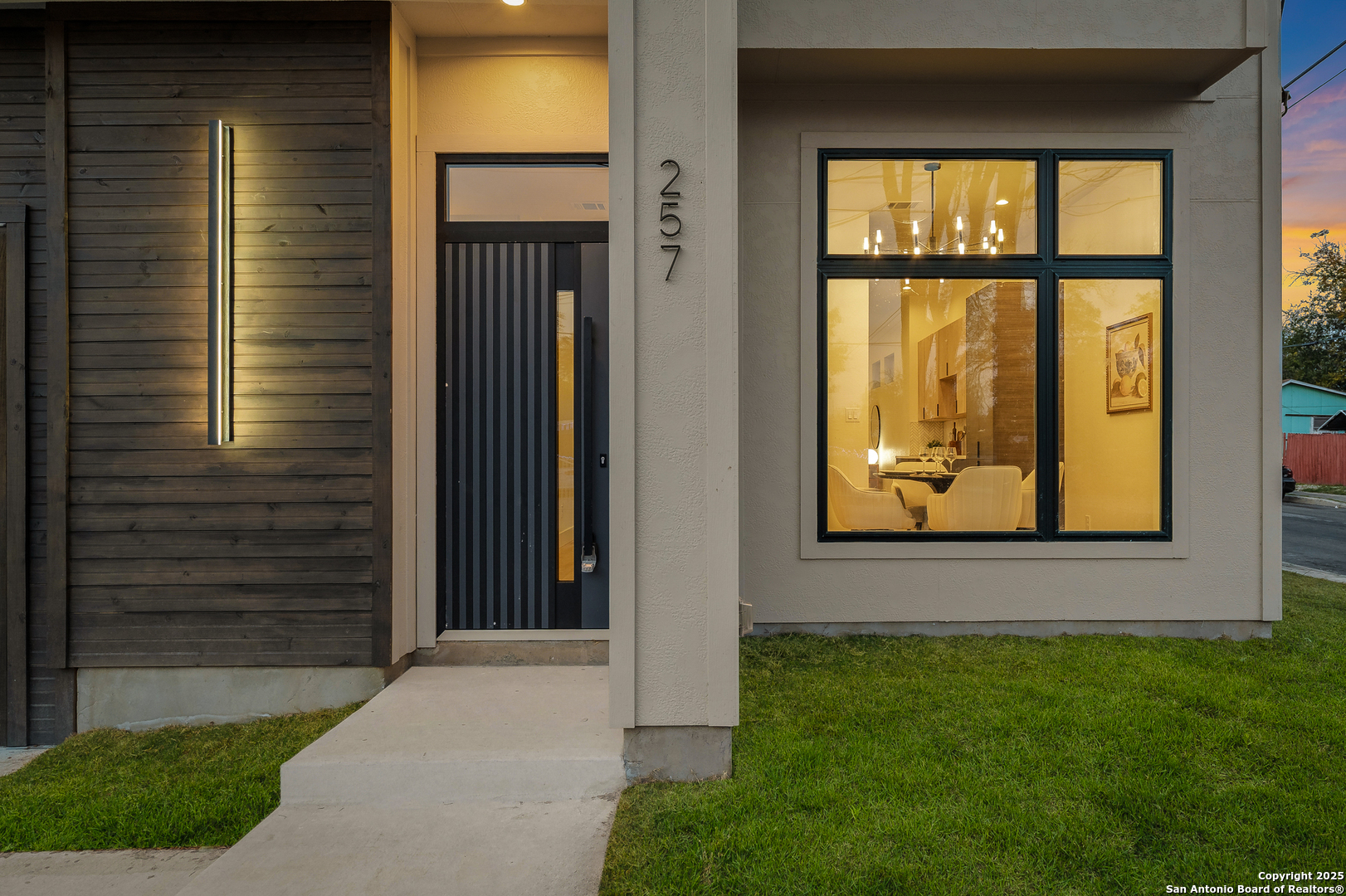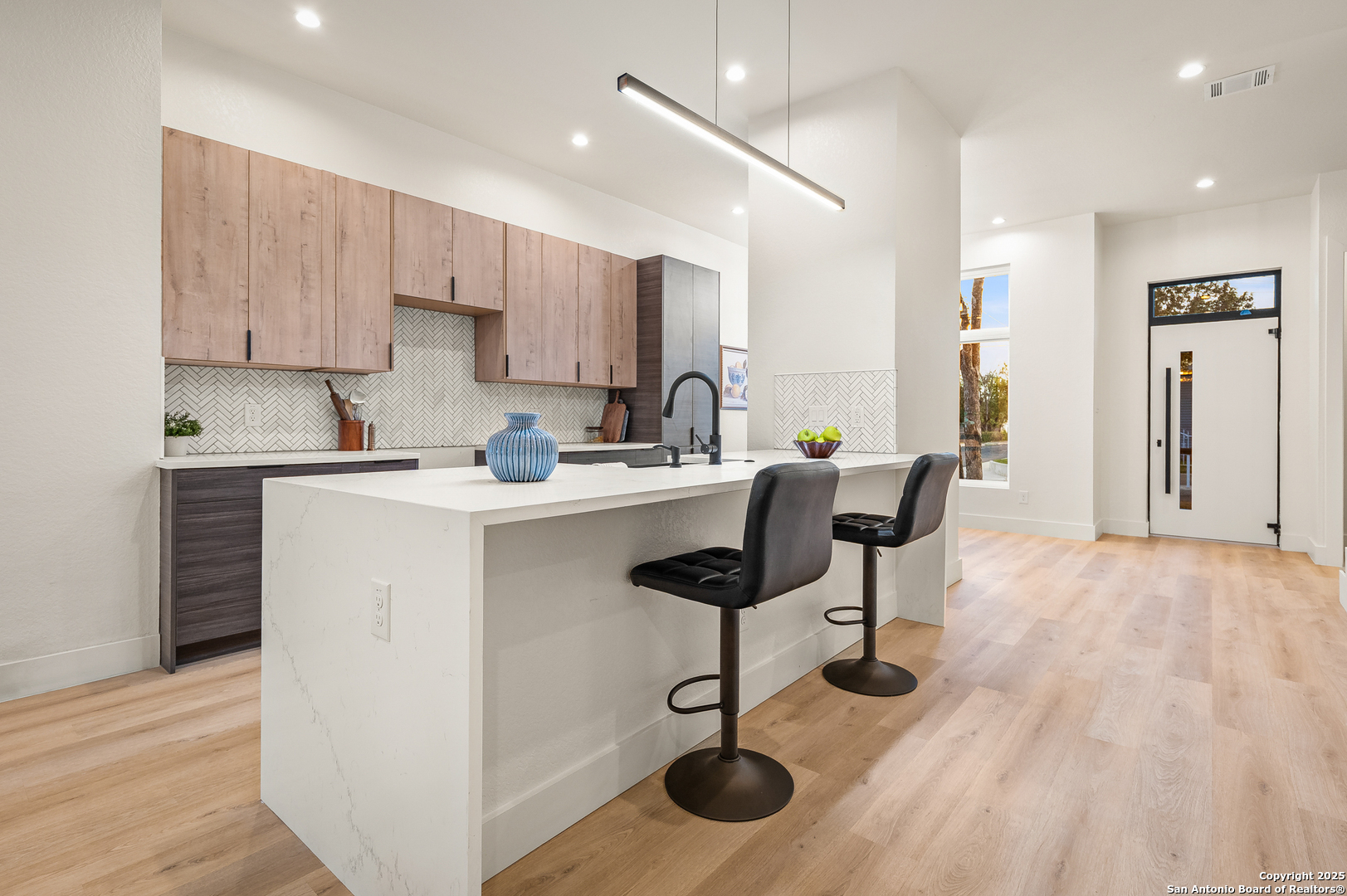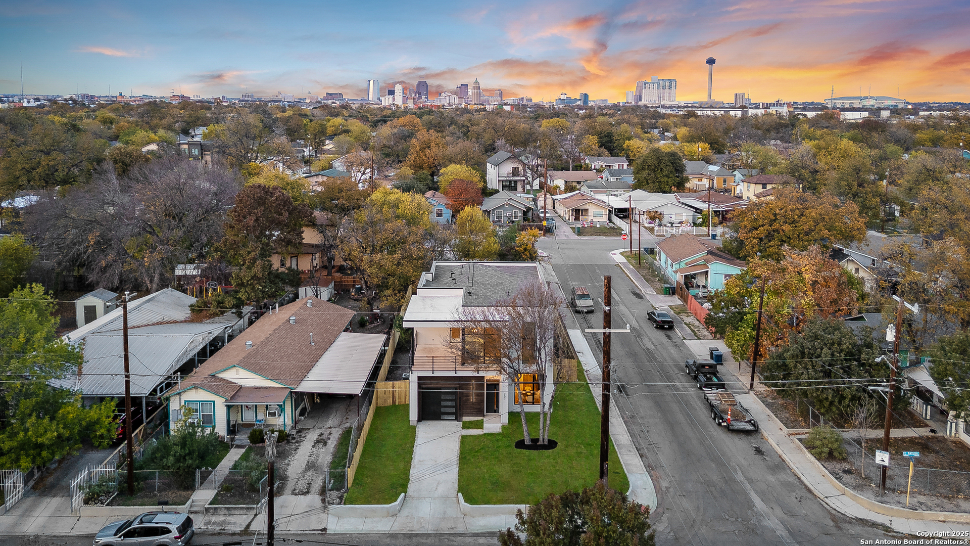 Experience modern minimalist luxury in this brand-new Japandi-inspired home just minutes from Downtown San Antonio. Situated in the vibrant Southtown/Lone Star Arts District, this contemporary new construction blends clean architectural lines with warm natural finishes and thoughtful design throughout. The open-concept layout is filled with natural light from floor-to-ceiling windows and features high ceilings and luxury vinyl flooring. The chef's kitchen showcases quartz countertops, European-style floating cabinetry, and sleek modern finishes, opening seamlessly to the main living area-perfect for entertaining. The primary suite is a private retreat with a spa-style bathroom featuring a soaking tub, rainfall walk-in shower, and a custom walk-in closet. A secondary living area with a built-in wet bar and wine fridge adds flexibility for entertaining, work-from-home, or relaxing. Outdoor living is a standout, with covered patio spaces and elevated views that capture the Tower of the Americas and downtown skyline. The spacious yard offers room for a future pool, garden, or casita. This home is equipped with modern conveniences, including a tankless water heater, smart garage with EV-ready outlet, and a high-security VDom Deux modern front door. Move-in ready and thoughtfully designed, this is a rare opportunity to own a luxury new construction home near downtown dining, culture, and entertainment.