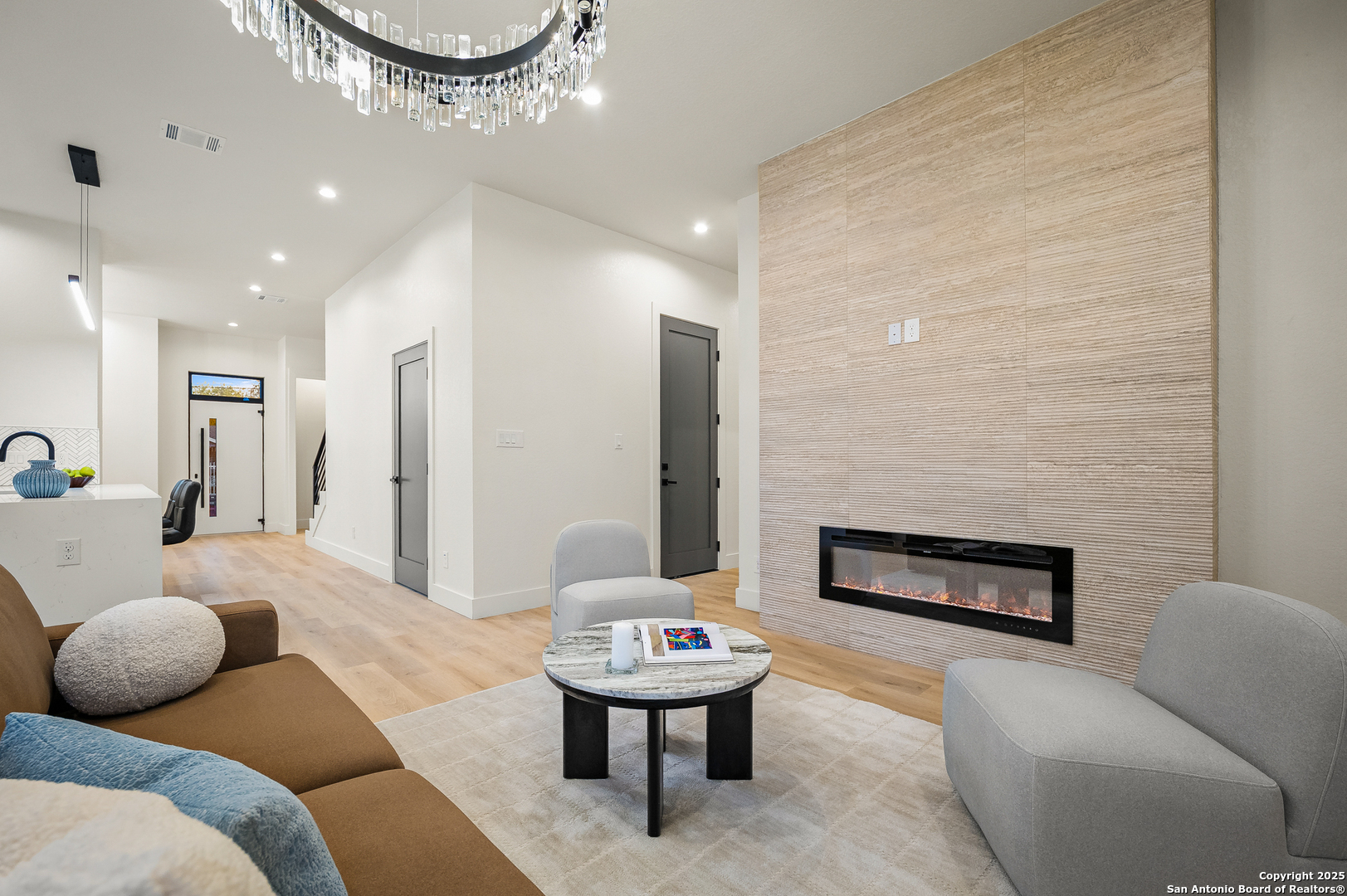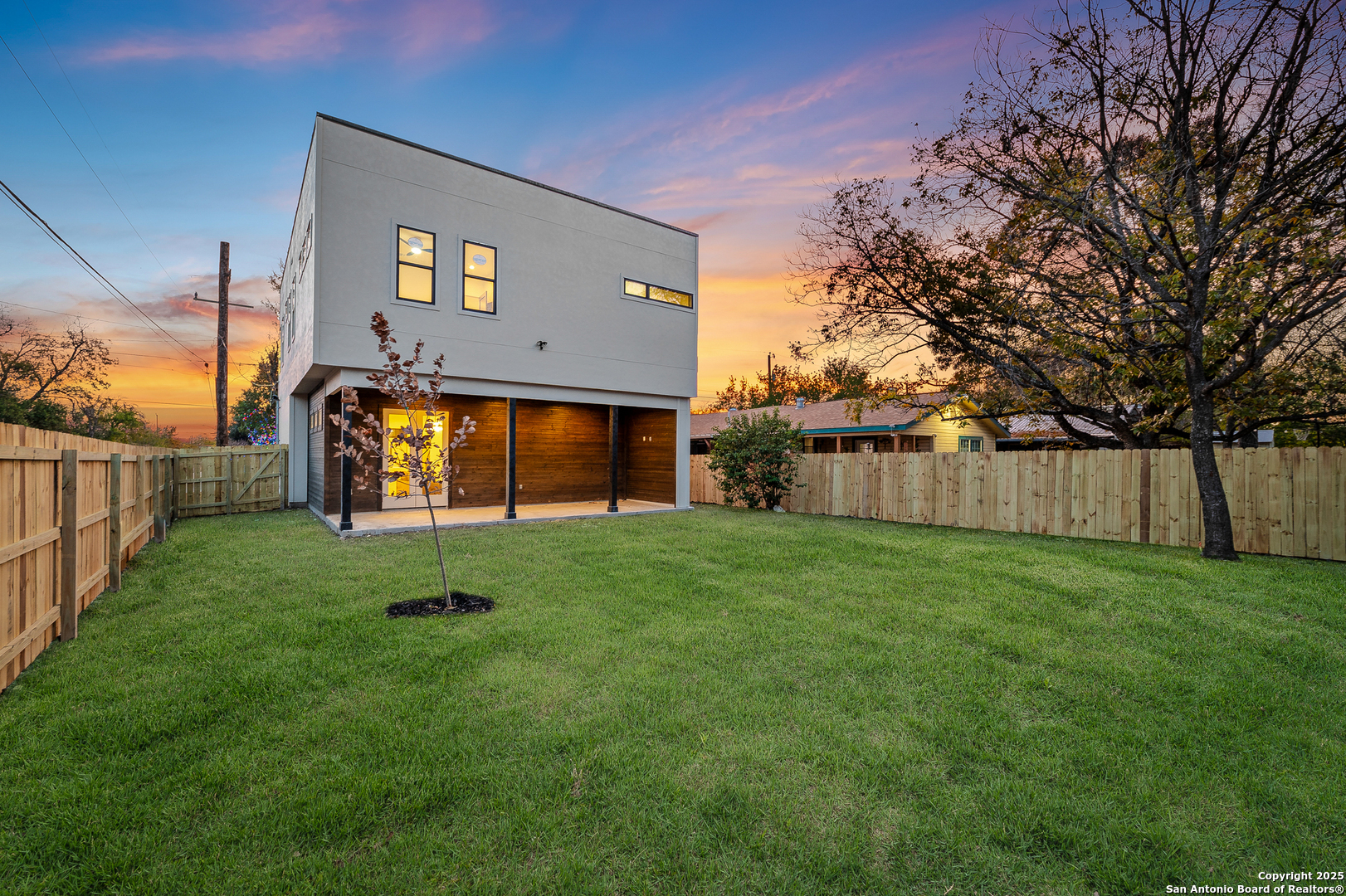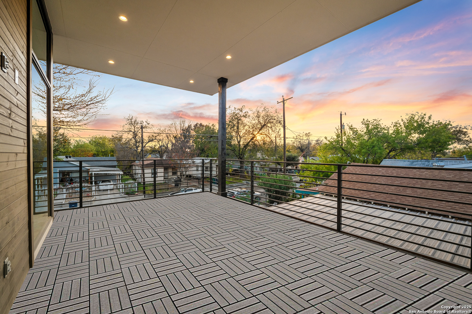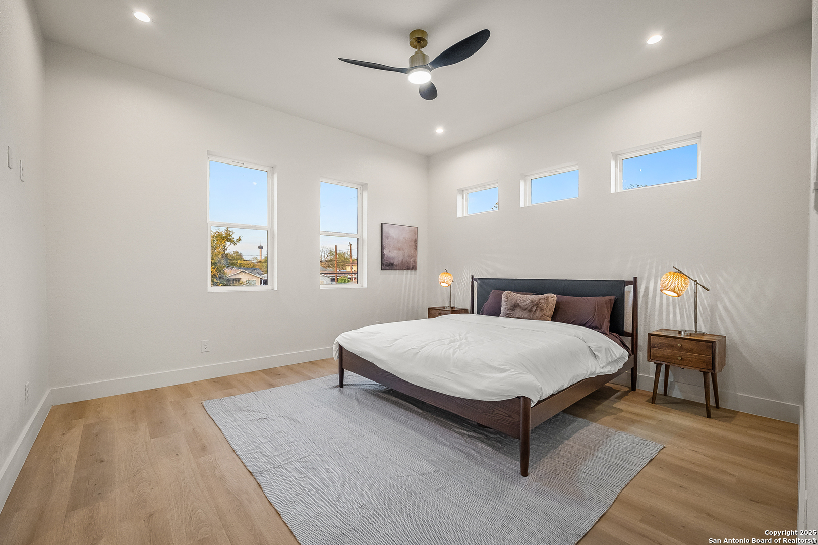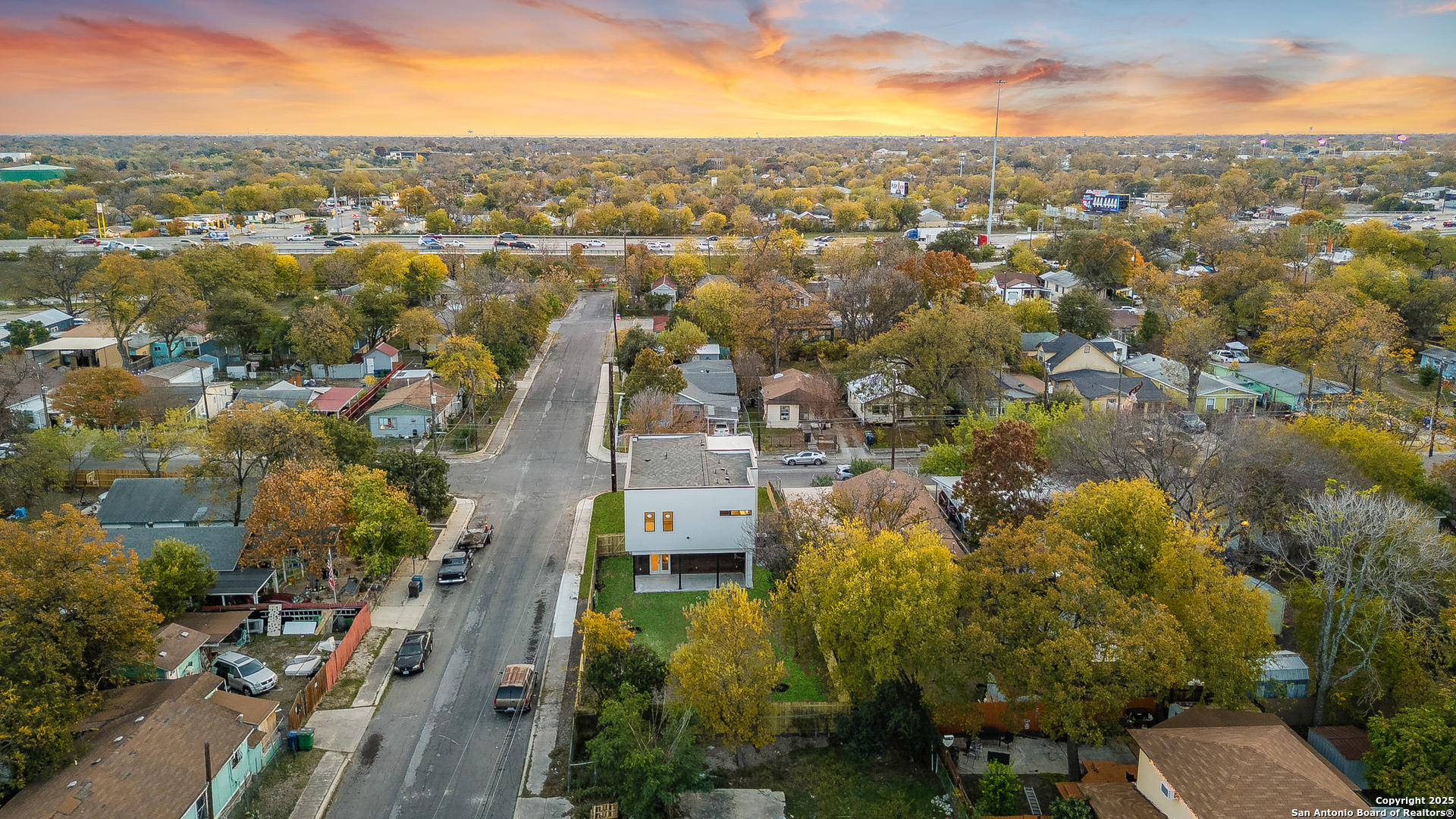 Experience modern minimalist luxury in this brand-new Japandi-inspired home just minutes from Downtown San Antonio. Situated in the vibrant Southtown/Lone Star Arts District, this contemporary new construction blends clean architectural lines with warm natural finishes and thoughtful design throughout. The open-concept layout is filled with natural light from floor-to-ceiling windows and features high ceilings and luxury vinyl flooring. The chef's kitchen showcases quartz countertops, European-style floating cabinetry, and sleek modern finishes, opening seamlessly to the main living area-perfect for entertaining. The primary suite is a private retreat with a spa-style bathroom featuring a soaking tub, rainfall walk-in shower, and a custom walk-in closet. A secondary living area with a built-in wet bar and wine fridge adds flexibility for entertaining, work-from-home, or relaxing. Outdoor living is a standout, with covered patio spaces and elevated views that capture the Tower of the Americas and downtown skyline. The spacious yard offers room for a future pool, garden, or casita. This home is equipped with modern conveniences, including a tankless water heater, smart garage with EV-ready outlet, and a high-security VDom Deux modern front door. Move-in ready and thoughtfully designed, this is a rare opportunity to own a luxury new construction home near downtown dining, culture, and entertainment.