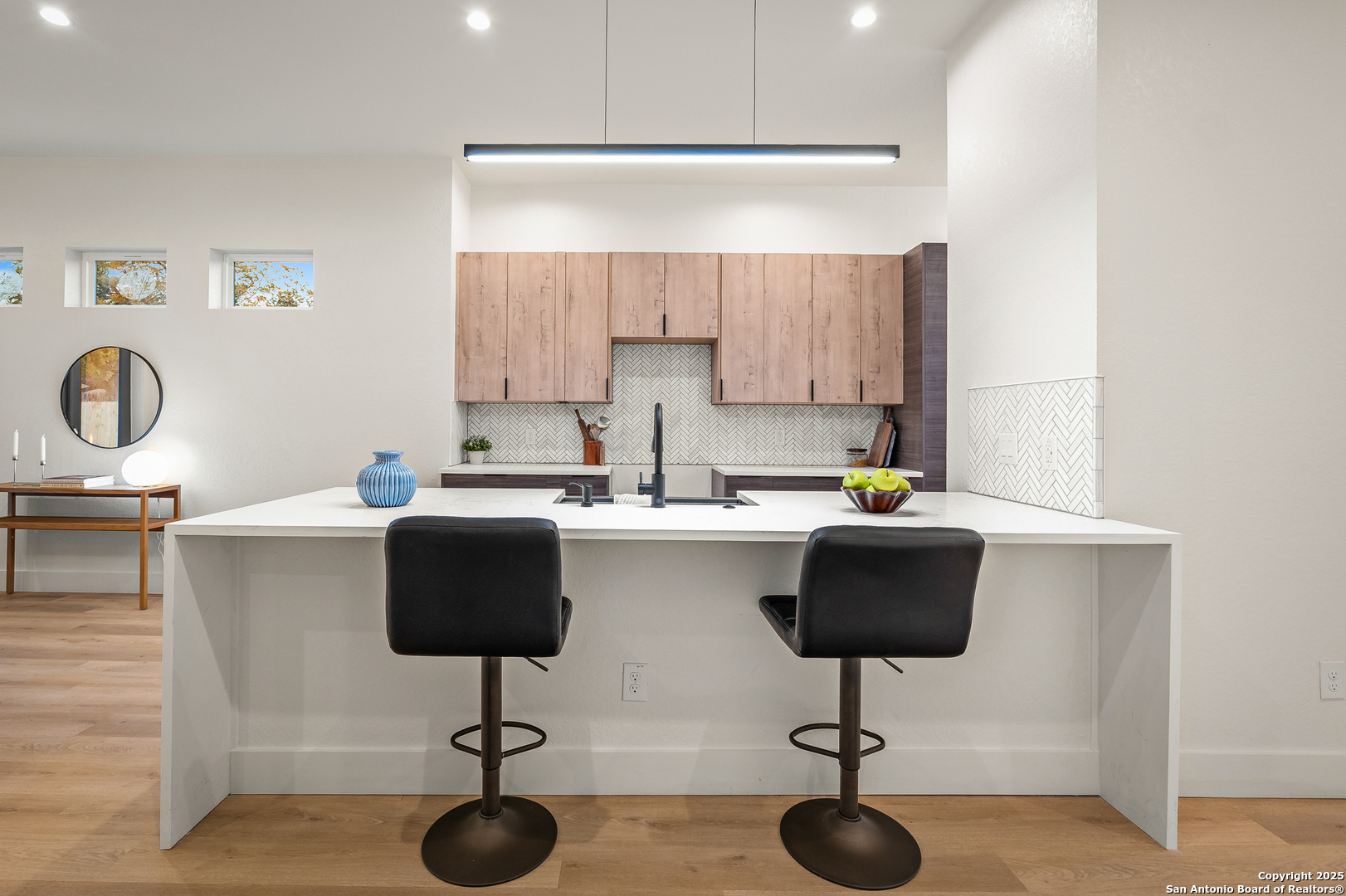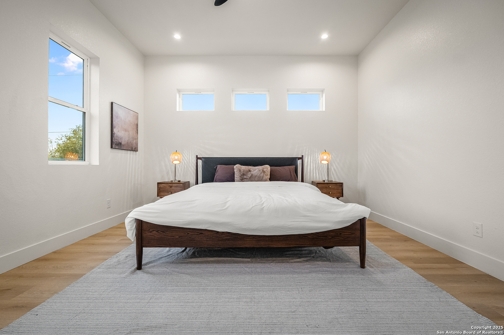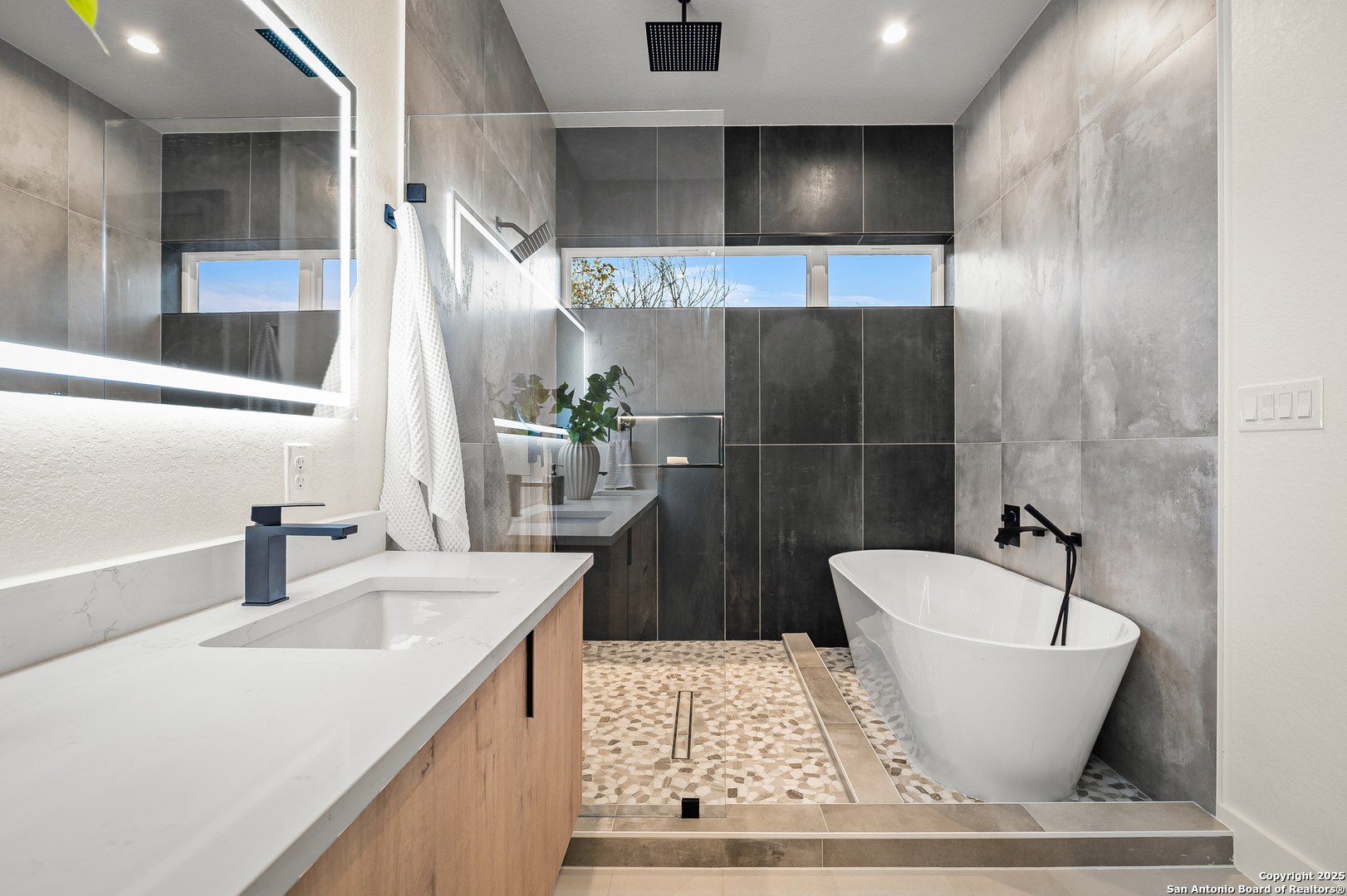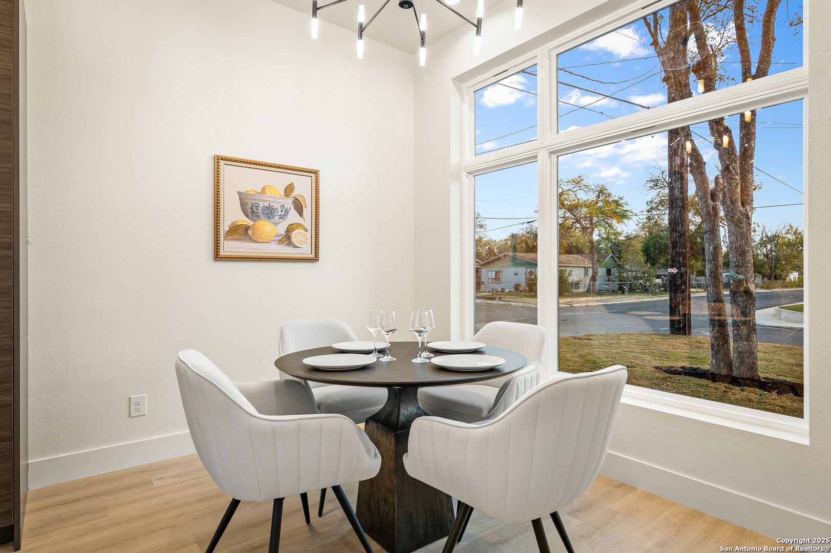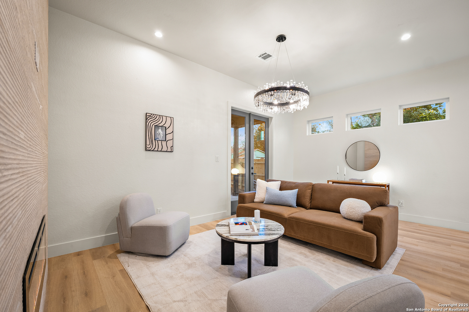 Experience modern minimalist luxury in this brand-new Japandi-inspired home just minutes from Downtown San Antonio. Situated in the vibrant Southtown/Lone Star Arts District, this contemporary new construction blends clean architectural lines with warm natural finishes and thoughtful design throughout. The open-concept layout is filled with natural light from floor-to-ceiling windows and features high ceilings and luxury vinyl flooring. The chef's kitchen showcases quartz countertops, European-style floating cabinetry, and sleek modern finishes, opening seamlessly to the main living area-perfect for entertaining. The primary suite is a private retreat with a spa-style bathroom featuring a soaking tub, rainfall walk-in shower, and a custom walk-in closet. A secondary living area with a built-in wet bar and wine fridge adds flexibility for entertaining, work-from-home, or relaxing. Outdoor living is a standout, with covered patio spaces and elevated views that capture the Tower of the Americas and downtown skyline. The spacious yard offers room for a future pool, garden, or casita. This home is equipped with modern conveniences, including a tankless water heater, smart garage with EV-ready outlet, and a high-security VDom Deux modern front door. Move-in ready and thoughtfully designed, this is a rare opportunity to own a luxury new construction home near downtown dining, culture, and entertainment.