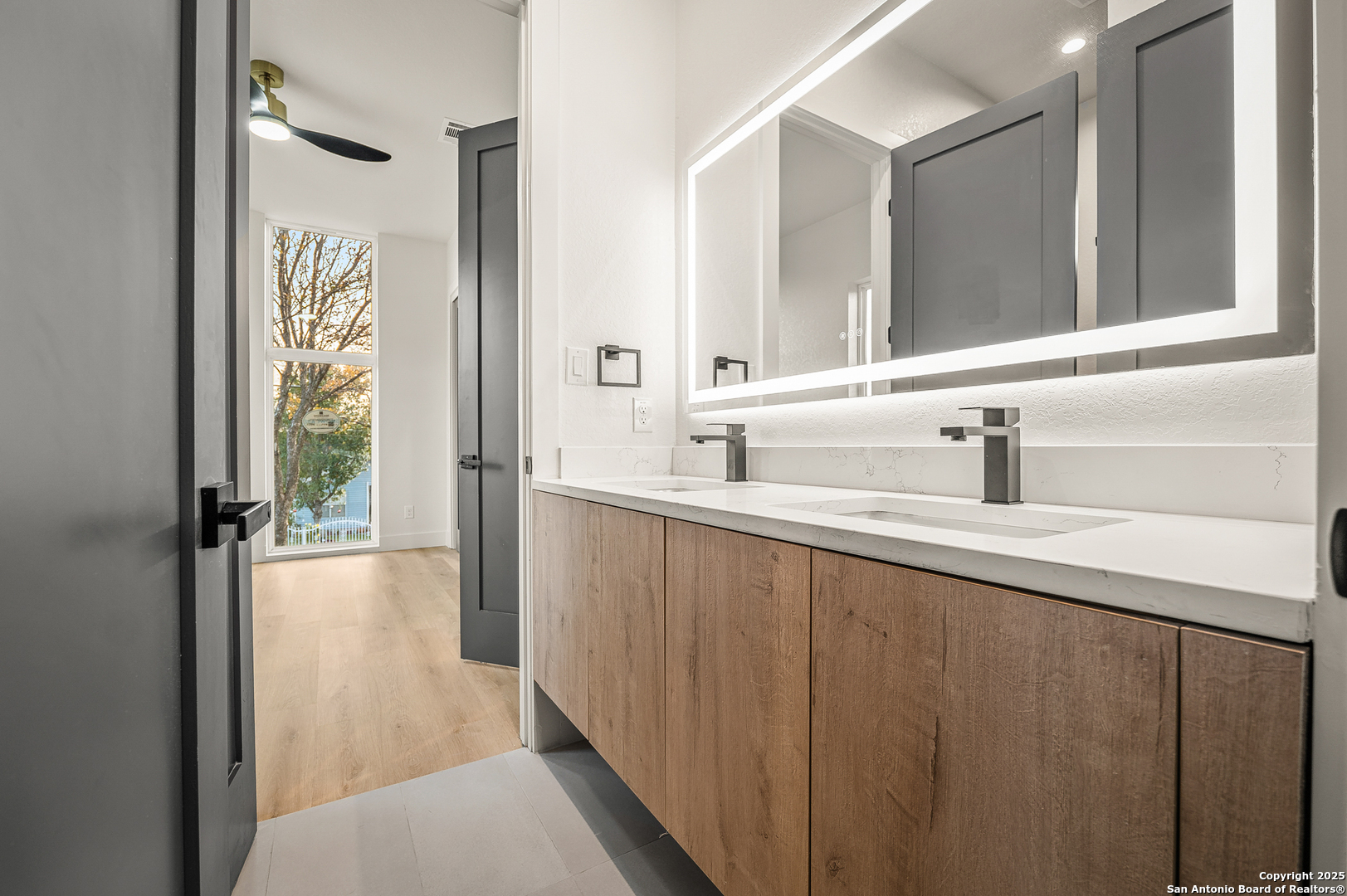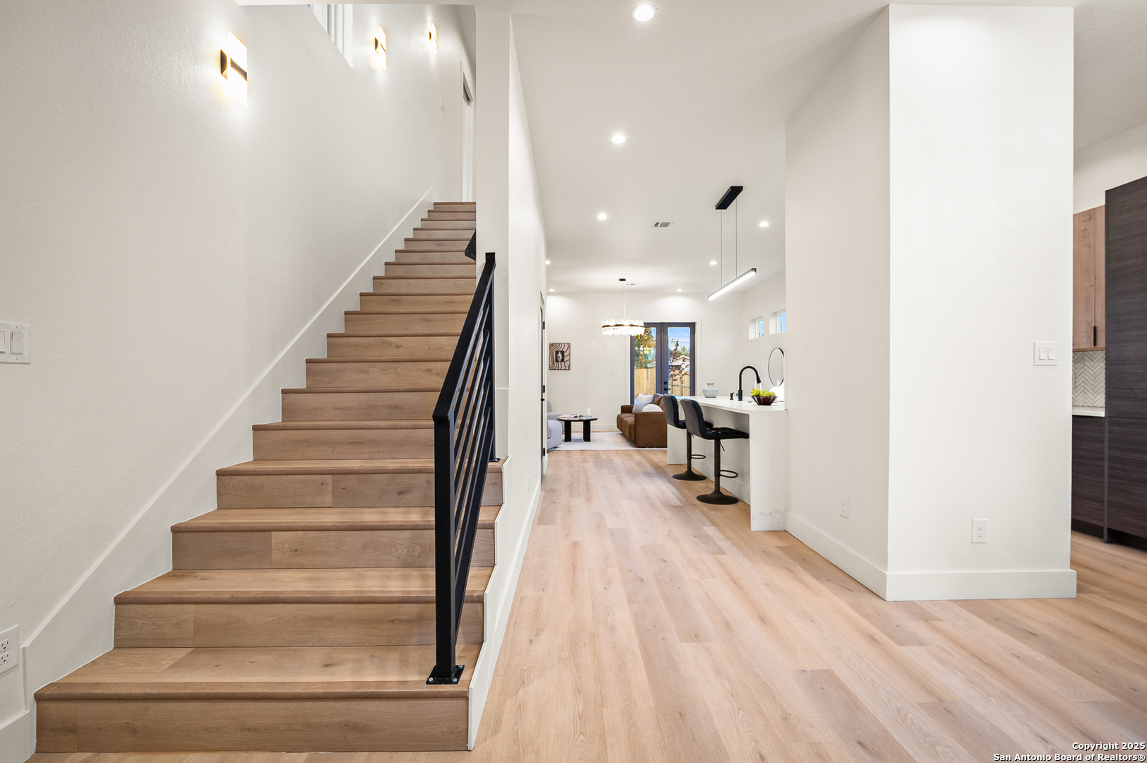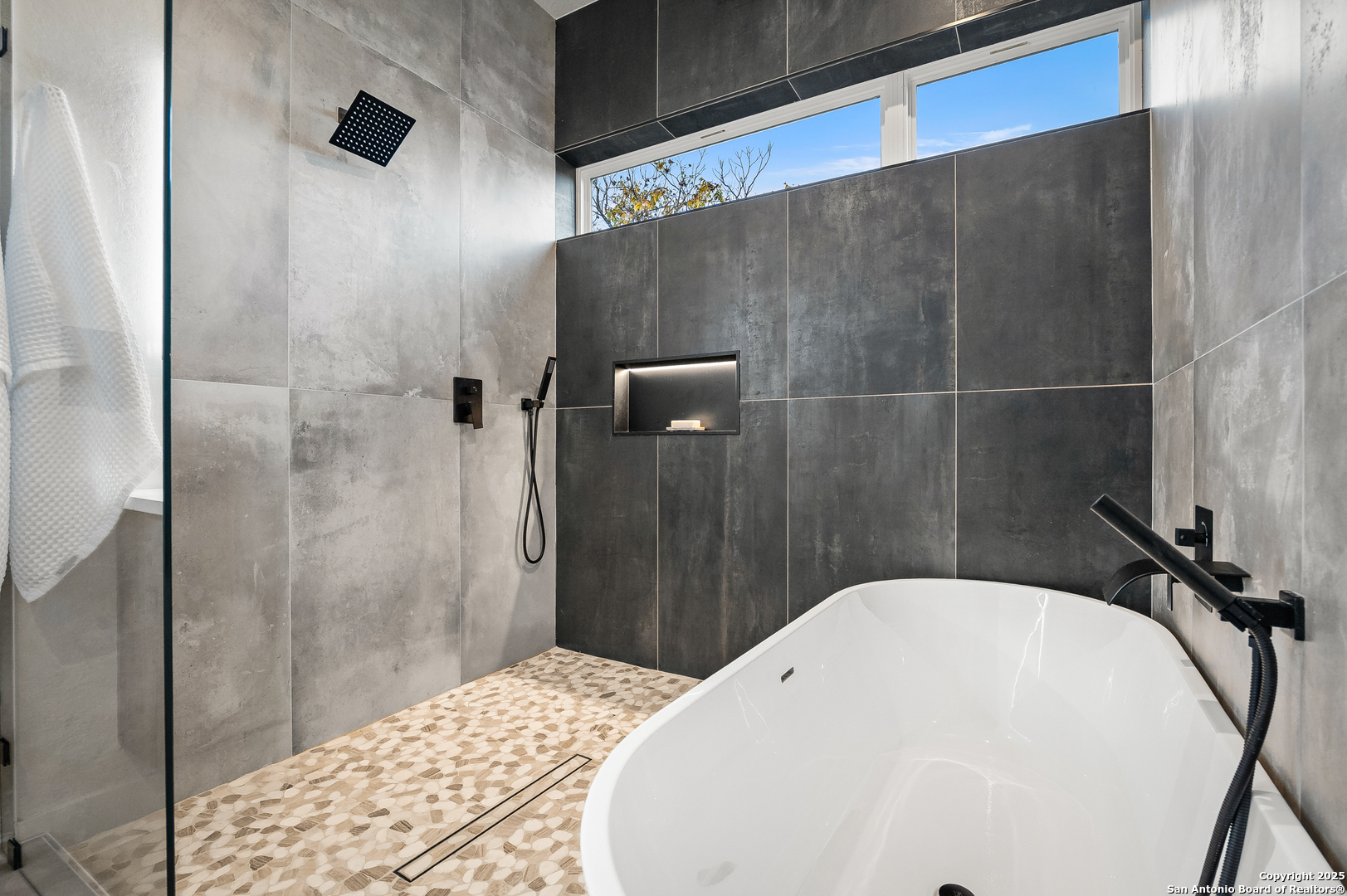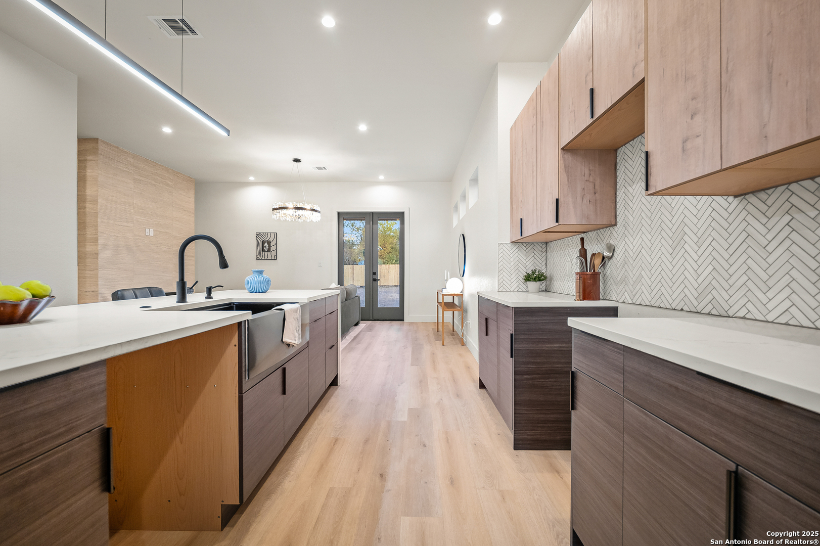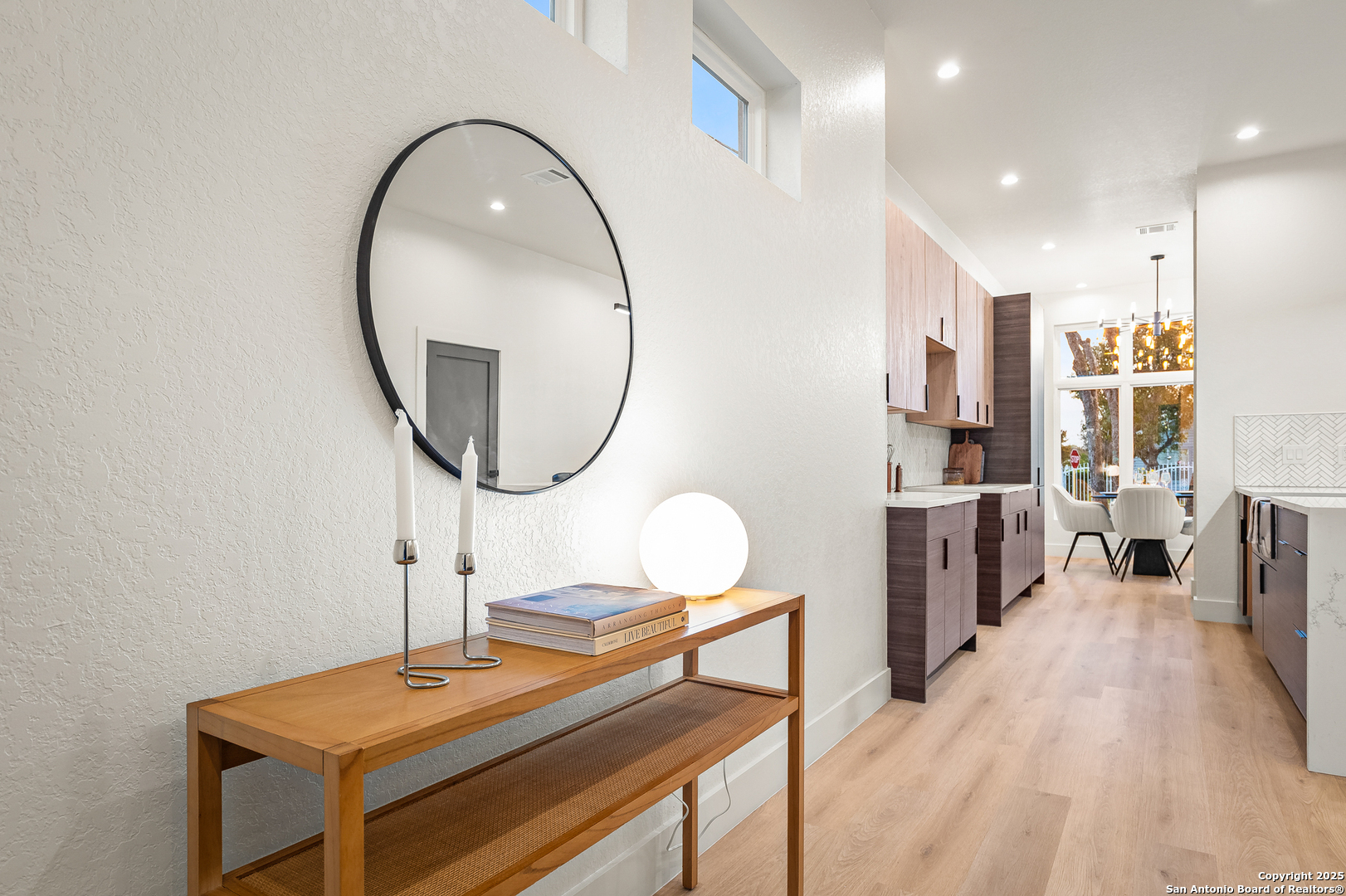 Experience modern minimalist luxury in this brand-new Japandi-inspired home just minutes from Downtown San Antonio. Situated in the vibrant Southtown/Lone Star Arts District, this contemporary new construction blends clean architectural lines with warm natural finishes and thoughtful design throughout. The open-concept layout is filled with natural light from floor-to-ceiling windows and features high ceilings and luxury vinyl flooring. The chef's kitchen showcases quartz countertops, European-style floating cabinetry, and sleek modern finishes, opening seamlessly to the main living area-perfect for entertaining. The primary suite is a private retreat with a spa-style bathroom featuring a soaking tub, rainfall walk-in shower, and a custom walk-in closet. A secondary living area with a built-in wet bar and wine fridge adds flexibility for entertaining, work-from-home, or relaxing. Outdoor living is a standout, with covered patio spaces and elevated views that capture the Tower of the Americas and downtown skyline. The spacious yard offers room for a future pool, garden, or casita. This home is equipped with modern conveniences, including a tankless water heater, smart garage with EV-ready outlet, and a high-security VDom Deux modern front door. Move-in ready and thoughtfully designed, this is a rare opportunity to own a luxury new construction home near downtown dining, culture, and entertainment.