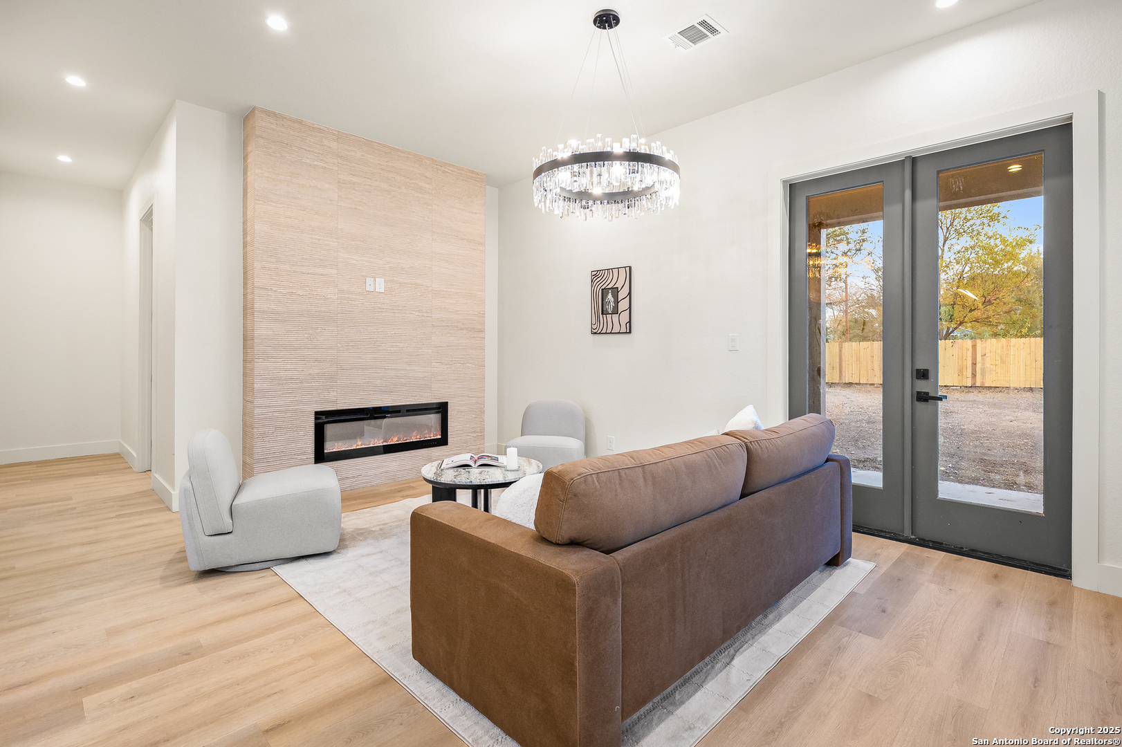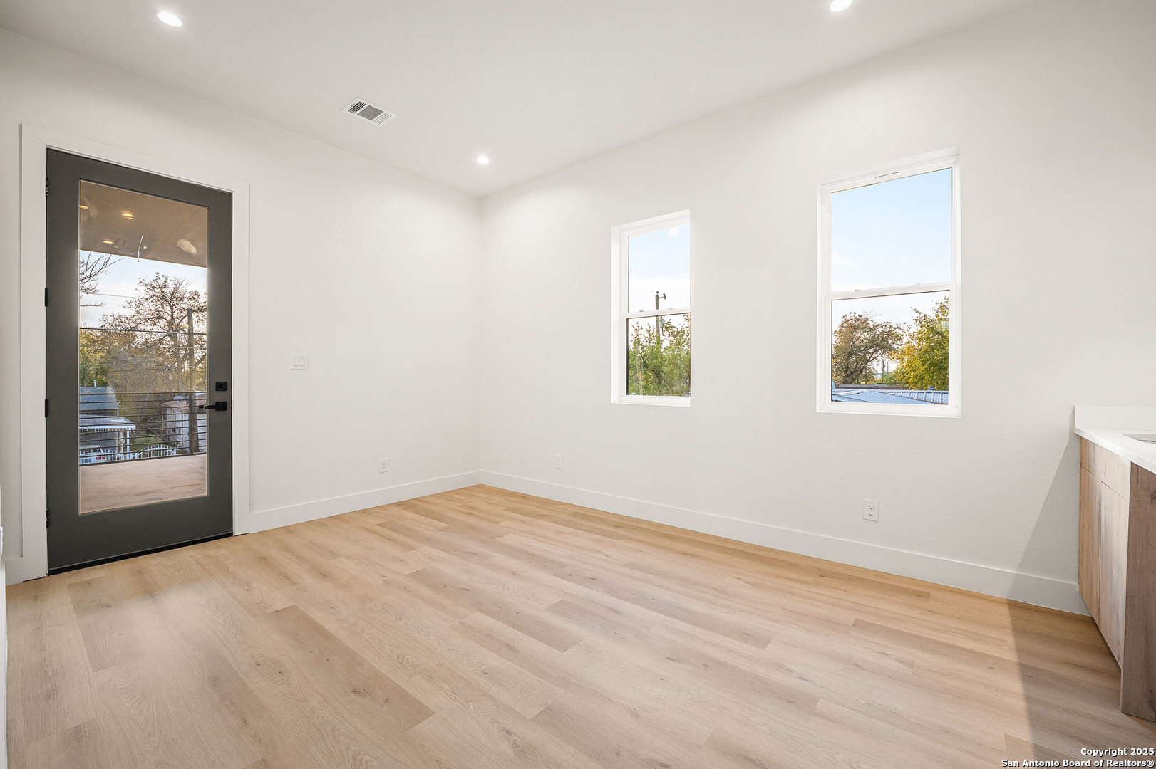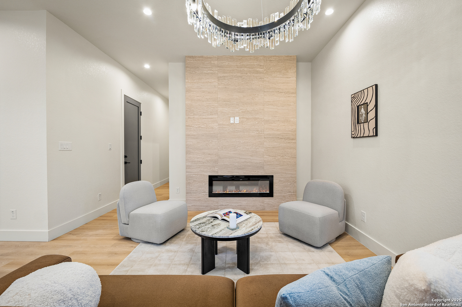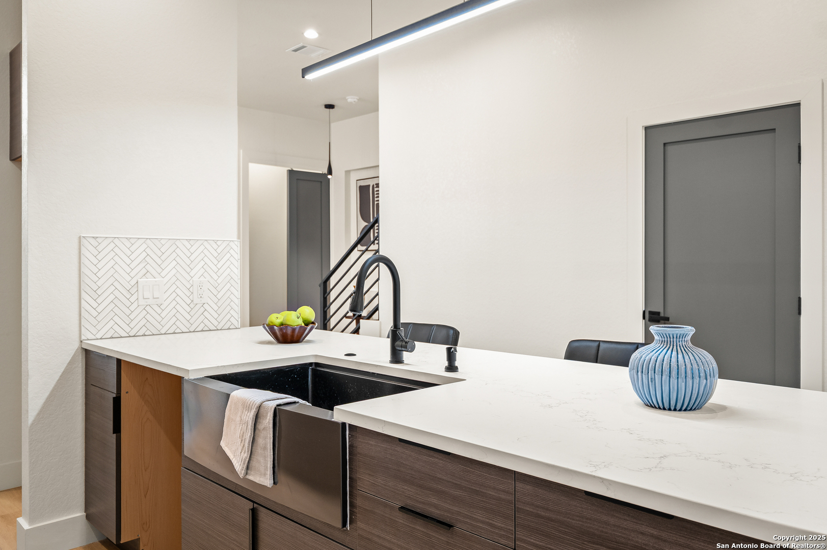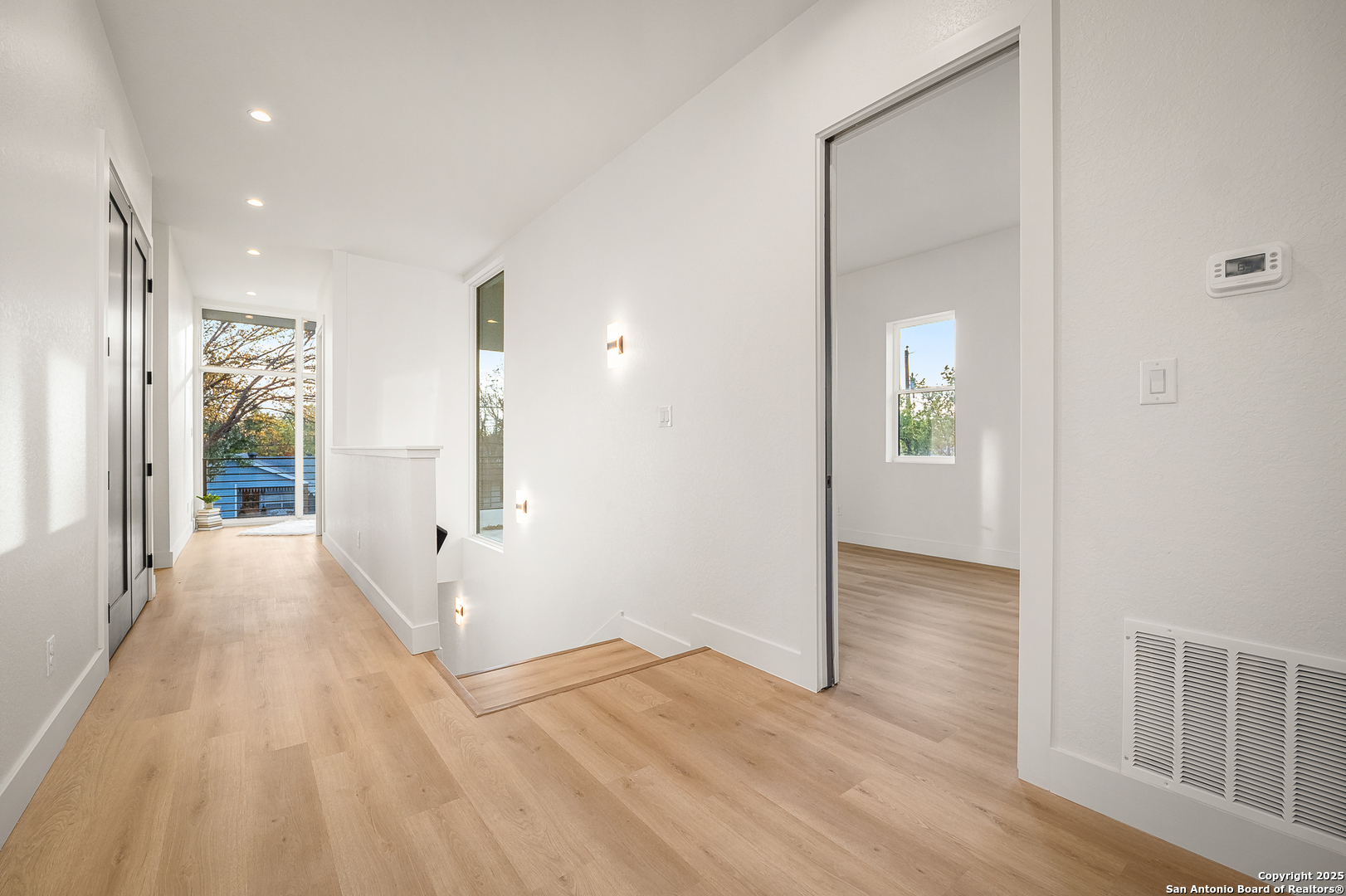 Experience modern minimalist luxury in this brand-new Japandi-inspired home just minutes from Downtown San Antonio. Situated in the vibrant Southtown/Lone Star Arts District, this contemporary new construction blends clean architectural lines with warm natural finishes and thoughtful design throughout. The open-concept layout is filled with natural light from floor-to-ceiling windows and features high ceilings and luxury vinyl flooring. The chef's kitchen showcases quartz countertops, European-style floating cabinetry, and sleek modern finishes, opening seamlessly to the main living area-perfect for entertaining. The primary suite is a private retreat with a spa-style bathroom featuring a soaking tub, rainfall walk-in shower, and a custom walk-in closet. A secondary living area with a built-in wet bar and wine fridge adds flexibility for entertaining, work-from-home, or relaxing. Outdoor living is a standout, with covered patio spaces and elevated views that capture the Tower of the Americas and downtown skyline. The spacious yard offers room for a future pool, garden, or casita. This home is equipped with modern conveniences, including a tankless water heater, smart garage with EV-ready outlet, and a high-security VDom Deux modern front door. Move-in ready and thoughtfully designed, this is a rare opportunity to own a luxury new construction home near downtown dining, culture, and entertainment.