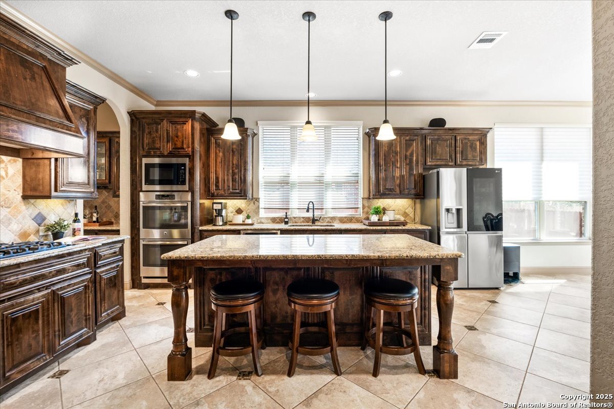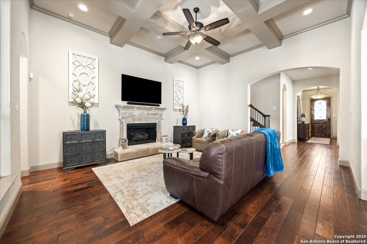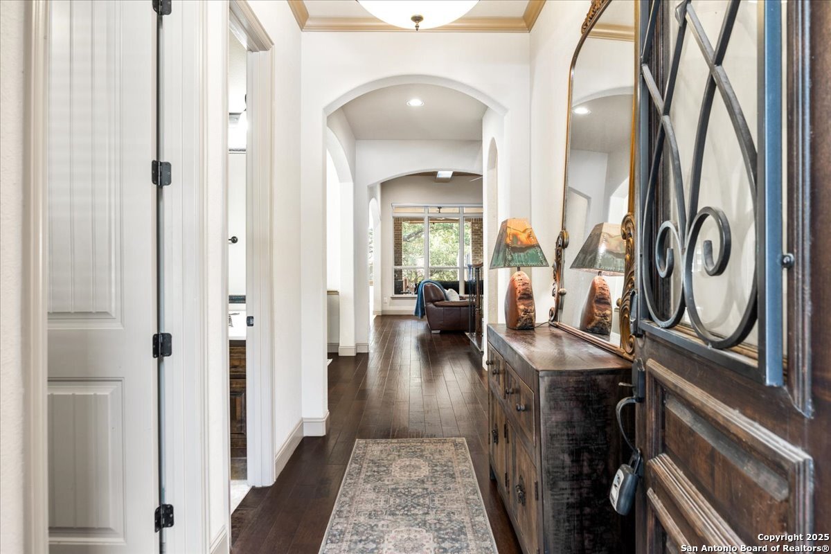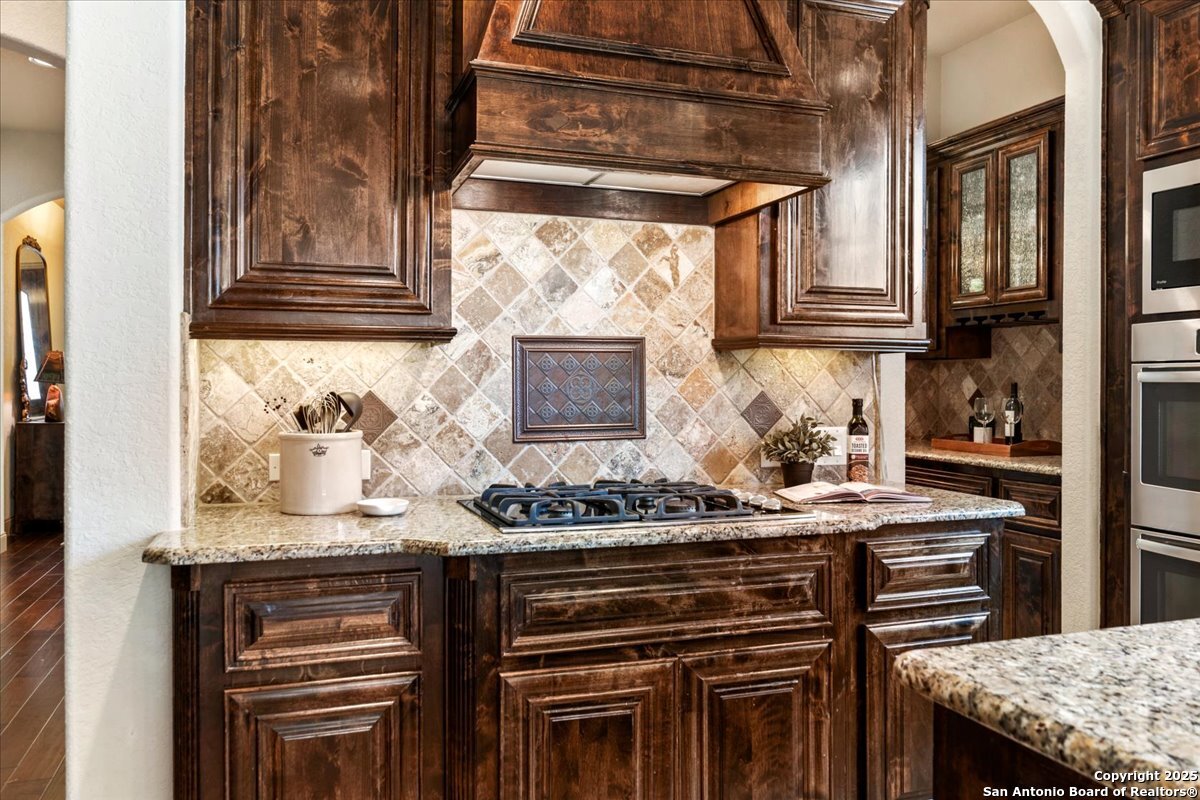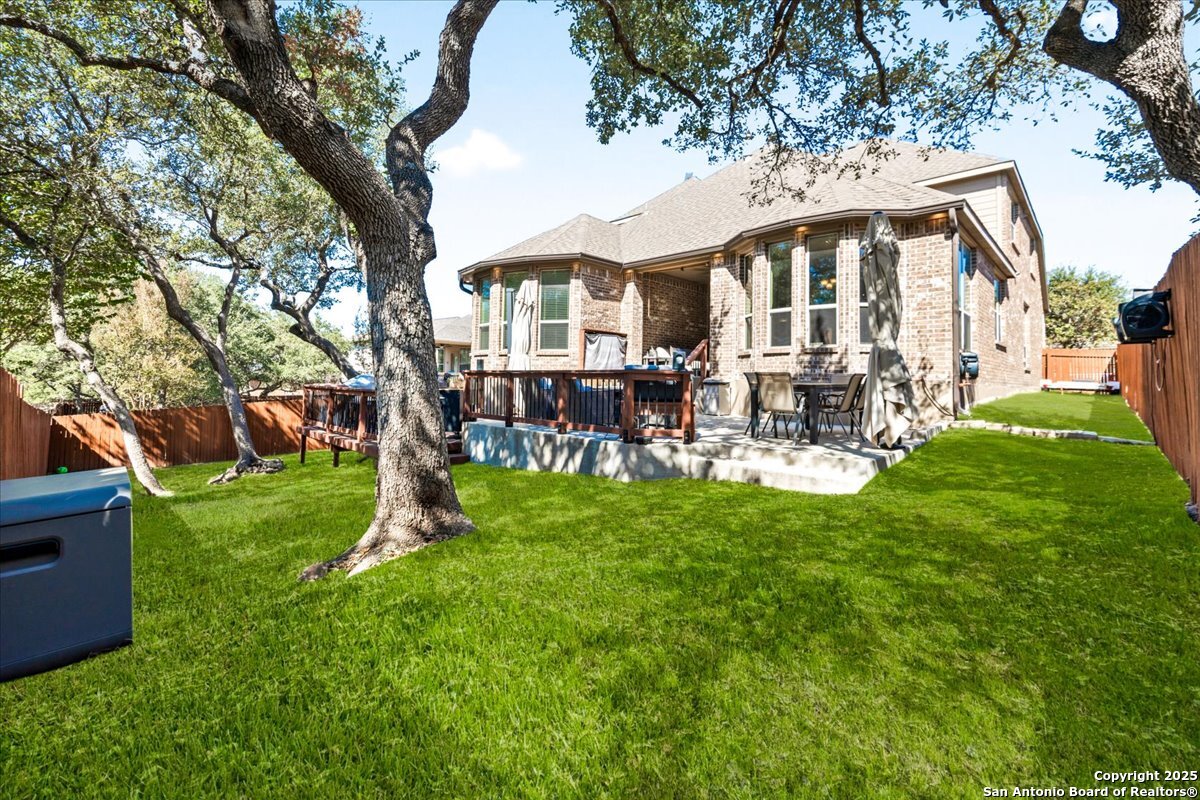 Impressive 5 Bedroom, 4 Bathroom home with a 3 car garage, exceptional upgrades, and inviting outdoor living spaces. Every detail of this thoughtfully designed home showcases comfort, style, and functionality throughout. Step outside to your private oasis featuring a covered patio, recently extended expansive patio, and a custom deck with bar seating - perfect for entertaining or relaxing year-round. Inside, you'll find rich wood flooring in the entry, study (optional 5th bedroom), dining room, and spacious family room. The open-concept gourmet island kitchen is a chef's dream with double ovens, gas cooktop, walk-in pantry, decorative wooden vent hood, and breakfast room that flows seamlessly into a family room with coffered ceiling and cozy fireplace. The primary suite and a secondary bedroom are conveniently located on the main floor. The luxurious primary retreat features bay windows, granite double vanity, oversized shower, garden tub, and an enormous walk-in closet. Upstairs, enjoy a large game room and three spacious bedrooms, including one with an ensuite bathroom, double vanities, and walk-in closet - ideal for a secondary primary suite or guest quarters. Additional features include soaring and vaulted ceilings, upgraded ceiling fans and lighting, a generous laundry room with cabinetry, and NO city taxes! Located in a vibrant community with Indian Springs Elementary (prestigious Comal ISD and zoned to Pieper High School) in the neighborhood and access to resort-style amenities - pool, park, pavilion, sports court, and more! Don't miss this incredible opportunity - luxury, space, and lifestyle all in one! Welcome home!