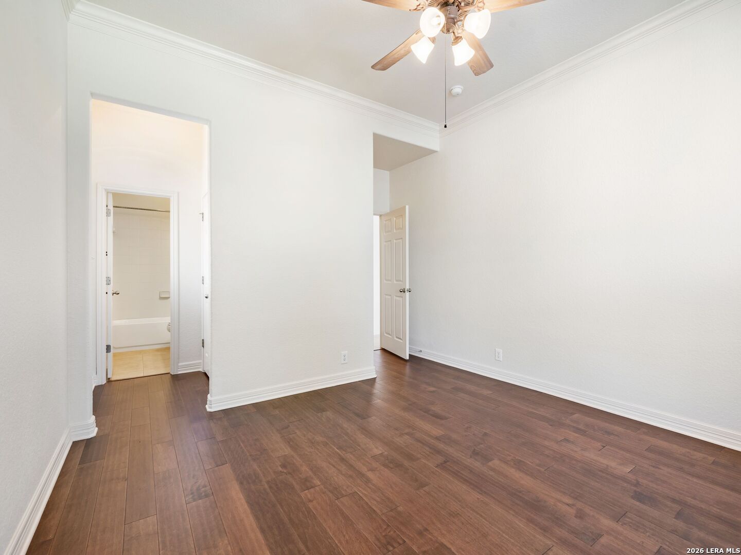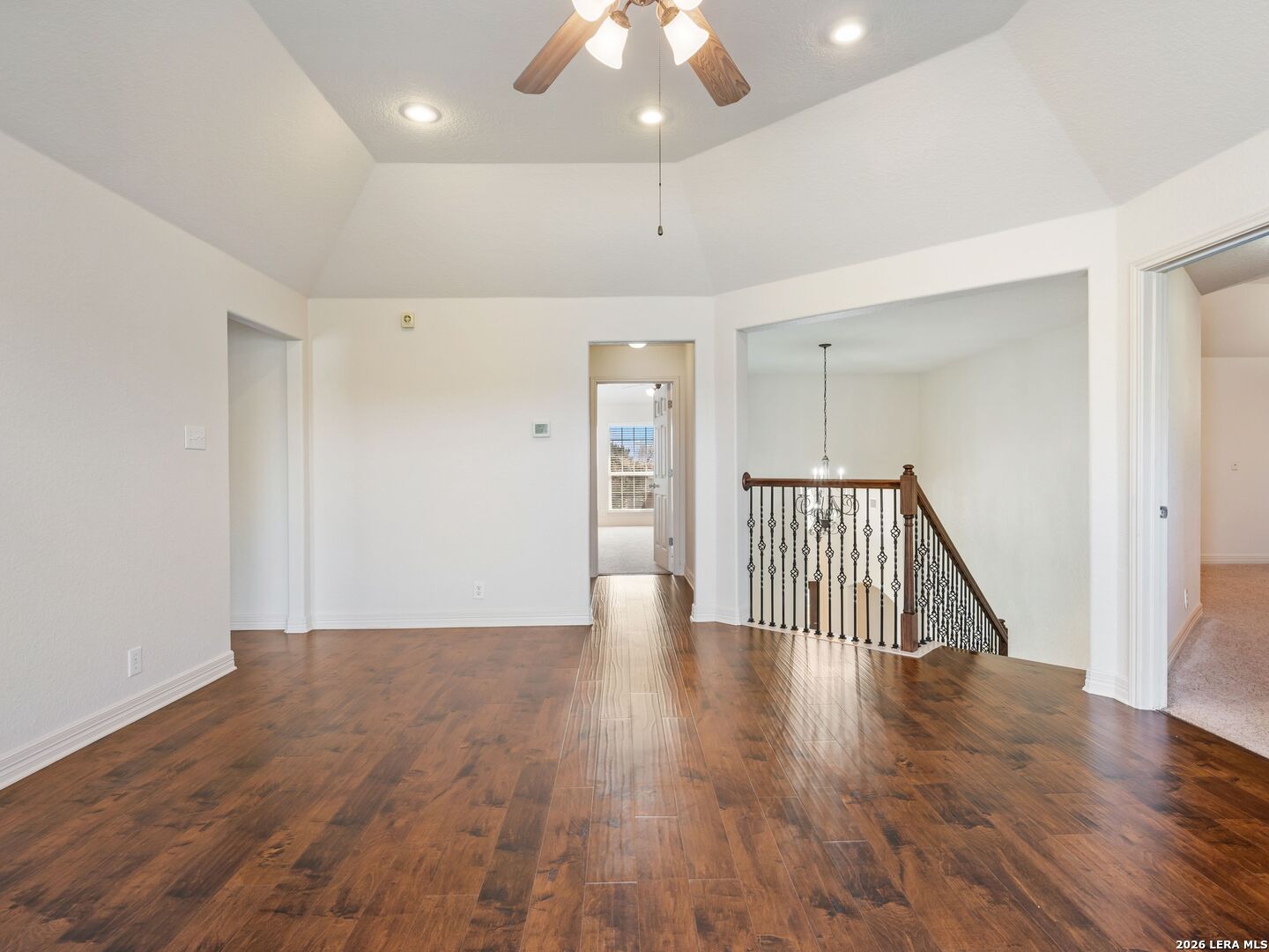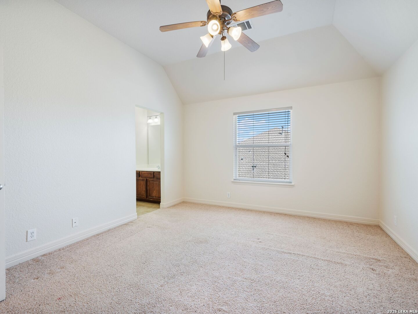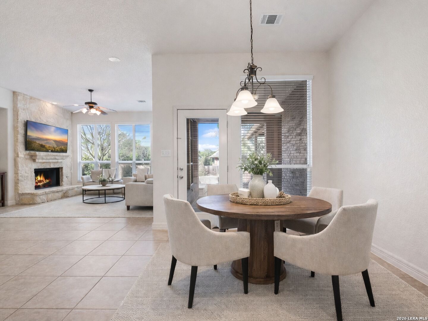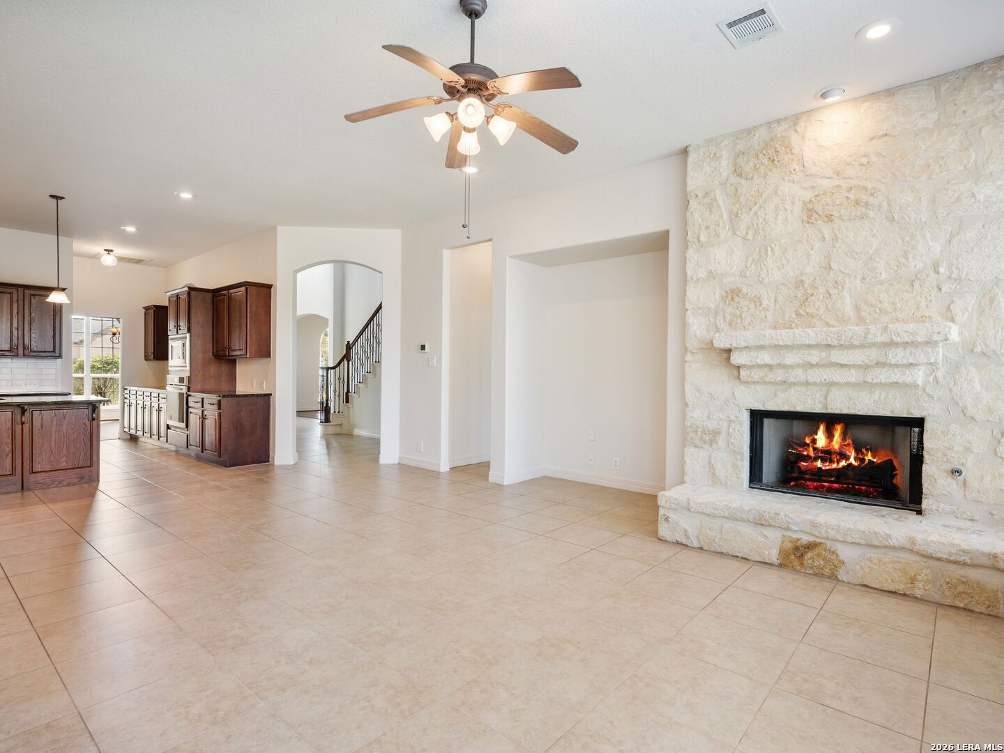 Designed for both grand entertaining and everyday comfort, this beautifully Highland Homes residence in the Summit at Canyon Springs offers a spacious multigenerational layout and exceptional indoor-outdoor living with refreshed interior paint. Step inside through the grand entry with soaring ceilings and abundant natural light, creating an immediate sense of openness and elegance. The thoughtfully designed floor plan leads into the heart of the home where the chef's kitchen features a breakfast bar, abundant cabinetry, and generous counter space, all flowing seamlessly into the expansive family room anchored by a dramatic floor-to-ceiling stone fireplace-perfect for gathering and entertaining. Tucked privately on the main level, the primary suite offers a peaceful retreat with space for a sitting area and large windows overlooking the backyard. The spa-inspired primary bathroom features a relaxing soaking tub, oversized walk-in shower, dual vanities with abundant storage, and a generously sized walk-in closet designed to accommodate extensive wardrobes with ease. Also on the main level is a secondary bedroom with a private en-suite bath, offering excellent flexibility for guests, multigenerational living, or a secondary private home office. Upstairs, the home becomes a true entertainment and recreation hub. Three spacious bedrooms feature walk-in closets and abundant natural light, with two connected by a convenient Jack-and-Jill bath and the third located near a full hall bath. The upper level also features a dedicated media room designed for immersive movie nights, along with an expansive game room ideal for billiards, gaming, or gathering. Just beyond, a hidden bonus space featuring a built-in rock-climbing wall adds a unique adventure-inspired element-perfect for an active playroom, home gym, or creative retreat. Step outside to your private backyard retreat designed for unforgettable gatherings, where mature trees provide shade and privacy. Enjoy outdoor living with a covered patio and pergola, a fully equipped outdoor kitchen, and a distinctive built-in sand fire pit, creating the perfect setting for relaxing evenings or lively entertaining under the Texas sky. Residents of Canyon Springs enjoy access to premier community amenities including a pool, parks, and recreation areas. The home is conveniently located near top-rated Comal ISD schools including Pieper High School, along with shopping, dining, medical facilities, and San Antonio International Airport.
