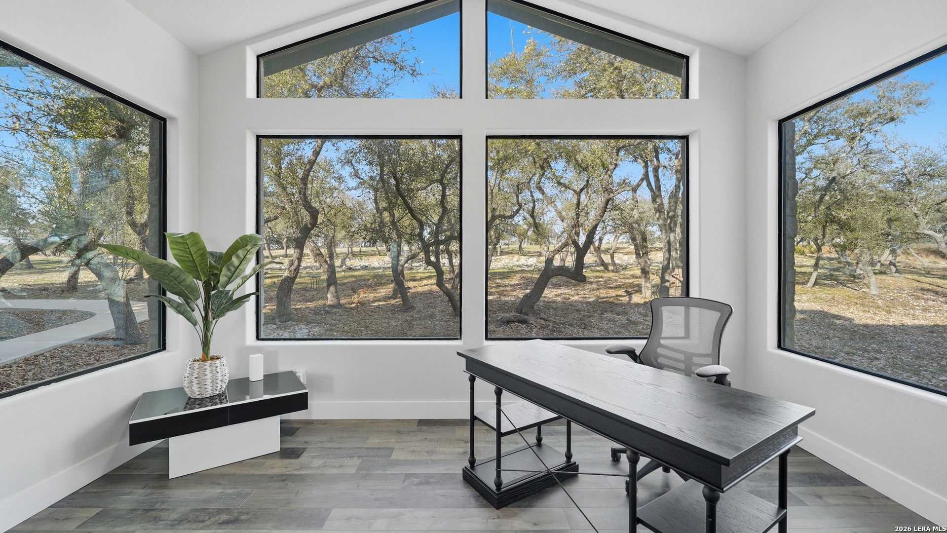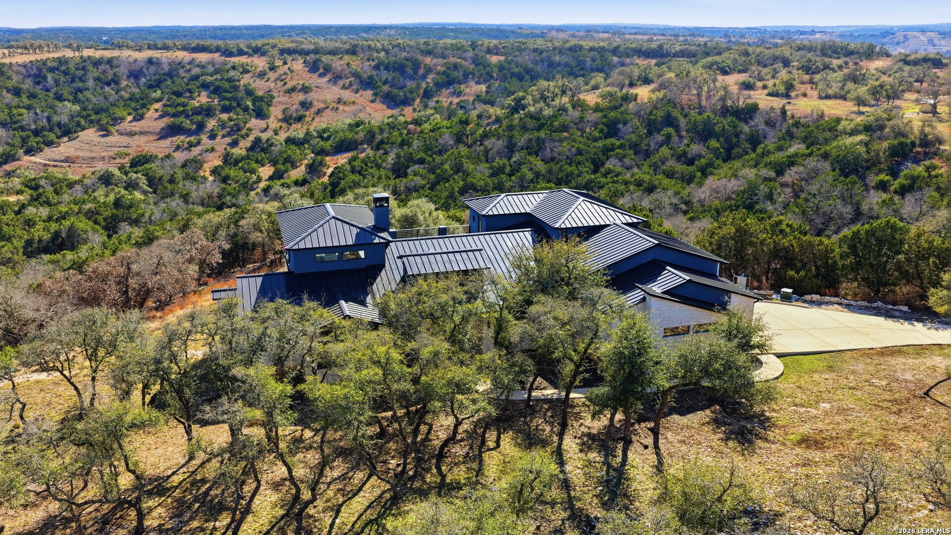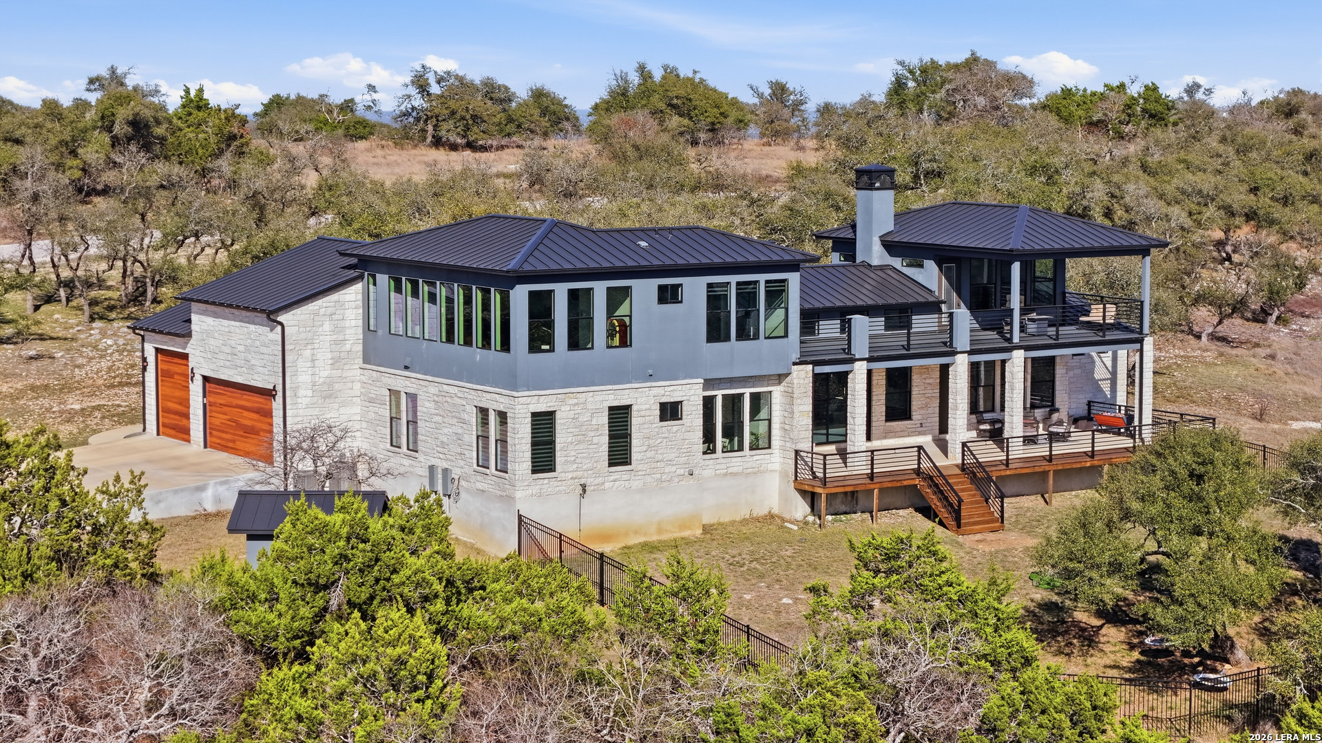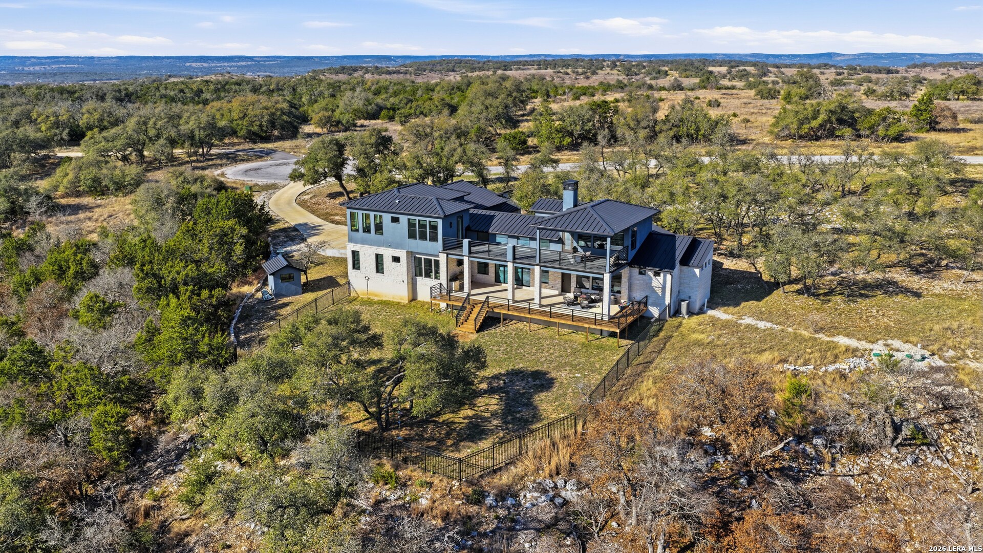 Sexy Contemporary Sophistication! This expansive luxury home offers everything your heart desires! Striking, upscale design with all the comfort of a relaxing retreat. The dramatic great room boasts vaulted ceilings, a floor to ceiling fireplace and windows at every turn! The kitchen feels seductive, with a statement of custom color & bold lines. Both The chandeliers in each dining space elevate every meal! Escaping into the primary suite feels like a private getaway, complete with a spa-inspired bathroom designed for ultimate relaxation. Working from home becomes a pleasure in the impressive office, where lofty ceilings and oversized picture windows frame beautiful outdoor views. Two separate staircases lead to distinct upstairs spaces. One side provides the perfect hobby room or private retreat, while the other features an oversized game room, media room, and a fourth bedroom-ideal for guests or a fitness studio. Both areas connect on the balcony where sweeping blue skies meet the majestic hills! Nestled among mature oak trees in a quiet cul-de-sac, this property offers exceptional privacy and natural beauty. Wildlife exempt, outside city limits, and located in sought-after Blanco ISD.