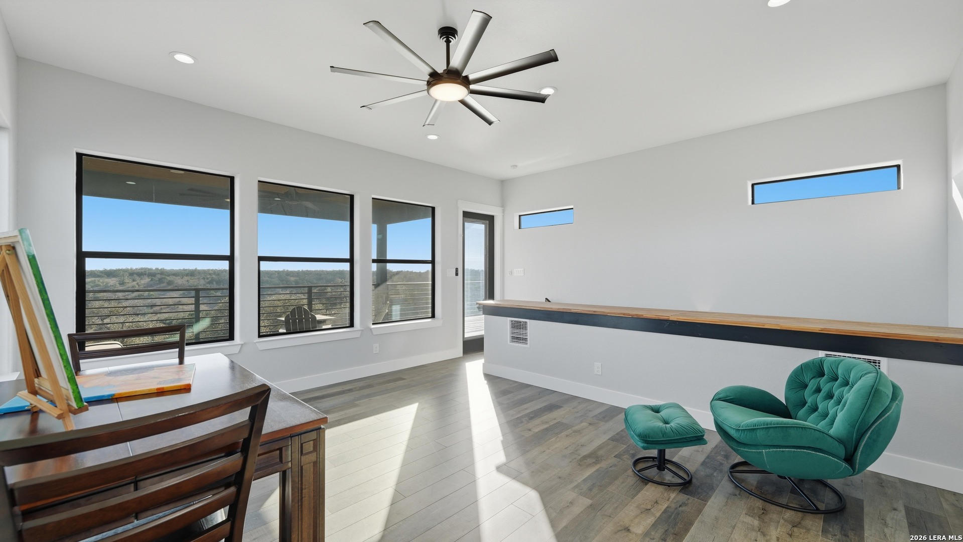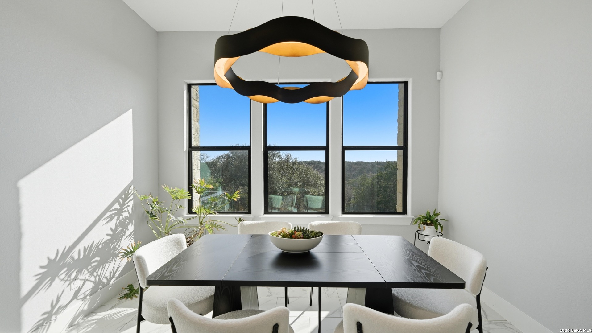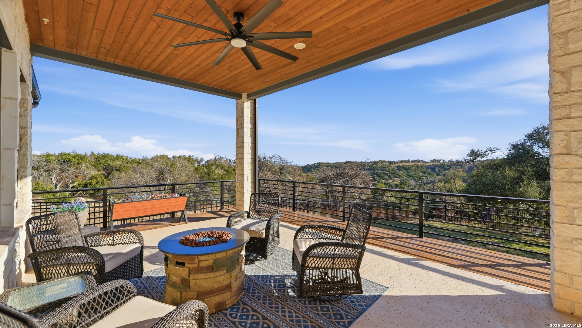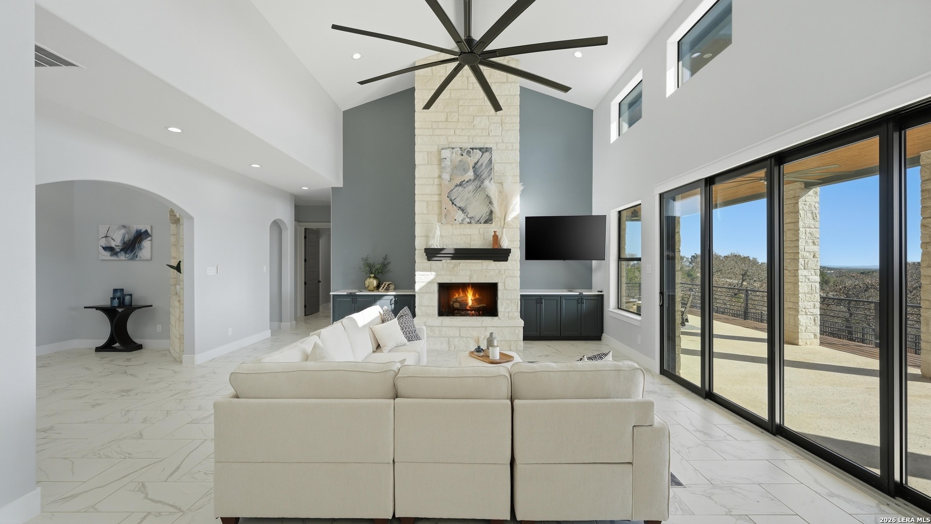 Sexy Contemporary Sophistication! This expansive luxury home offers everything your heart desires! Striking, upscale design with all the comfort of a relaxing retreat. The dramatic great room boasts vaulted ceilings, a floor to ceiling fireplace and windows at every turn! The kitchen feels seductive, with a statement of custom color & bold lines. Both The chandeliers in each dining space elevate every meal! Escaping into the primary suite feels like a private getaway, complete with a spa-inspired bathroom designed for ultimate relaxation. Working from home becomes a pleasure in the impressive office, where lofty ceilings and oversized picture windows frame beautiful outdoor views. Two separate staircases lead to distinct upstairs spaces. One side provides the perfect hobby room or private retreat, while the other features an oversized game room, media room, and a fourth bedroom-ideal for guests or a fitness studio. Both areas connect on the balcony where sweeping blue skies meet the majestic hills! Nestled among mature oak trees in a quiet cul-de-sac, this property offers exceptional privacy and natural beauty. Wildlife exempt, outside city limits, and located in sought-after Blanco ISD.