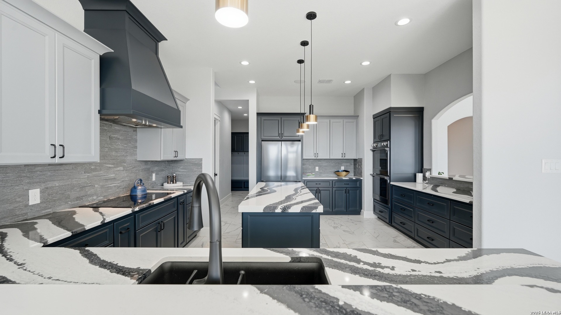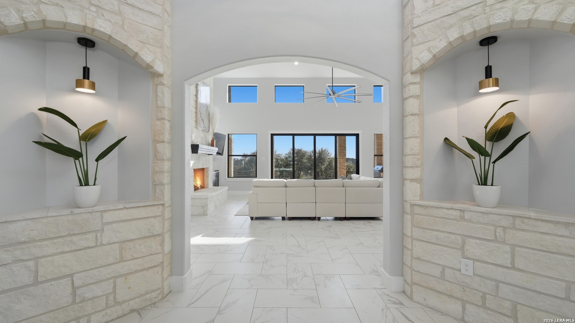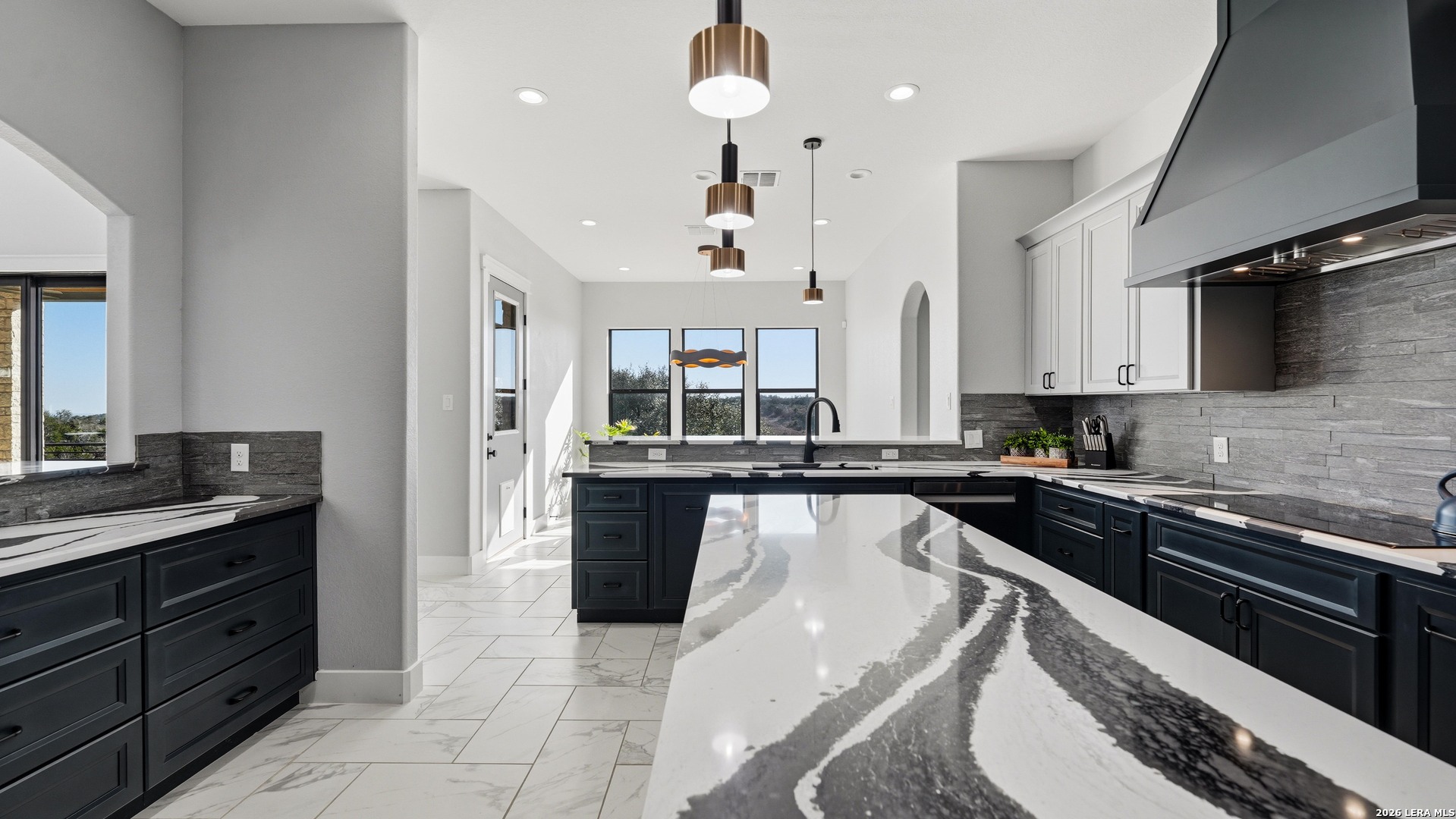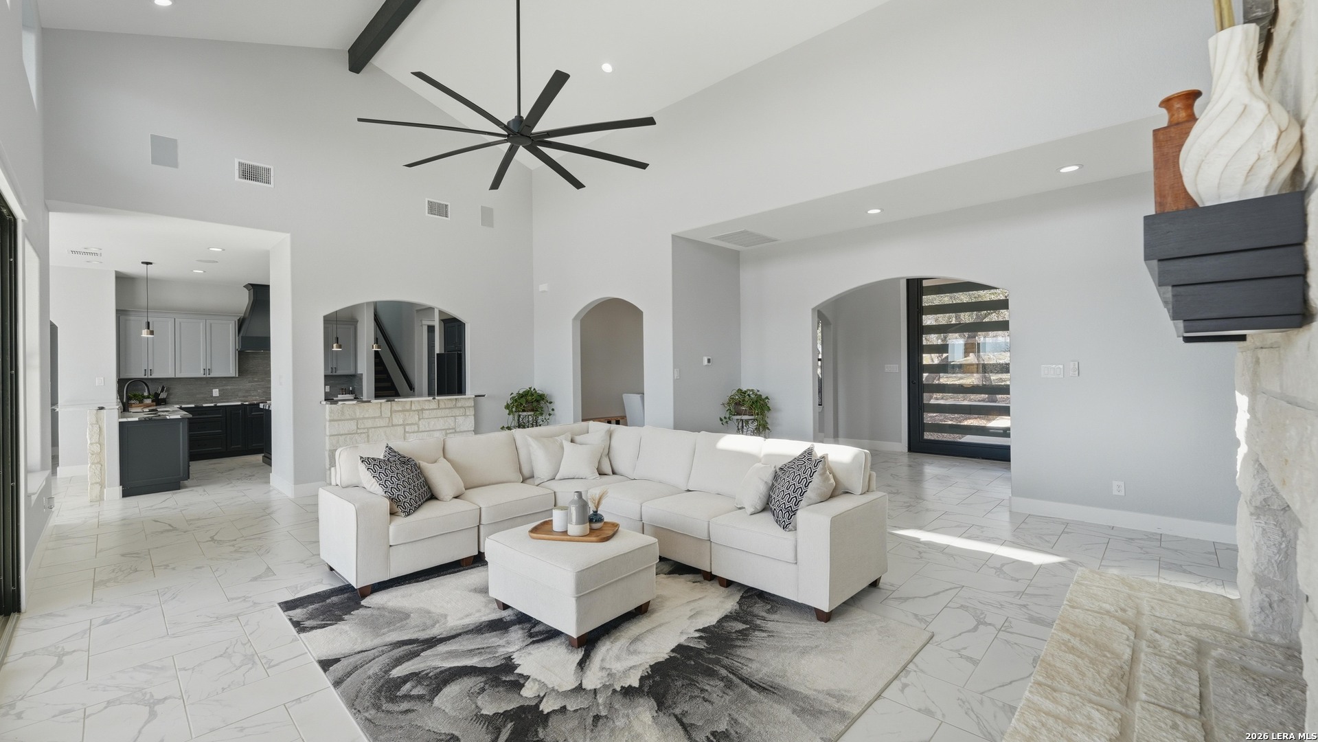 Sexy Contemporary Sophistication! This expansive luxury home offers everything your heart desires! Striking, upscale design with all the comfort of a relaxing retreat. The dramatic great room boasts vaulted ceilings, a floor to ceiling fireplace and windows at every turn! The kitchen feels seductive, with a statement of custom color & bold lines. Both The chandeliers in each dining space elevate every meal! Escaping into the primary suite feels like a private getaway, complete with a spa-inspired bathroom designed for ultimate relaxation. Working from home becomes a pleasure in the impressive office, where lofty ceilings and oversized picture windows frame beautiful outdoor views. Two separate staircases lead to distinct upstairs spaces. One side provides the perfect hobby room or private retreat, while the other features an oversized game room, media room, and a fourth bedroom-ideal for guests or a fitness studio. Both areas connect on the balcony where sweeping blue skies meet the majestic hills! Nestled among mature oak trees in a quiet cul-de-sac, this property offers exceptional privacy and natural beauty. Wildlife exempt, outside city limits, and located in sought-after Blanco ISD.