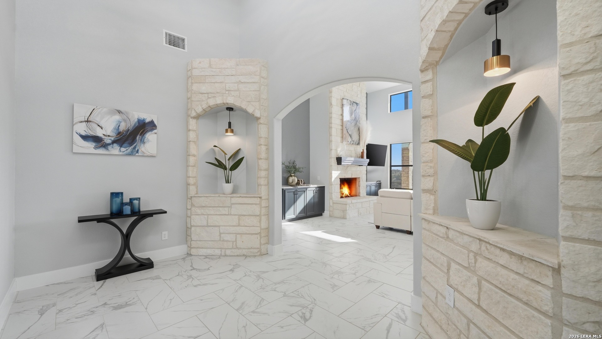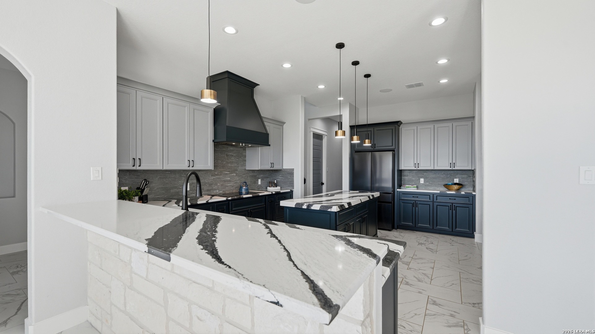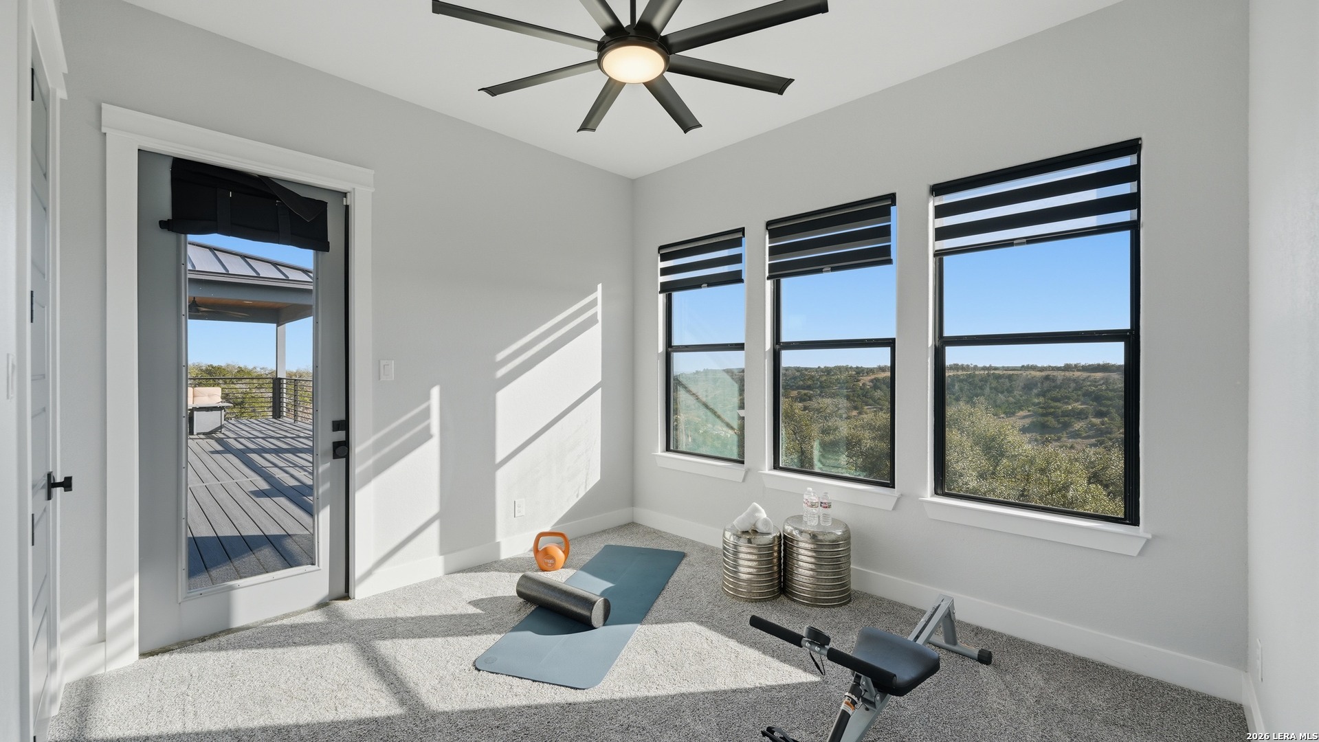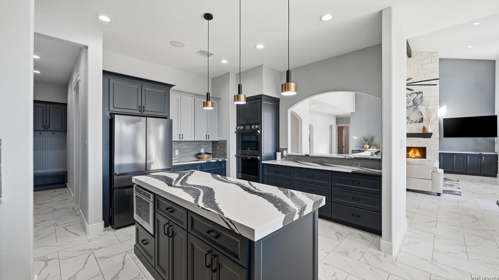 Sexy Contemporary Sophistication! This expansive luxury home offers everything your heart desires! Striking, upscale design with all the comfort of a relaxing retreat. The dramatic great room boasts vaulted ceilings, a floor to ceiling fireplace and windows at every turn! The kitchen feels seductive, with a statement of custom color & bold lines. Both The chandeliers in each dining space elevate every meal! Escaping into the primary suite feels like a private getaway, complete with a spa-inspired bathroom designed for ultimate relaxation. Working from home becomes a pleasure in the impressive office, where lofty ceilings and oversized picture windows frame beautiful outdoor views. Two separate staircases lead to distinct upstairs spaces. One side provides the perfect hobby room or private retreat, while the other features an oversized game room, media room, and a fourth bedroom-ideal for guests or a fitness studio. Both areas connect on the balcony where sweeping blue skies meet the majestic hills! Nestled among mature oak trees in a quiet cul-de-sac, this property offers exceptional privacy and natural beauty. Wildlife exempt, outside city limits, and located in sought-after Blanco ISD.