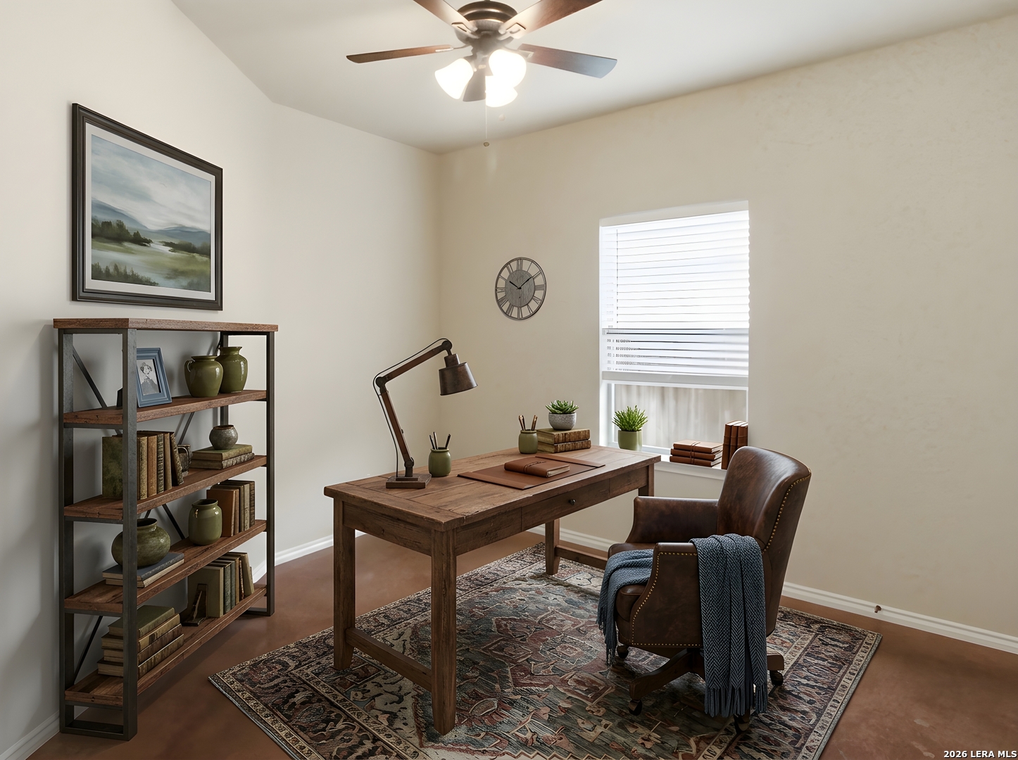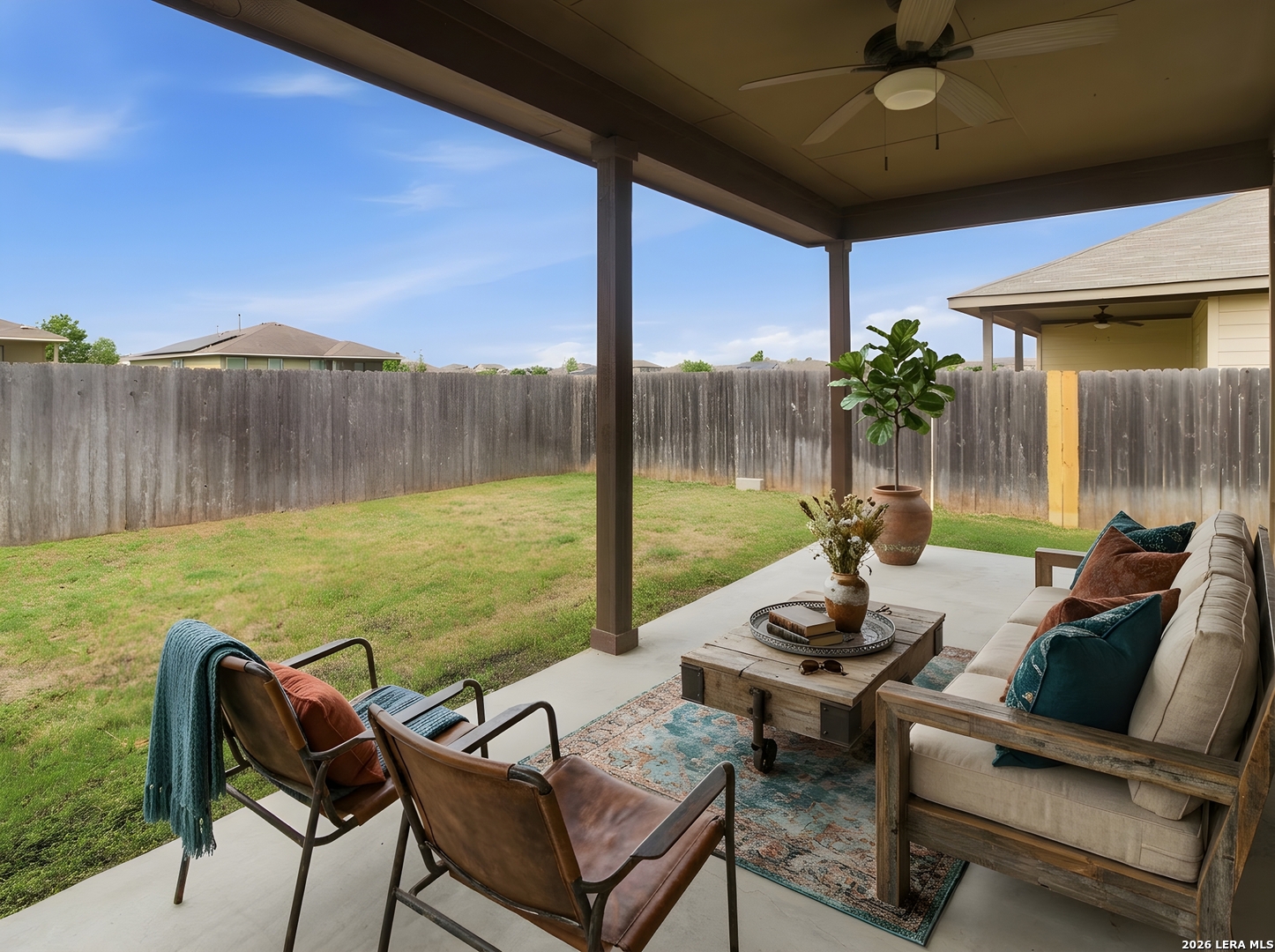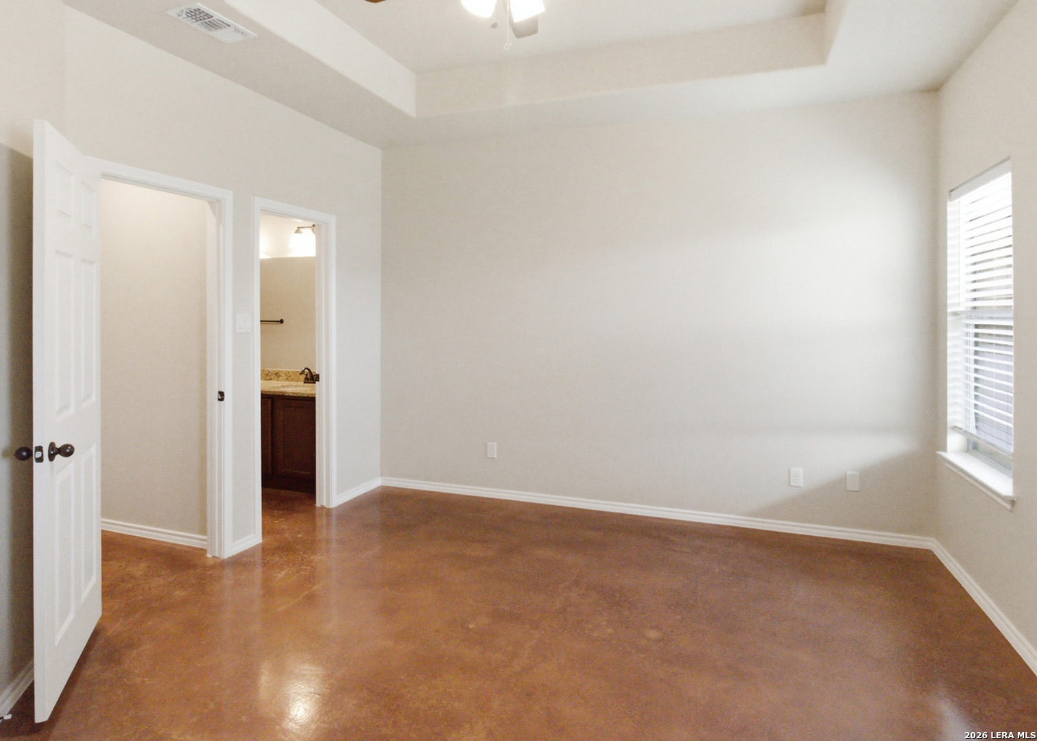 3 Bedroom Duplex with Stained Concrete Floors and Greenbelt Views! This single-story duplex offers an open floor plan with a spacious living area and easy-maintenance stained concrete flooring throughout. The kitchen features granite countertops, a breakfast bar, updated sink, and built-in microwave, with refrigerator included. High ceilings and ceiling fans throughout add to the bright, comfortable feel. The primary suite includes a walk-in closet and double vanity. Enjoy a covered back patio with ceiling fan, a privacy-fenced yard, and a peaceful setting that backs to a greenbelt. Additional features include washer and dryer connections, garage door opener, and a sprinkler system. Conveniently located near schools, shopping, and dining. Schedule your showing or apply today!