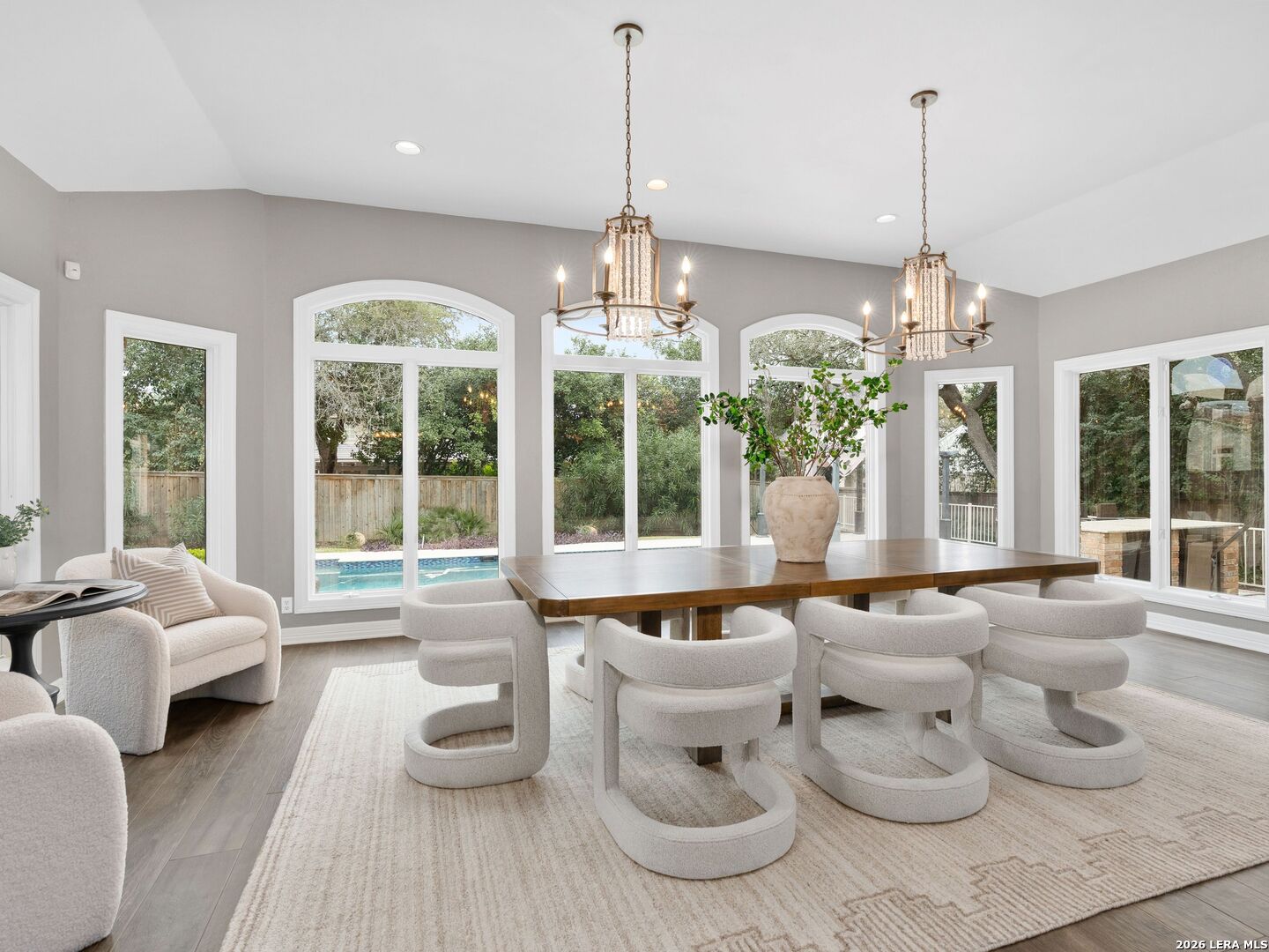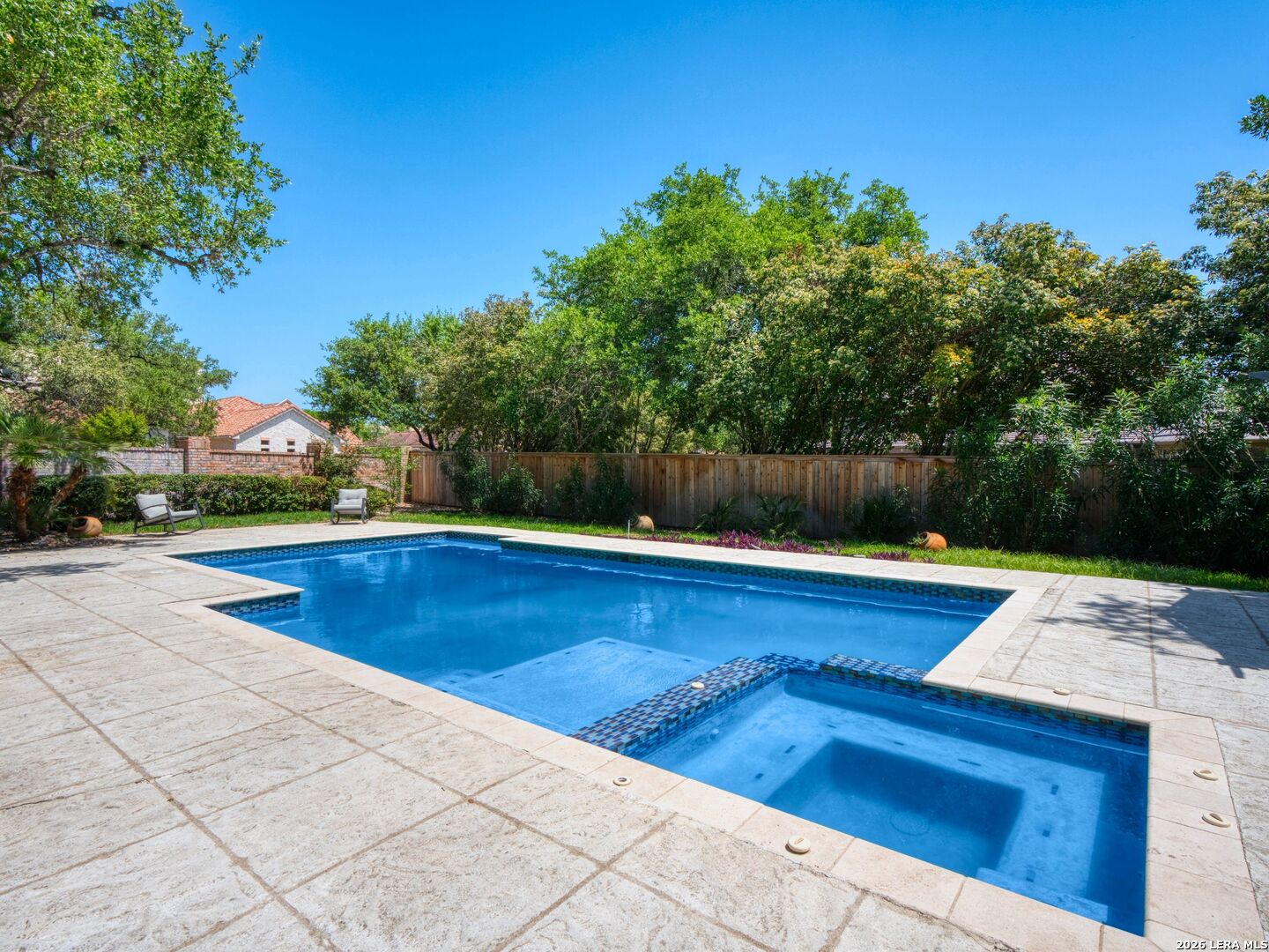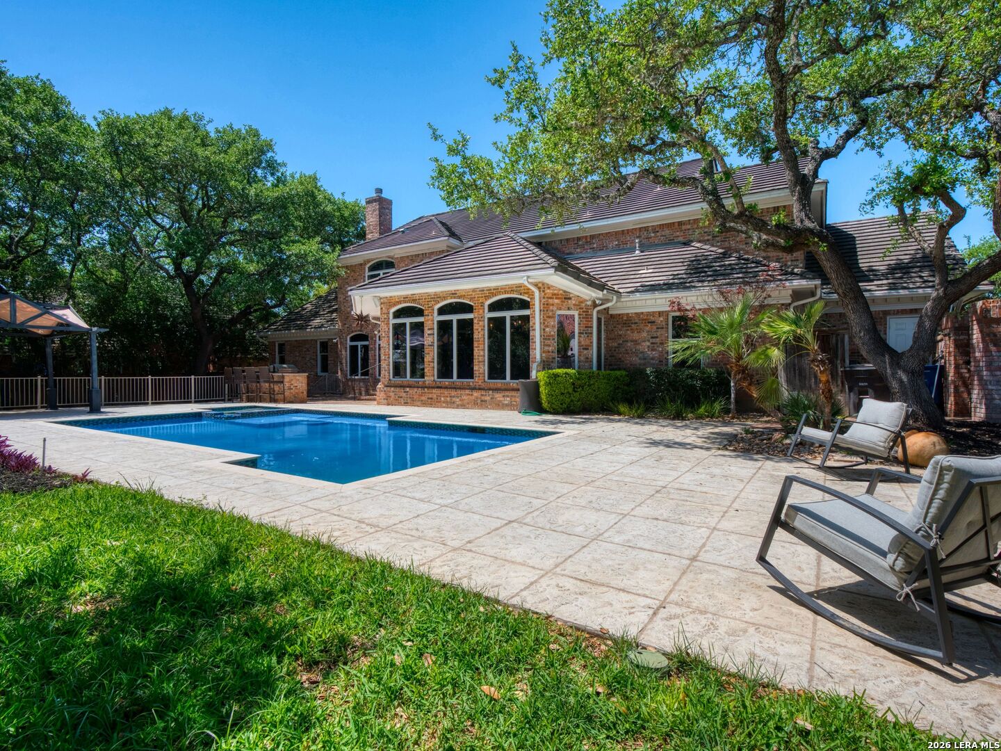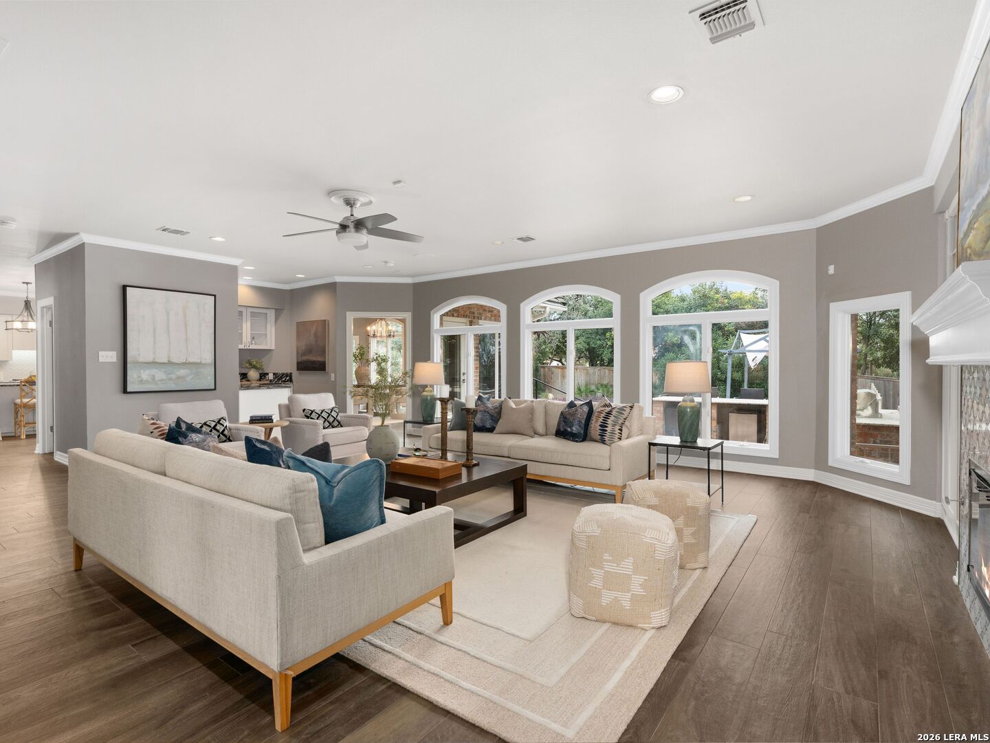 This stately 5-bed, 4.5-bath home on a corner lot in the gated Waters at Deerfield offers upscale living with functional design. A dramatic two-story entry and sweeping staircase set the tone for elegance throughout. Enjoy a gourmet kitchen with Sub-Zero fridge, double ovens, gas cooktop, and oversized granite island. The open family room overlooks a sparkling pool, lush yard, and outdoor kitchen-perfect for entertaining. The main level features formal living/dining, a wood-paneled office, a second living area, and a guest suite with full bath. Upstairs boasts a luxurious primary suite with two walk-in closets, whirlpool tub, sitting area, and workout space. Also upstairs you will find three additional bedrooms and two full bathrooms. Zoned to top-tier schools, this exceptional property combines luxury, space, and location for the ultimate lifestyle in one of the city's most sought-after neighborhoods.