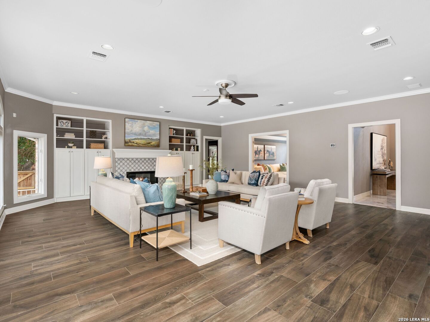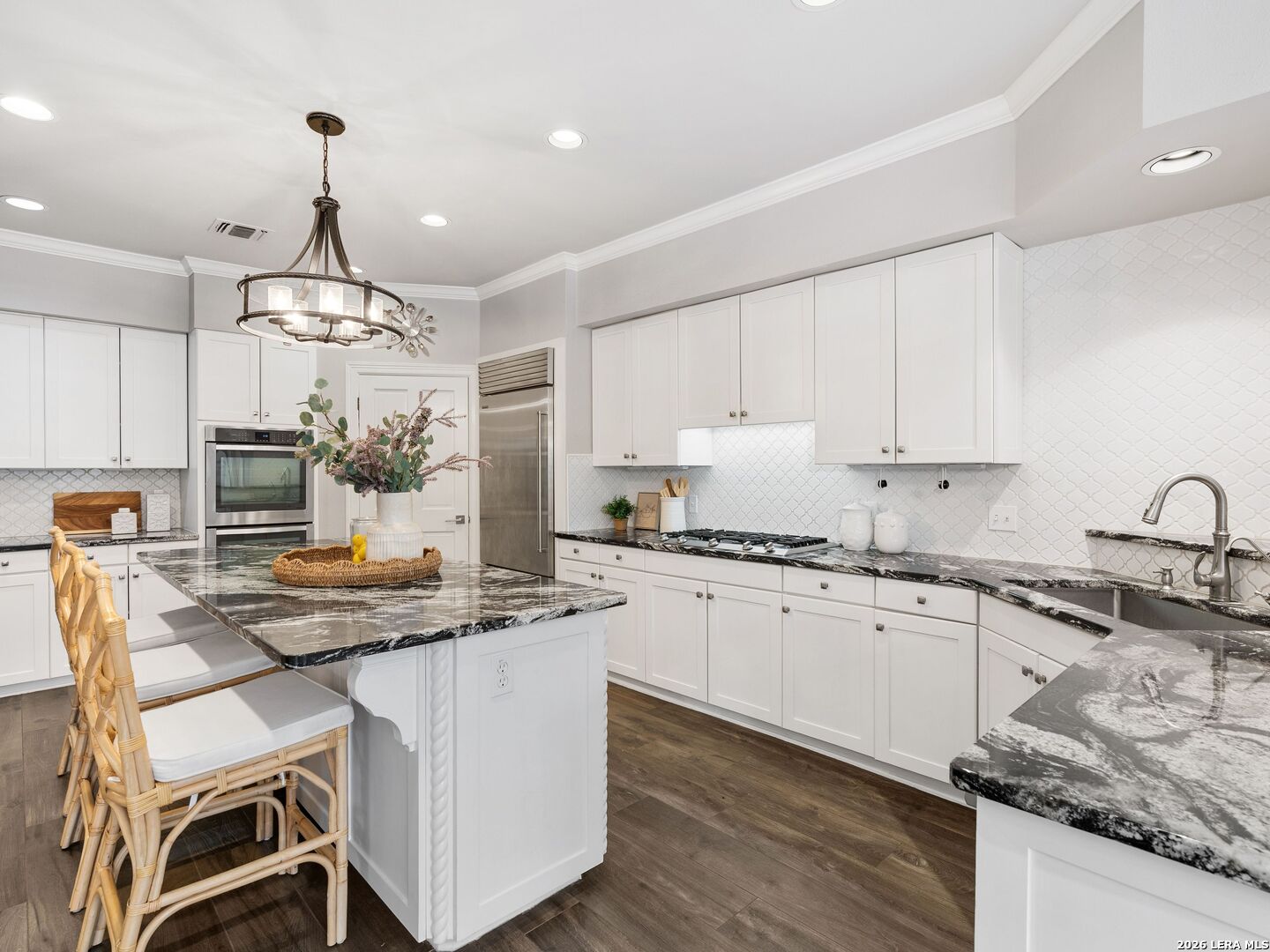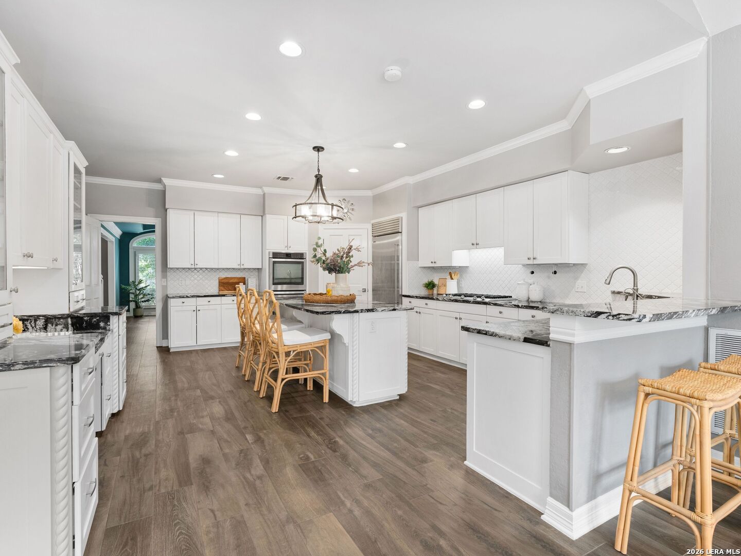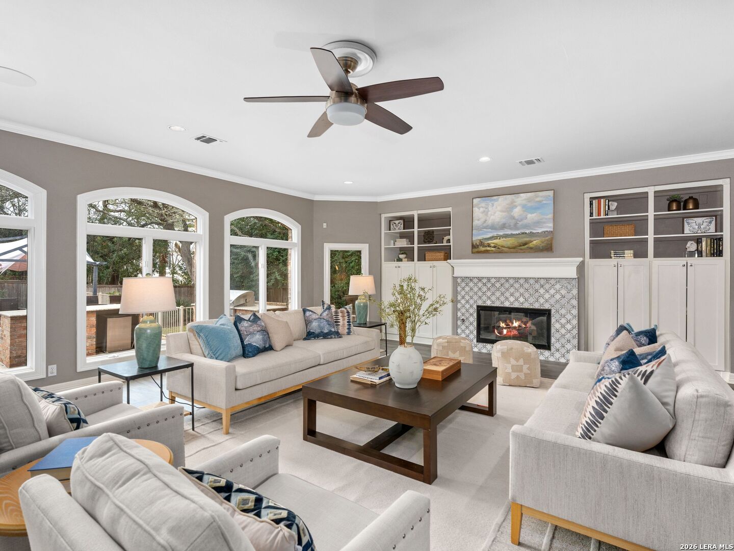 This stately 5-bed, 4.5-bath home on a corner lot in the gated Waters at Deerfield offers upscale living with functional design. A dramatic two-story entry and sweeping staircase set the tone for elegance throughout. Enjoy a gourmet kitchen with Sub-Zero fridge, double ovens, gas cooktop, and oversized granite island. The open family room overlooks a sparkling pool, lush yard, and outdoor kitchen-perfect for entertaining. The main level features formal living/dining, a wood-paneled office, a second living area, and a guest suite with full bath. Upstairs boasts a luxurious primary suite with two walk-in closets, whirlpool tub, sitting area, and workout space. Also upstairs you will find three additional bedrooms and two full bathrooms. Zoned to top-tier schools, this exceptional property combines luxury, space, and location for the ultimate lifestyle in one of the city's most sought-after neighborhoods.