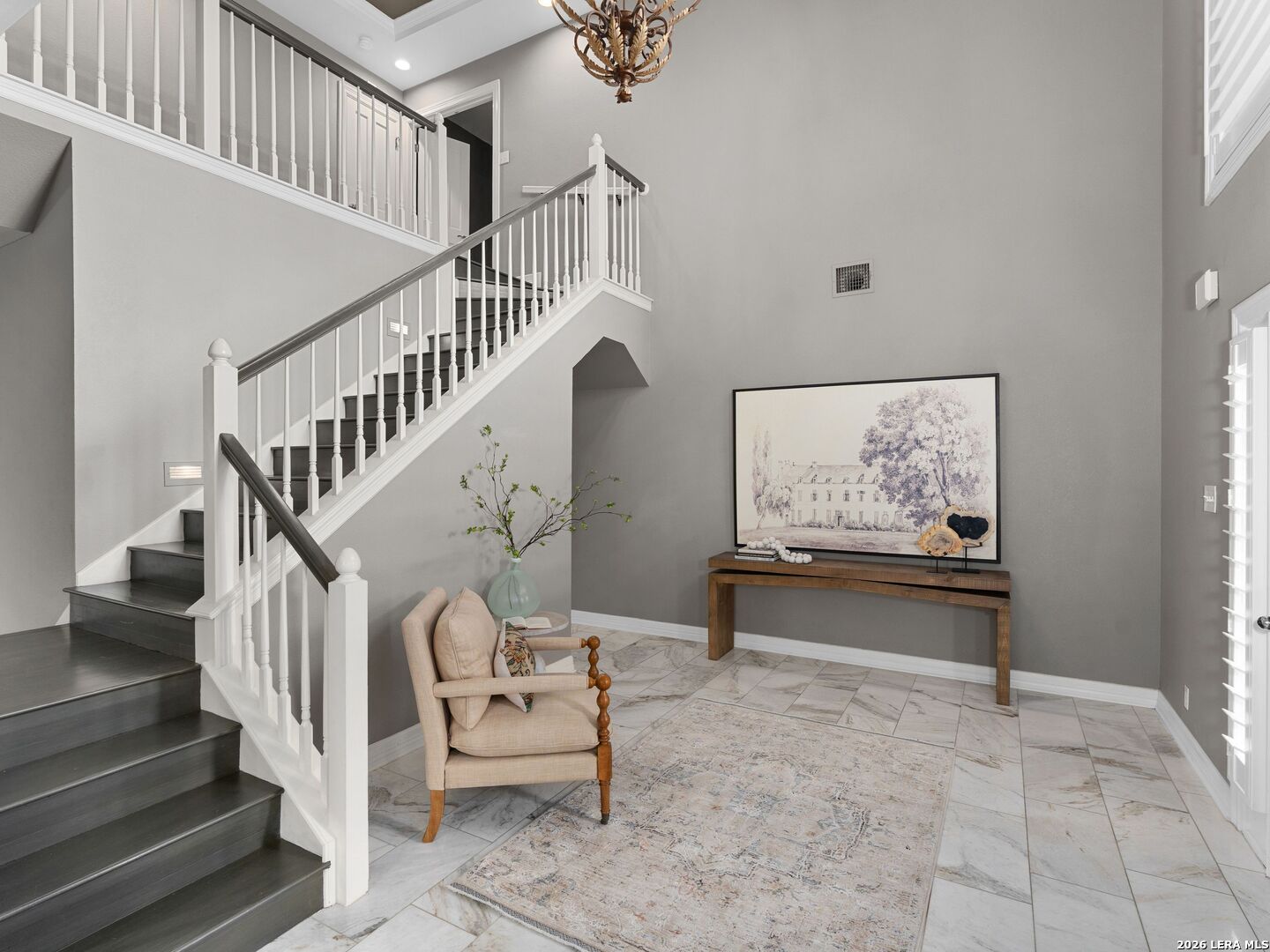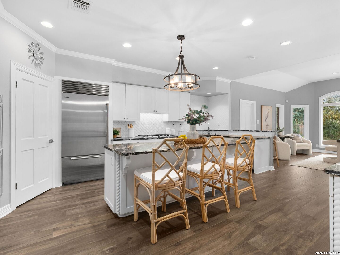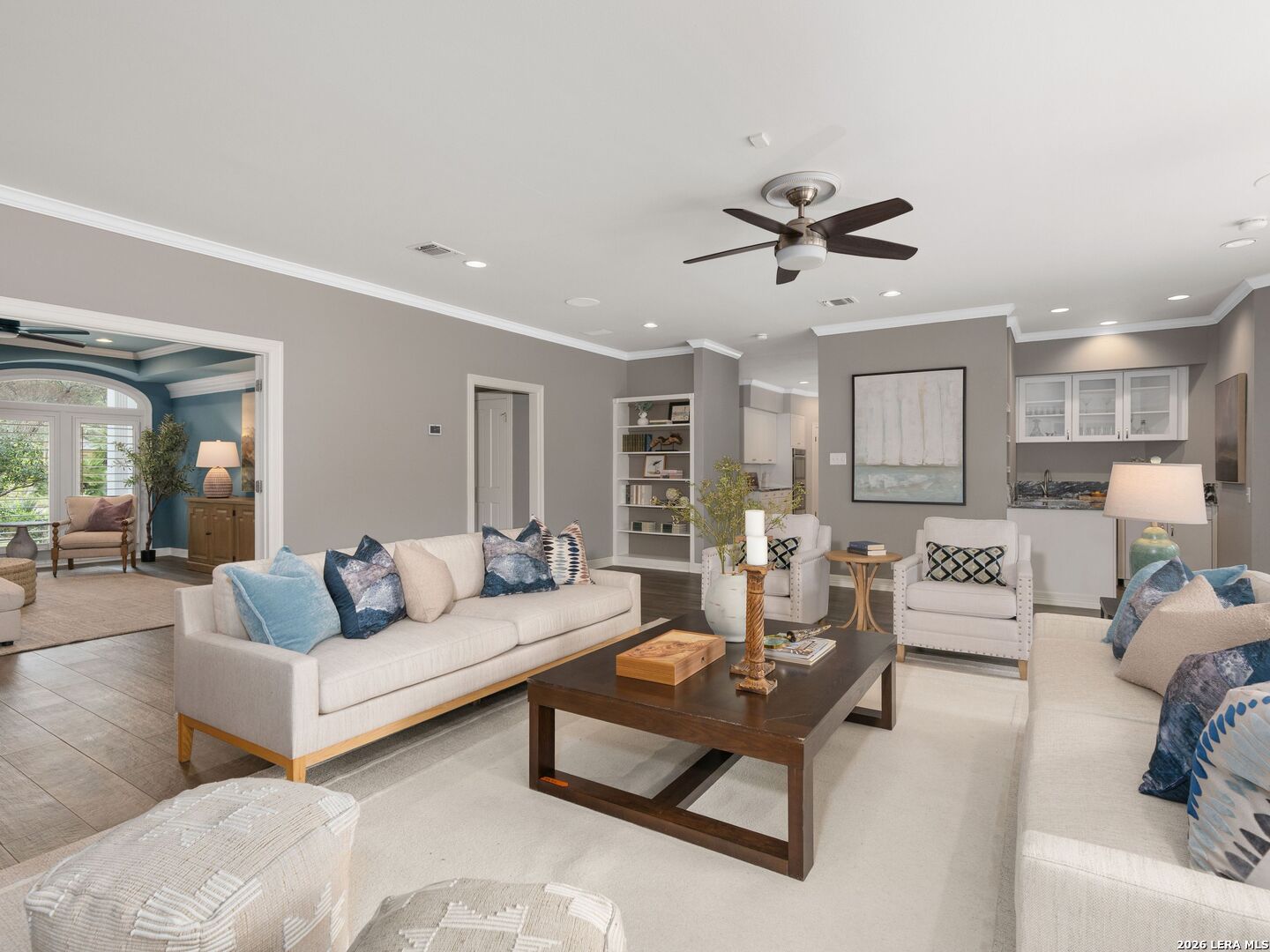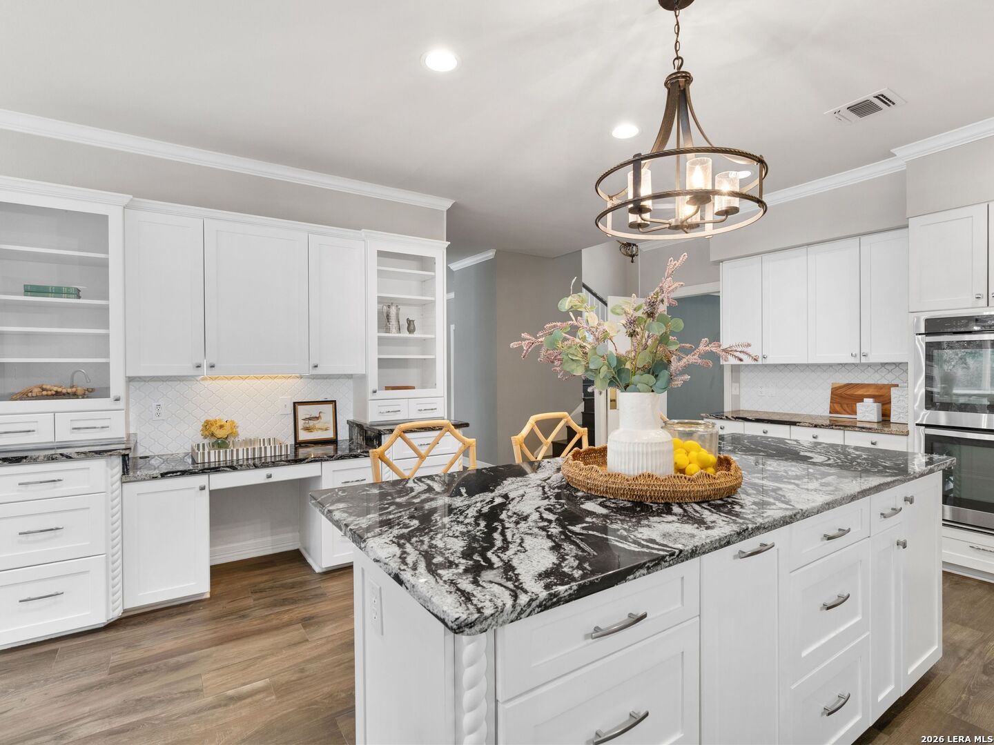This stately 5-bed, 4.5-bath home on a corner lot in the gated Waters at Deerfield offers upscale living with functional design. A dramatic two-story entry and sweeping staircase set the tone for elegance throughout. Enjoy a gourmet kitchen with Sub-Zero fridge, double ovens, gas cooktop, and oversized granite island. The open family room overlooks a sparkling pool, lush yard, and outdoor kitchen-perfect for entertaining. The main level features formal living/dining, a wood-paneled office, a second living area, and a guest suite with full bath. Upstairs boasts a luxurious primary suite with two walk-in closets, whirlpool tub, sitting area, and workout space. Also upstairs you will find three additional bedrooms and two full bathrooms. Zoned to top-tier schools, this exceptional property combines luxury, space, and location for the ultimate lifestyle in one of the city's most sought-after neighborhoods.