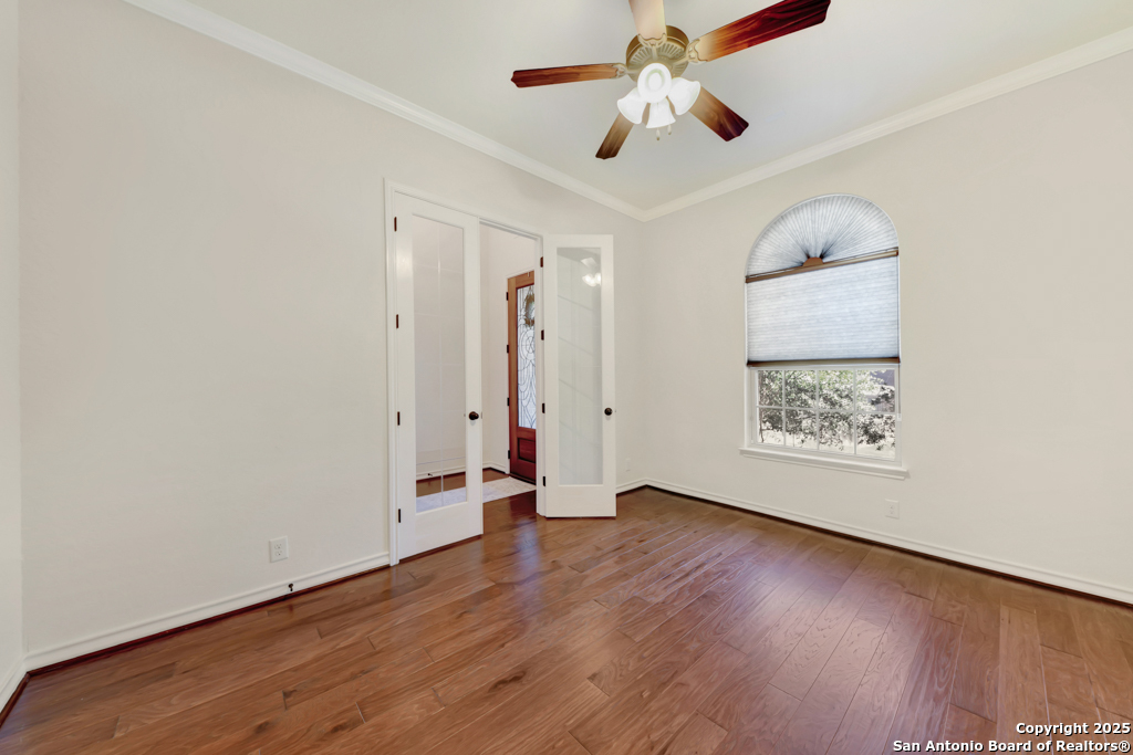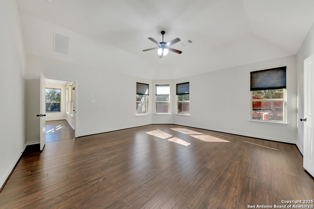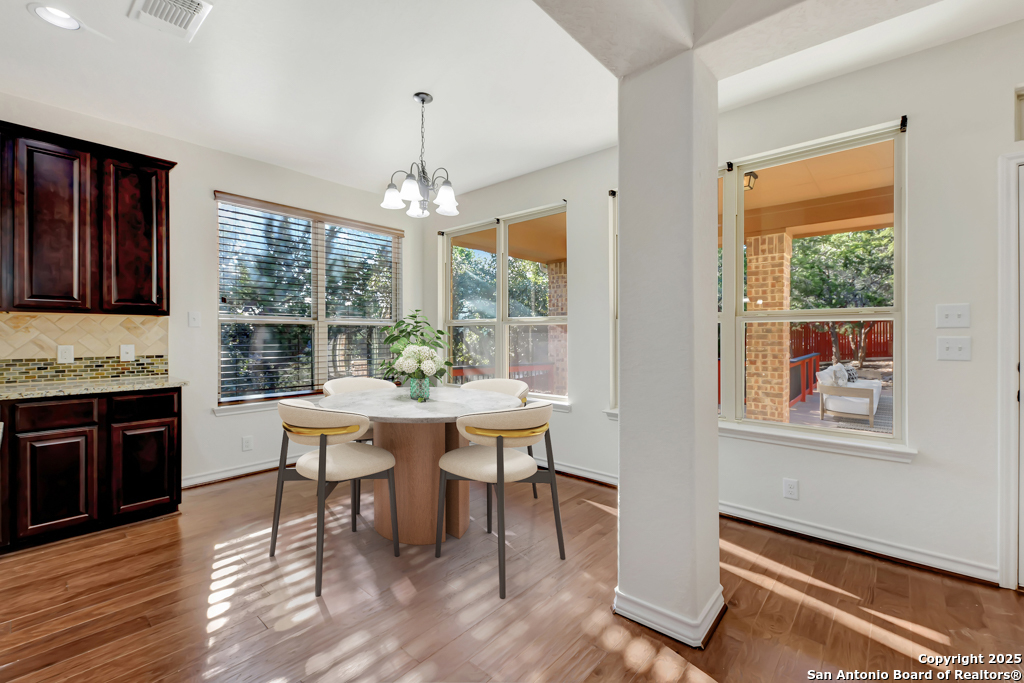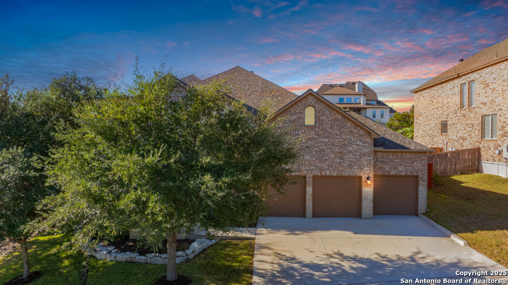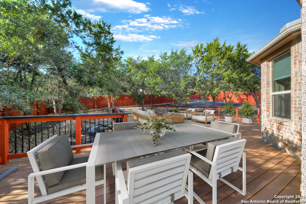 Welcome to INDIAN SPRINGS ESTATES-a park-like setting where you can enjoy serene nature without ever leaving home. This beautifully maintained single story Highland Homes property sits on an elevated homesite overlooking a lush, tree-shaded yard and is truly move-in ready. Step inside to find gorgeous easy care wood flooring throughout and abundant natural light from the many windows across the back of the home-providing stunning views you won't find elsewhere. Pretty double glass doors open to a private office, perfect for working from home or relaxing in a quiet space with a book. Entertain with ease in the formal dining room with convenient pass through access to the kitchen. Drop zone in the kitchen offers a place to check the family calendar for activities. The cozy corner stone fireplace with raised hearth adds warmth and charm to the spacious living area. The chef's kitchen features everything you need! Beautiful granite countertops, extensive cabinetry, patterned tile backsplash with glass accent stripe. Gas cooktop and stainless built-in appliances. Counter-height bar seating for entertaining and spreading the charcuterie boards or a quick meal and a short distance to the sink. Breakfast area ideal for morning coffee and serious birdwatching. This is the yard for it! The split master suite offers privacy and panoramic views of the backyard. Enjoy wood floors, dual vanities, a roomy soaking tub, big separate shower, and an oversized walk-in closet with incredible storage. Secondary bedrooms are generously sized and privately situated, each conveniently near two additional full baths. Step outside to your personal retreat: an oversized covered patio, enormous added deck, flagstone walkway with railings-all surrounded by mature trees that provide shade and privacy. The backyard is spacious and perfectly suited for a future in ground pool. Additional highlights include: Upgraded within last two years, AC unit and roof. Three-car garage, who wouldn't need that?? Natural gas, located within highly regarded Comal ISD. Located so close to 281 and Bulverde Road. The gated community offers a pool, park, and playground-an ideal place for walking your pups or enjoying time with the kids. Need access to a neighborhood elementary school? Indian Springs Elementary around the corner! READY FOR IMMEDIATE MOVE IN!!!