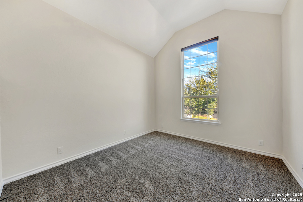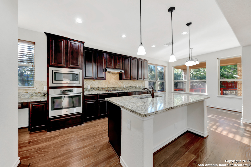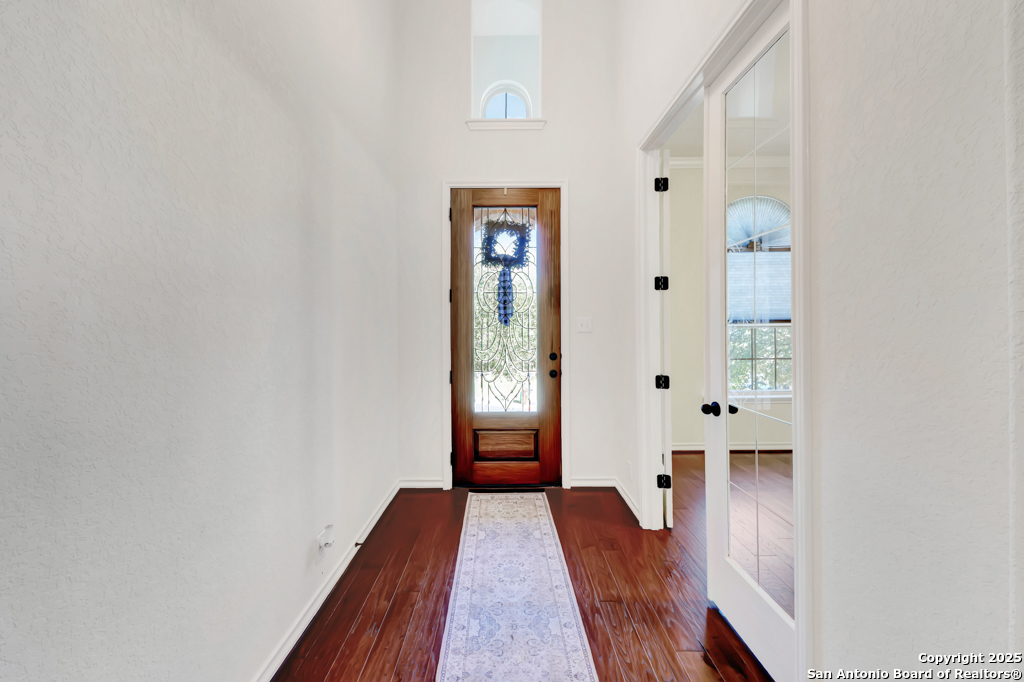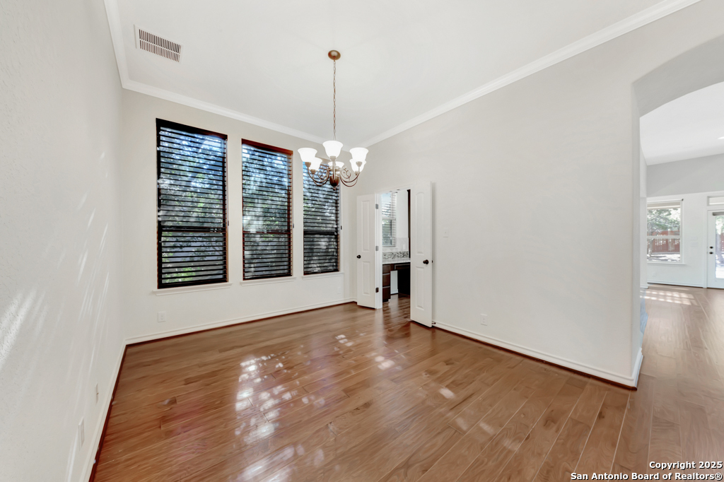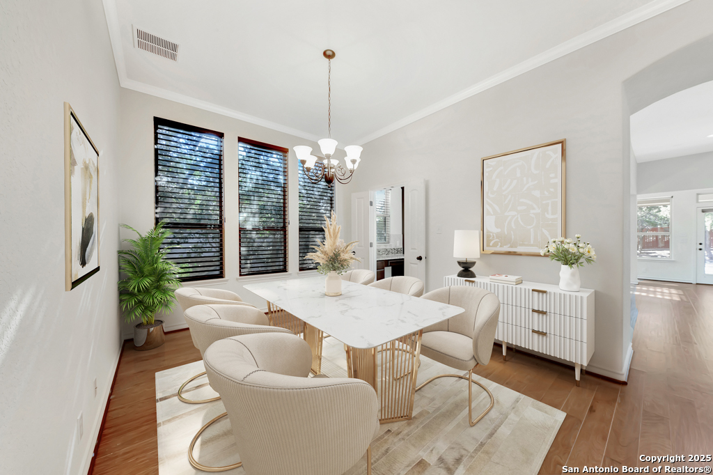 Welcome to INDIAN SPRINGS ESTATES-a park-like setting where you can enjoy serene nature without ever leaving home. This beautifully maintained single story Highland Homes property sits on an elevated homesite overlooking a lush, tree-shaded yard and is truly move-in ready. Step inside to find gorgeous easy care wood flooring throughout and abundant natural light from the many windows across the back of the home-providing stunning views you won't find elsewhere. Pretty double glass doors open to a private office, perfect for working from home or relaxing in a quiet space with a book. Entertain with ease in the formal dining room with convenient pass through access to the kitchen. Drop zone in the kitchen offers a place to check the family calendar for activities. The cozy corner stone fireplace with raised hearth adds warmth and charm to the spacious living area. The chef's kitchen features everything you need! Beautiful granite countertops, extensive cabinetry, patterned tile backsplash with glass accent stripe. Gas cooktop and stainless built-in appliances. Counter-height bar seating for entertaining and spreading the charcuterie boards or a quick meal and a short distance to the sink. Breakfast area ideal for morning coffee and serious birdwatching. This is the yard for it! The split master suite offers privacy and panoramic views of the backyard. Enjoy wood floors, dual vanities, a roomy soaking tub, big separate shower, and an oversized walk-in closet with incredible storage. Secondary bedrooms are generously sized and privately situated, each conveniently near two additional full baths. Step outside to your personal retreat: an oversized covered patio, enormous added deck, flagstone walkway with railings-all surrounded by mature trees that provide shade and privacy. The backyard is spacious and perfectly suited for a future in ground pool. Additional highlights include: Upgraded within last two years, AC unit and roof. Three-car garage, who wouldn't need that?? Natural gas, located within highly regarded Comal ISD. Located so close to 281 and Bulverde Road. The gated community offers a pool, park, and playground-an ideal place for walking your pups or enjoying time with the kids. Need access to a neighborhood elementary school? Indian Springs Elementary around the corner! READY FOR IMMEDIATE MOVE IN!!!