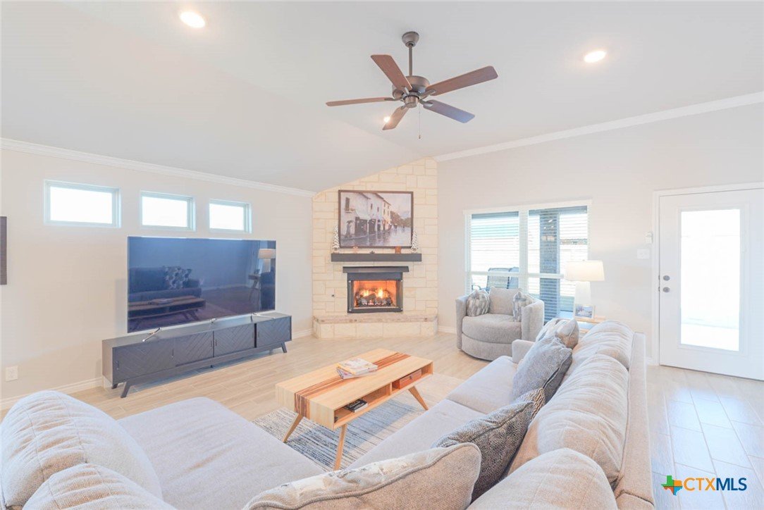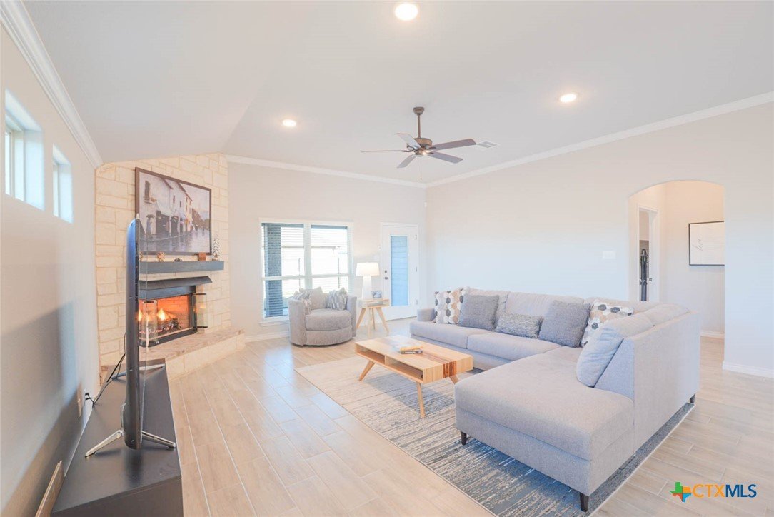 This exceptional corner-lot home features over $36,000 in upgrades and thoughtful design throughout. The spacious 3-car garage includes a separate third bay with its own indoor A/C unit and private door, offering flexibility as a home gym or a workshop. The home offers 4 bedrooms and 3 full bathrooms, including a bedroom with an en-suite bath-ideal for guests or multigenerational living. The open-concept layout is highlighted by tile flooring throughout and a stunning living room rock-wall fireplace, which can be used as gas or wood-burning. The kitchen is equipped with granite countertops, double oven, a stylish backsplash, and flows seamlessly into the living and dining areas. Additional upgrades include custom bedroom window shades, and a fully insulated garage with insulated ceilings and doors. Outdoor living is equally impressive with a 10-foot extended patio, stained cedar windbreak, full gutters, gas connection on the back patio, and a larger backyard with extended fencing on both sides. Energy and backup features include a 500-gallon propane tank, generator line, and a 24kW whole-home generator capable of powering the entire house. Call for a showing today!
