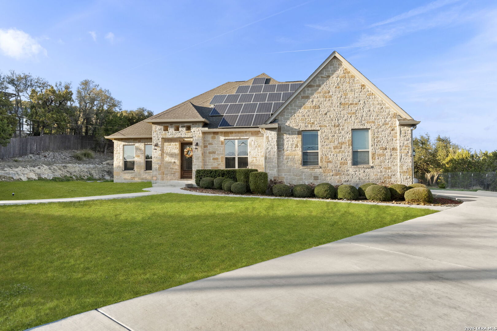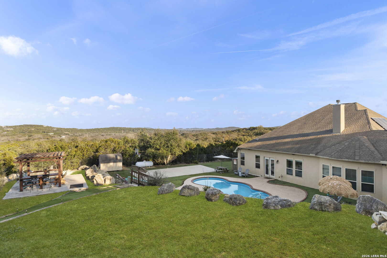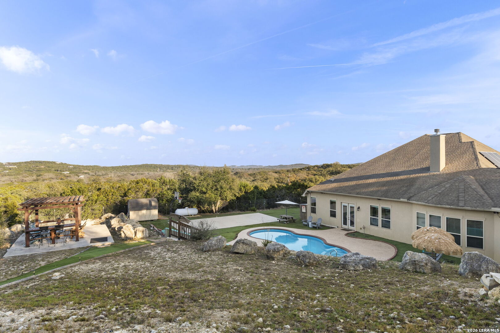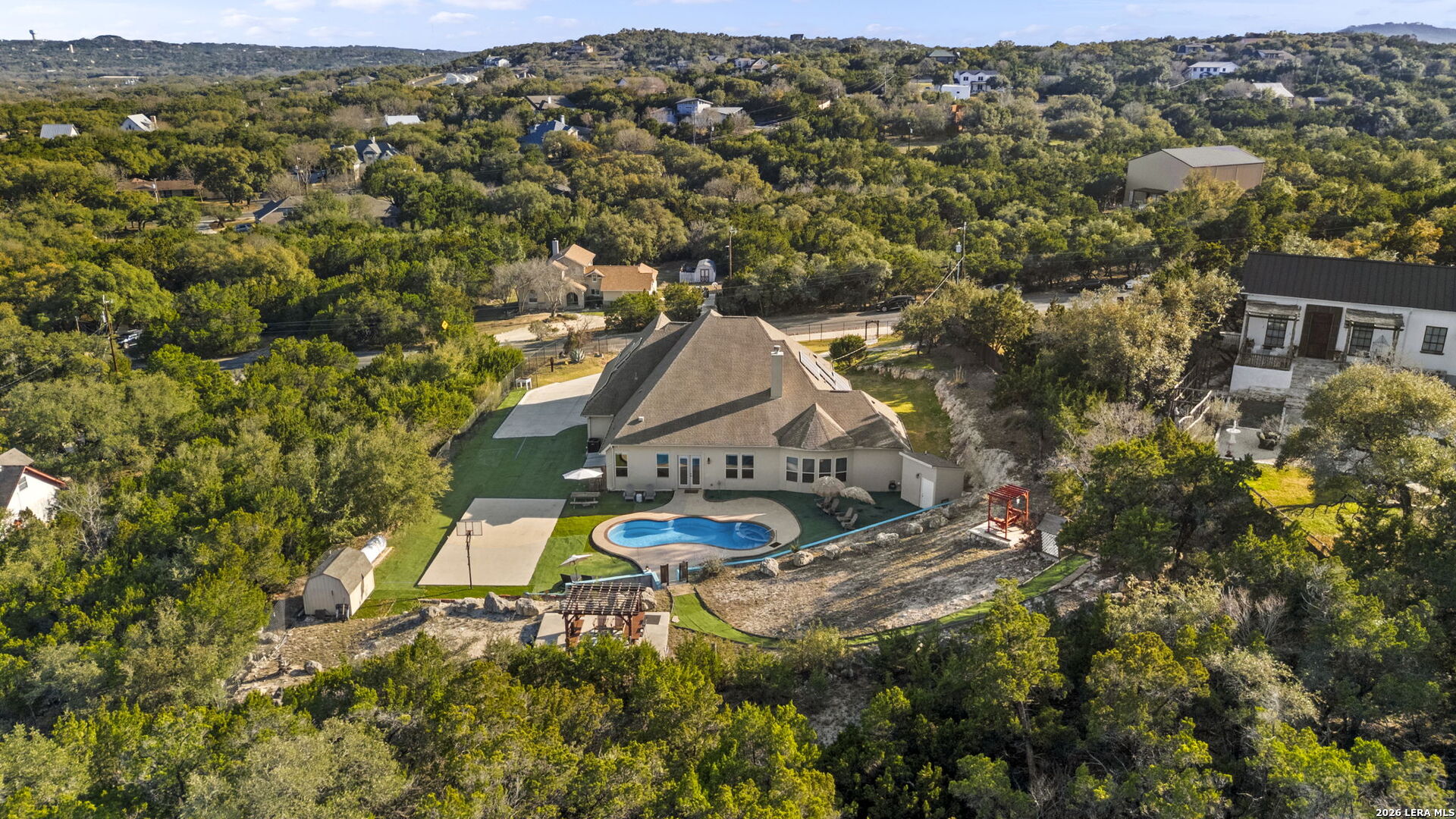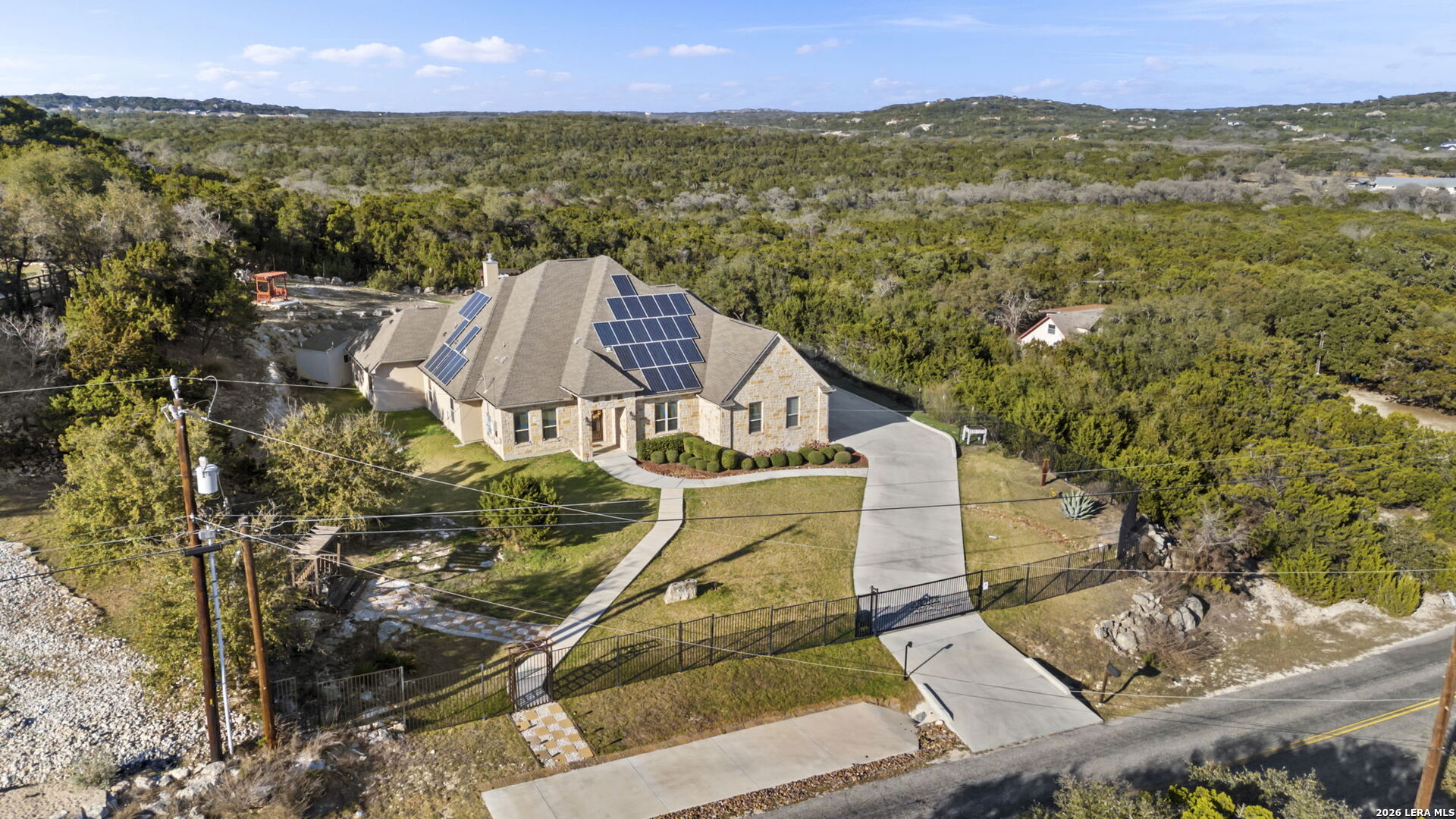 Behind private gates in the community of Scenic Hills Estates, this exceptional one-story Hill Country estate offers a rare blend of luxury and tranquility. Set on .77 acres and backing to a protected 600 acre greenbelt, the 3,789-square-foot residence delivers sweeping views, unmatched privacy, and the feeling of your own secluded retreat. Thoughtfully designed for elevated everyday living, the home features 4 bedrooms, 4.5 baths, a private study, media room, formal dining, and a versatile flex space with its own kitchen and bar. The open-concept chef's kitchen anchors the home, seamlessly connecting gathering spaces for effortless entertaining. Outdoors, a true resort lifestyle awaits - heated saltwater pool, spa, gazebo, sport court (convertible to pickleball), and a dedicated pool bath create the ultimate setting for sunset evenings and weekend celebrations. Private. Peaceful. Distinctly Hill Country luxury.