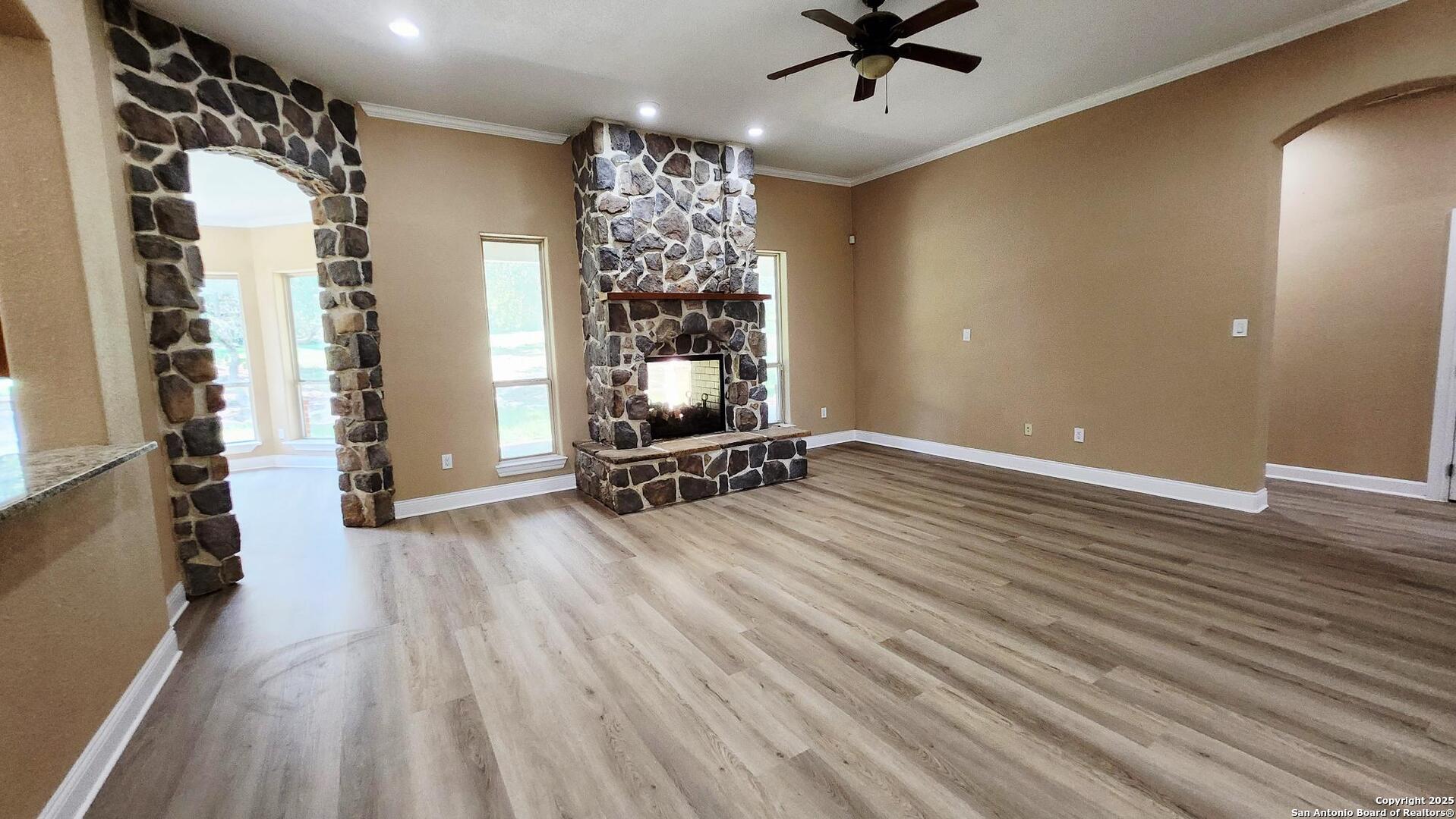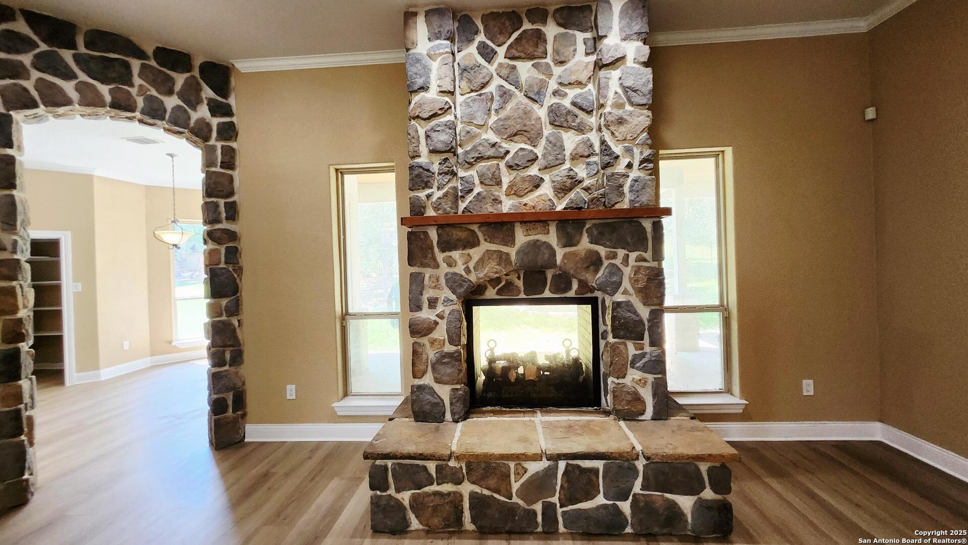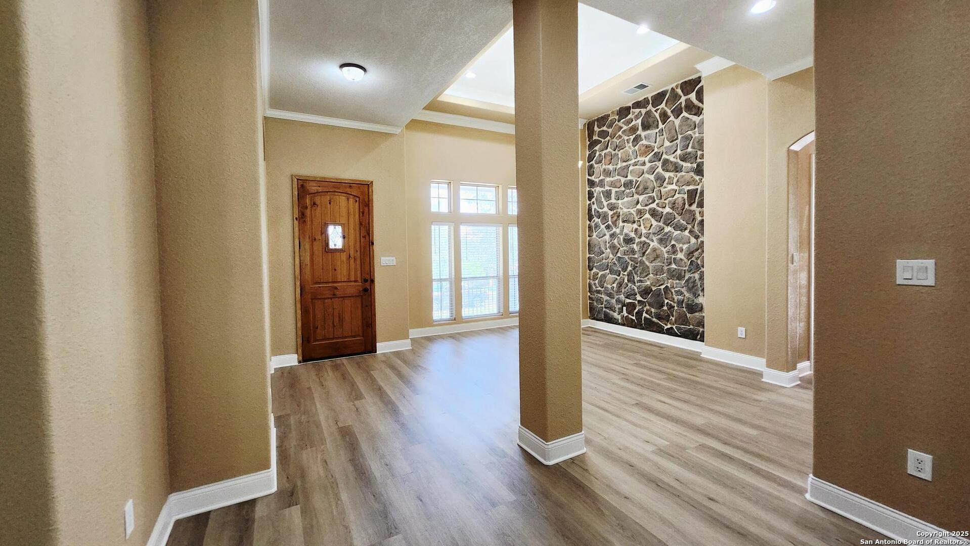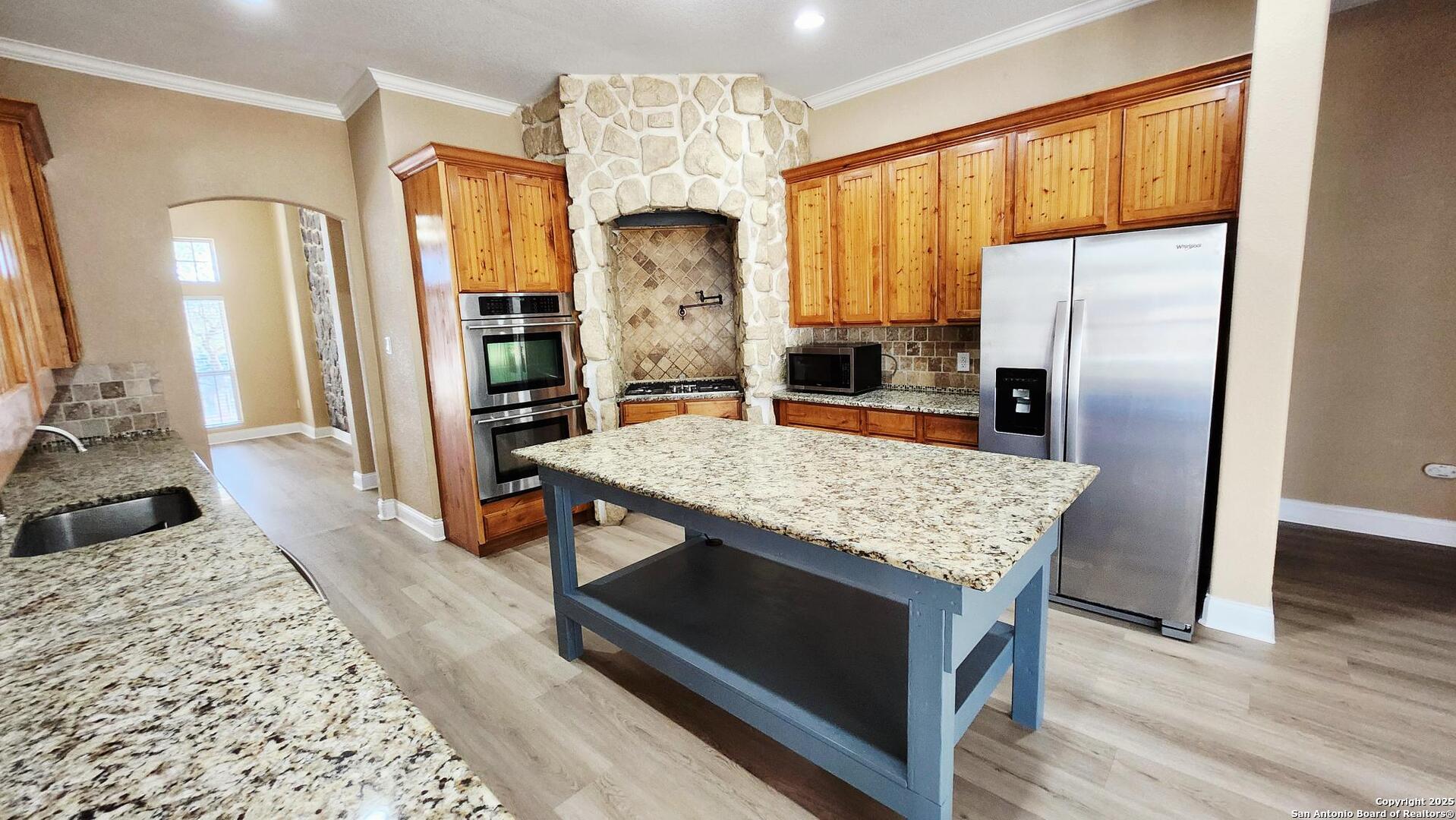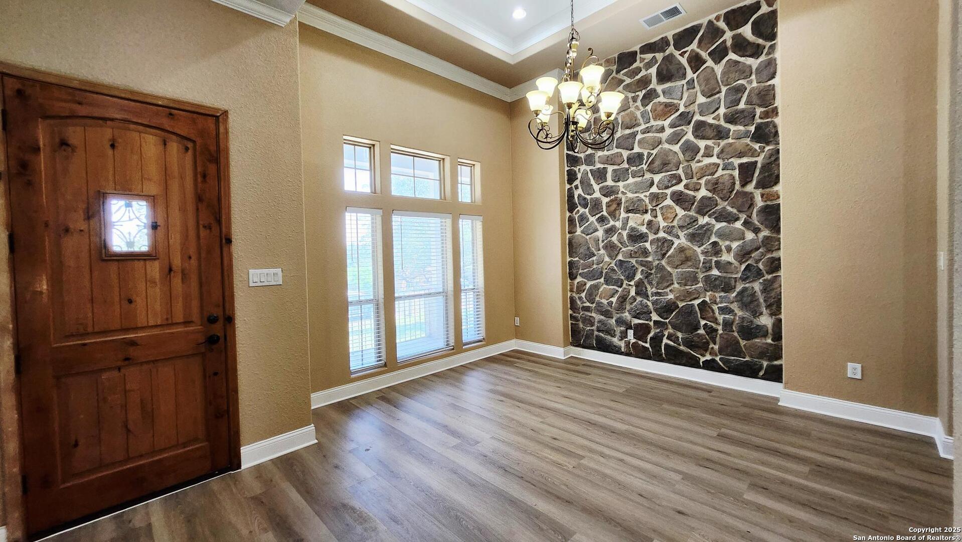 Stunning Timberwood Park Home, zoned for Piper High School, Pipler Ranch Middle School and Timberwood Elementary. Welcome to this beautiful four-bedroom, four-bath home, nestled in the picturesque Timberwood Slumber Park subdivision. This two-story gem spans 3,954 square feet and features elegant wood vinyl floors. The master bedroom is a true retreat, boasting coffered ceilings, a luxurious stone shower, dual sinks, and a spacious walk-in closet. The kitchen is designed for convenience and style, featuring granite countertops, wood cabinetry, a built-in oven and microwave, a movable island, and a water softener. The home also includes a versatile office that can serve as a fourth bedroom, complete with French glass doors for added elegance and privacy. Entertainment and comfort are seamlessly blended, with a second-floor game room or movie room that includes a full bathroom. The property also features a rock fireplace both inside and on the covered patio, along with a large backyard surrounded by mature trees, perfect for family gatherings. Additional highlights include three separate air conditioning units, two gas water heaters, and a side-entry three-car garage. The property sits on a generous 0.59-acre lot and features a welcoming front porch. The Timberwood Park neighborhood offers an abundance of amenities, including jogging trails, a playground, barbecue and picnic areas, a golf course, tennis courts, sports courts, basketball courts, a volleyball court, a dog park, and a beautiful lake.