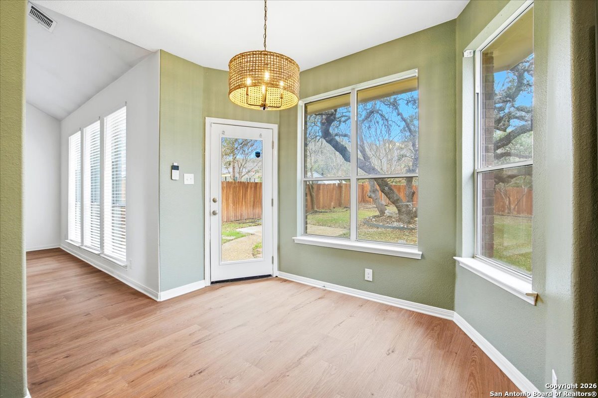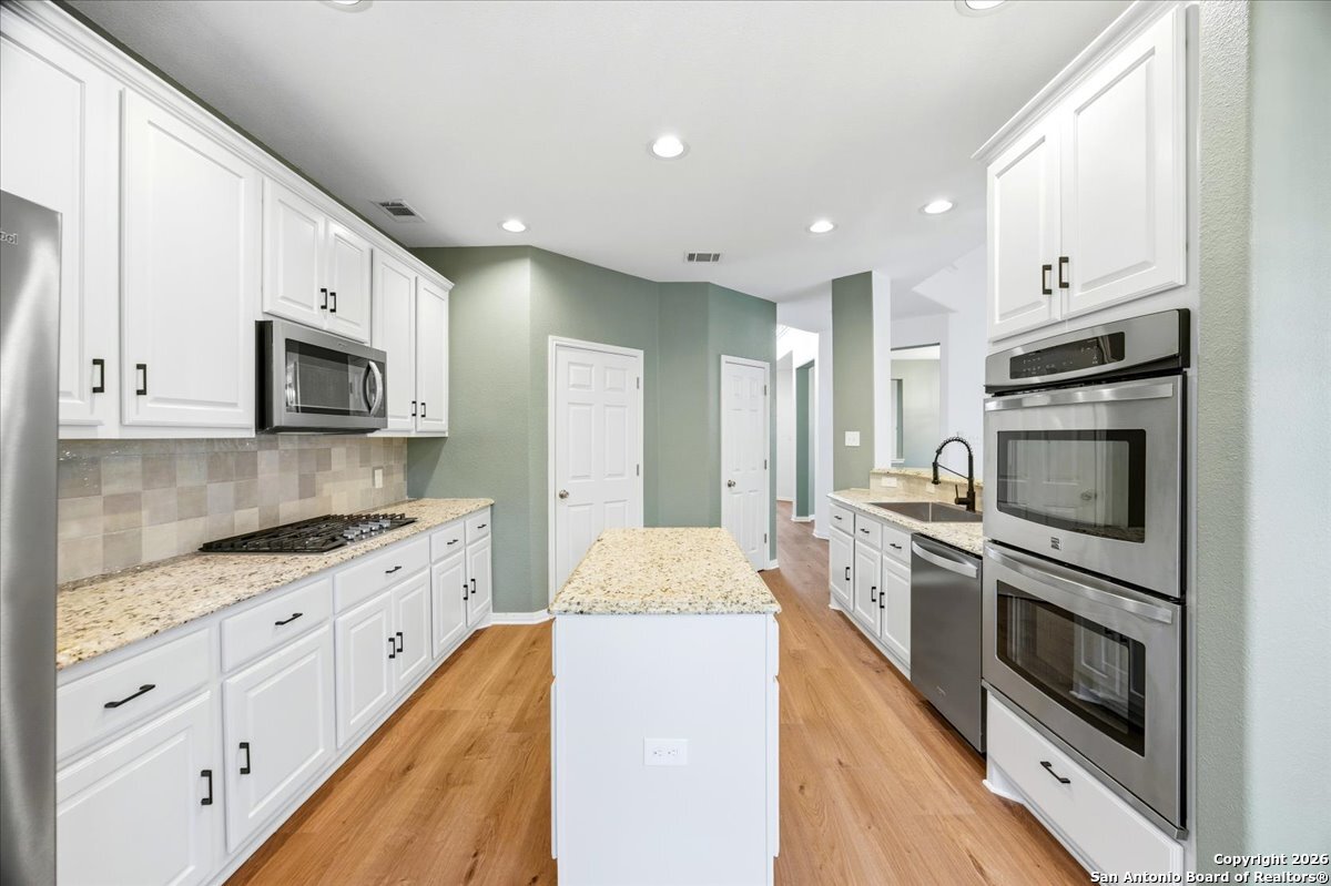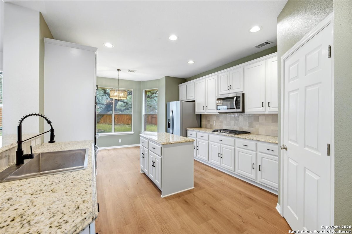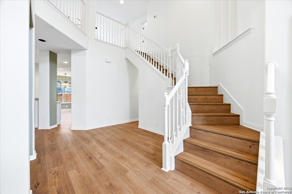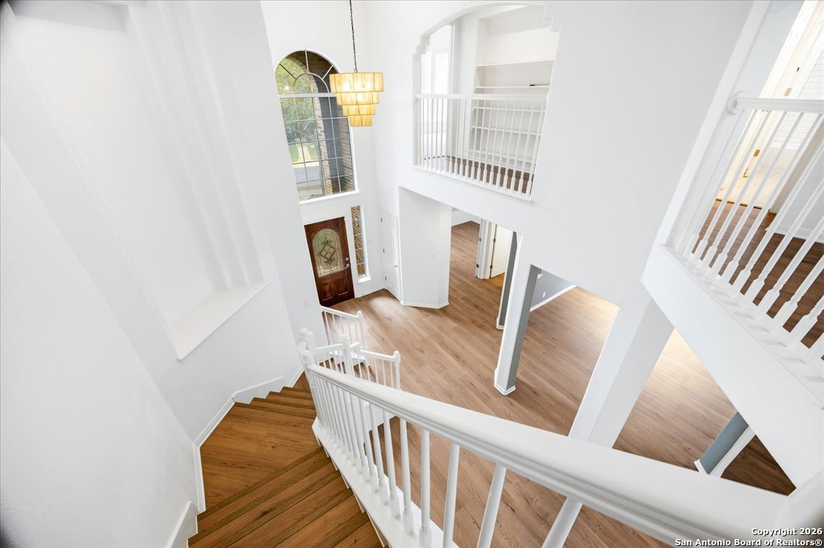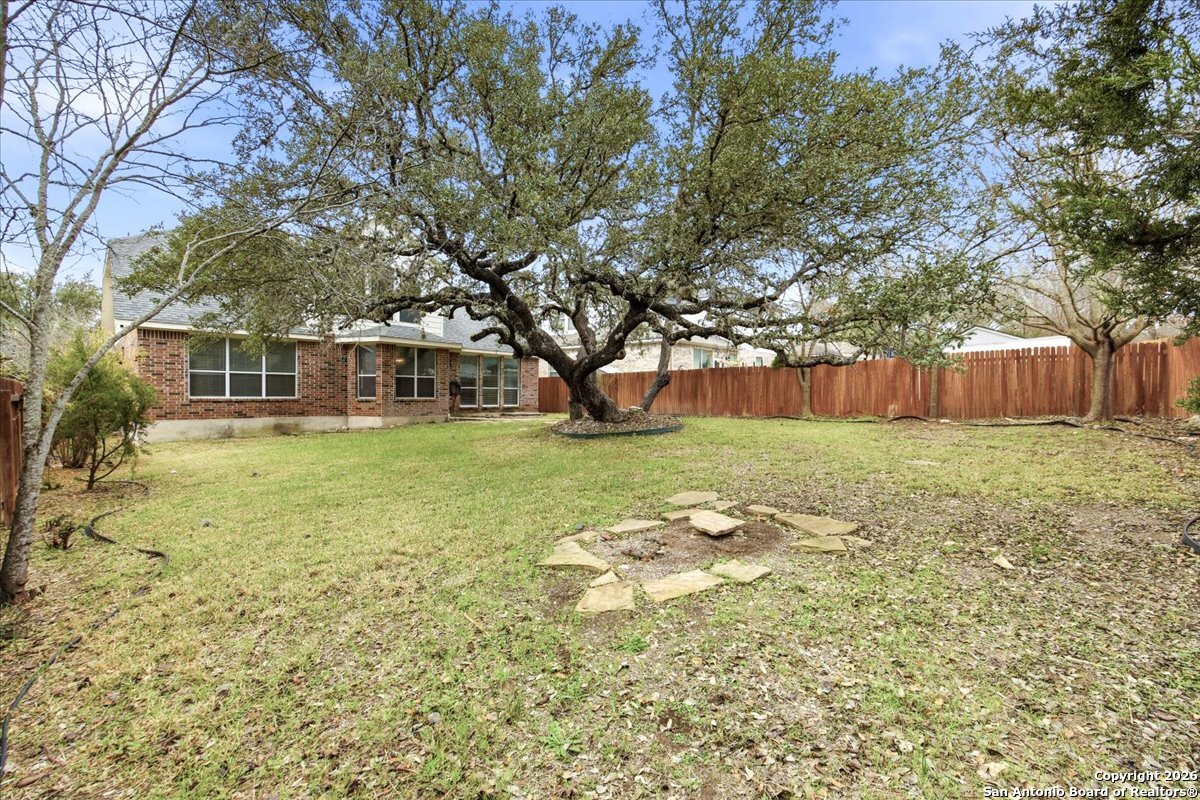Looking for space, privacy, and zero "to-do" lists? This is the one. This 5-bedroom, 4-bath beauty is fresh off a makeover and sits right against a peaceful greenbelt-so no backyard neighbors, just mature oaks and vibes. Tucked behind the prestigious guarded gates of The Heights at Stone Oak, this community offers some of the best amenities in town (pool, tennis, soccer fields-you name it!). As you step inside, your eyes are immediately drawn upward by the soaring high ceilings that create an atmosphere of grand, airy freedom. The entire home has been reborn with a meticulous renovation: fresh paint and wide-plank luxury vinyl wood flooring flow seamlessly through the main living areas, while plush, brand-new carpet provides a soft touch in the bedrooms. The heart of the home is a culinary sanctuary. Imagine preparing meals on gleaming granite countertops using your stainless steel double ovens and gas cooktop. The layout is a winner: You've got the primary suite plus a second bedroom downstairs (perfect for a WFH office). Plus, the big stuff is already handled-the roof and HVAC are both under 5 years old! Grab a drink, head out to the trees, and relax.