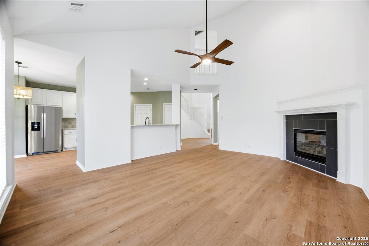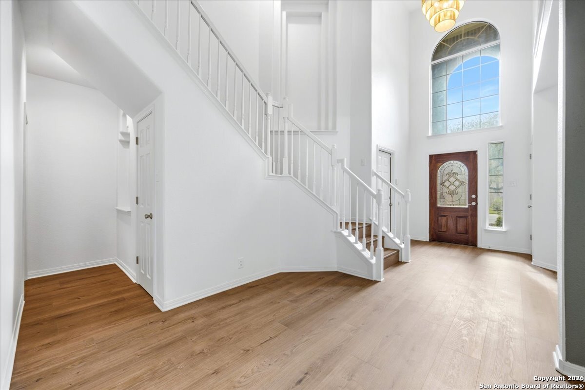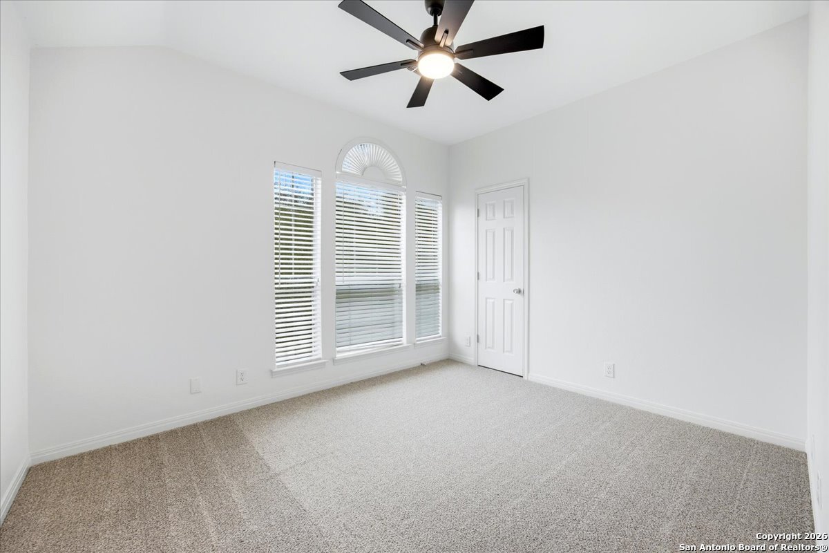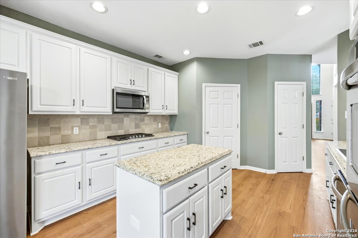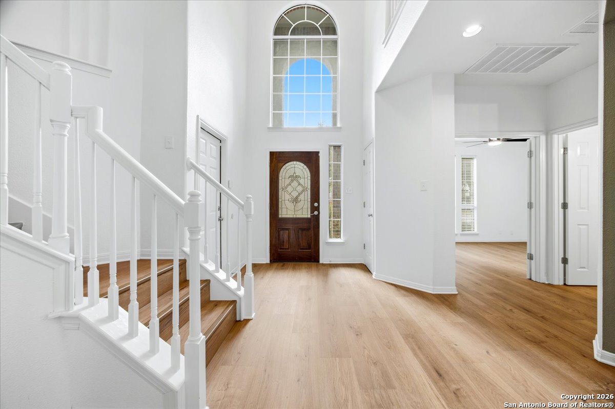 Looking for space, privacy, and zero "to-do" lists? This is the one. This 5-bedroom, 4-bath beauty is fresh off a makeover and sits right against a peaceful greenbelt-so no backyard neighbors, just mature oaks and vibes. Tucked behind the prestigious guarded gates of The Heights at Stone Oak, this community offers some of the best amenities in town (pool, tennis, soccer fields-you name it!). As you step inside, your eyes are immediately drawn upward by the soaring high ceilings that create an atmosphere of grand, airy freedom. The entire home has been reborn with a meticulous renovation: fresh paint and wide-plank luxury vinyl wood flooring flow seamlessly through the main living areas, while plush, brand-new carpet provides a soft touch in the bedrooms. The heart of the home is a culinary sanctuary. Imagine preparing meals on gleaming granite countertops using your stainless steel double ovens and gas cooktop. The layout is a winner: You've got the primary suite plus a second bedroom downstairs (perfect for a WFH office). Plus, the big stuff is already handled-the roof and HVAC are both under 5 years old! Grab a drink, head out to the trees, and relax.