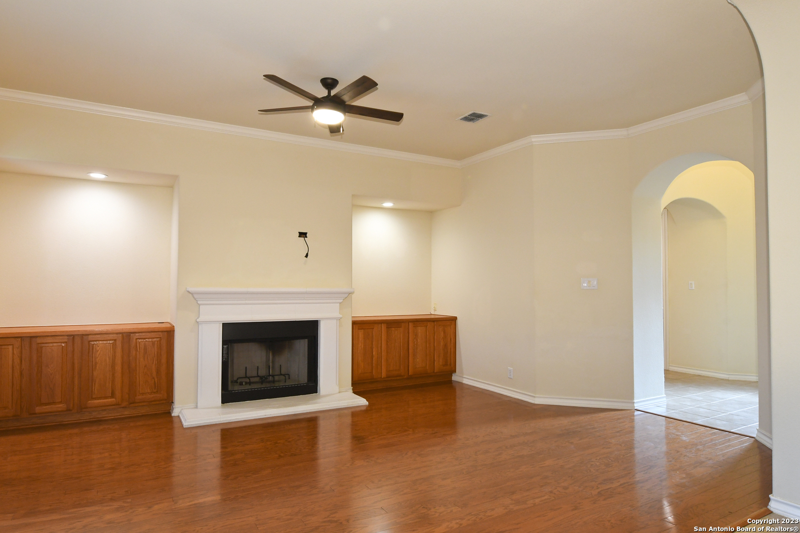 Beautiful immaculate bright one-story former model home in gated community. Split bedroom design separated by breath-taking 13- foot ceiling circular entry. The home features high ceilings, wood floors in living area and 2nd bedroom. The spacious open living area has a gas fireplace, built in cabinets, wood floors, that opens to the tiled kitchen with a breakfast bar, granite counter tops, Jenn-air cook top, refrigerator, and a microwave with plenty of Cabinets, walk in pantry, and attached breakfast area. Front yard maintained by HOA