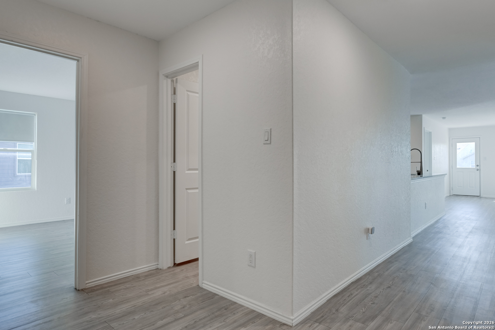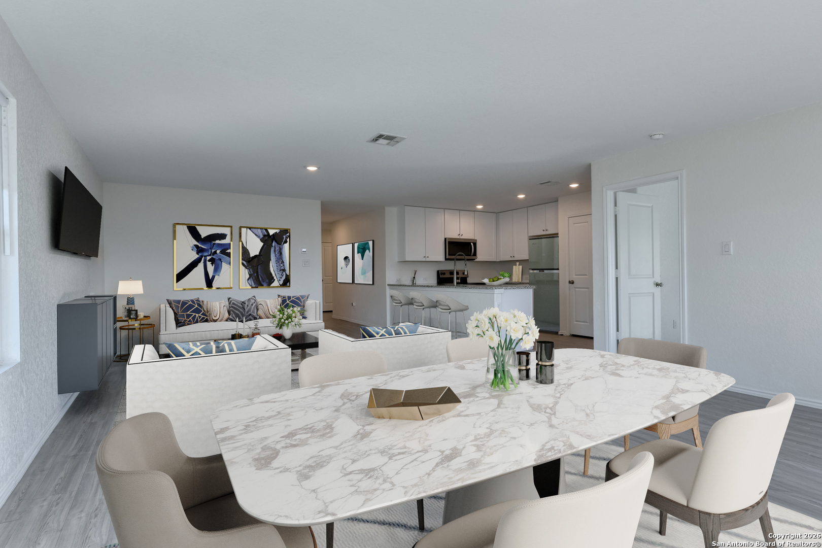 This inviting single-story home features charming curb appeal with a welcoming front porch and a spacious two-car garage with an epoxy floor. Step inside to an open floor plan where the living and dining areas flow together seamlessly, enhanced by generous natural light and smooth wood-look flooring throughout. The layout continues into a bright kitchen offering marble countertops, stainless steel appliances, white cabinetry, abundant storage, and a large peninsula that provides additional workspace and seating. The primary bedroom offers a restful retreat with its own private bath, which includes an elongated marble-topped vanity, generous cabinet storage, and access to a walk-in closet. Three secondary bedrooms and an additional full bath-also finished with a marble vanity-provide comfortable accommodations for guests, home office use, or flexible living. A convenient laundry area sits off the hallway for easy access. Out back, a wide fenced yard offers plenty of room for outdoor activities and future personalization. The neighborhood includes a walking path to enjoy the outdoors, and the home's location places you just minutes from downtown New Braunfels, offering quick access to dining, shopping, and recreation. * Please be aware that some photos have been virtually staged.