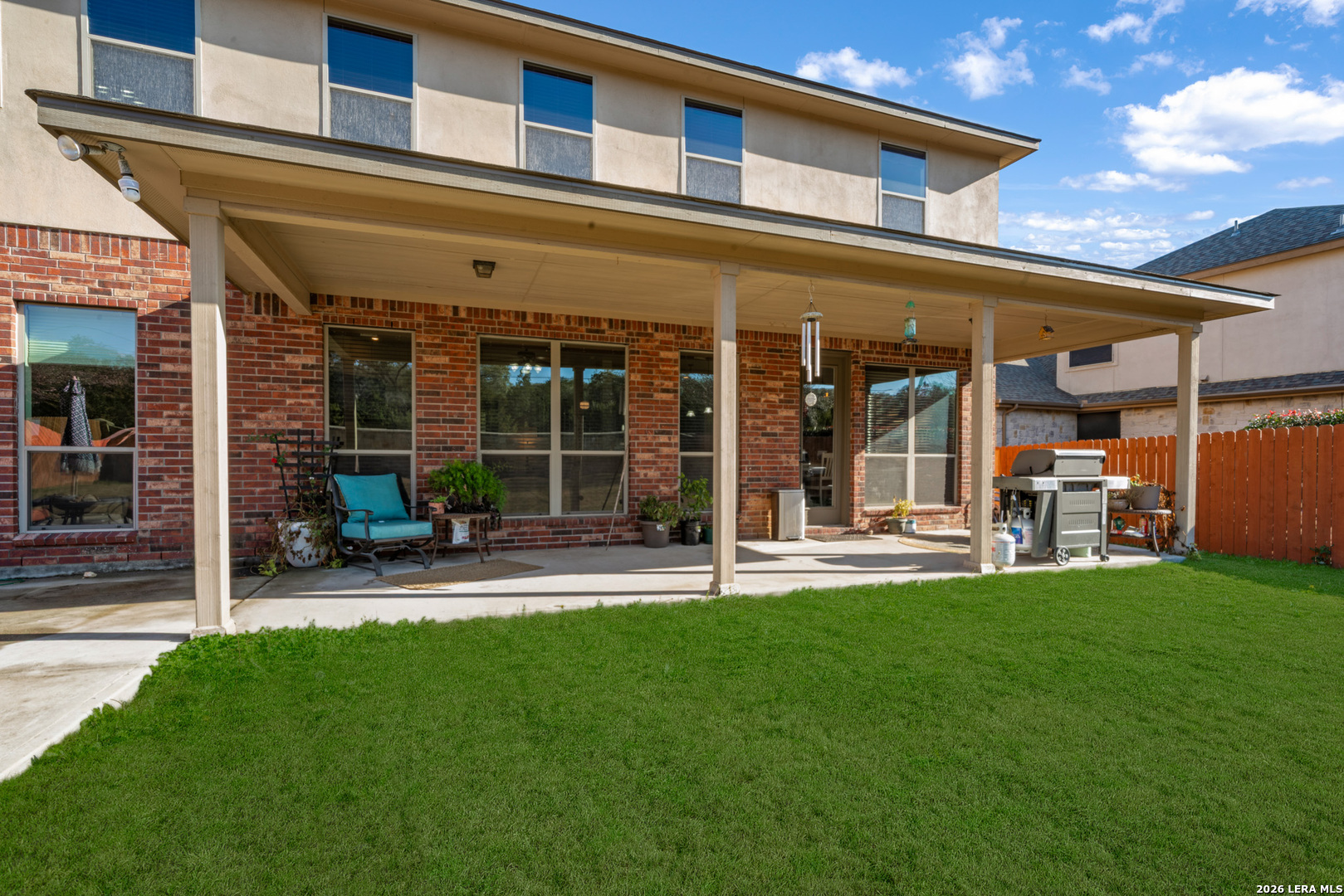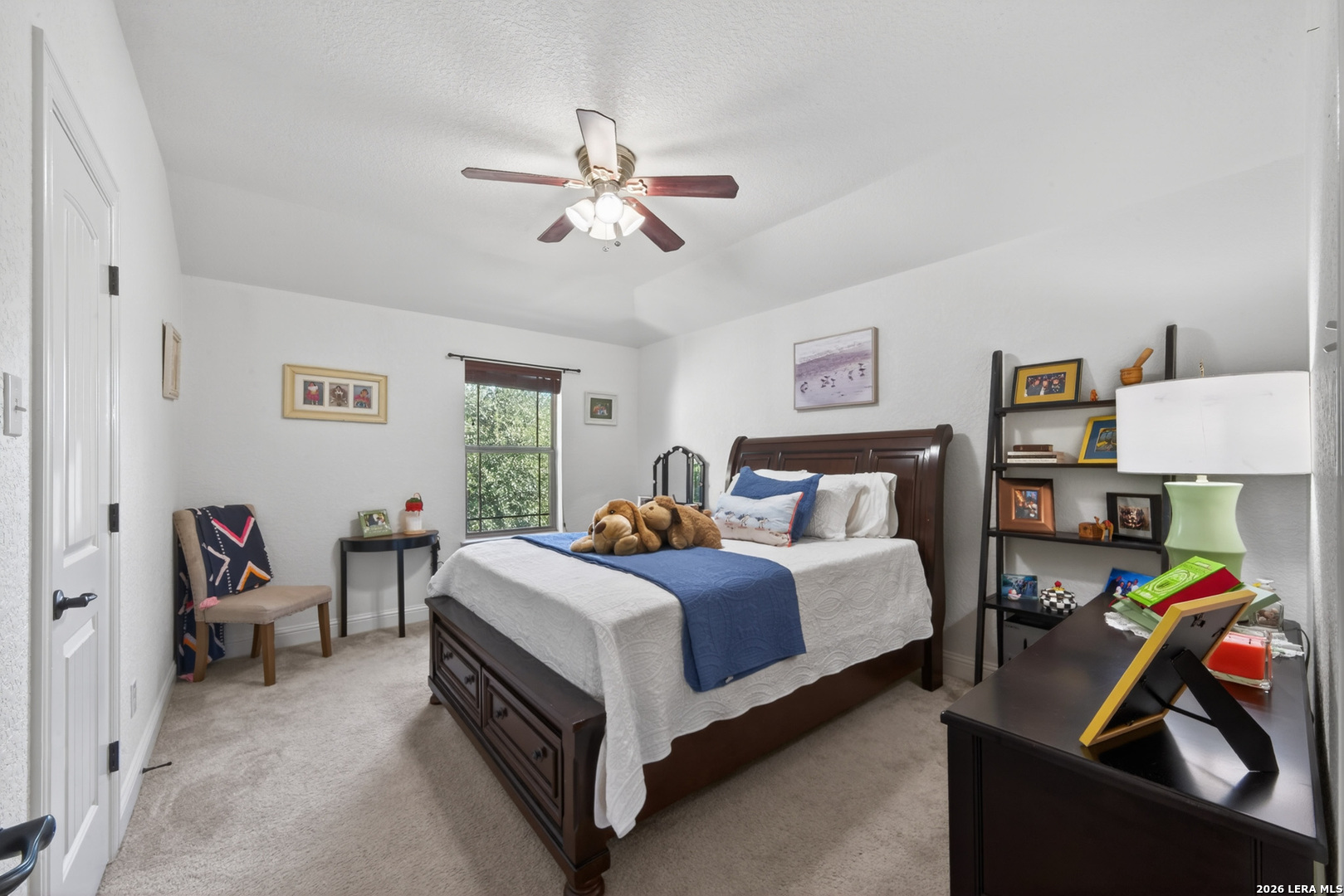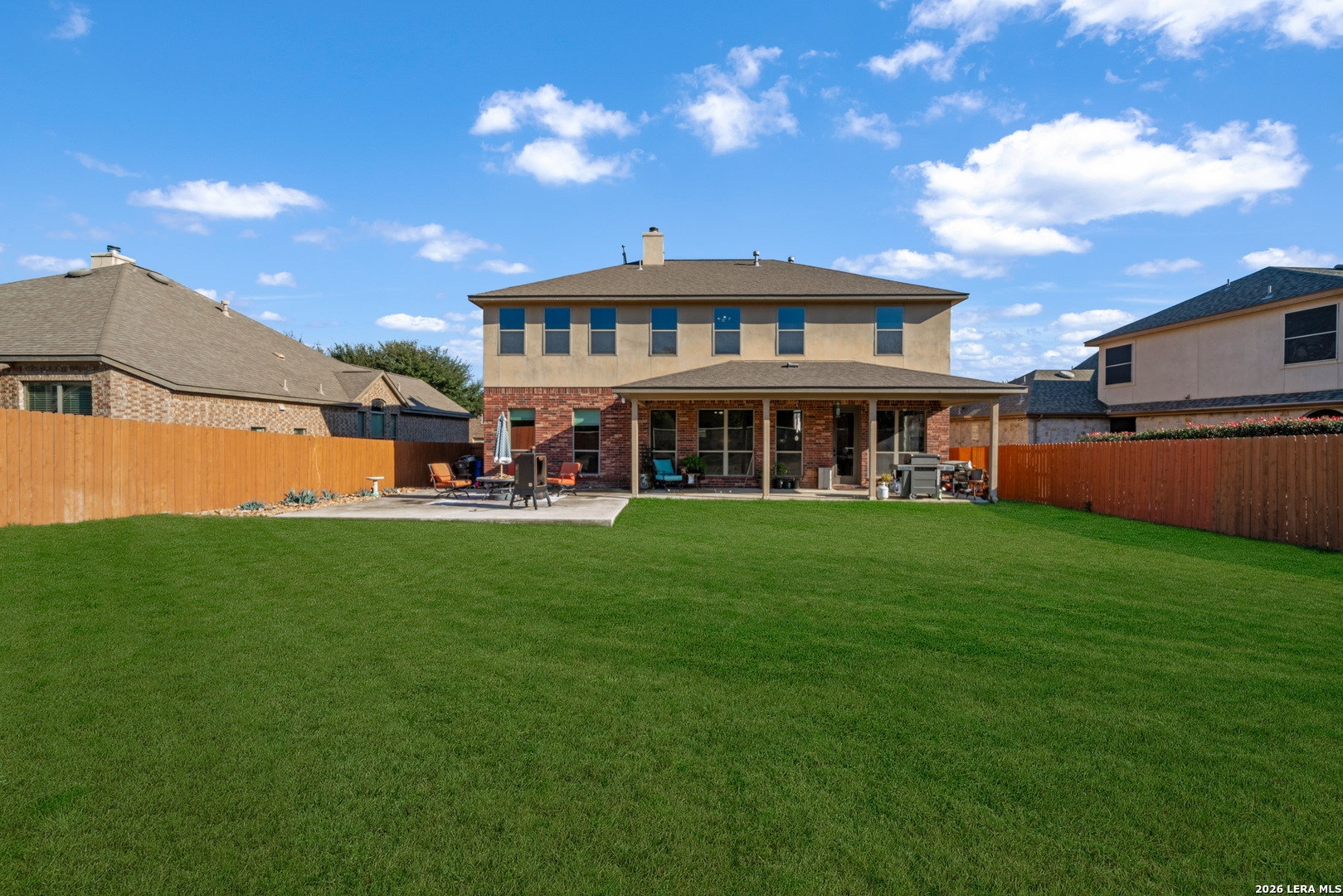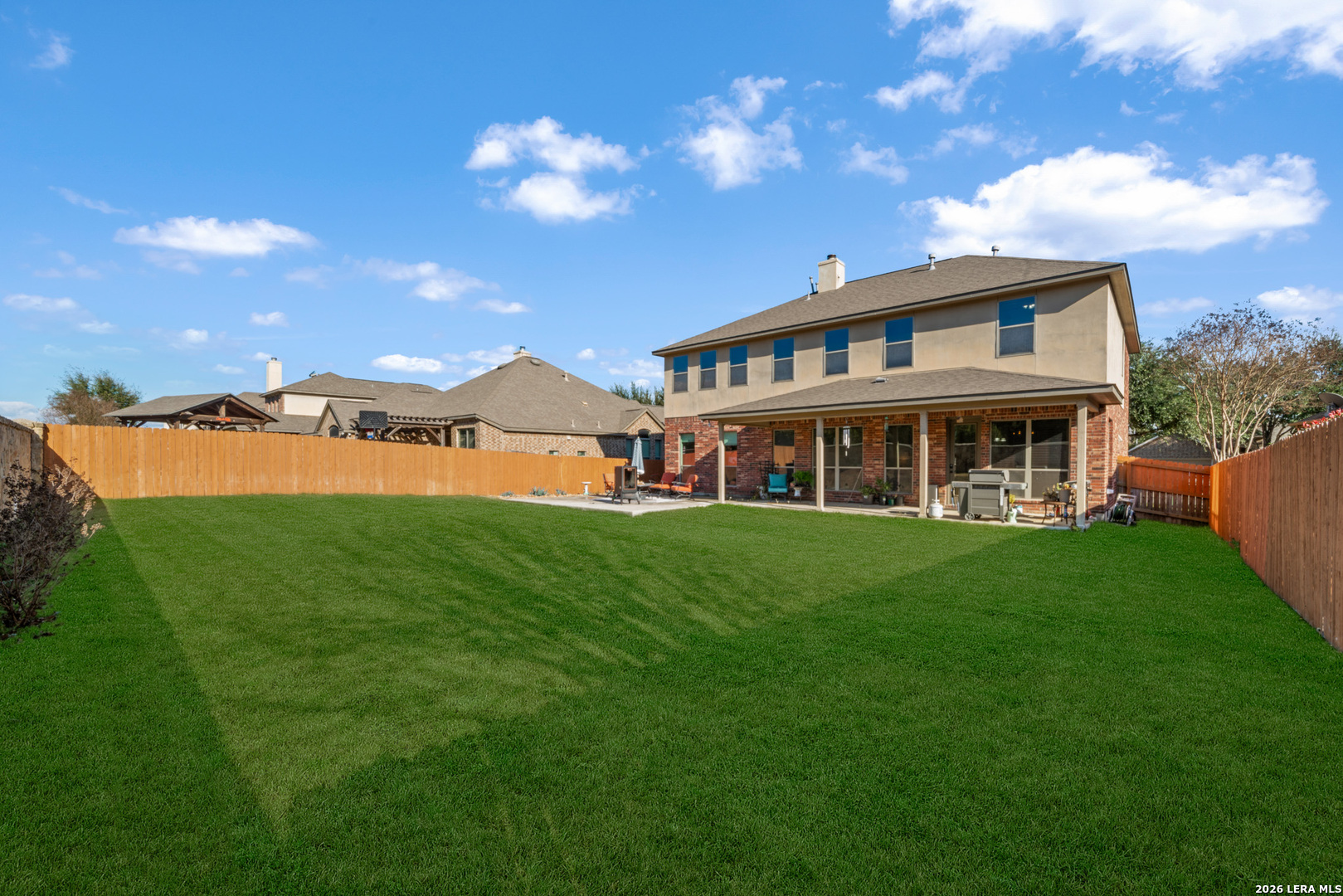 This two-story home offers strong curb appeal with mature oak trees and stone landscape beds. The main level features a large family room with a fireplace that opens to an eat-in kitchen with a breakfast bar and breakfast nook. The kitchen is equipped with stainless steel appliances, including a built-in gas cooktop, microwave, double oven, and dishwasher. A separate dining room near the entry provides additional flexibility for formal dining or everyday use. Downstairs also includes a dedicated office, a half bath, and a flexible room well suited for a playroom, exercise room, or game room. Upstairs includes the spacious primary bedroom, three additional bedrooms, and an oversized loft that functions perfectly as a game room, media area, or second living space. The primary suite features a full bathroom with a garden tub, separate shower, double vanities, and generous walk-in closets, providing a private retreat for relaxation and storage. Outside, the backyard is designed for both entertaining and privacy, featuring a large extended patio, a secure privacy fence, and a stone rear fence that borders a peaceful greenbelt. Residents of the community enjoy access to a neighborhood pool, a playground area for children, and a sports court, offering convenient options for recreation and outdoor activity.