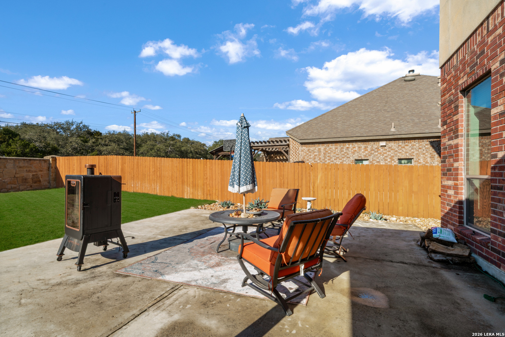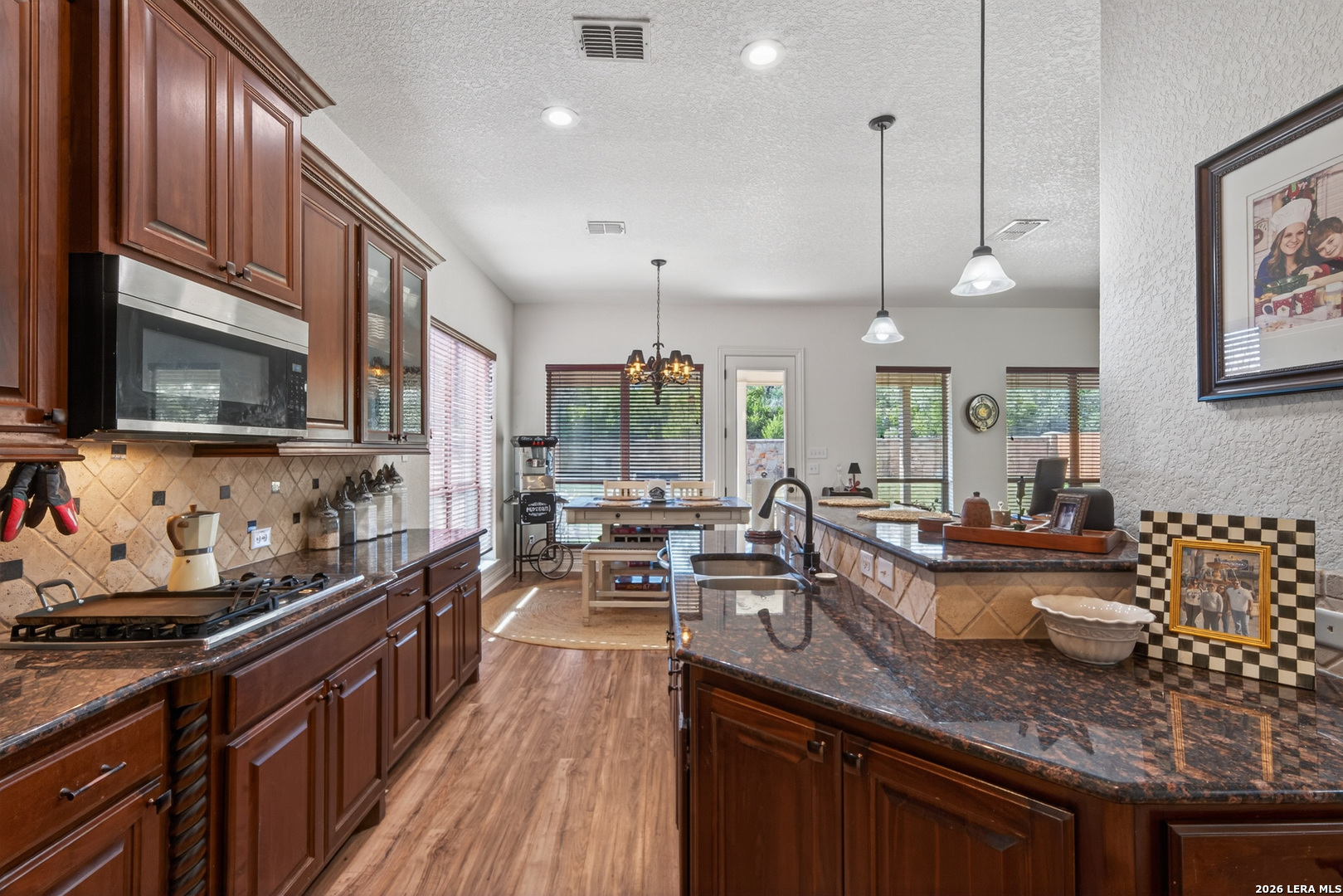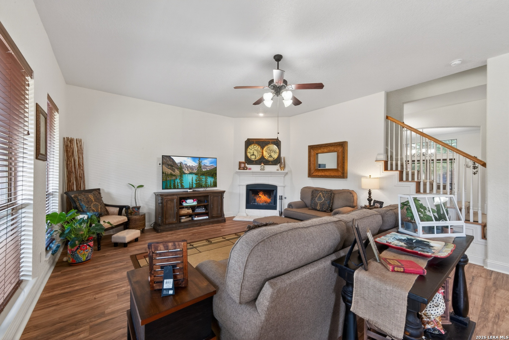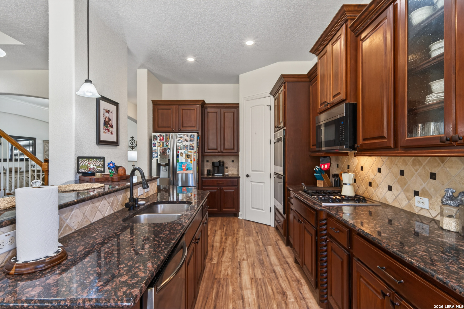 This two-story home offers strong curb appeal with mature oak trees and stone landscape beds. The main level features a large family room with a fireplace that opens to an eat-in kitchen with a breakfast bar and breakfast nook. The kitchen is equipped with stainless steel appliances, including a built-in gas cooktop, microwave, double oven, and dishwasher. A separate dining room near the entry provides additional flexibility for formal dining or everyday use. Downstairs also includes a dedicated office, a half bath, and a flexible room well suited for a playroom, exercise room, or game room. Upstairs includes the spacious primary bedroom, three additional bedrooms, and an oversized loft that functions perfectly as a game room, media area, or second living space. The primary suite features a full bathroom with a garden tub, separate shower, double vanities, and generous walk-in closets, providing a private retreat for relaxation and storage. Outside, the backyard is designed for both entertaining and privacy, featuring a large extended patio, a secure privacy fence, and a stone rear fence that borders a peaceful greenbelt. Residents of the community enjoy access to a neighborhood pool, a playground area for children, and a sports court, offering convenient options for recreation and outdoor activity.