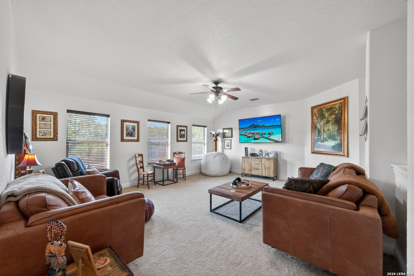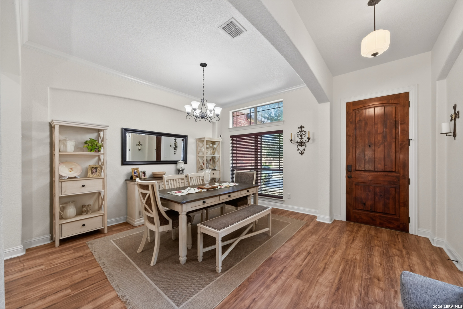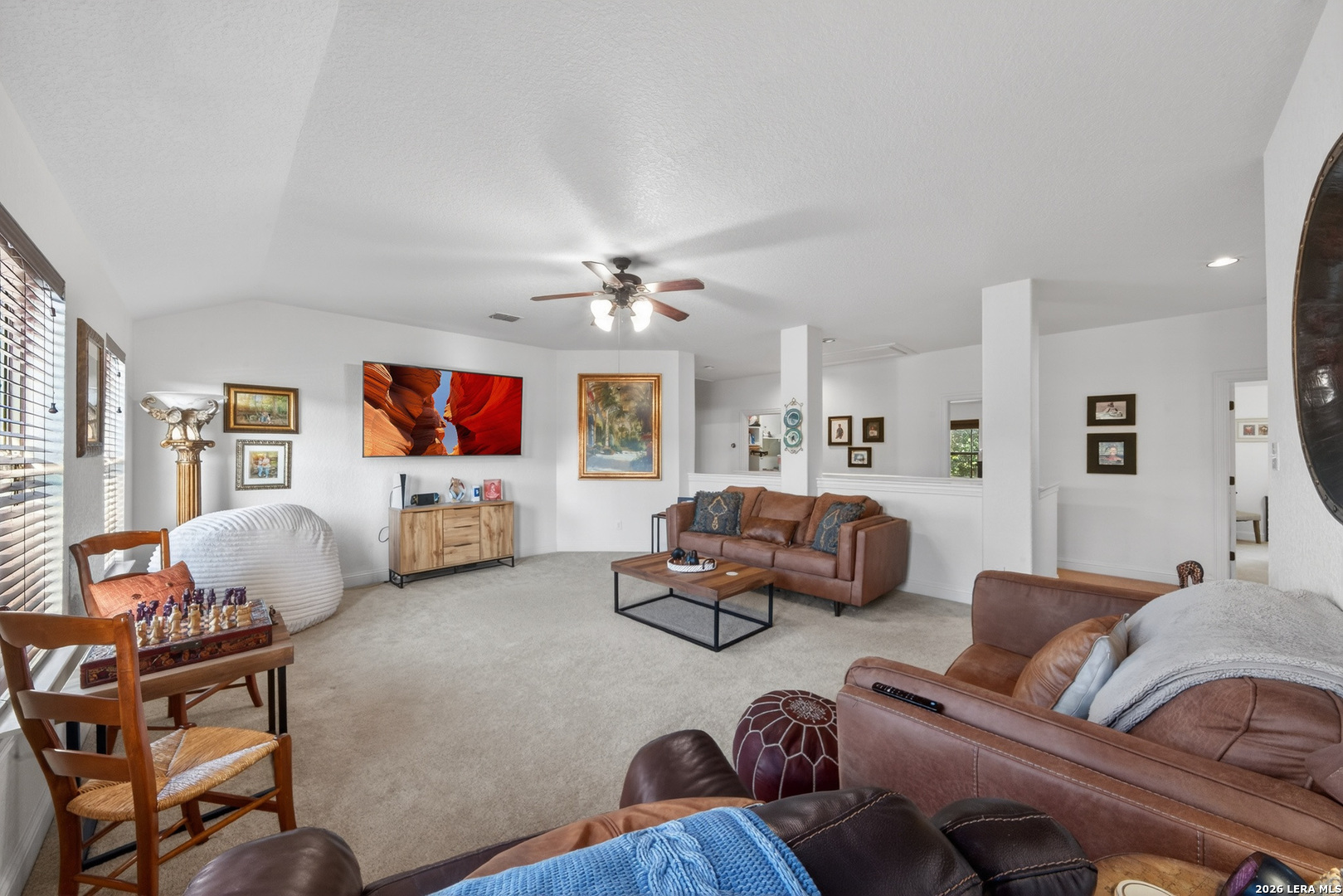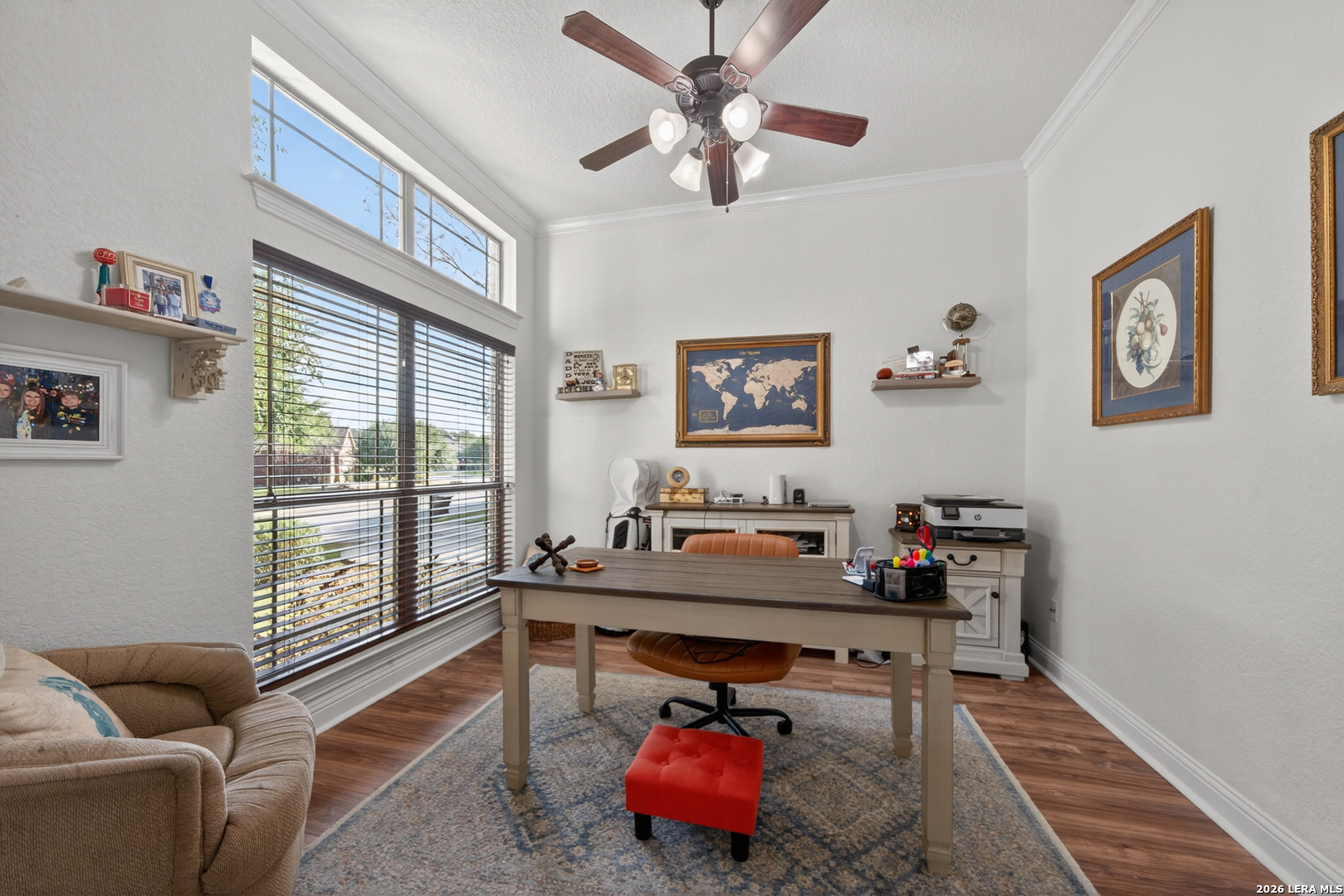 This two-story home offers strong curb appeal with mature oak trees and stone landscape beds. The main level features a large family room with a fireplace that opens to an eat-in kitchen with a breakfast bar and breakfast nook. The kitchen is equipped with stainless steel appliances, including a built-in gas cooktop, microwave, double oven, and dishwasher. A separate dining room near the entry provides additional flexibility for formal dining or everyday use. Downstairs also includes a dedicated office, a half bath, and a flexible room well suited for a playroom, exercise room, or game room. Upstairs includes the spacious primary bedroom, three additional bedrooms, and an oversized loft that functions perfectly as a game room, media area, or second living space. The primary suite features a full bathroom with a garden tub, separate shower, double vanities, and generous walk-in closets, providing a private retreat for relaxation and storage. Outside, the backyard is designed for both entertaining and privacy, featuring a large extended patio, a secure privacy fence, and a stone rear fence that borders a peaceful greenbelt. Residents of the community enjoy access to a neighborhood pool, a playground area for children, and a sports court, offering convenient options for recreation and outdoor activity.