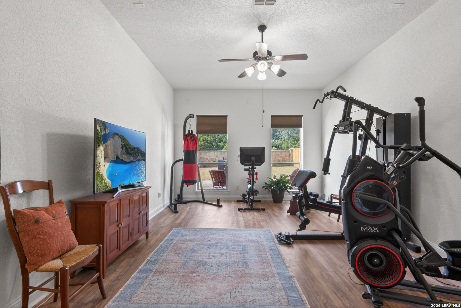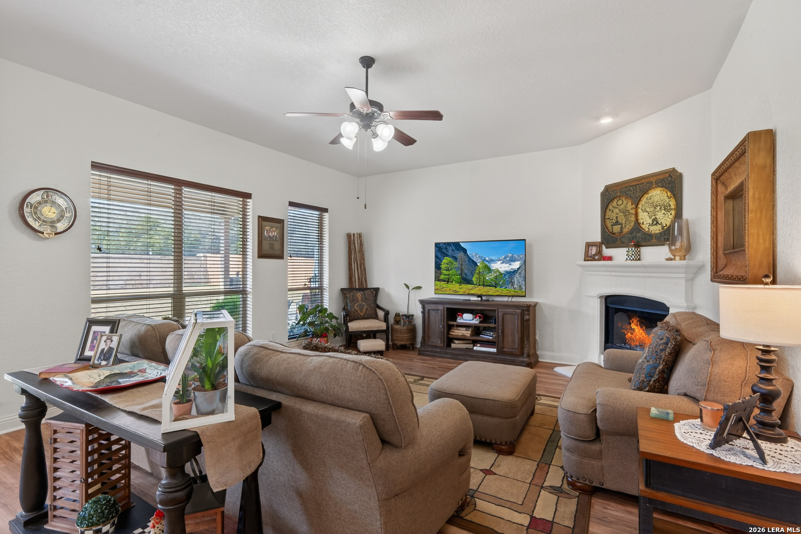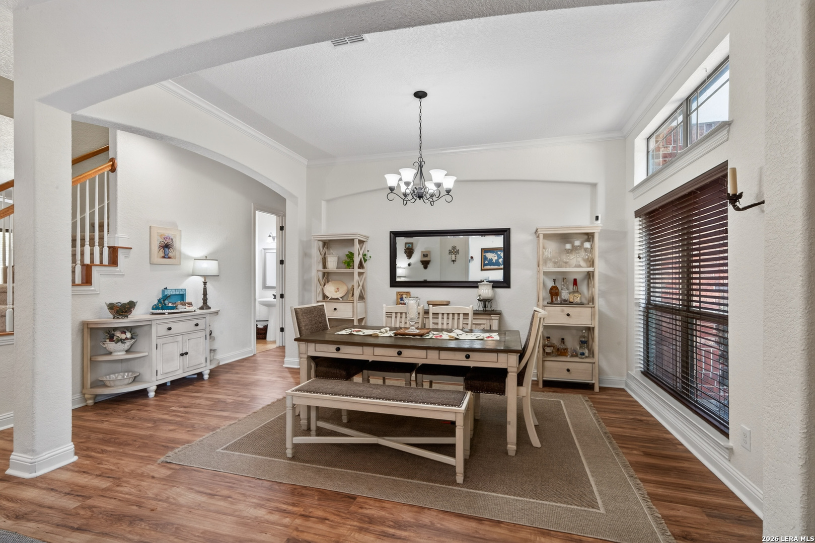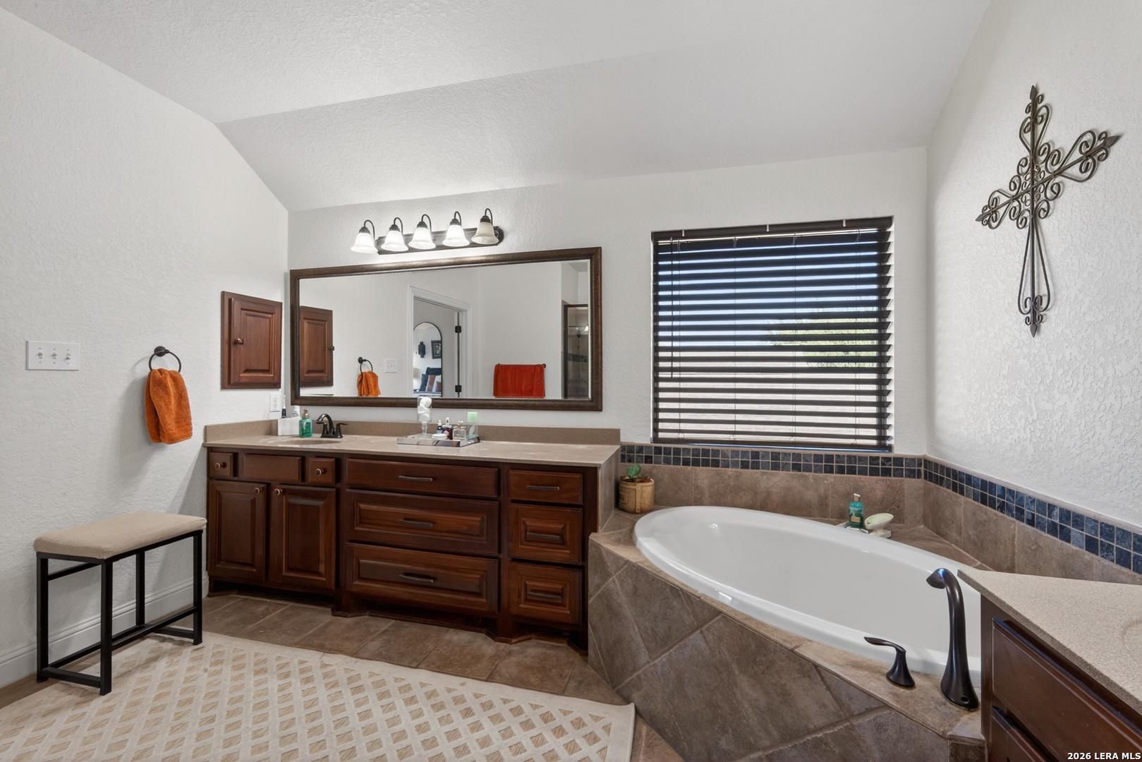 This two-story home offers strong curb appeal with mature oak trees and stone landscape beds. The main level features a large family room with a fireplace that opens to an eat-in kitchen with a breakfast bar and breakfast nook. The kitchen is equipped with stainless steel appliances, including a built-in gas cooktop, microwave, double oven, and dishwasher. A separate dining room near the entry provides additional flexibility for formal dining or everyday use. Downstairs also includes a dedicated office, a half bath, and a flexible room well suited for a playroom, exercise room, or game room. Upstairs includes the spacious primary bedroom, three additional bedrooms, and an oversized loft that functions perfectly as a game room, media area, or second living space. The primary suite features a full bathroom with a garden tub, separate shower, double vanities, and generous walk-in closets, providing a private retreat for relaxation and storage. Outside, the backyard is designed for both entertaining and privacy, featuring a large extended patio, a secure privacy fence, and a stone rear fence that borders a peaceful greenbelt. Residents of the community enjoy access to a neighborhood pool, a playground area for children, and a sports court, offering convenient options for recreation and outdoor activity.