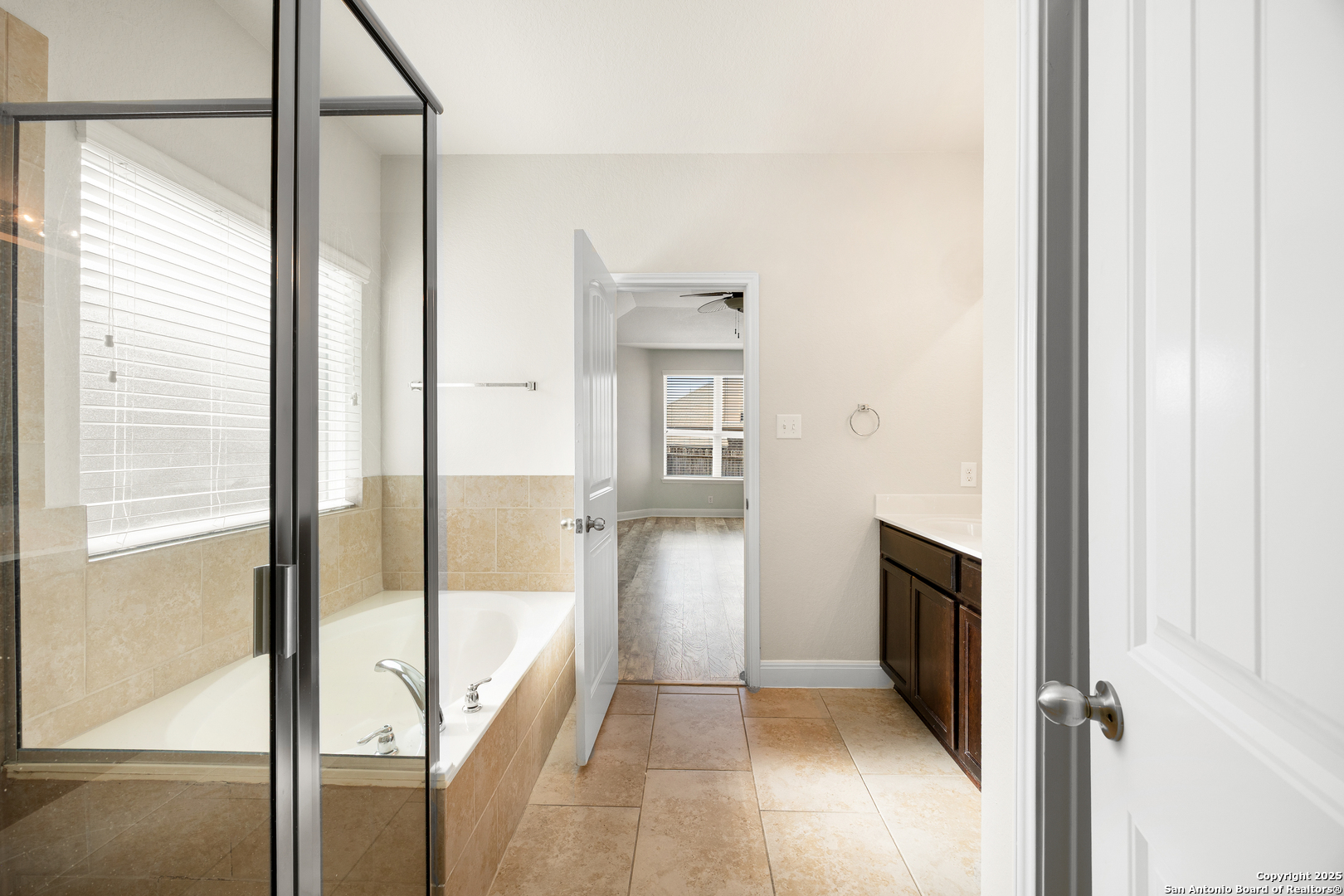 Beautiful two-story home located in the community of Turning Stone, offering a spacious and move-in ready layout with 4 bedrooms and 3.5 baths. The light and bright open floor plan features neutral tones throughout, creating a comfortable and welcoming feel. The living room offers easy access to the backyard and flows smoothly into the kitchen and dining areas, making everyday living and gatherings simple and functional. The kitchen features a spacious center island, stainless steel appliances, a breakfast bar, pantry, and a combination of pendant and recessed lighting. This space provides plenty of room for meal prep, casual dining, and entertaining. The first-floor primary suite offers a private retreat with a walk-in closet and a well-appointed bathroom that includes double sinks along with a separate tub and shower. All secondary bedrooms are located upstairs, providing added privacy and flexibility for guests or additional living space. Outside, the fenced backyard includes a covered porch and lawn area, ideal for relaxing or enjoying outdoor activities. Conveniently located near an elementary school, parks, and community amenities, with easy access to shopping, I-35, and Randolph AFB. Schedule your personal tour today!
