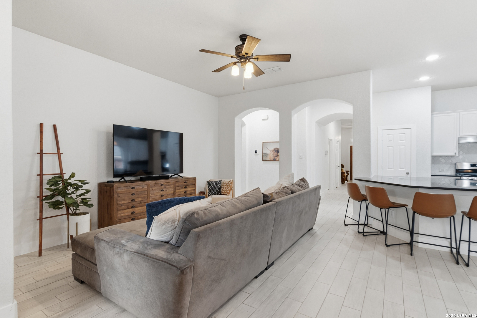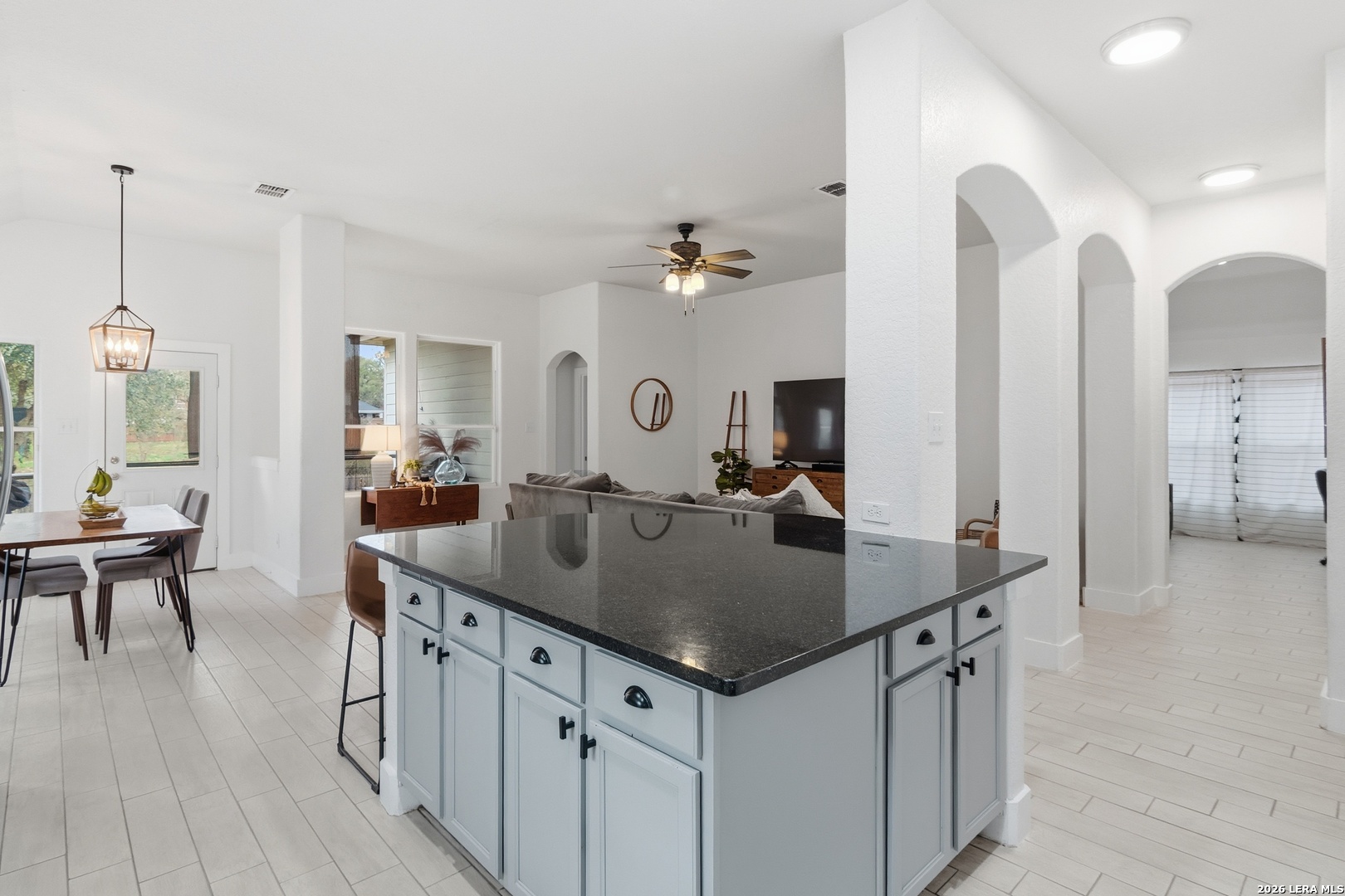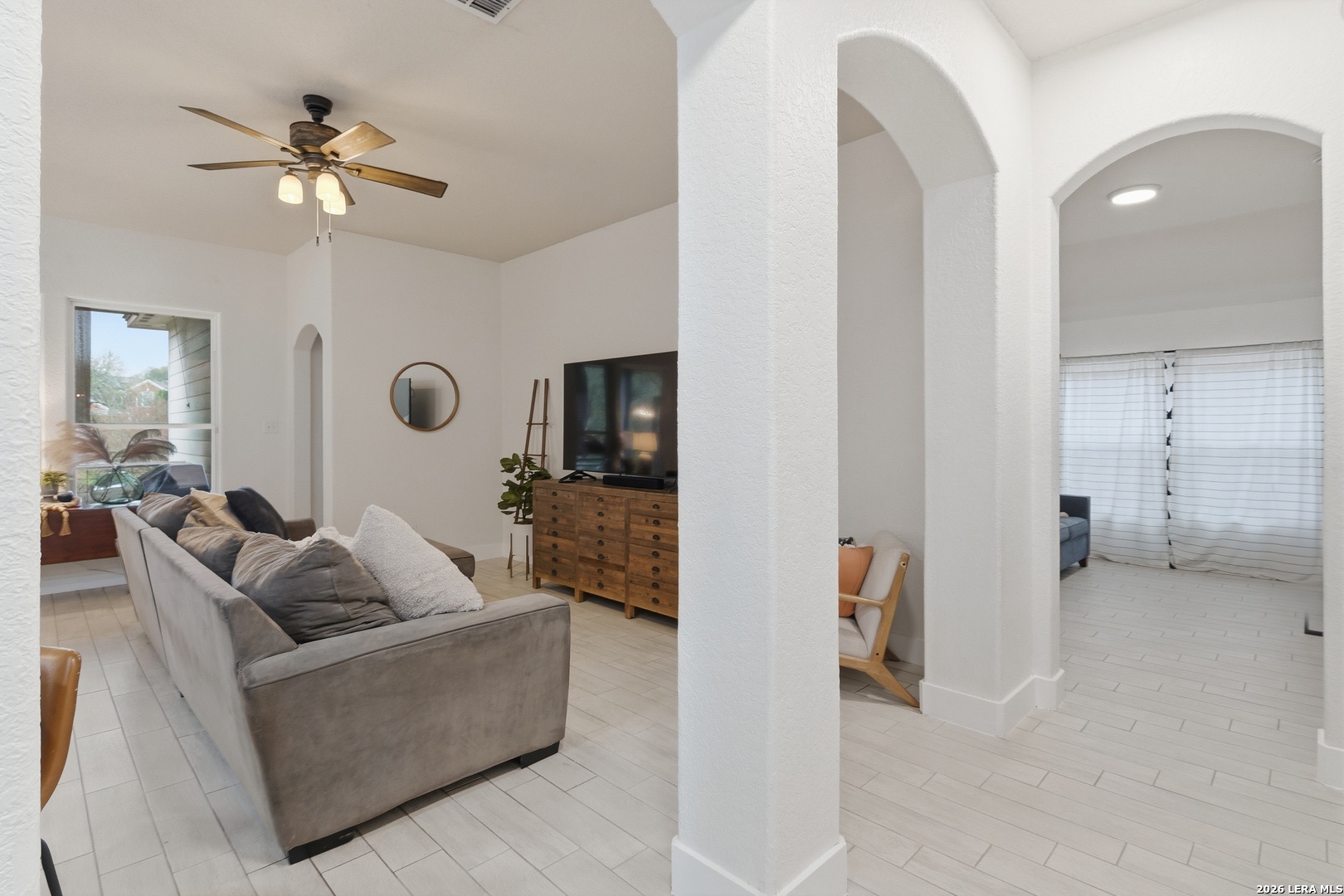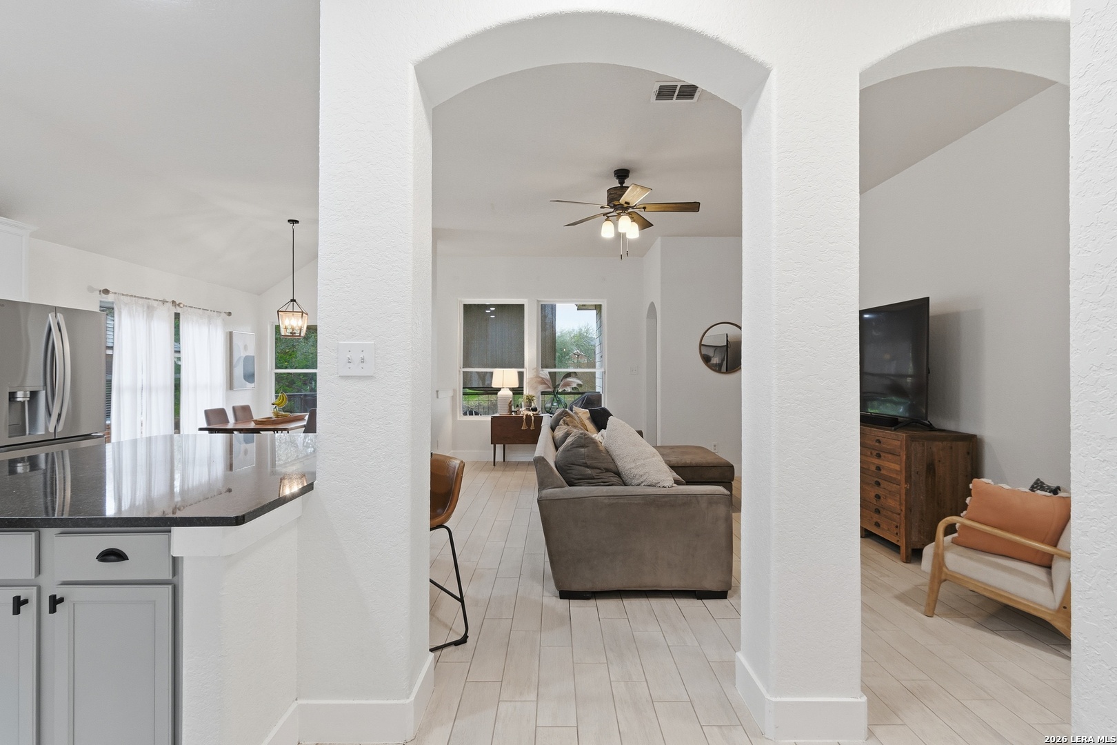 Welcome to this charming one-story home that sits on a greenbelt and offers an open floor plan with 3 bedrooms and 2 bathrooms. The kitchen features gas cooking, abundant cabinet and countertop space, a breakfast bar as well as a breakfast nook. The primary bathroom has recently been upgraded with a large walk-in shower. A dedicated office/study provides flexibility for remote work and/or hobbies. A bonus room also allows for additional office space or a cozy sitting area. Key updates include a roof (2024) and HVAC system (2024). Nestled in the quiet and established gated community of Trinity Oaks with amenities to include a pool, clubhouse and park/playground. This property offers easy access to 281, 1604, shopping, restaurants and so much more. Located within the desirable Comal ISD. Schedule your private showing today!