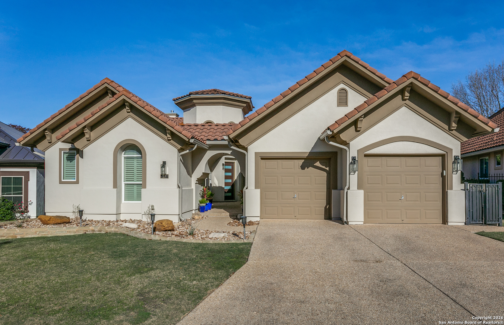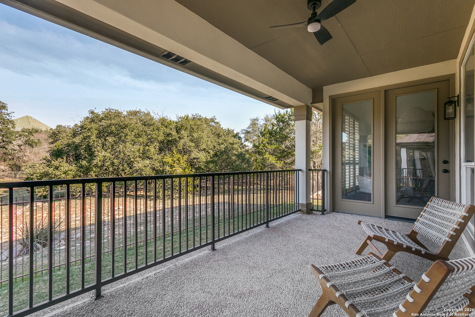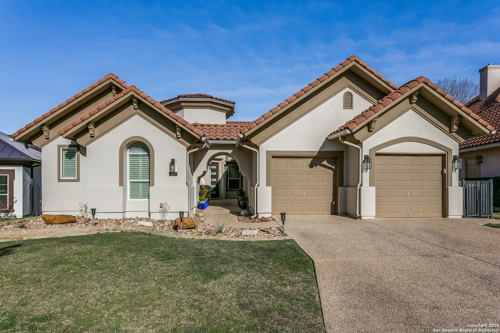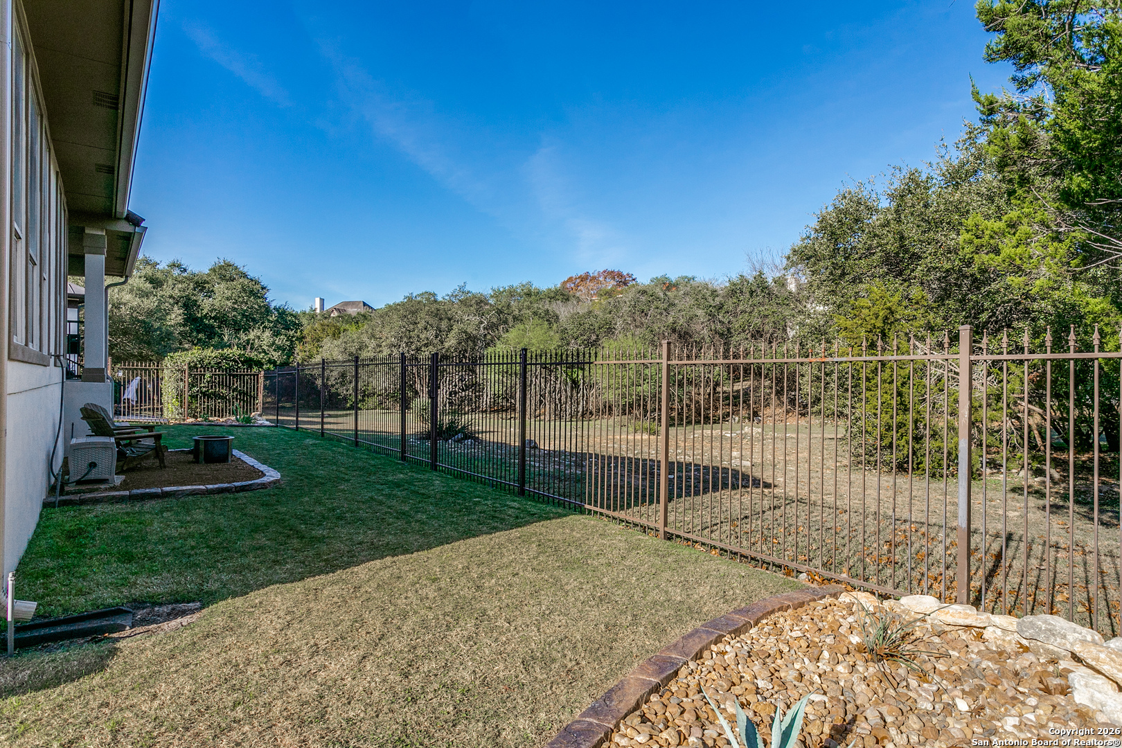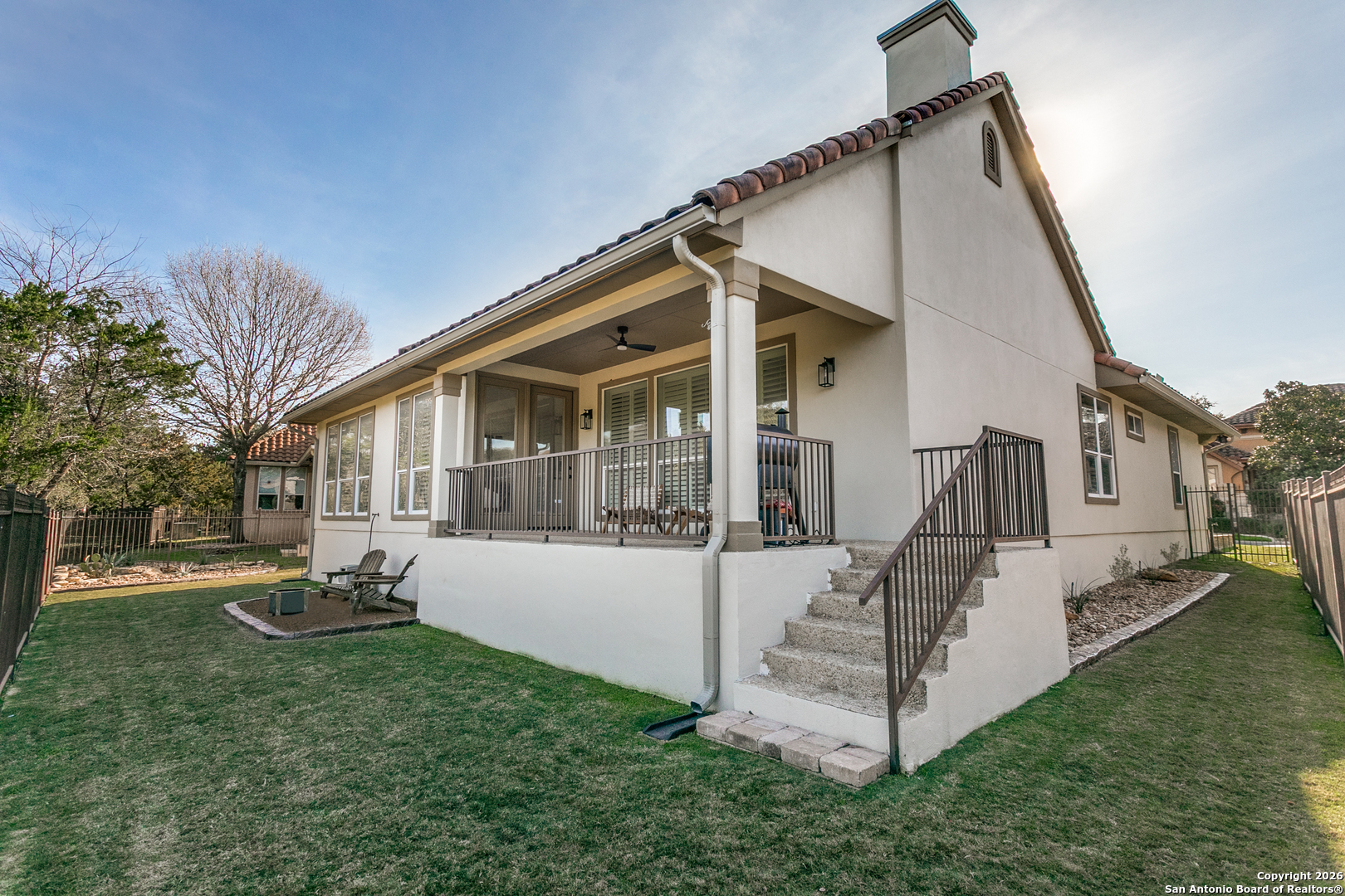 Discover a meticulously updated single story home nestled on a picturesque greenbelt lot in the prestigious Dominion. This exquisite residence welcomes you with a stunning two story entryway, leading into an open floor plan accented by soaring ceilings and abundant natural light. The main living areas poised for transformation with new wood flooring, seamlessly connect to the formal dining room and spacious family room, complete with a newly installed decorative electric fireplace. The recently updated chef's kitchen is complemented by stainless steel appliances, custom cabinetry, and stylish backsplash. Gather around the oversized quartz island, which serves as the perfect centerpiece for entertaining, or enjoy a family meal in the eat-in area overlooking the back yard. Retreat to the primary suite, a serene haven featuring a generous layout. Indulge in the spa like ambiance of the impeccable bath, equipped with a soaking tub and an oversized walk in shower. The sophisticated closet is designed with custom drawers and is illuminated by designer lighting. This home also features a beautifully appointed secondary bath with upscale decor, perfectly matching the two additional bedrooms thoughtfully located in their own private wing. The utility room has been tastefully updated with chic tile flooring, a stylish backsplash, and convenient shelving. Step outside onto the covered patio, ideal for outdoor cooking. On cooler evenings, gather around the inviting fire pit and enjoy the freshly landscaped yard. This home is a true sanctuary, perfect for those who appreciate luxury living in an idyllic setting!