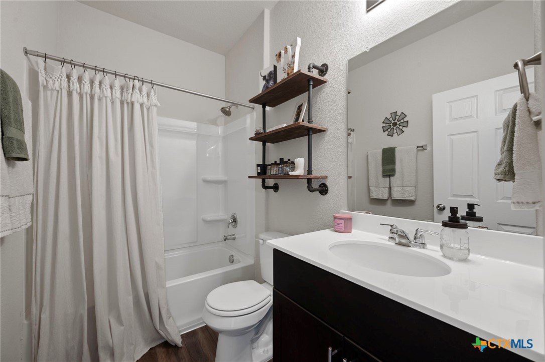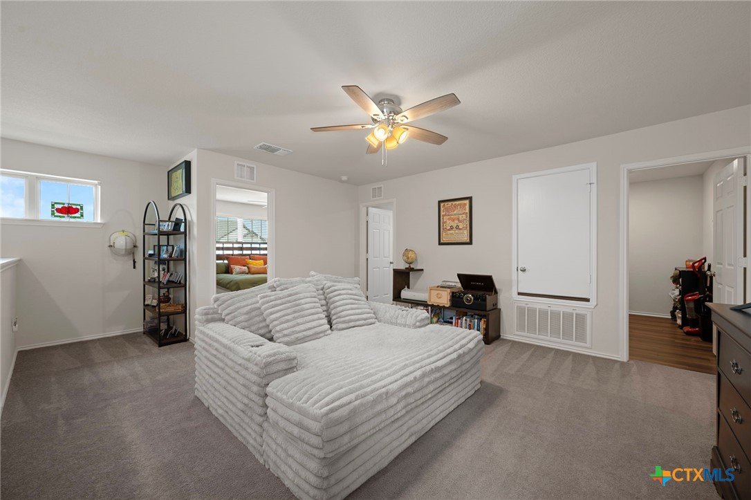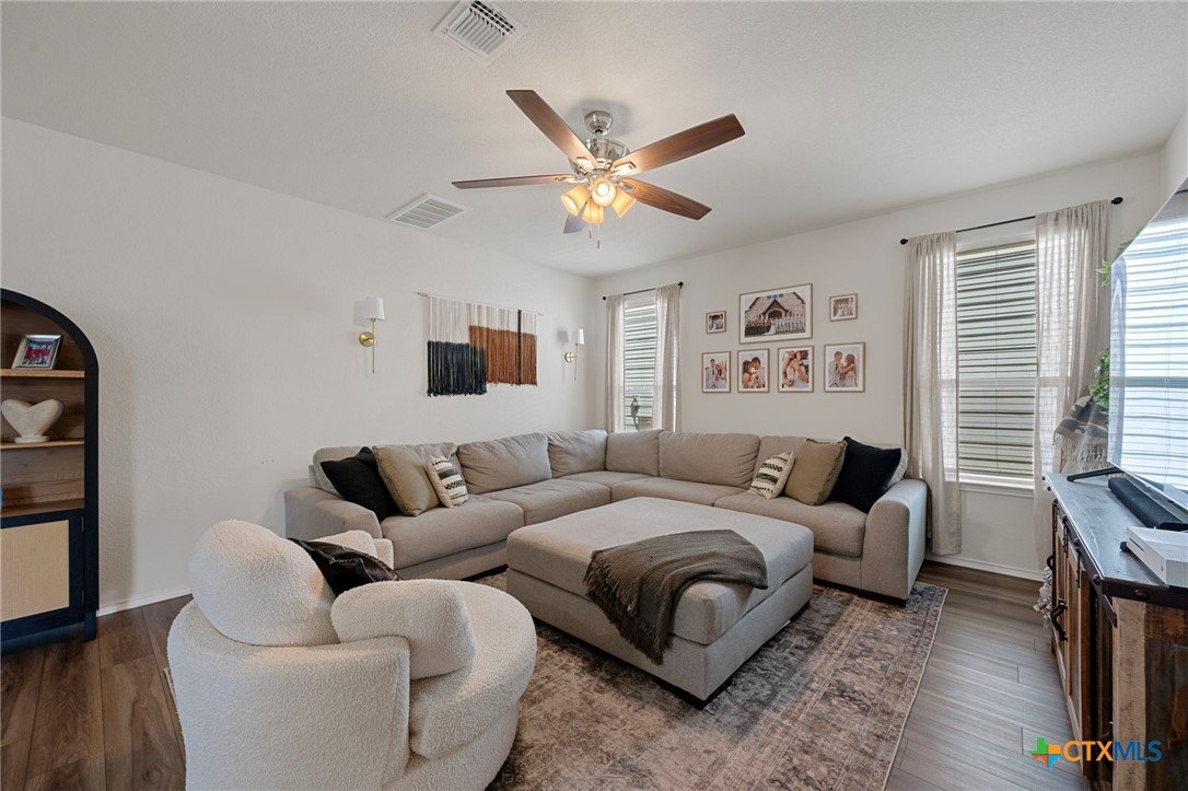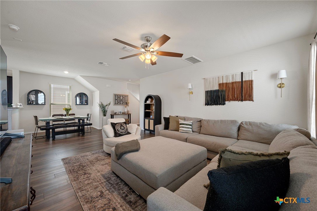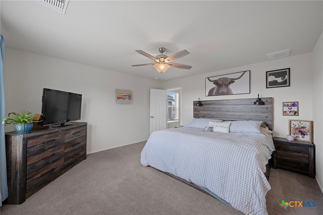 Welcome home! 2023 Centex home features a full bath and bedroom conveniently located on the main floor, and three full bathrooms in total. Upstairs, you'll find a spacious flex space that is ideal for movie nights, an extra living area, or a playroom. The primary suite, also located upstairs, includes a dual vanity and walk-in shower. Additional highlights include upstairs laundry, energy-efficient dual-pane windows, ceiling fans added, and newly planted trees. Enjoy a covered patio and a private backyard with an adorable garden! Please note, the camera on the back patio does not convey with the property. Residents will also benefit from community amenities such as a community pool, basketball court, playground, and a pickleball court is coming soon. The home provides easy access to 183, and is conveniently located near upcoming Target and Costco developments. Located in a PID and pre-inspected!