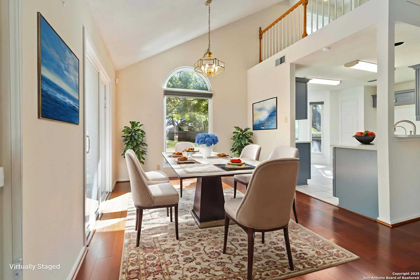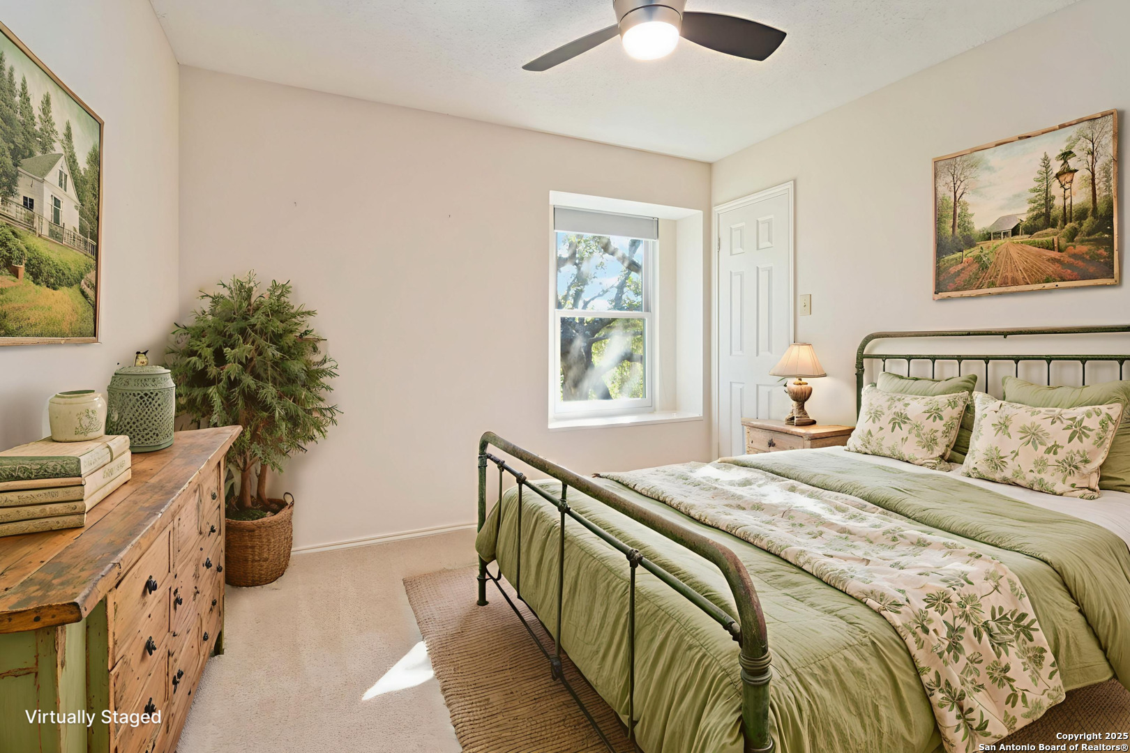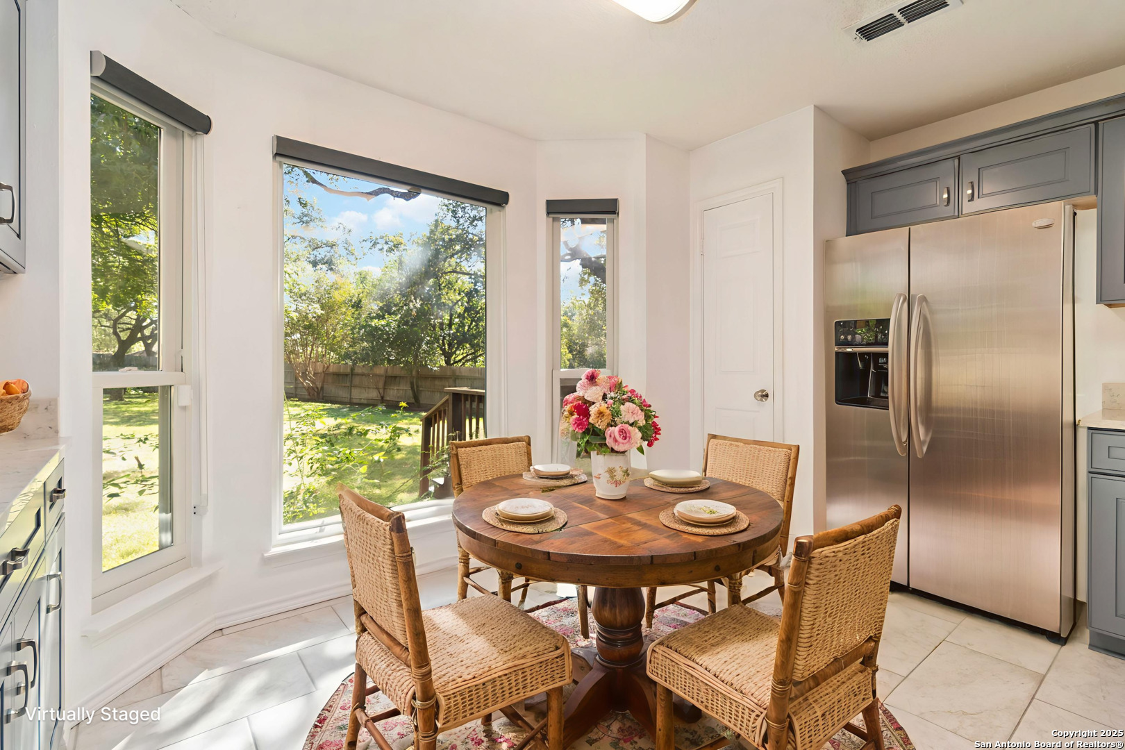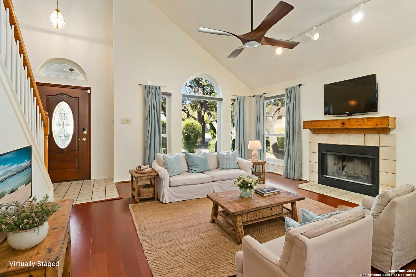 Beautifully maintained one-owner home on a prime lot in the heart of Stone Oak! The spacious primary suite downstairs offers private patio access to a lush backyard oasis. Enjoy two inviting living areas, each with its own fireplace, perfect for entertaining or quiet evenings at home. A zen-inspired side patio off the dining area is ideal for morning coffee or afternoon relaxation. The light-filled, updated kitchen overlooks the 0.26-acre lot framed by mature trees. Upstairs, discover a loft with built-ins, two generous bedrooms, and a secondary bath with a walk-in tub. The oversized garage features abundant storage, plus there's an additional storage shed out back. Notable upgrades include a water softener, sprinkler system, newer windows, 2023 HVAC, retractable awning, and zebra window coverings. This charming Stone Oak gem blends comfort, style, and thoughtful updates - ready to welcome its next owner!