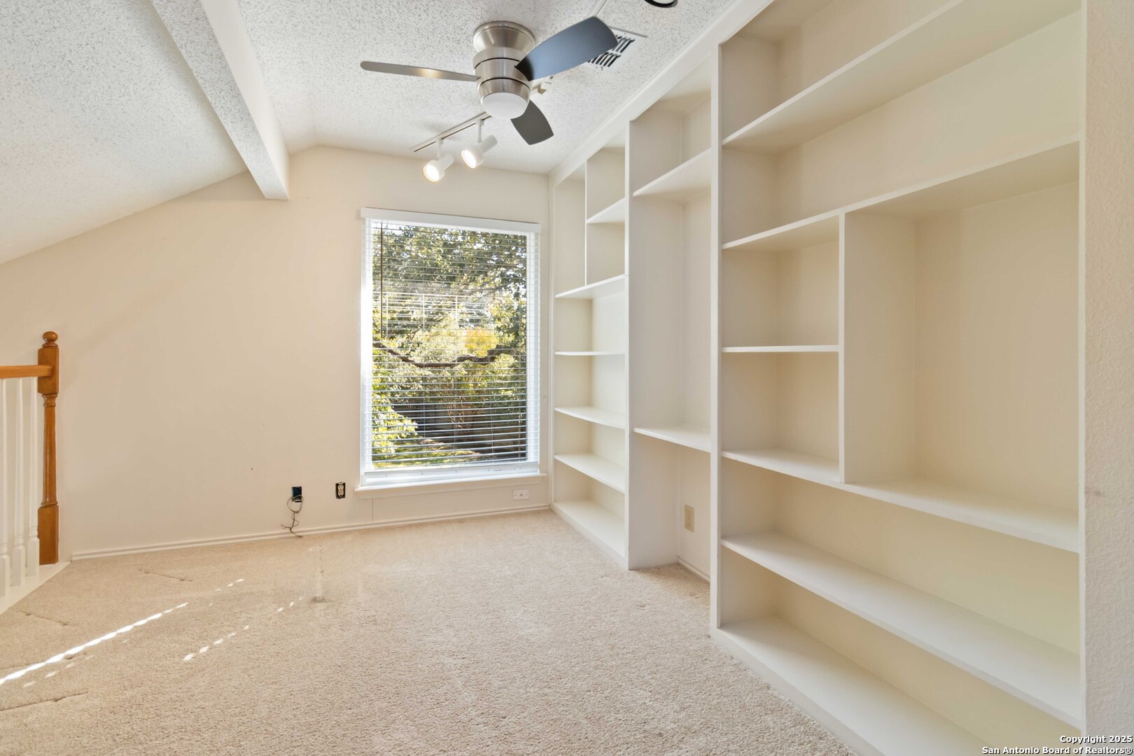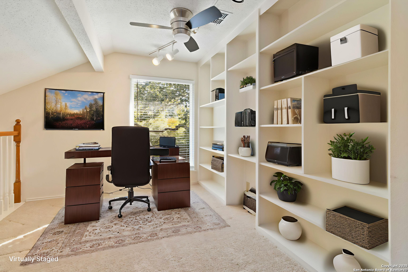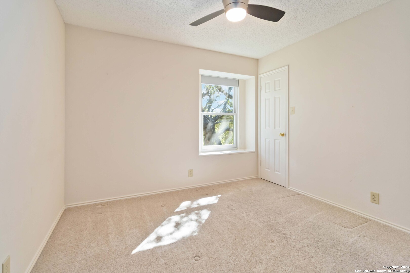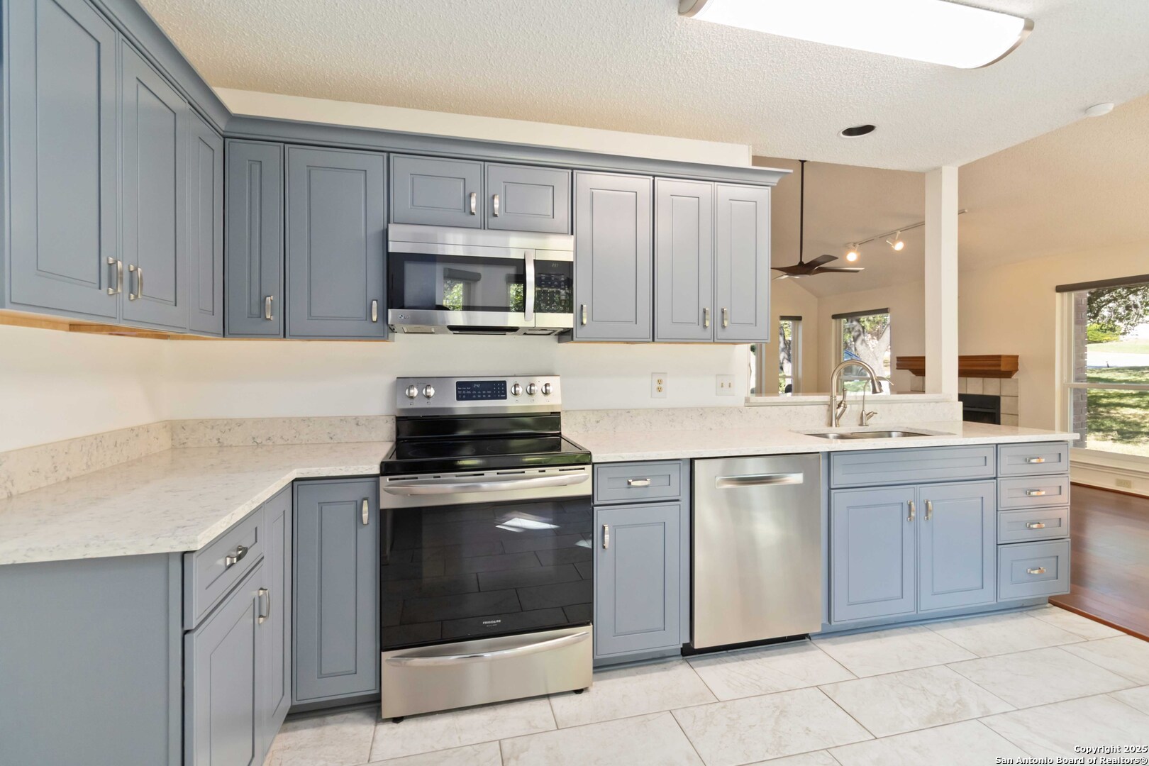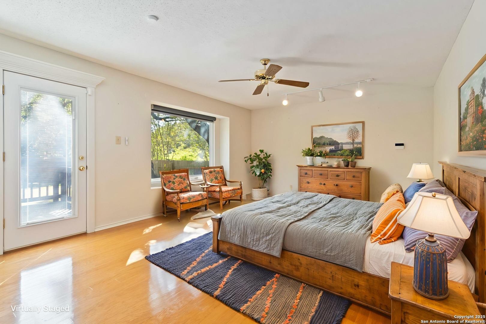 Beautifully maintained one-owner home on a prime lot in the heart of Stone Oak! The spacious primary suite downstairs offers private patio access to a lush backyard oasis. Enjoy two inviting living areas, each with its own fireplace, perfect for entertaining or quiet evenings at home. A zen-inspired side patio off the dining area is ideal for morning coffee or afternoon relaxation. The light-filled, updated kitchen overlooks the 0.26-acre lot framed by mature trees. Upstairs, discover a loft with built-ins, two generous bedrooms, and a secondary bath with a walk-in tub. The oversized garage features abundant storage, plus there's an additional storage shed out back. Notable upgrades include a water softener, sprinkler system, newer windows, 2023 HVAC, retractable awning, and zebra window coverings. This charming Stone Oak gem blends comfort, style, and thoughtful updates - ready to welcome its next owner!