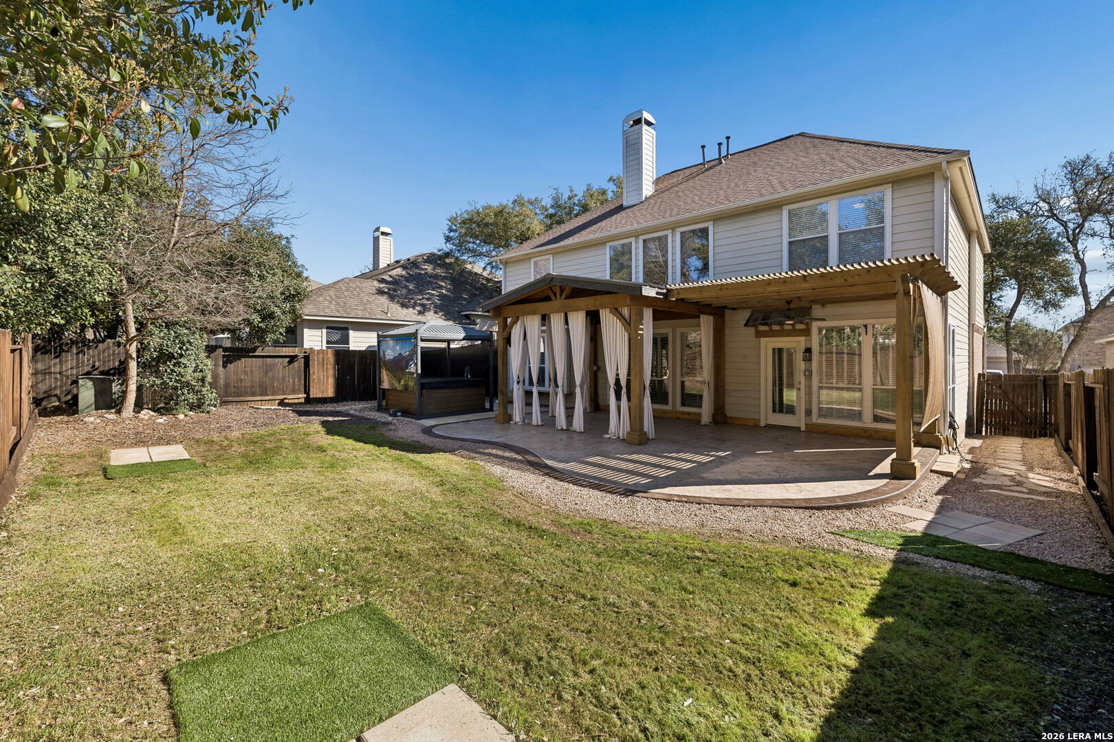 **OPEN HOUSE SUNDAY MARCH 1ST FROM 1-4PM**Welcome to your dream home in the heart of Trinity Oaks! Nestled on a quiet, tree-lined street, this impeccably maintained and beautifully updated two-story gem is truly move-in ready. Step inside and be greeted by abundant natural light pouring through large windows, creating a bright and welcoming atmosphere. The thoughtfully designed layout blends comfort and functionality, featuring spacious living areas ideal for both relaxing and entertaining. The main level offers a generous primary suite with a spa-inspired shower, a living room with soaring vaulted ceilings, and a versatile formal dining area. The kitchen is a chef's delight with premium stainless steel appliances, ample counter space, and abundant cabinetry. Upstairs, you'll find three additional bedrooms, two full bathrooms, and a loft that's perfect for a home office, game room, or cozy retreat. Step outside to your private backyard oasis, complete with a spacious covered patio and enjoy a morning coffee or evening gatherings. Also included is a top-of-the-line hot tub with a raised rooftop and pull-down screens for added privacy. Located in the highly sought-after Trinity Oaks community, you'll appreciate the excellent schools, fantastic amenities, convenient access to Highway 281 shopping, dining and entertaining. All appliances, including two refrigerators, washer, dryer, mounted TVs, and hot tub are all included. Book your private tour today!