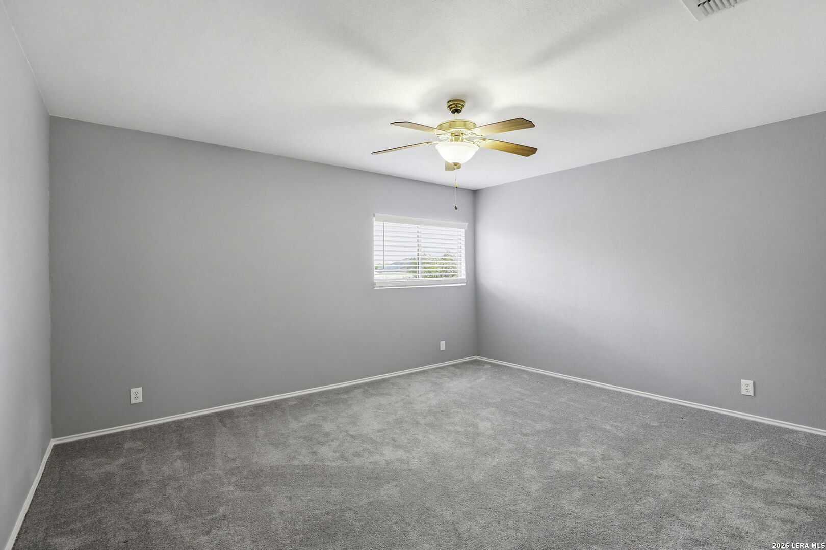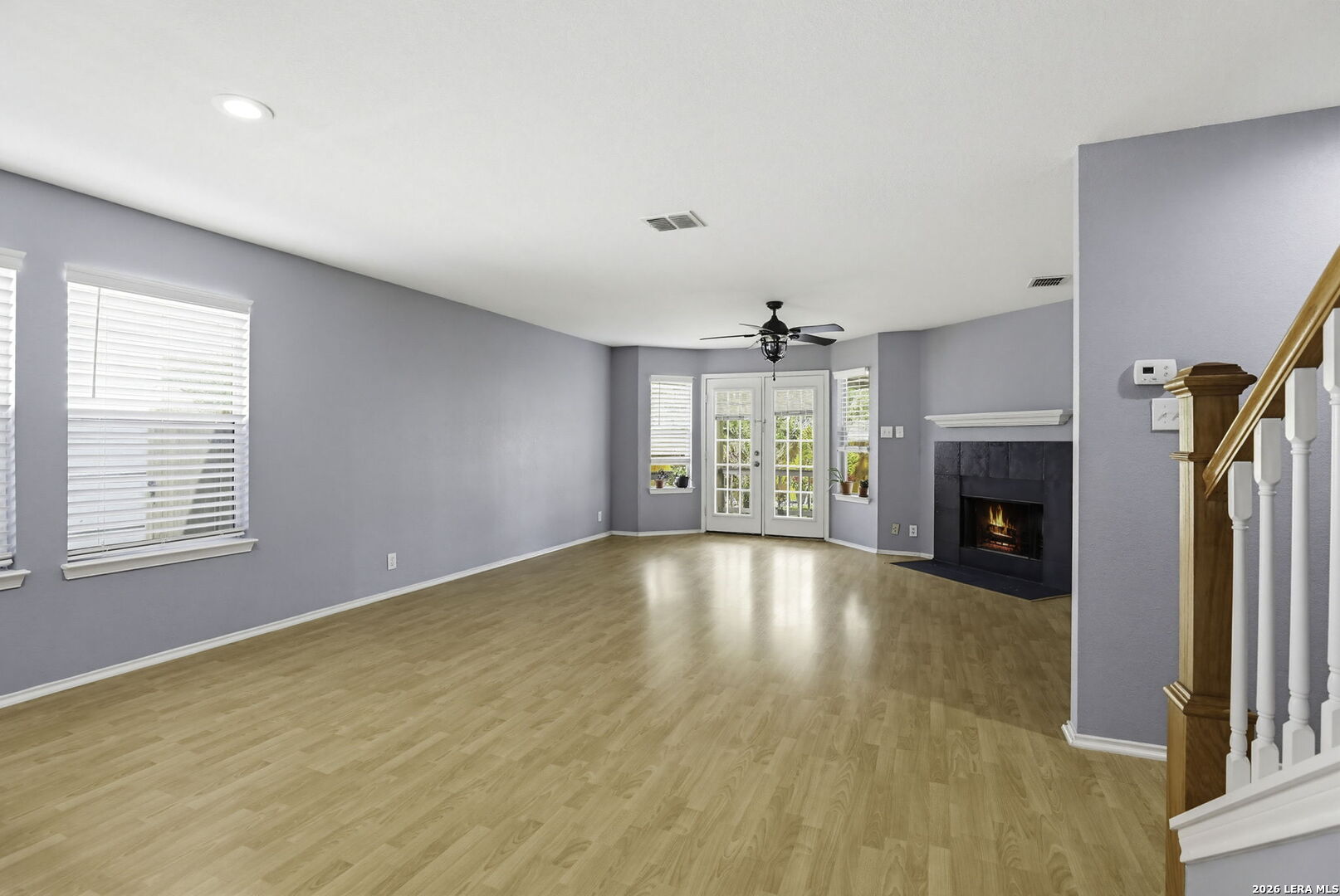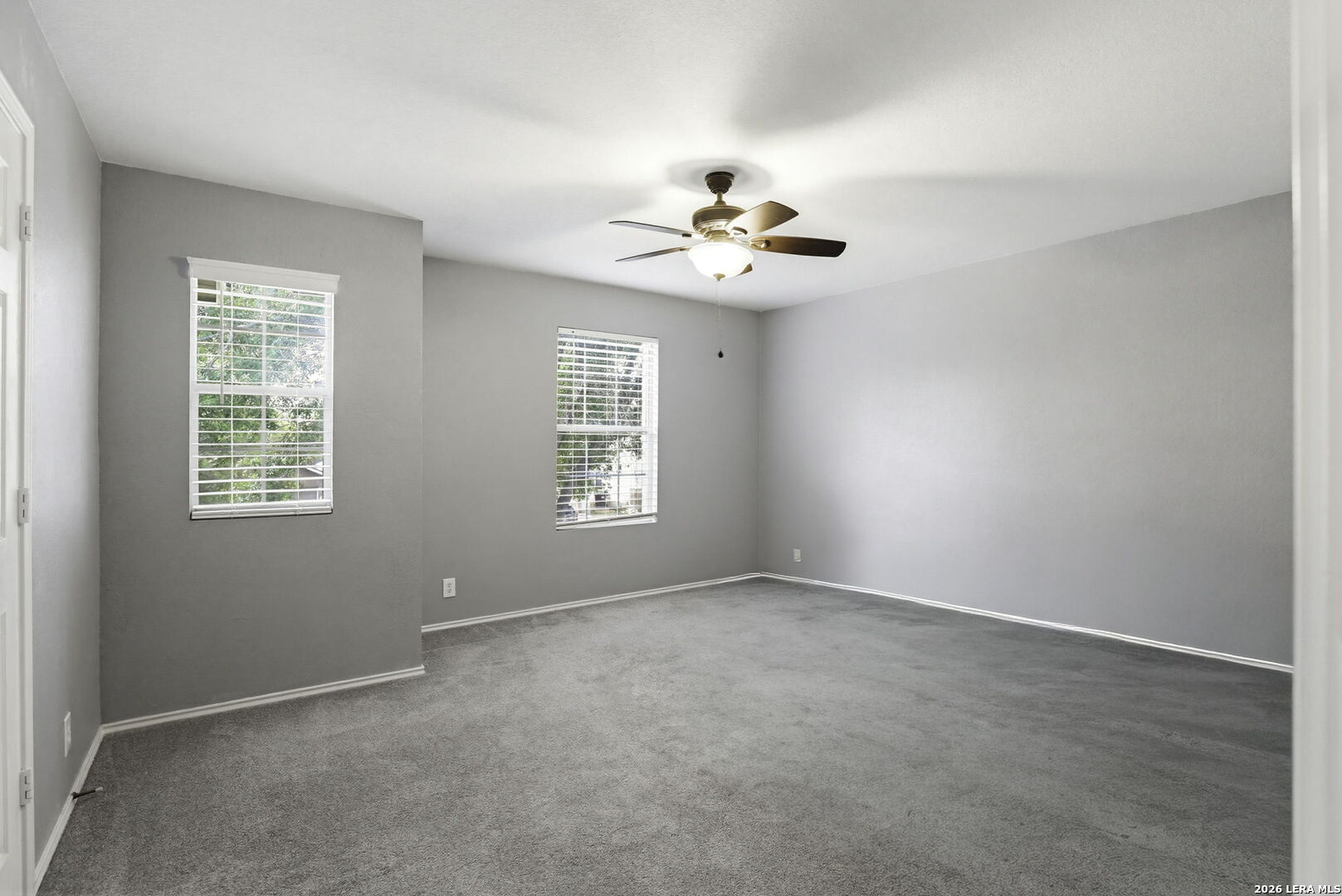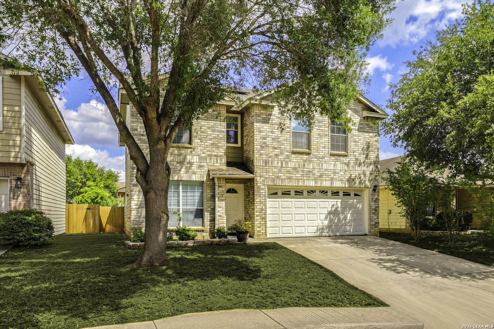 This is the kind of home that feels easy to settle into from day one. Set in Champions Park and backing to a greenbelt, the backyard offers a sense of space and privacy that is hard to find, with mature trees and landscaping creating a quiet, shaded setting. Inside, the layout is designed to live well. The main living area is open and comfortable, centered around a fireplace and filled with natural light. French doors draw you toward the backyard, where an extended covered patio with ceiling fans creates a true outdoor living space that can be enjoyed most of the year. The kitchen has been updated with a clean, modern look that carries into the renovated bathrooms, giving the home a refreshed feel without losing its warmth. The primary suite is downstairs, offering separation from the rest of the home, along with a large walk-in closet and plenty of room to unwind. Upstairs, you will find three additional bedrooms that are all generously sized, along with a spacious game room that can easily adapt to whatever you need, whether that is a second living area, media space, or home office setup. All carpet upstairs has been recently replaced, making it feel fresh and move-in ready. Major updates have already been taken care of, including a roof that is just two years old, a recently replaced HVAC compressor, and solar panels, adding long-term efficiency without the added cost. Altogether, this home offers a thoughtful layout, meaningful updates, and a backyard setting that stands out the moment you step outside.