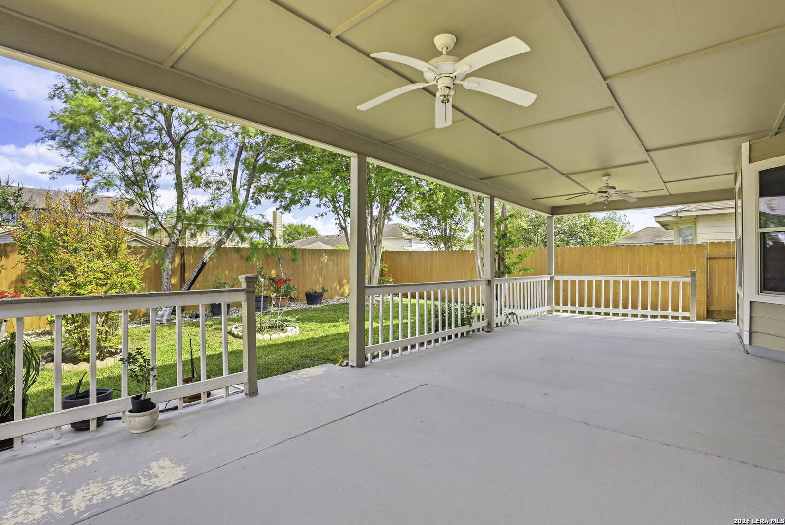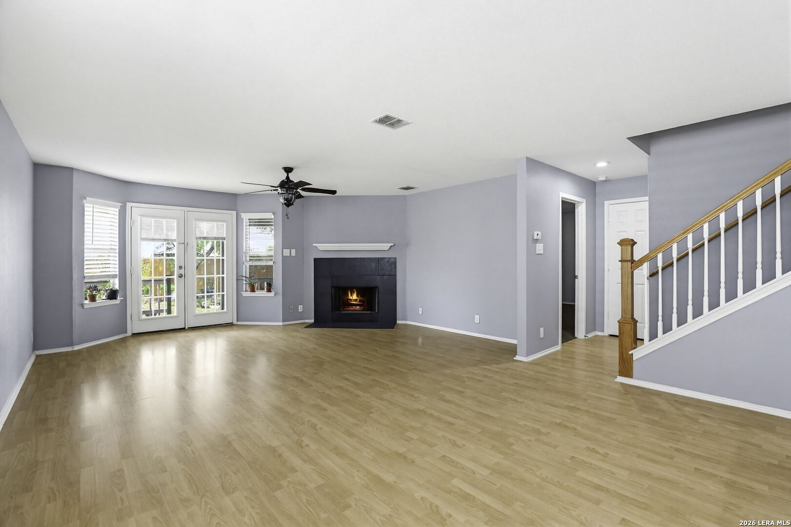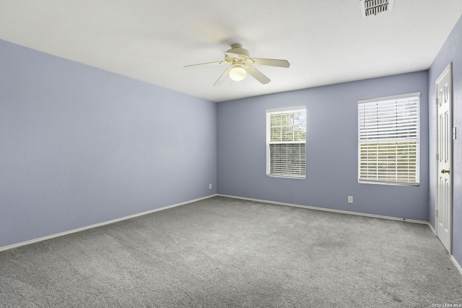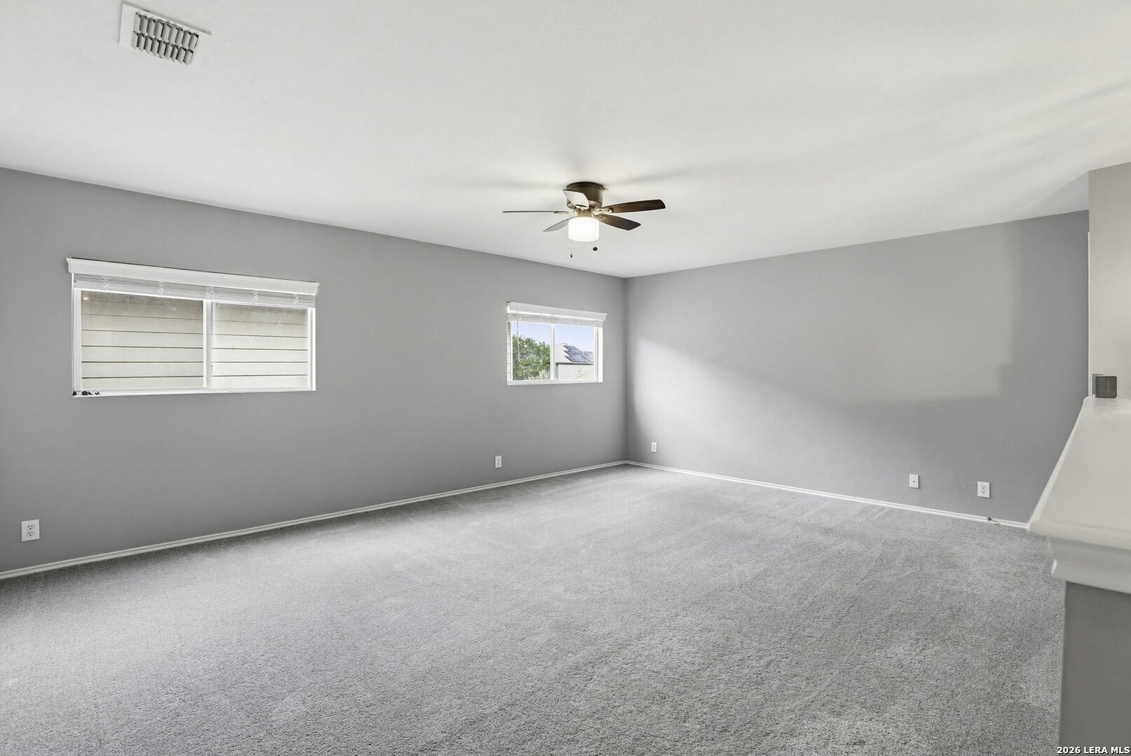 This is the kind of home that feels easy to settle into from day one. Set in Champions Park and backing to a greenbelt, the backyard offers a sense of space and privacy that is hard to find, with mature trees and landscaping creating a quiet, shaded setting. Inside, the layout is designed to live well. The main living area is open and comfortable, centered around a fireplace and filled with natural light. French doors draw you toward the backyard, where an extended covered patio with ceiling fans creates a true outdoor living space that can be enjoyed most of the year. The kitchen has been updated with a clean, modern look that carries into the renovated bathrooms, giving the home a refreshed feel without losing its warmth. The primary suite is downstairs, offering separation from the rest of the home, along with a large walk-in closet and plenty of room to unwind. Upstairs, you will find three additional bedrooms that are all generously sized, along with a spacious game room that can easily adapt to whatever you need, whether that is a second living area, media space, or home office setup. All carpet upstairs has been recently replaced, making it feel fresh and move-in ready. Major updates have already been taken care of, including a roof that is just two years old, a recently replaced HVAC compressor, and solar panels, adding long-term efficiency without the added cost. Altogether, this home offers a thoughtful layout, meaningful updates, and a backyard setting that stands out the moment you step outside.