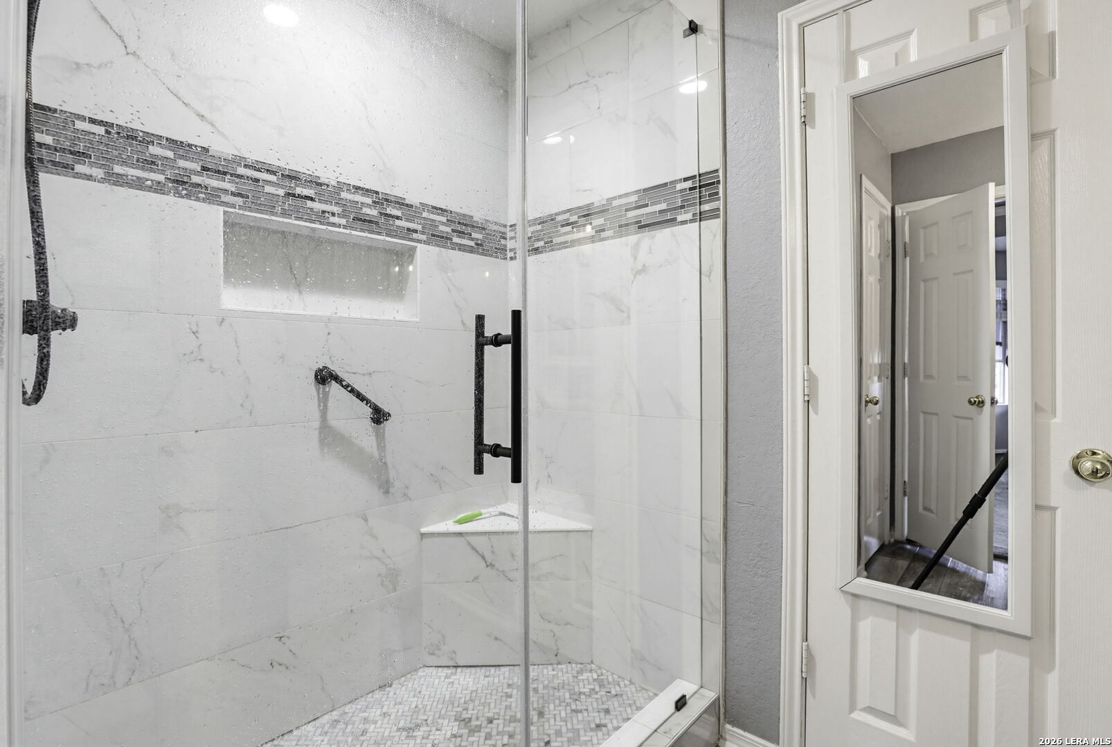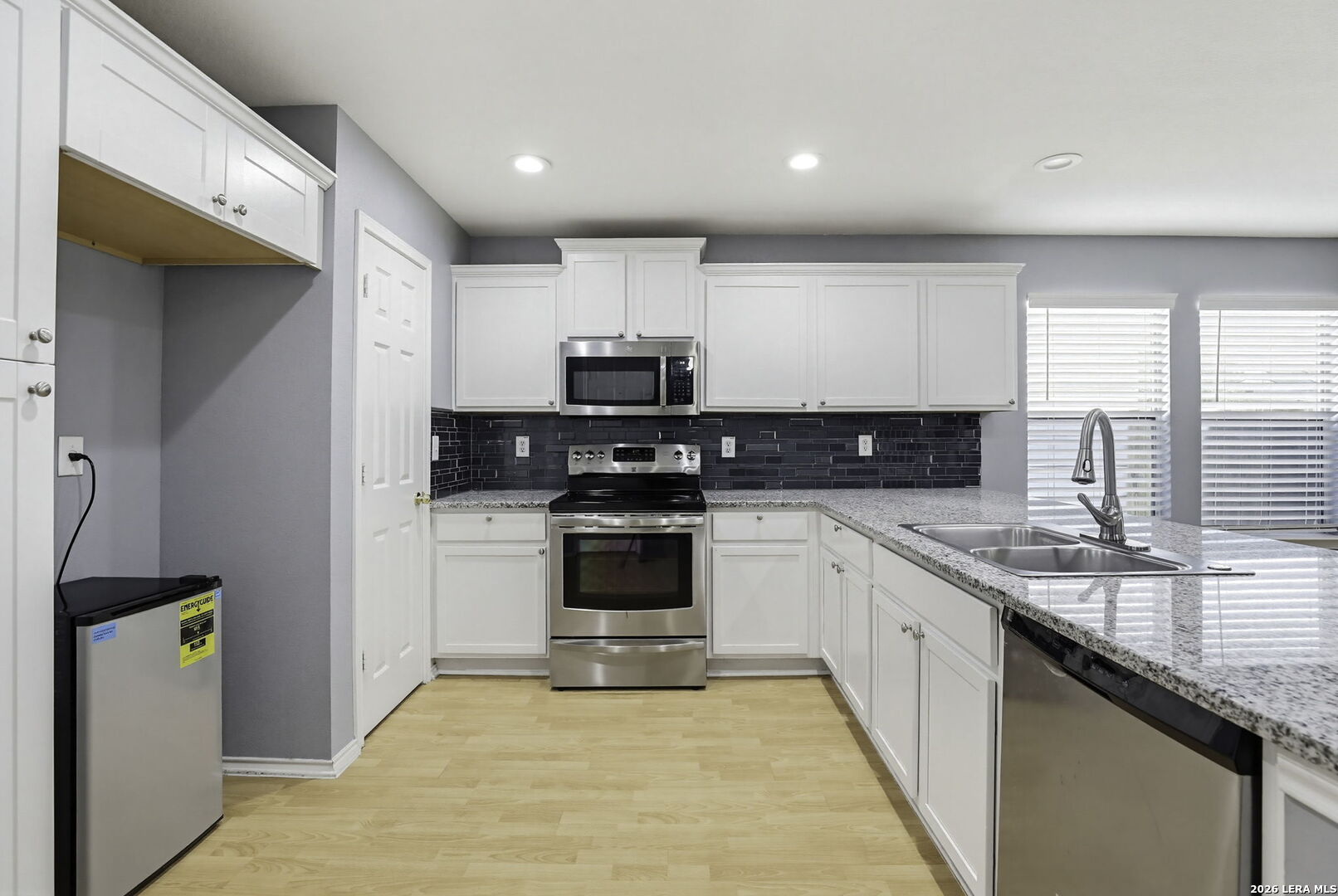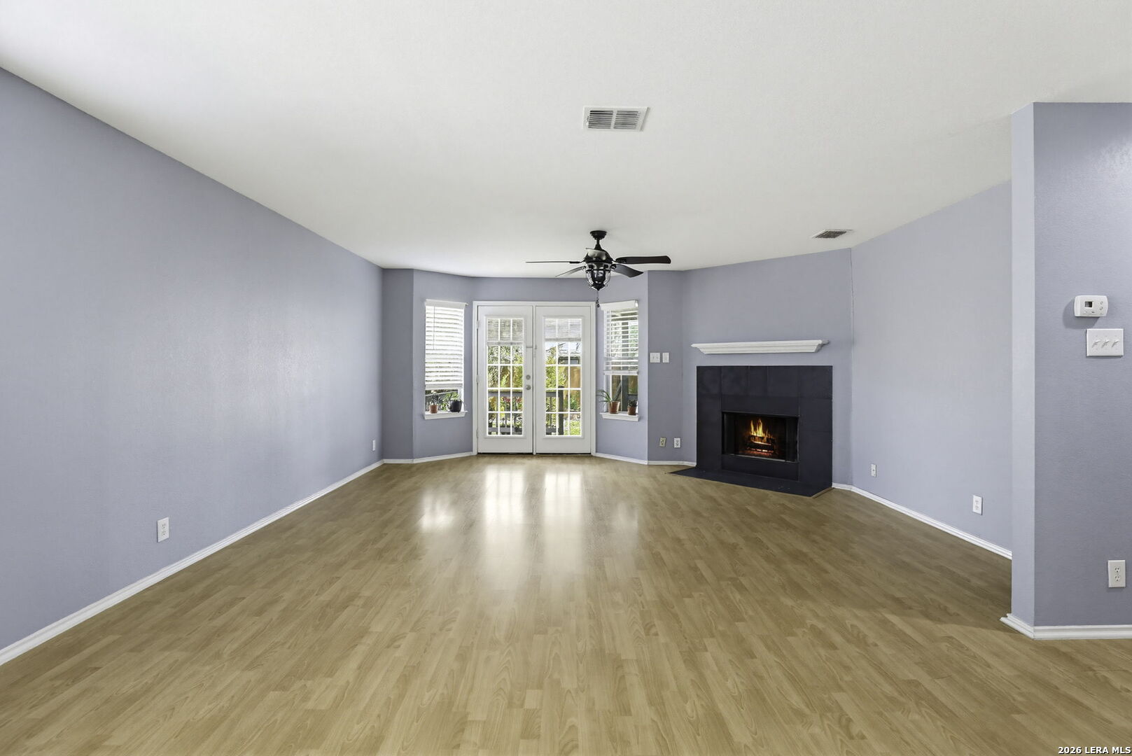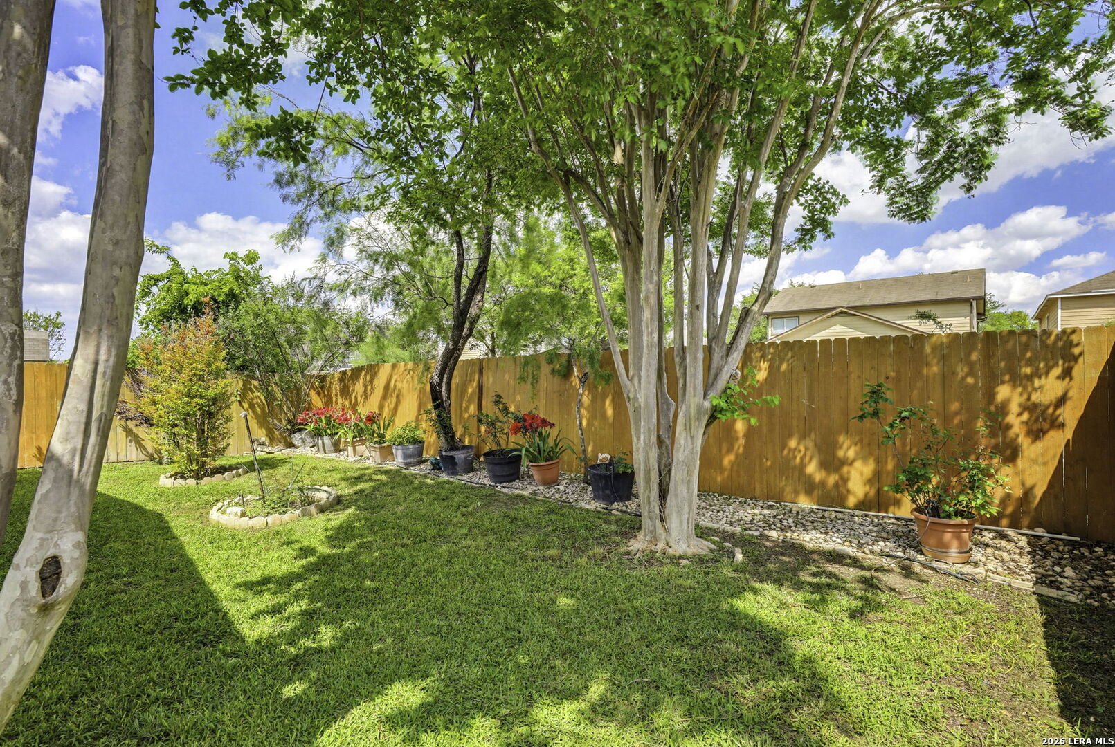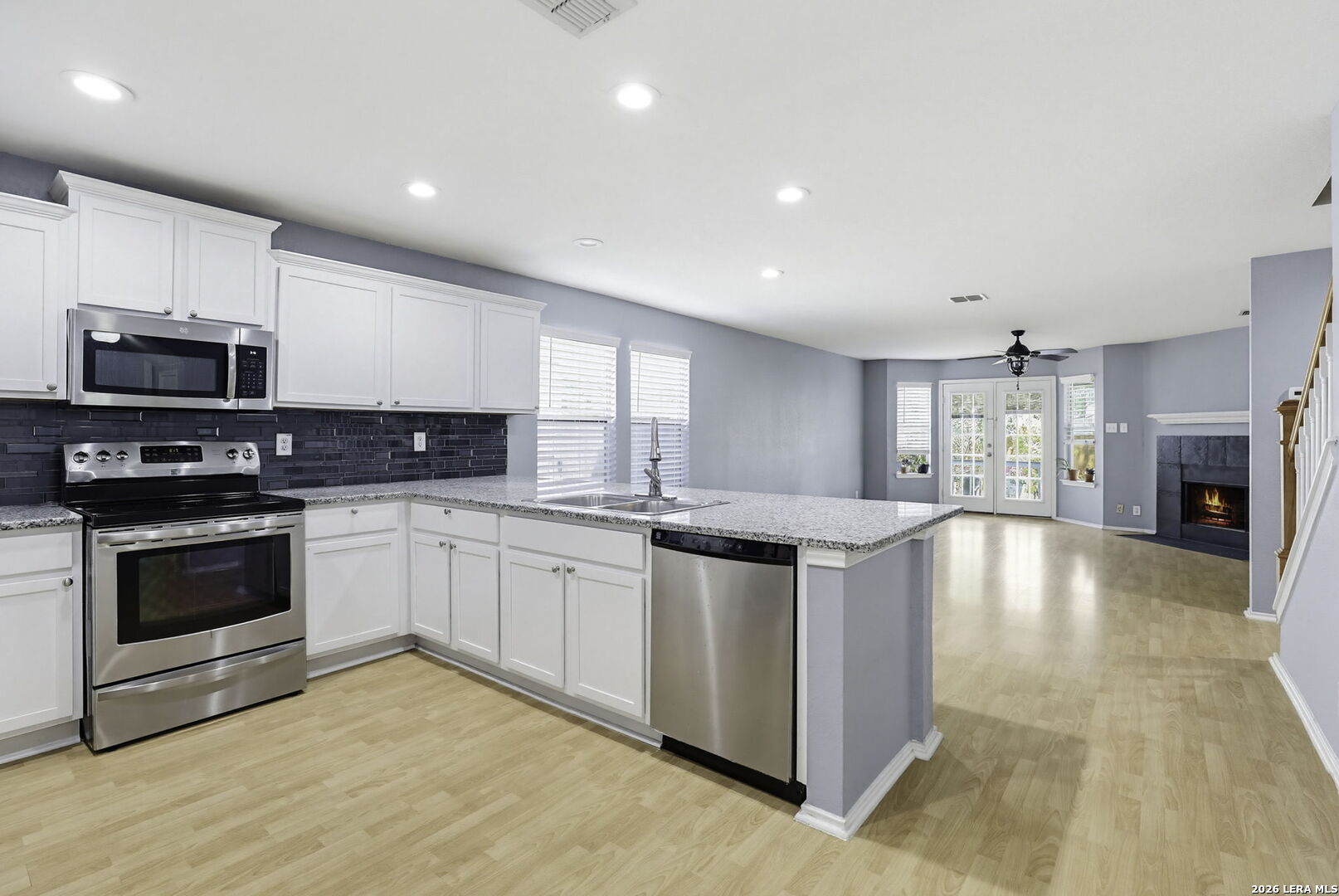 This is the kind of home that feels easy to settle into from day one. Set in Champions Park and backing to a greenbelt, the backyard offers a sense of space and privacy that is hard to find, with mature trees and landscaping creating a quiet, shaded setting. Inside, the layout is designed to live well. The main living area is open and comfortable, centered around a fireplace and filled with natural light. French doors draw you toward the backyard, where an extended covered patio with ceiling fans creates a true outdoor living space that can be enjoyed most of the year. The kitchen has been updated with a clean, modern look that carries into the renovated bathrooms, giving the home a refreshed feel without losing its warmth. The primary suite is downstairs, offering separation from the rest of the home, along with a large walk-in closet and plenty of room to unwind. Upstairs, you will find three additional bedrooms that are all generously sized, along with a spacious game room that can easily adapt to whatever you need, whether that is a second living area, media space, or home office setup. All carpet upstairs has been recently replaced, making it feel fresh and move-in ready. Major updates have already been taken care of, including a roof that is just two years old, a recently replaced HVAC compressor, and solar panels, adding long-term efficiency without the added cost. Altogether, this home offers a thoughtful layout, meaningful updates, and a backyard setting that stands out the moment you step outside.