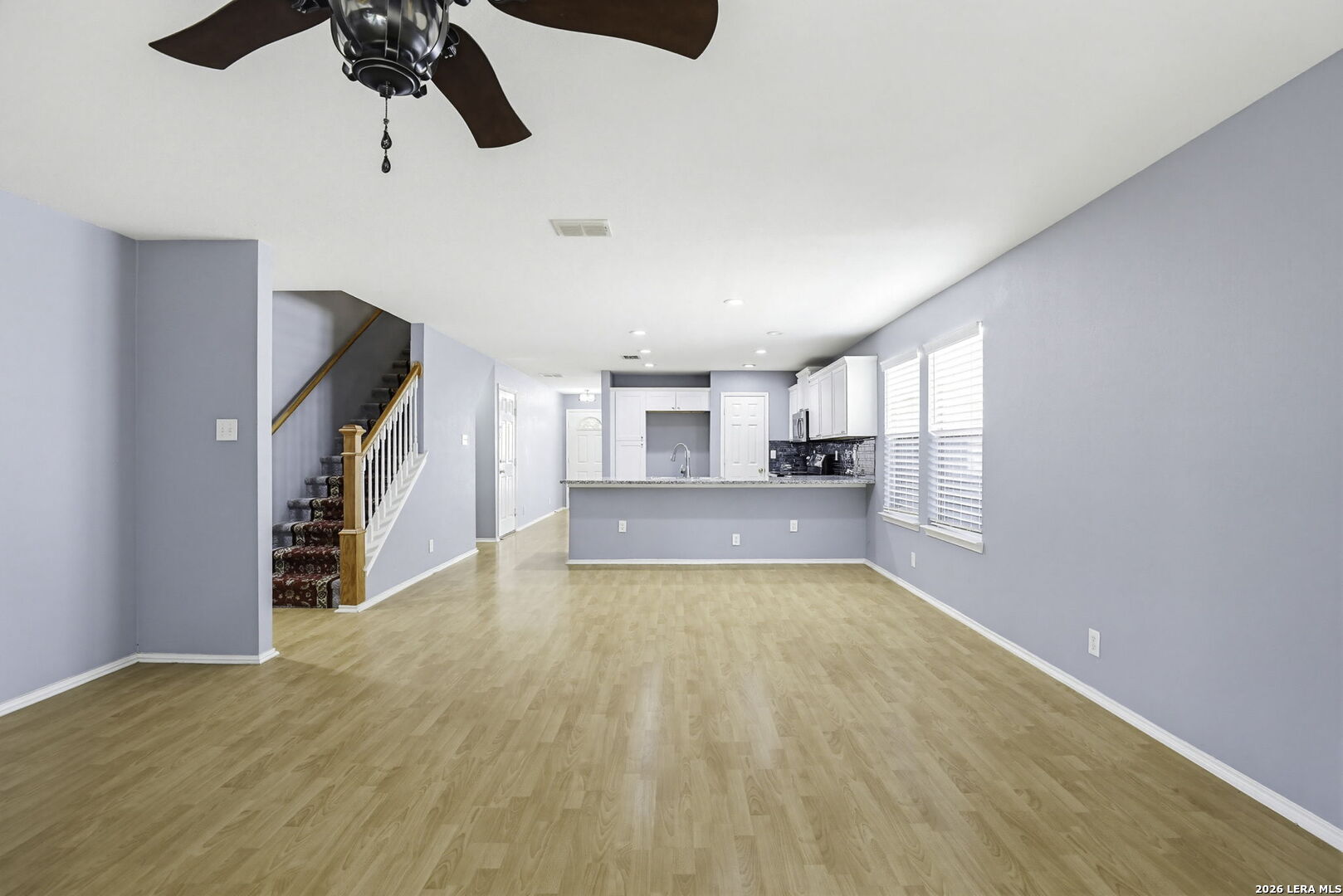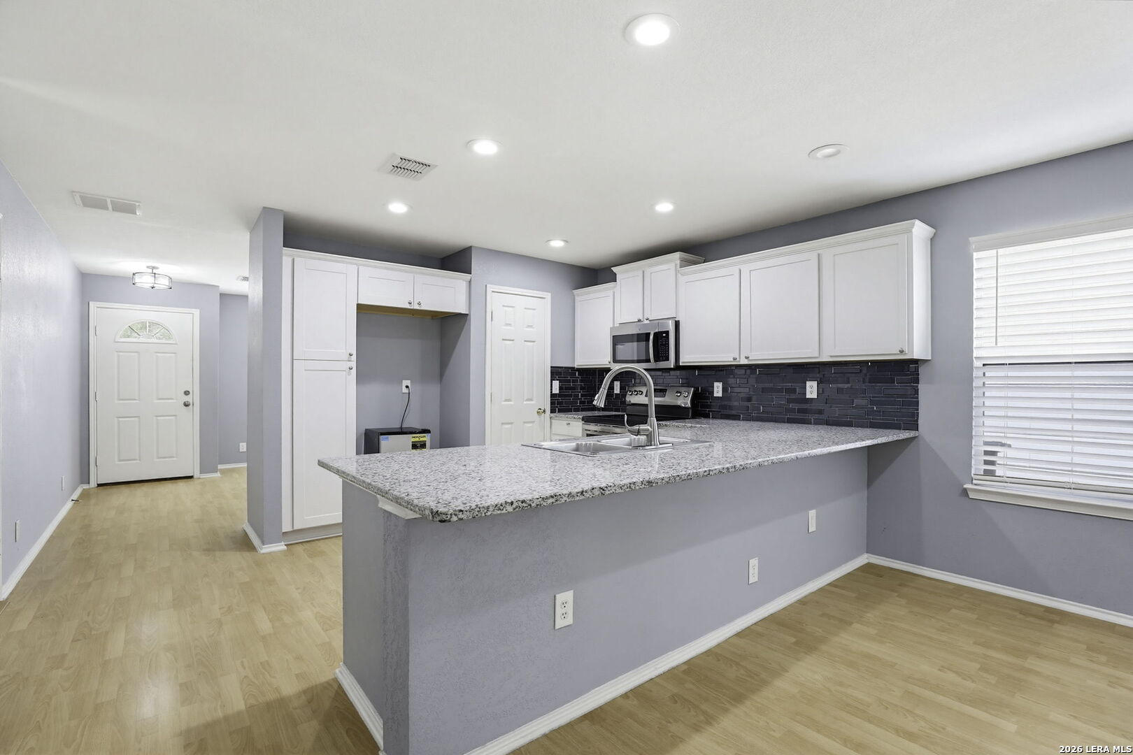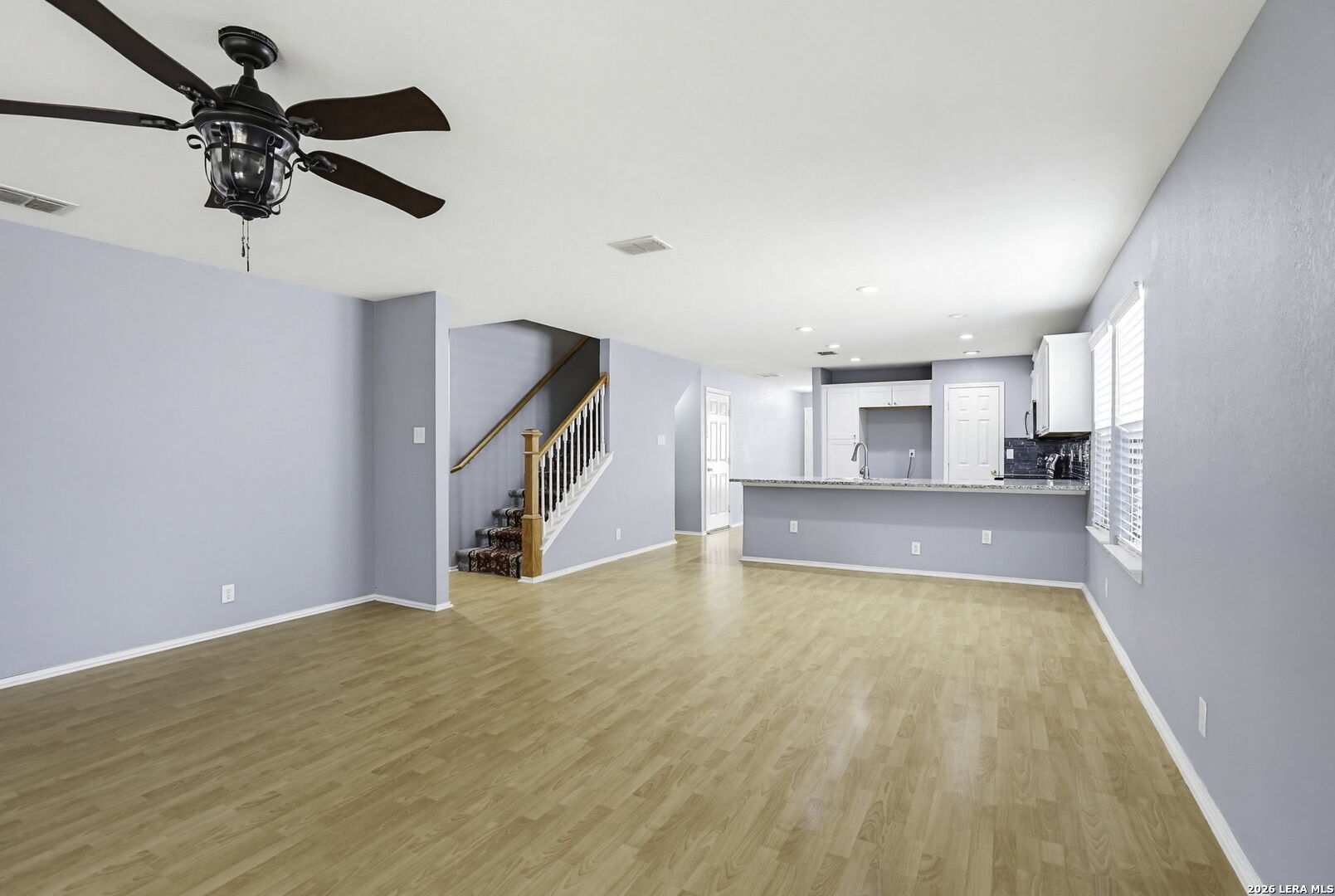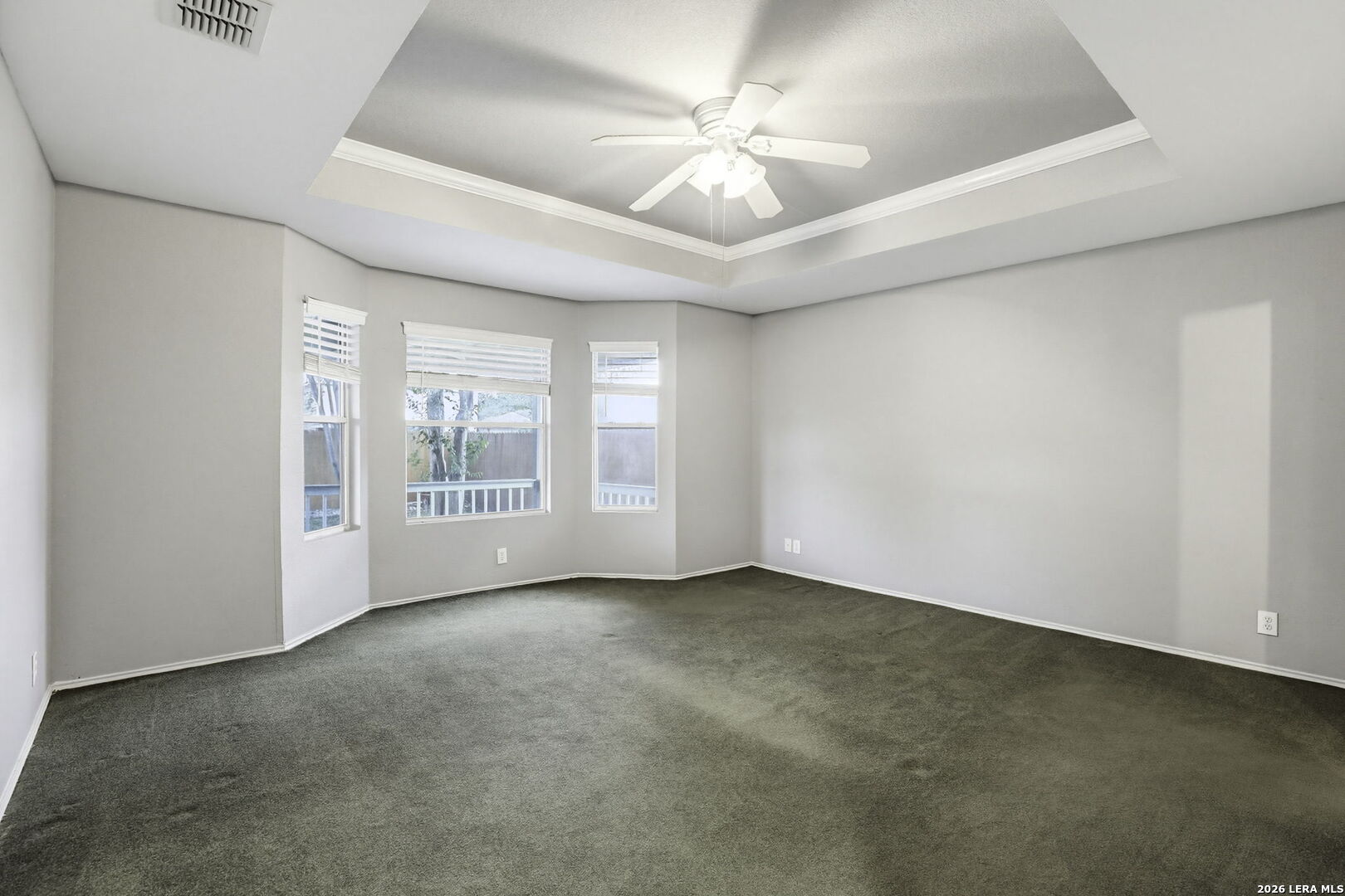 This is the kind of home that feels easy to settle into from day one. Set in Champions Park and backing to a greenbelt, the backyard offers a sense of space and privacy that is hard to find, with mature trees and landscaping creating a quiet, shaded setting. Inside, the layout is designed to live well. The main living area is open and comfortable, centered around a fireplace and filled with natural light. French doors draw you toward the backyard, where an extended covered patio with ceiling fans creates a true outdoor living space that can be enjoyed most of the year. The kitchen has been updated with a clean, modern look that carries into the renovated bathrooms, giving the home a refreshed feel without losing its warmth. The primary suite is downstairs, offering separation from the rest of the home, along with a large walk-in closet and plenty of room to unwind. Upstairs, you will find three additional bedrooms that are all generously sized, along with a spacious game room that can easily adapt to whatever you need, whether that is a second living area, media space, or home office setup. All carpet upstairs has been recently replaced, making it feel fresh and move-in ready. Major updates have already been taken care of, including a roof that is just two years old, a recently replaced HVAC compressor, and solar panels, adding long-term efficiency without the added cost. Altogether, this home offers a thoughtful layout, meaningful updates, and a backyard setting that stands out the moment you step outside.