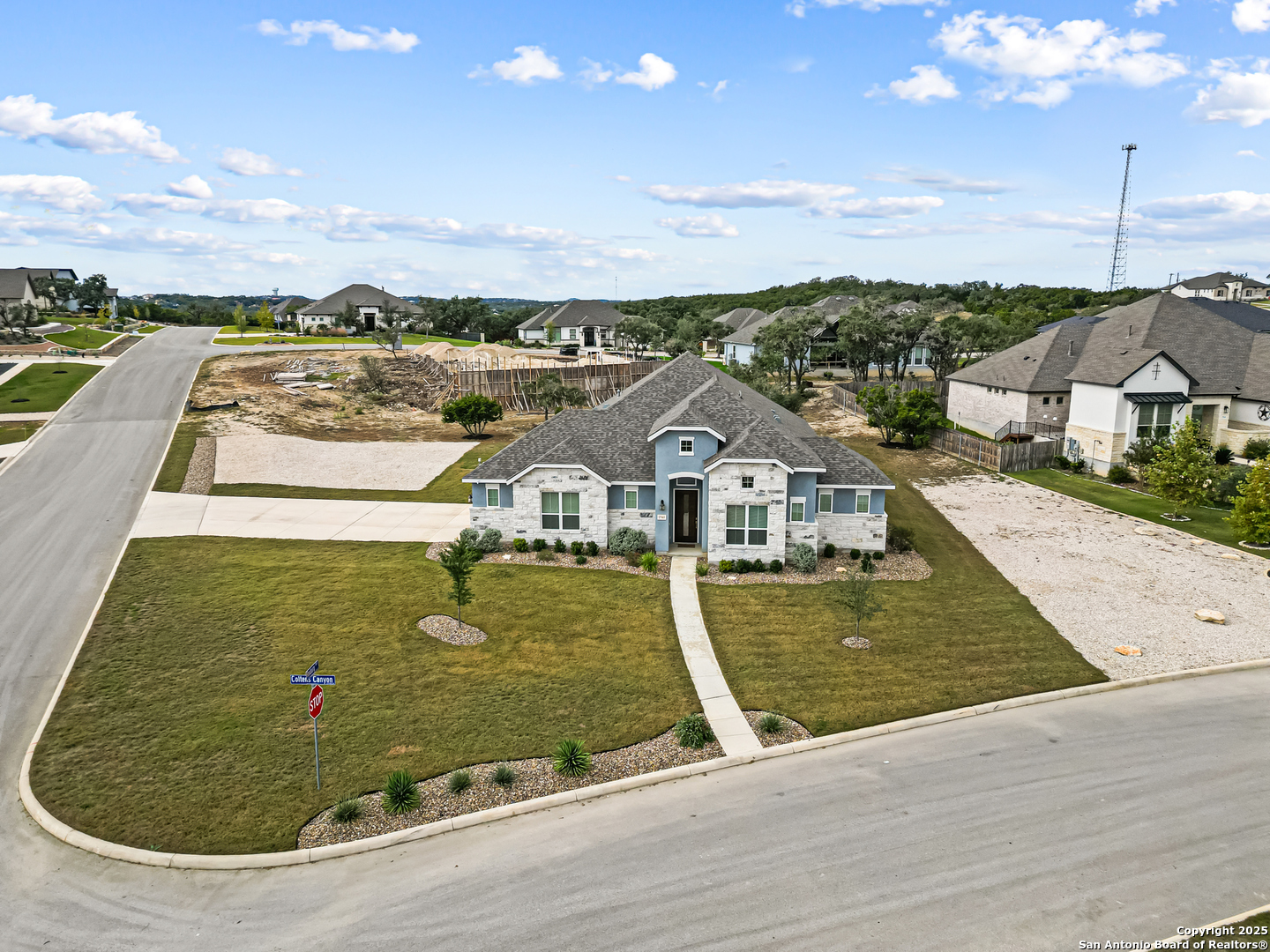 Note: Seller is currently offering 1.5% of sales price concession to be used either towards buyer closing costs or mortgage interest rate buy down! Discover an extraordinary opportunity in the prestigious Highland Estates. Nestled in the tranquil Texas Hill Country, this exquisite single-story residence, built in 2022 and maintained in impeccable condition, this home offers unparalleled luxury and comfort, situated less than 2 miles from US 281 and Borgfeld Drive. Spanning over 0.5+ acres on a prime corner lot, this home provides the perfect blend of privacy and seclusion, ideal for unwinding amidst stunning hilltop vistas. Step inside to be greeted by grand oversized doors and soaring ceilings, leading to a magnificent main living area adorned with a breathtaking stone fireplace. The chef's kitchen is a masterpiece of design, featuring five-burner gas cooking and beautiful stainless-steel appliances. The expansive 9-foot stone-wrapped kitchen island serves as a central gathering spot, perfect for family meals and entertaining. The home boasts a sophisticated split bedroom layout, with a luxurious primary suite that includes a lavish bathroom complete with dual vanities, a spacious glass shower, a relaxing soaker tub, and an expansive walk-in closet. Two additional bedrooms, each with its own walk-in closet, share a well-appointed bath and have easy access to a convenient half bath. A versatile "flex" room with vaulted ceilings and built-ins offers endless possibilities as a study, media/game room, or additional living space. Outside, a large covered patio invites you to enjoy the serene surroundings, with ample space on the expansive lot for future enhancements such as a pool, tennis, or pickleball court. Highland Estates is renowned for its wide roads and panoramic views, and its proximity to Comal County ISD's "A-rated" schools makes its an ideal place to live! 27103 Coltens Canyon is a must-see for discerning buyers seeking elevated Hill Country living-schedule your private showing before this exceptional property is gone.