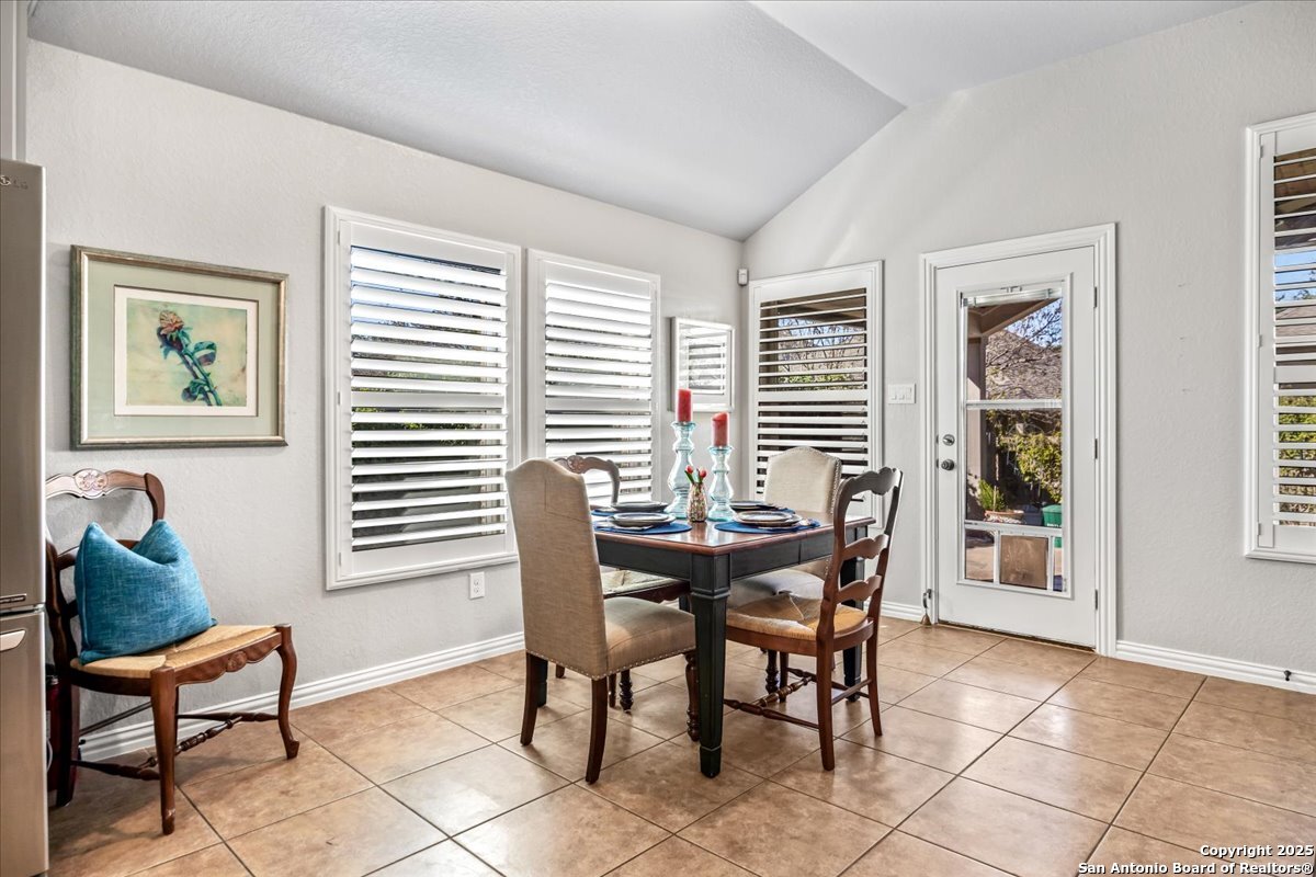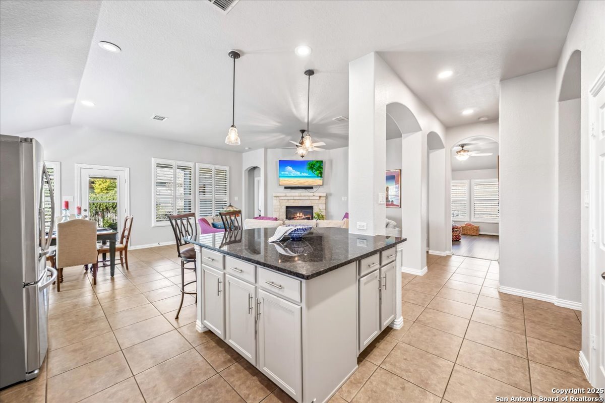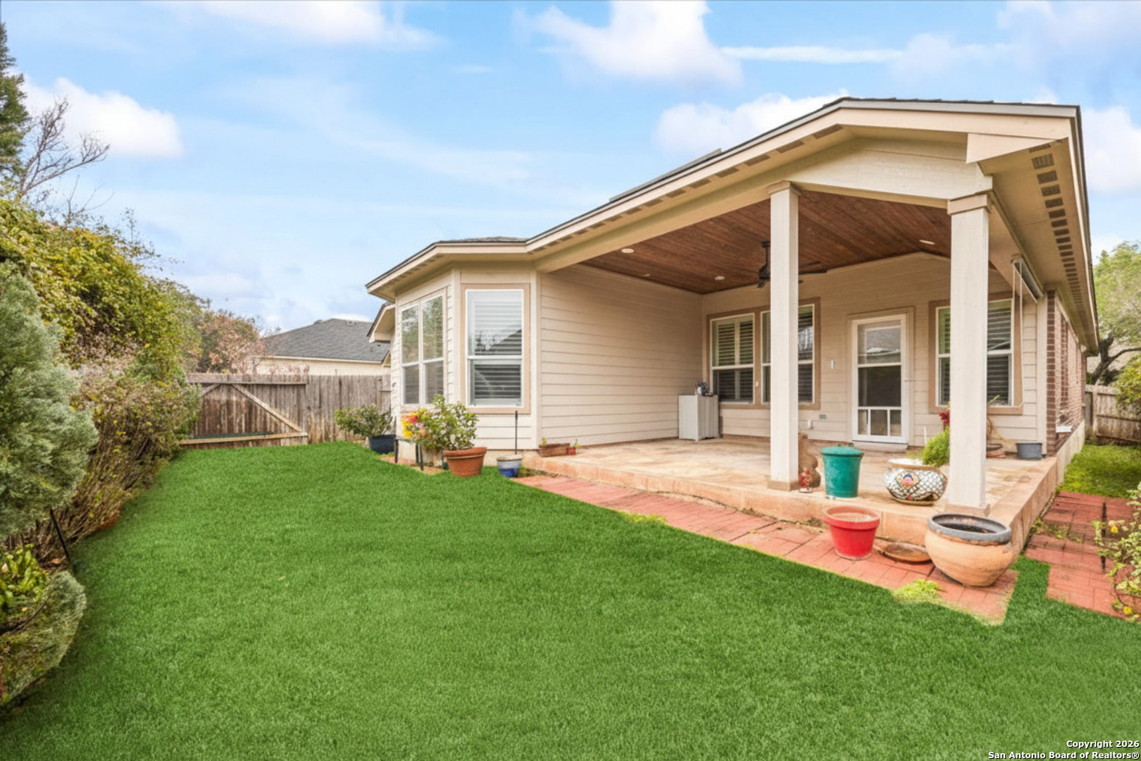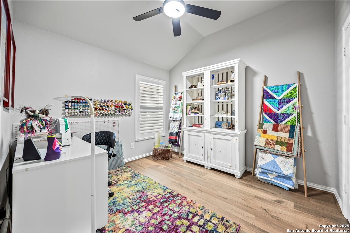Move-in ready, fully upgraded, and tucked away on a quiet cul-de-sac in gated Trinity Oaks! This single story David Weekley home offers rare privacy with an empty lot next door and a thoughtful layout designed for modern living. Inside, you'll find plantation shutters throughout, fresh interior paint, and no carpet-only tile and luxury vinyl plank flooring. The open kitchen features custom-painted cabinets with hardware, granite countertops and island, and recent stainless-steel LG gas cooktop, built in oven, and microwave, ideal for both everyday living and entertaining. The primary suite is a true retreat with a bay window, oversized walk-in closet, and custom walk-in shower. Both bathrooms feature quartzite countertops and custom cabinetry, with additional built-ins in the laundry room for extra storage. A dedicated private study plus a flex room provide versatile space for work or guests. Enjoy outdoor living on the covered patio with lap-wood ceiling, recessed lighting, and an oversized upgraded ceiling fan. Designer lighting on dimmer switches throughout completes this beautifully maintained home. Community pool and park, no city taxes, and zones to acclaimed Comal ISD including Pieper High School. A rare opportunity for turnkey living in Trinity Oaks-schedule your showing today.