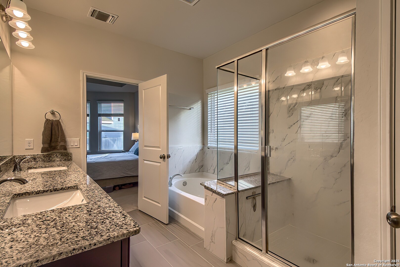 Located in the sought-after gated community Preserve of Sterling Ridge in the Timberwood Park area, this meticulousely maintained 4 bedroom, 2.5 bath, 2527 sq ft home features an open concept living featuring high ceilings and abundant natural light. The large kitchen boasts a large island, upgraded countertops, stainless steel appliances, gas cooking, ample cabinetry, and walk in pantry & alarm system. Faux wood blinds & ceiling fans throughout the house. Beautiful community pool and playground are available for residents use.