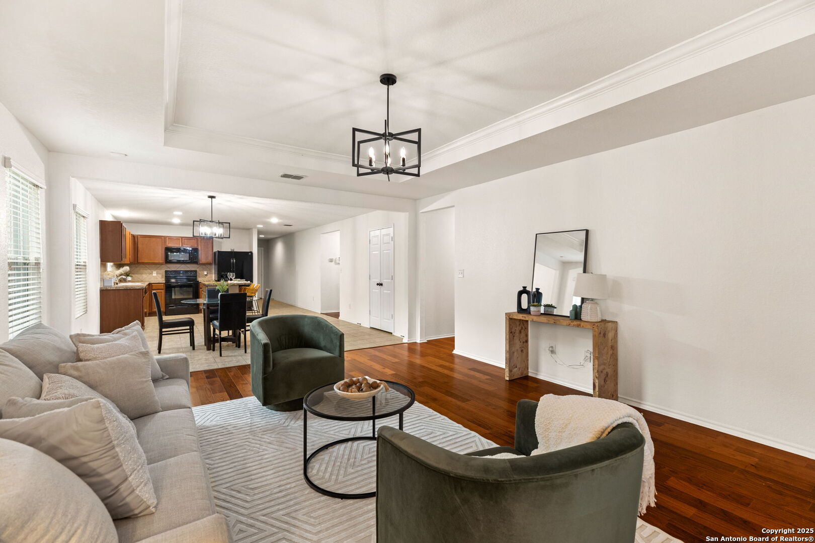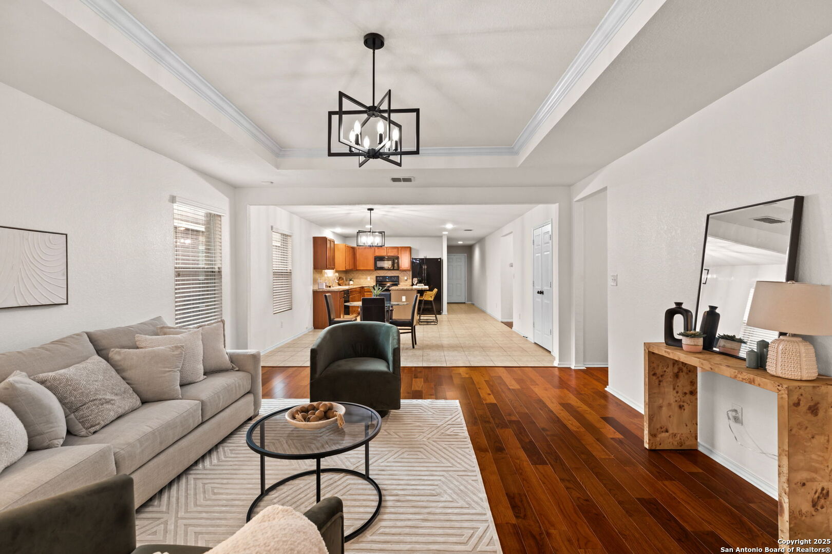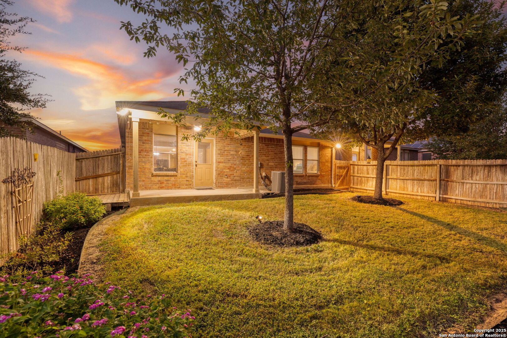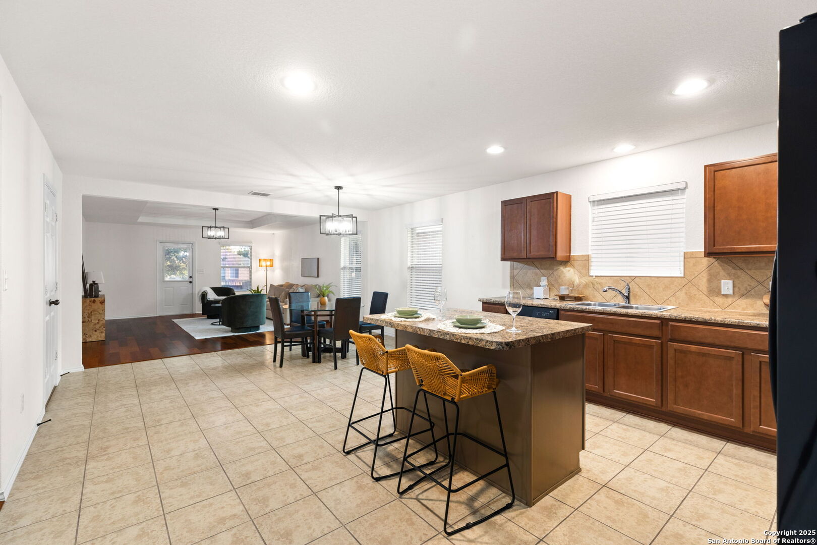 Discover this exceptional one-level residence boasting an inviting open-concept design and thoughtful flow. Inside, enjoy expansive living and dining areas, plus a versatile front space perfect for a study or elegant dining setup, accented by gorgeous hardwood flooring and unique wall colors. The chef-inspired kitchen shines with plenty of storage, sleek counters, soft-glow lighting, and a handy eat-in island. Sunlight pours in from every angle, brightening the space. Retreat to the generous primary suite featuring an en-suite bathroom. Outdoors, unwind on the shaded terrace amid a secure, fenced yard. Don't miss this delightful gem packed with potential!