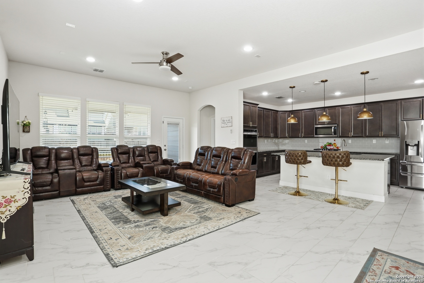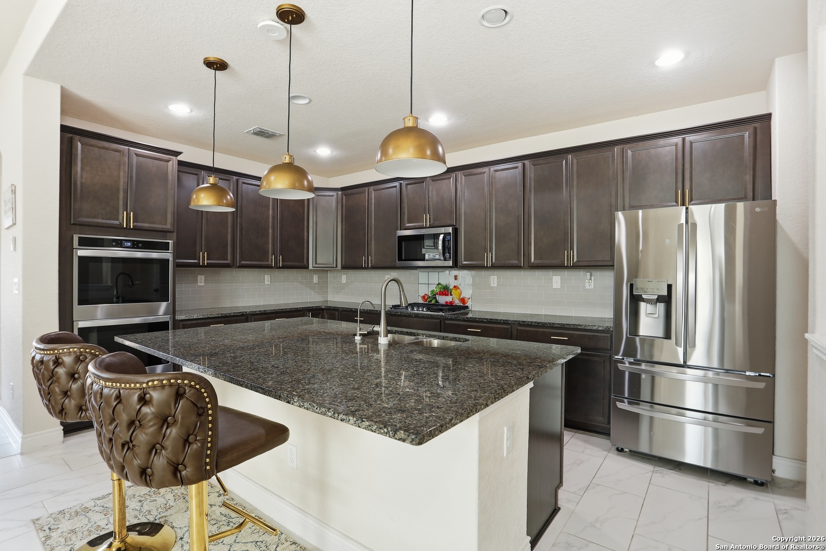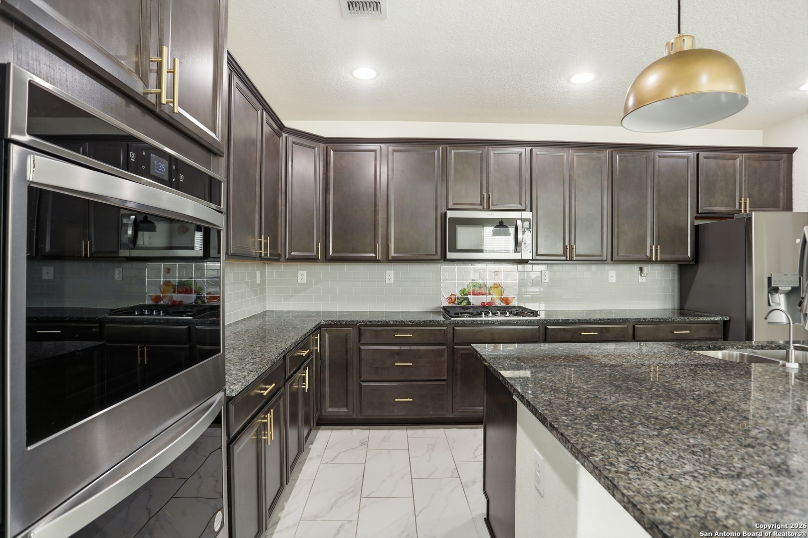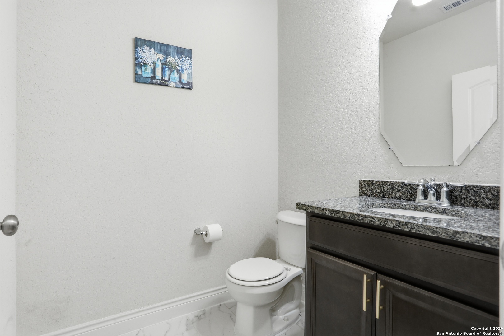 Designed for elevated family living, this stunning home offers 4 bedrooms and 3.5 bathrooms with a highly functional and inviting floor plan. The private primary suite is conveniently located on the main level, providing a peaceful retreat from the rest of the home. Upstairs, families will enjoy a spacious gameroom that connects to an adjoining media room, already prewired for a 7.1 surround sound system-perfect for movie nights and game days. The upgraded kitchen serves as the heart of the home, featuring stainless steel appliances and granite countertops, with granite finishes extended throughout for a polished, cohesive look. Tucked away on a quiet cul-de-sac, the home sits on a large front yard and backs to a scenic greenbelt, offering both space to play and a sense of privacy rarely found.