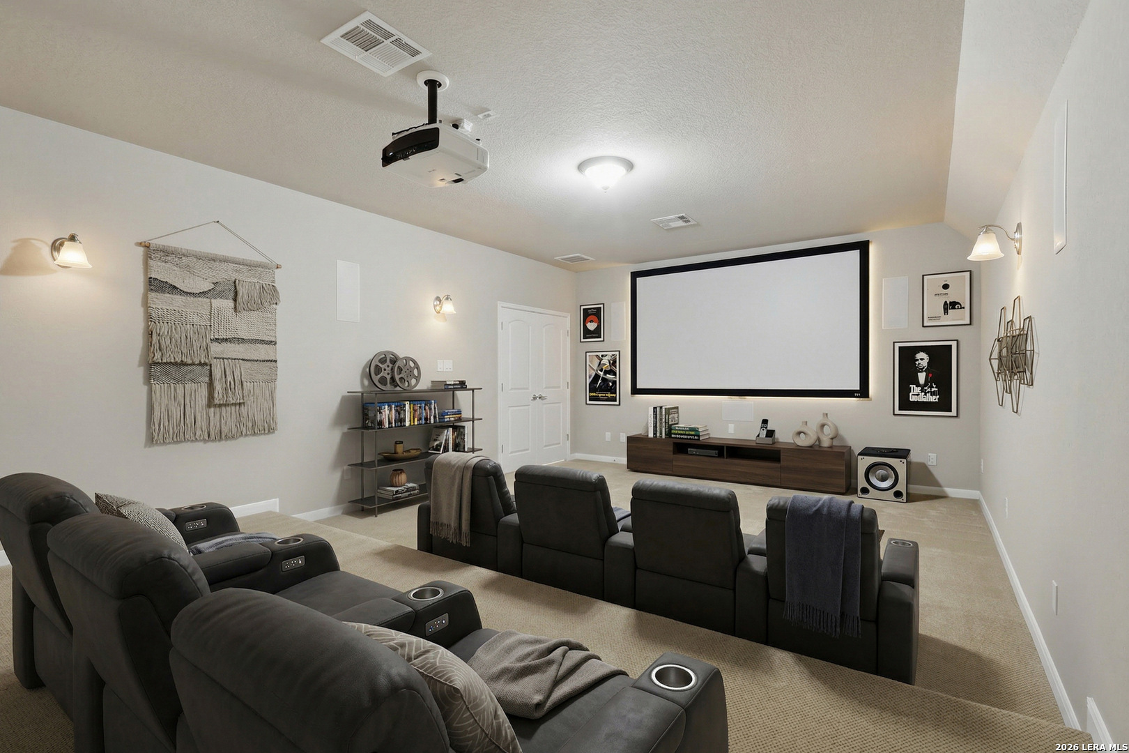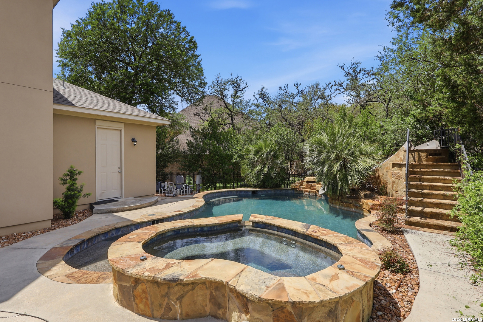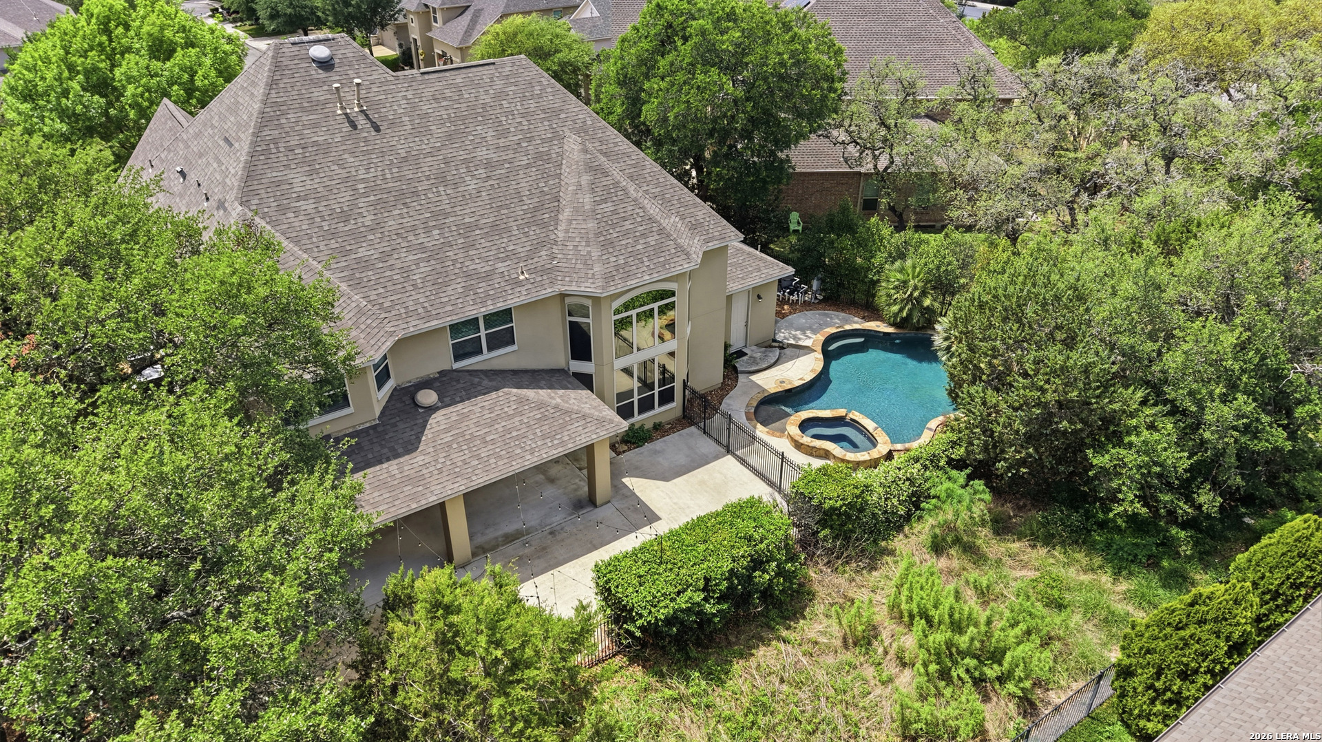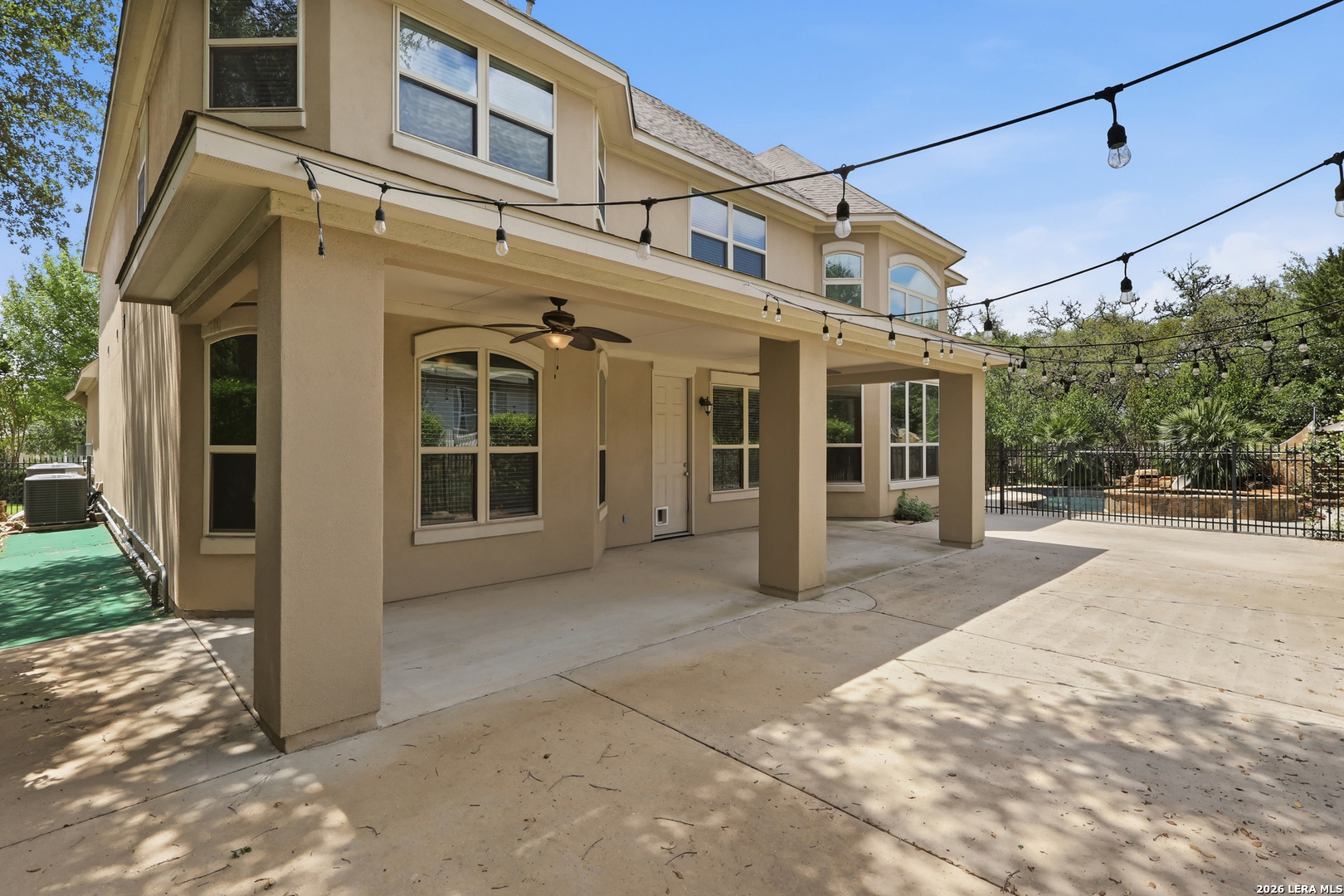 Discover refined living in this stunning contemporary home located in the prestigious, gated Estates of Alon community. This impressive residence offers 5 bedrooms, 4 full baths, and 1 half bath, designed with both comfort and functionality in mind. Step inside to find a spacious and light-filled layout featuring a huge chef's kitchen that flows seamlessly into three separate dining areas, including a formal dining room ideal for hosting. The home also includes a dedicated office and a secondary bedroom conveniently located on the main floor. The expansive owner's suite is a true retreat, complete with generous closet space and a luxurious bathroom featuring dual vanities for added convenience. Throughout the home, you'll find abundant storage solutions thoughtfully into the design. Upstairs, you'll find flexible living space with three additional rooms that can serve as bedrooms or be customized-perfect for a home gym or hobby space. Enjoy movie nights in your own private theater room, creating an elevated entertainment experience. Step outside to your personal backyard oasis featuring a spectacular pool with a waterfall, alongside a covered patio perfect for entertaining. Additional highlights include a 3-car garage and a prime location just minutes from premier shopping and dining destinations like North Star Mall and La Cantera, with easy access to major highways 1604, 410, 281 and I-10. Please validate house measurements, school district and HOA fees and policies