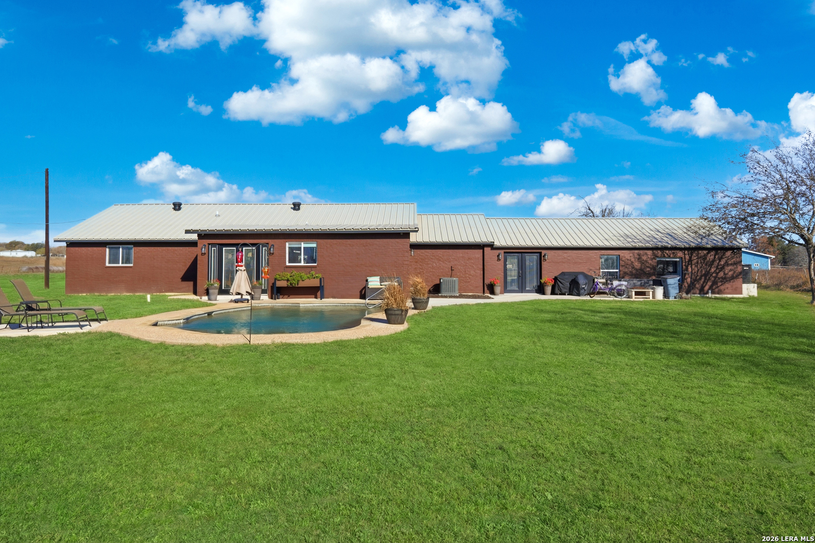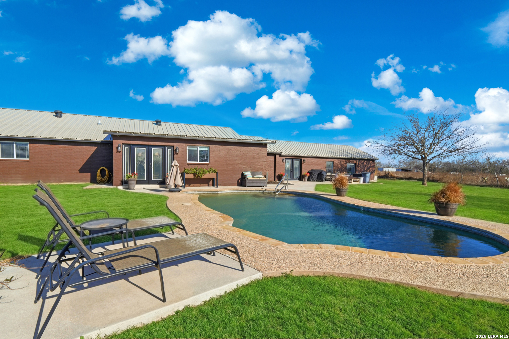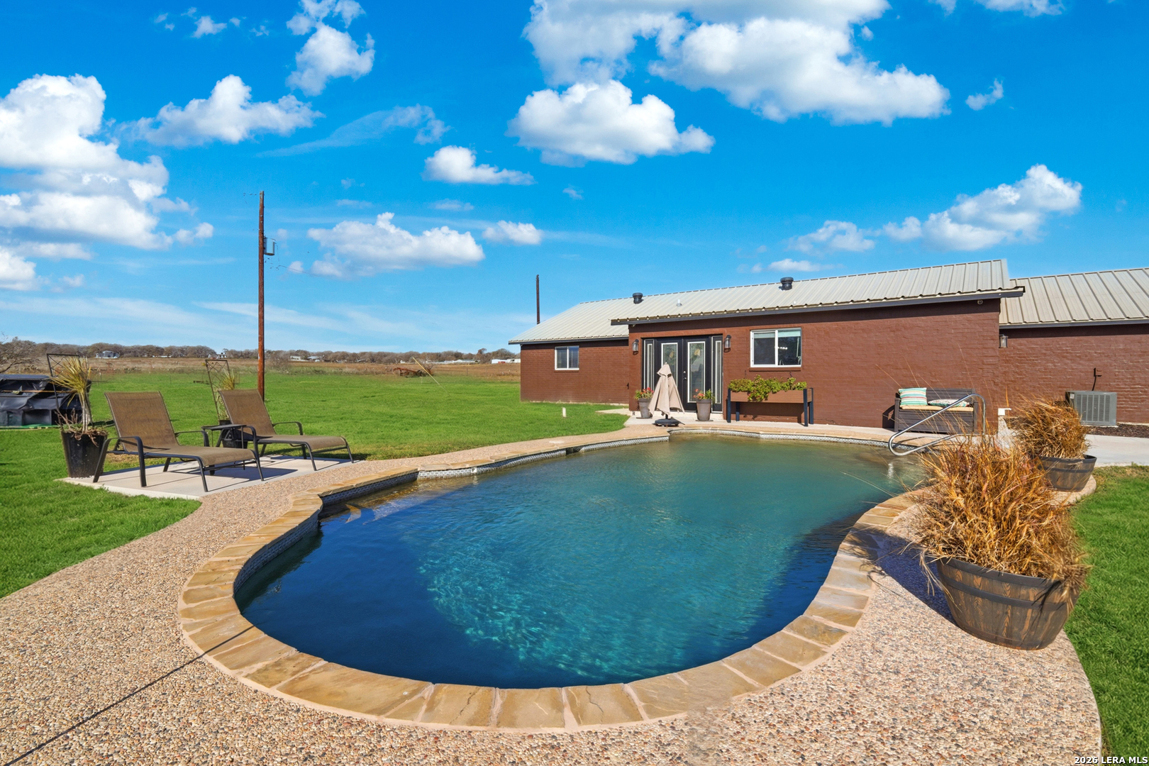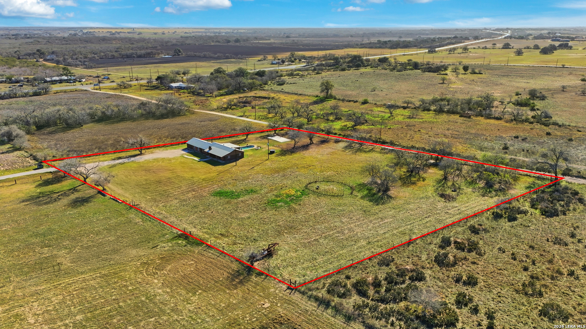 Experience luxury country living in La Vernia with this stunning, fully remodeled home set on 3.5 acres of unrestricted land. Offering 4 bedrooms and 3 full bathrooms, this property perfectly blends elegance, comfort, and wide-open space. Step inside to discover a beautifully redesigned interior, highlighted by a show-stopping kitchen featuring exposed wooden beams, an oversized island, and high-end finishes ideal for both everyday living and entertaining. The living area is warm and inviting with a natural fireplace and a stylish wet bar, creating the perfect setting for gatherings. The expansive primary suite is truly spectacular, offering ample space for a seating area and direct access to the backyard and pool. The spa-like primary bathroom boasts his-and-hers vanities, a soaking standalone tub, and a large walk-in shower. The walk-in closet feels like a private boutique, with abundant space for clothing and accessories. Step outside and enjoy your own private retreat, where a resort-style pool awaits-perfect for entertaining or cooling off during hot Texas summers. With no HOA, this property offers the freedom to bring horses or cattle, making it ideal for those seeking a true country lifestyle without sacrificing luxury. A rare opportunity to own a move-in-ready, luxury home with land, privacy, and no restrictions-this La Vernia gem is a must-see.