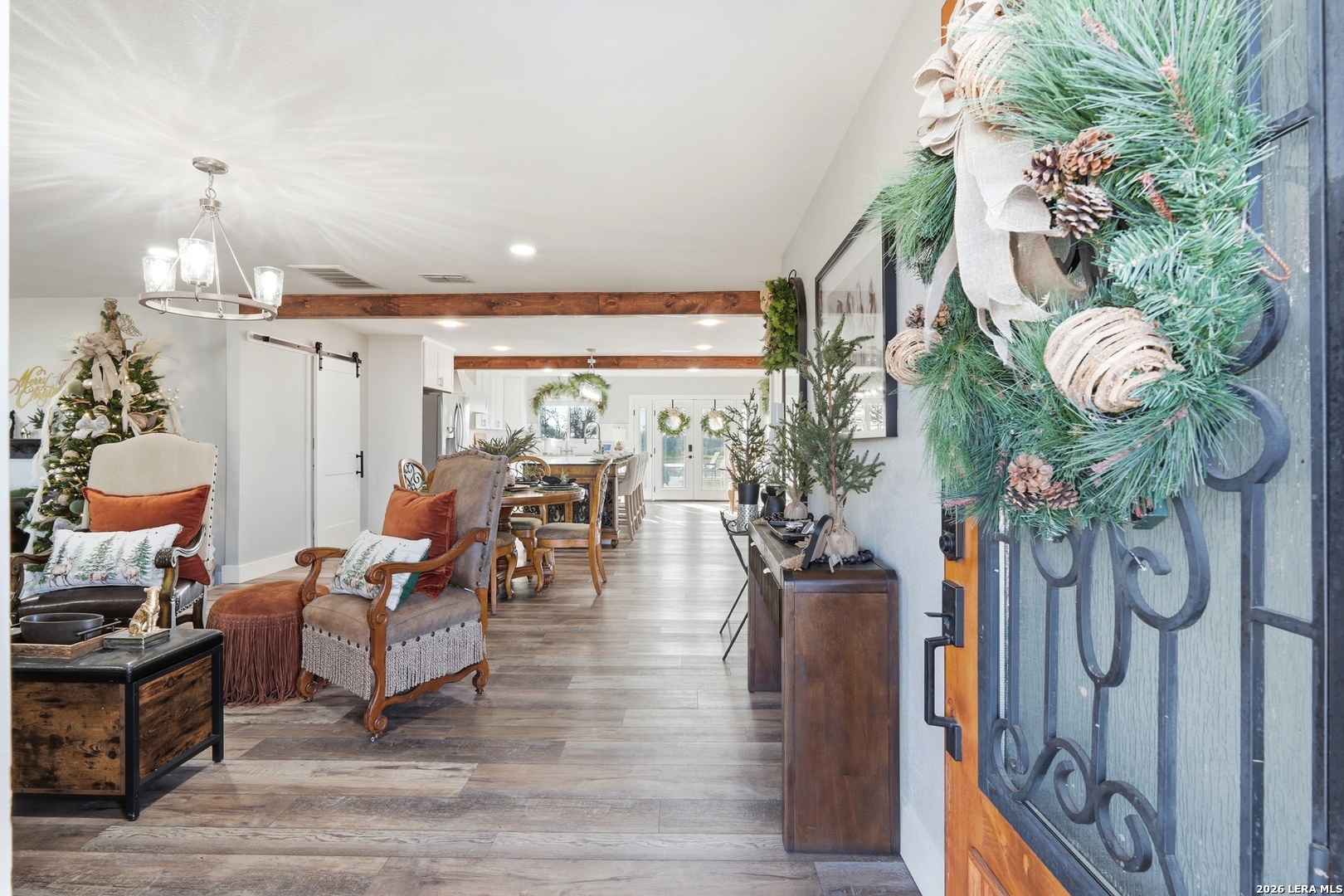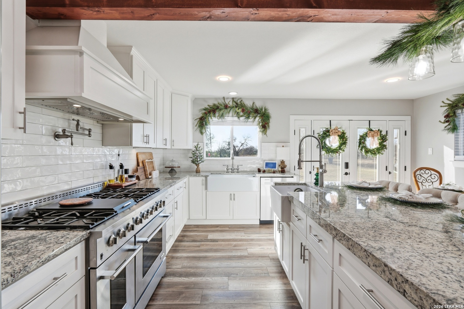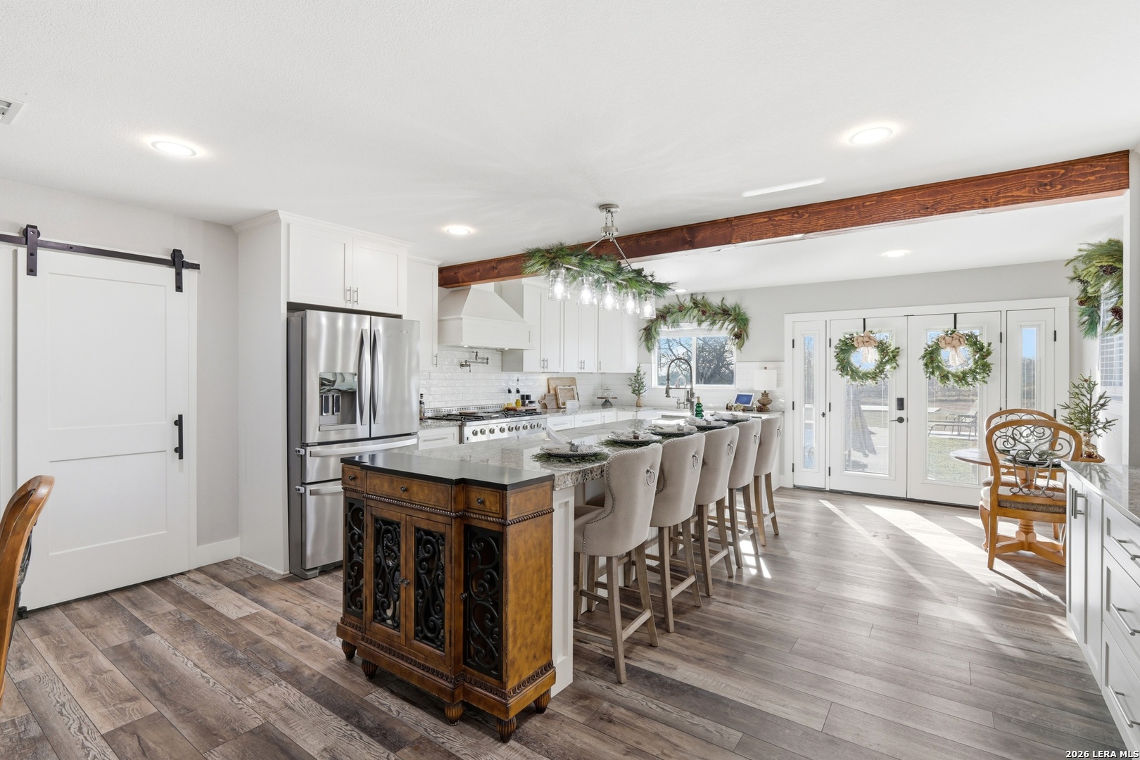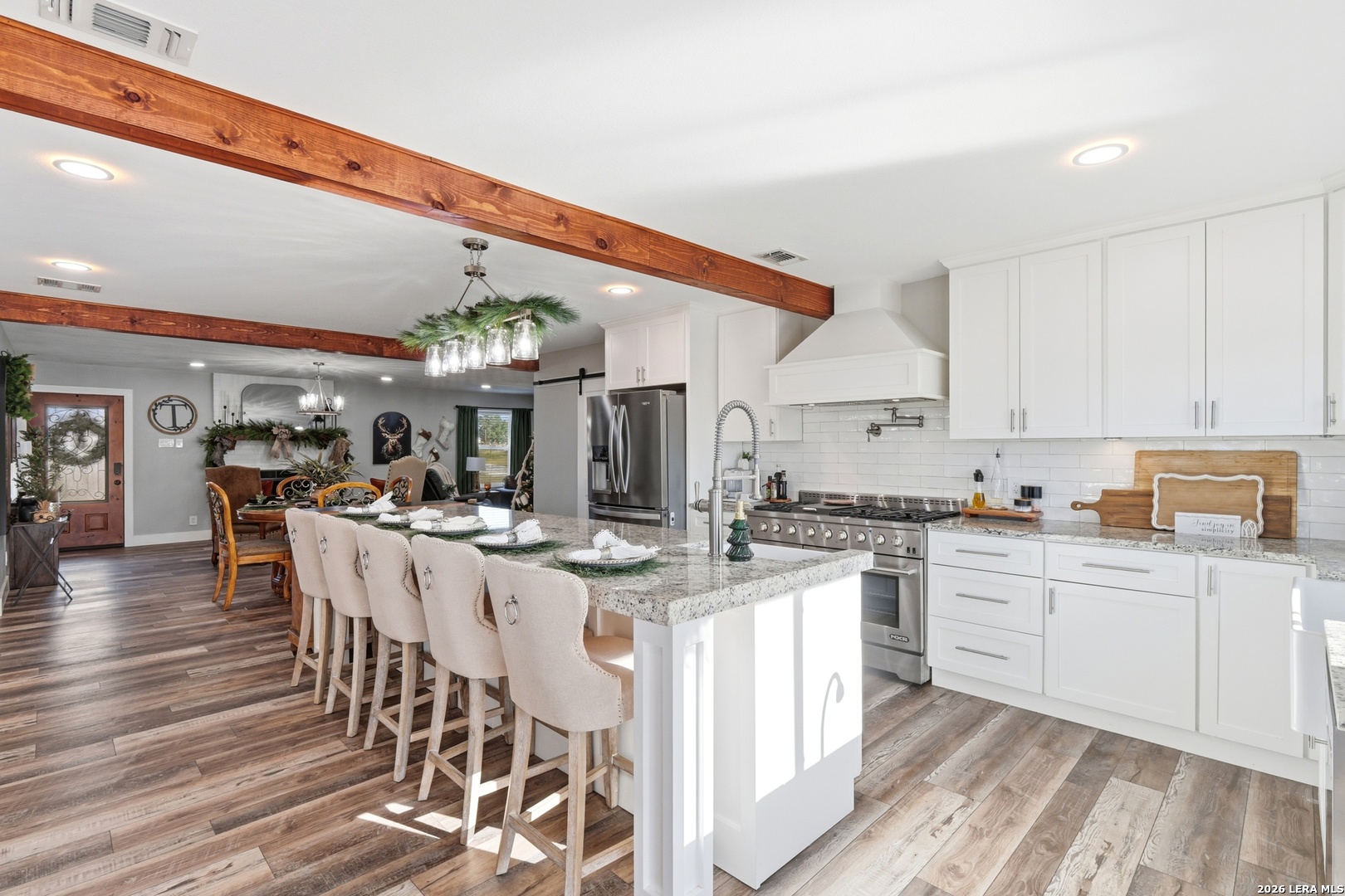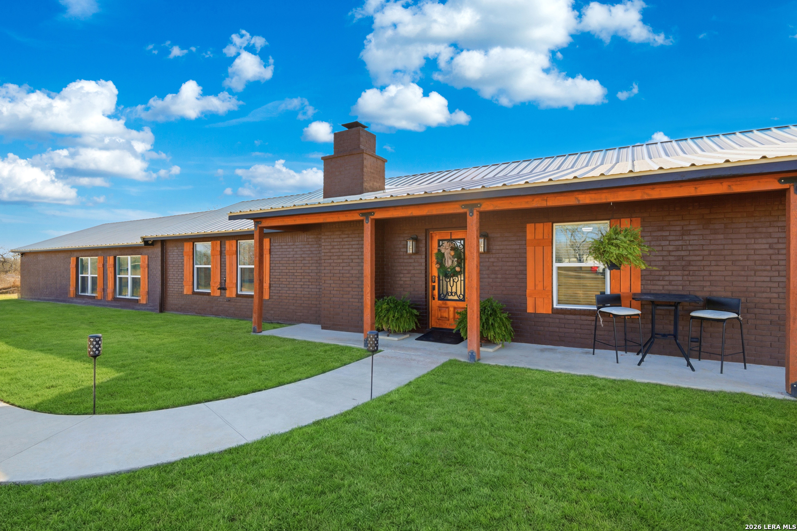 Experience luxury country living in La Vernia with this stunning, fully remodeled home set on 3.5 acres of unrestricted land. Offering 4 bedrooms and 3 full bathrooms, this property perfectly blends elegance, comfort, and wide-open space. Step inside to discover a beautifully redesigned interior, highlighted by a show-stopping kitchen featuring exposed wooden beams, an oversized island, and high-end finishes ideal for both everyday living and entertaining. The living area is warm and inviting with a natural fireplace and a stylish wet bar, creating the perfect setting for gatherings. The expansive primary suite is truly spectacular, offering ample space for a seating area and direct access to the backyard and pool. The spa-like primary bathroom boasts his-and-hers vanities, a soaking standalone tub, and a large walk-in shower. The walk-in closet feels like a private boutique, with abundant space for clothing and accessories. Step outside and enjoy your own private retreat, where a resort-style pool awaits-perfect for entertaining or cooling off during hot Texas summers. With no HOA, this property offers the freedom to bring horses or cattle, making it ideal for those seeking a true country lifestyle without sacrificing luxury. A rare opportunity to own a move-in-ready, luxury home with land, privacy, and no restrictions-this La Vernia gem is a must-see.