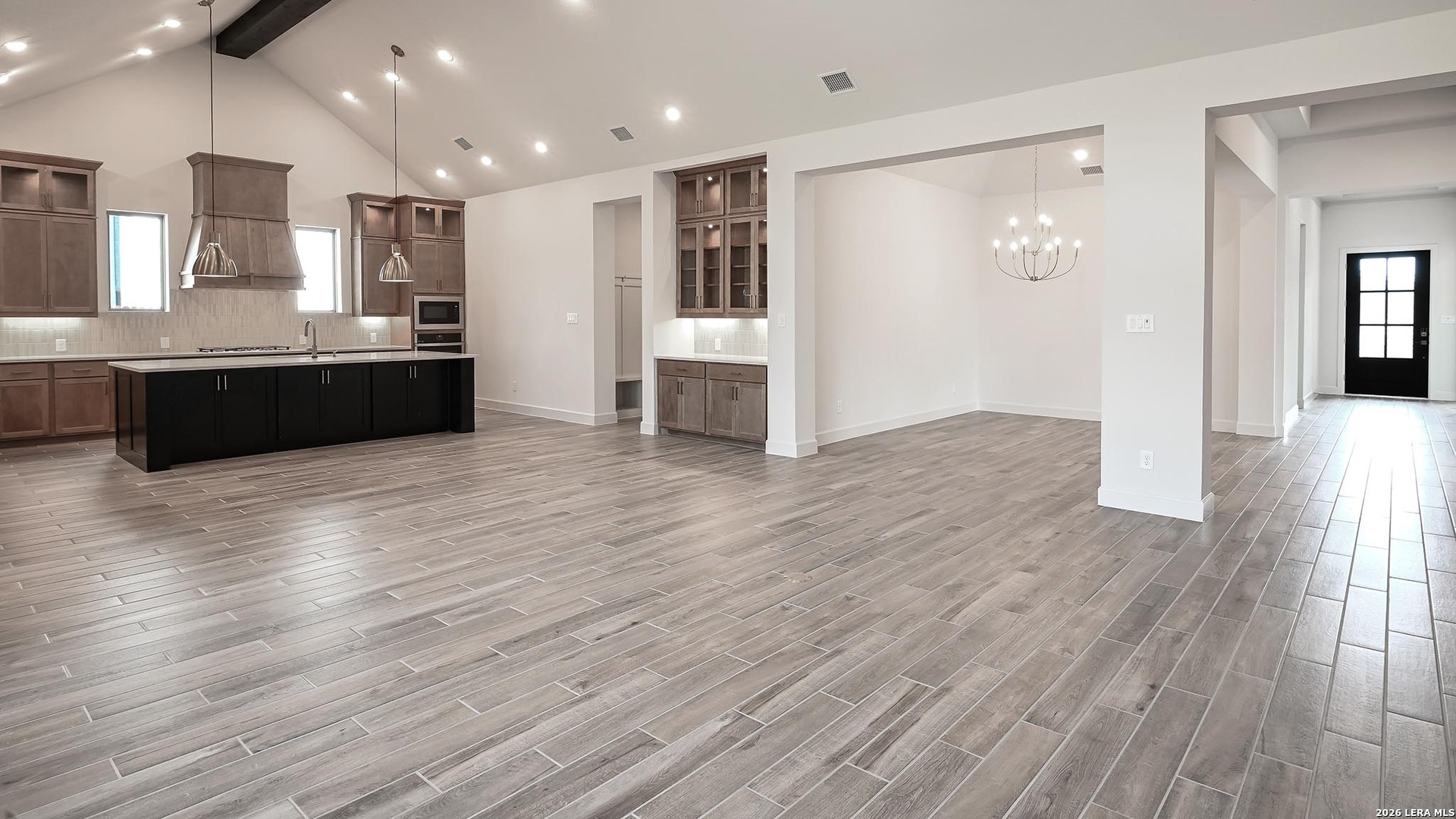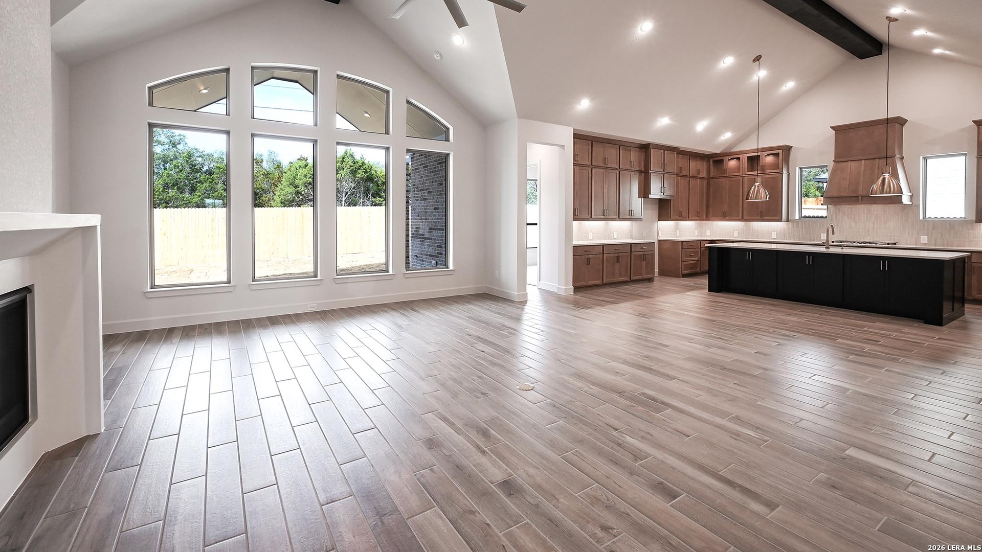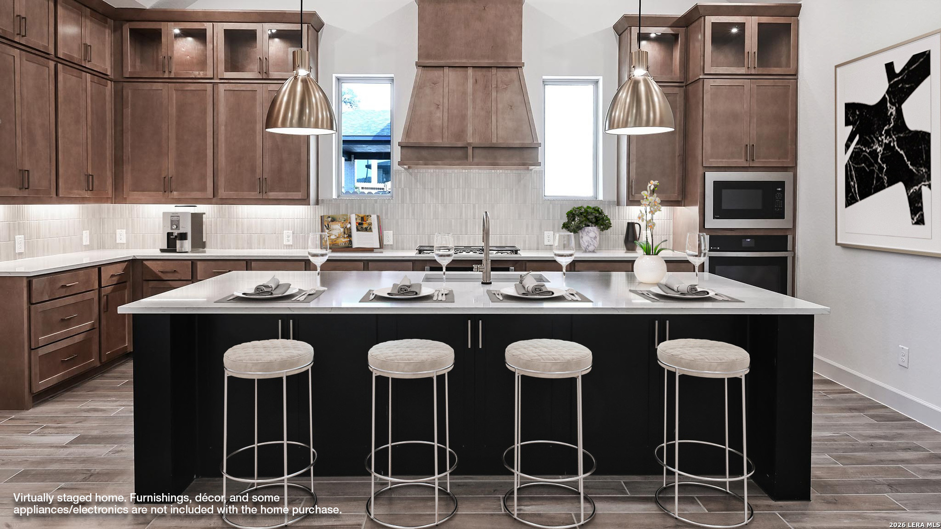 Home office with French doors frame entry. Game room with French doors and formal dining room just off the extended entry. Spacious family room with a decorative beamed ceiling, wall of windows and cast stone fireplace opens to the kitchen and morning area. Island kitchen with built-in seating space, two wall ovens, a 5-burner gas cooktop and a corner walk-in pantry. Primary suite features a large wall of windows. Primary bath offers a French door entry, dual vanities, freestanding tub, separate glass enclosed shower and a wall-in closet. All additional bedrooms offer a private bathroom and walk-in closets. Extended covered backyard patio. Mud room and utility room just off the three-car garage.