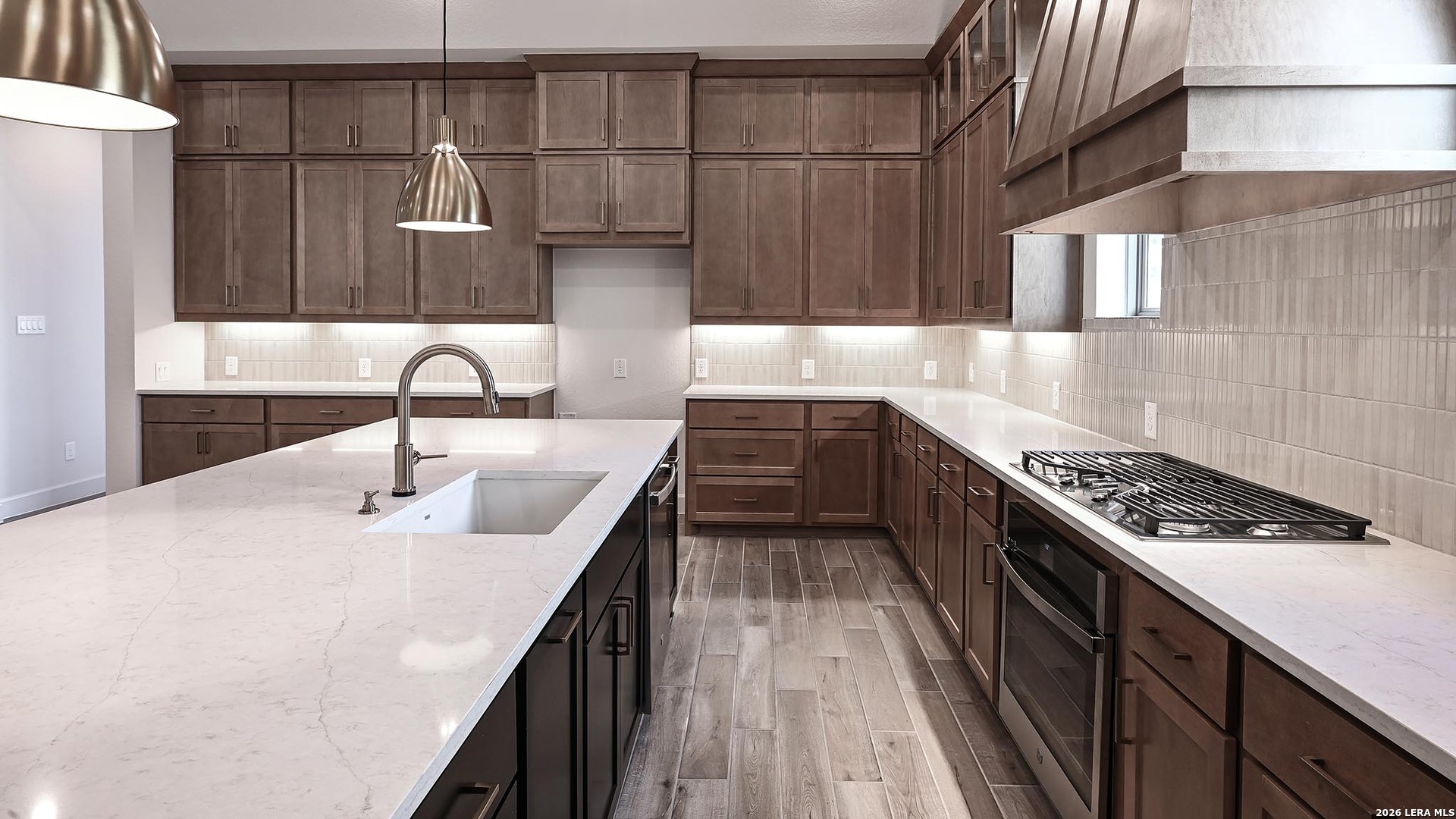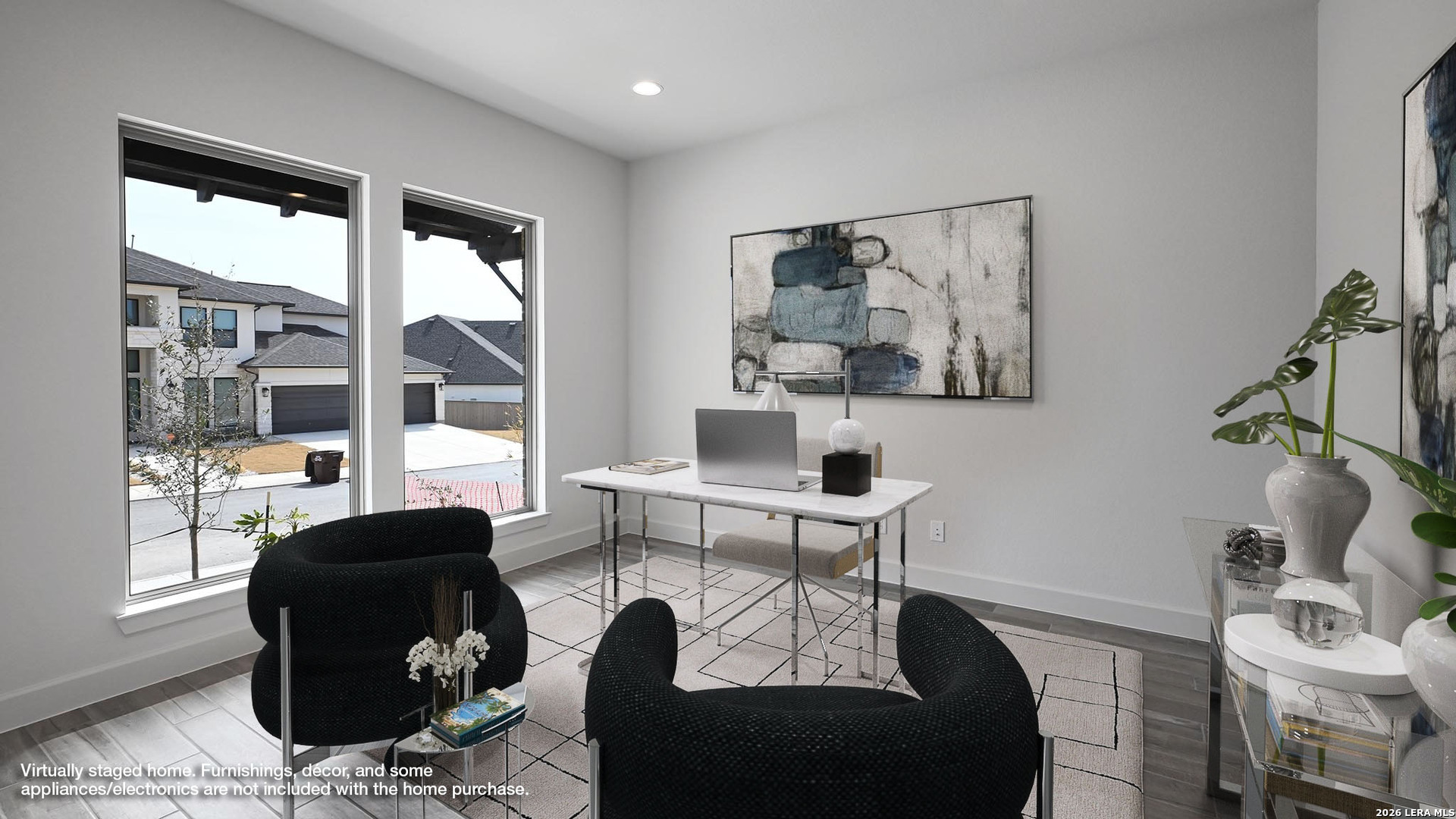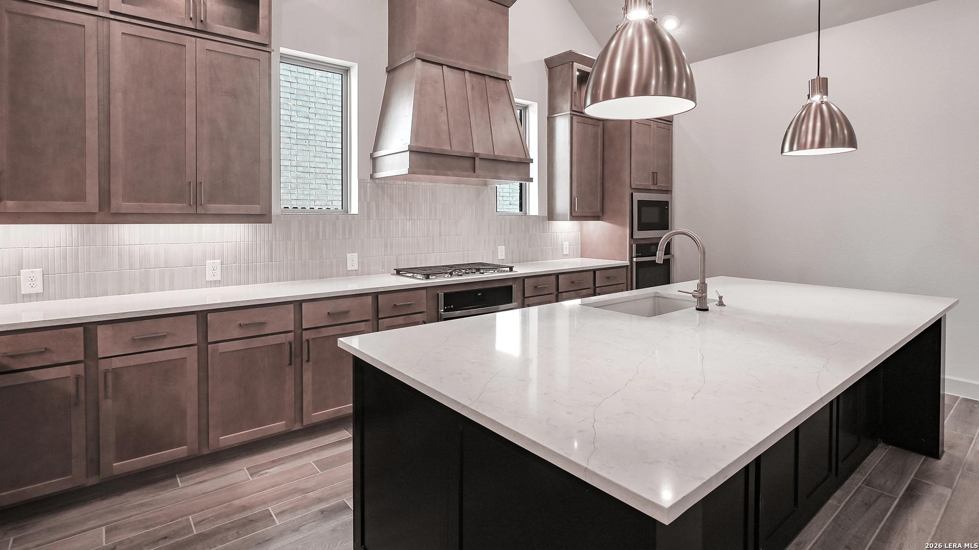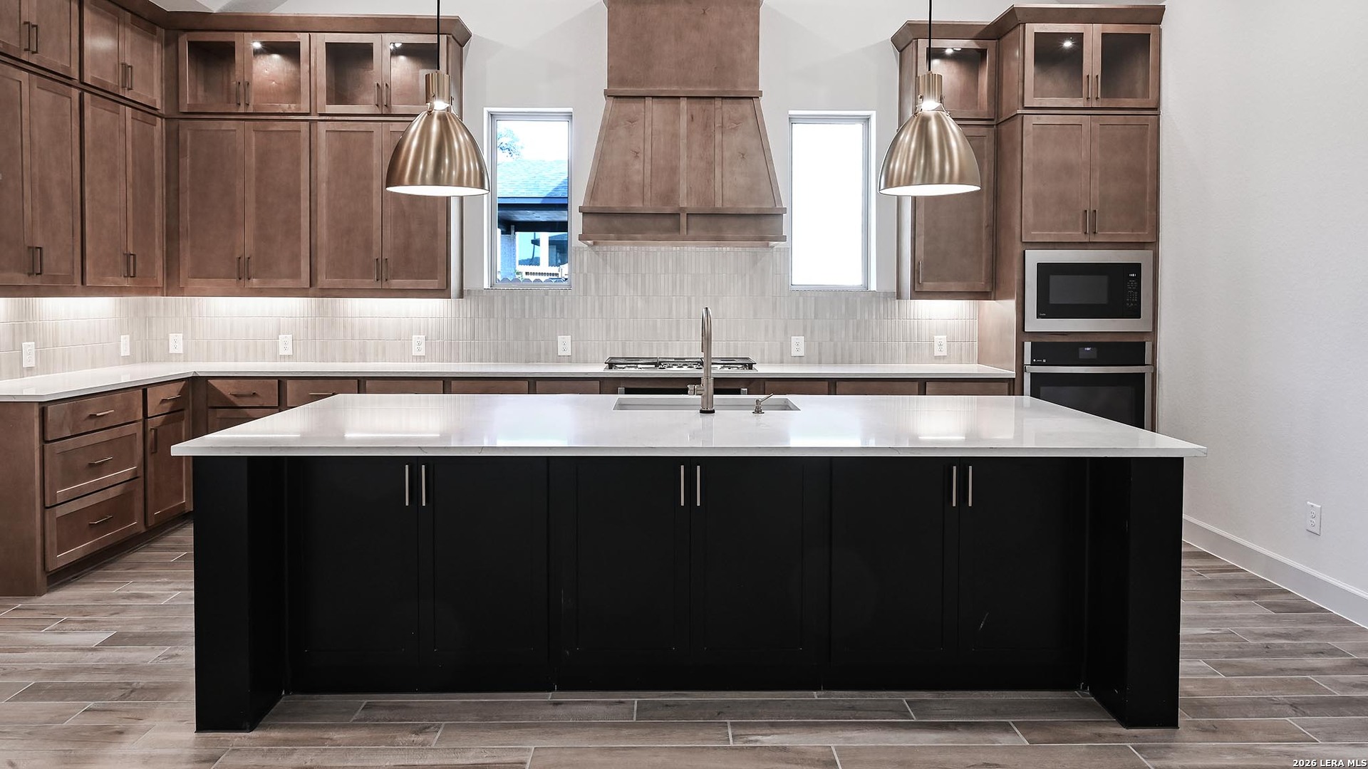 Home office with French doors frame entry. Game room with French doors and formal dining room just off the extended entry. Spacious family room with a decorative beamed ceiling, wall of windows and cast stone fireplace opens to the kitchen and morning area. Island kitchen with built-in seating space, two wall ovens, a 5-burner gas cooktop and a corner walk-in pantry. Primary suite features a large wall of windows. Primary bath offers a French door entry, dual vanities, freestanding tub, separate glass enclosed shower and a wall-in closet. All additional bedrooms offer a private bathroom and walk-in closets. Extended covered backyard patio. Mud room and utility room just off the three-car garage.